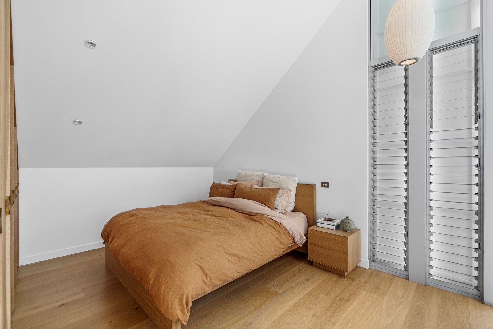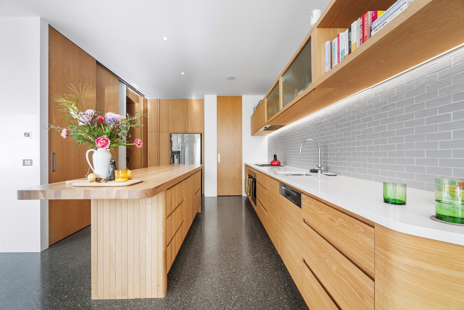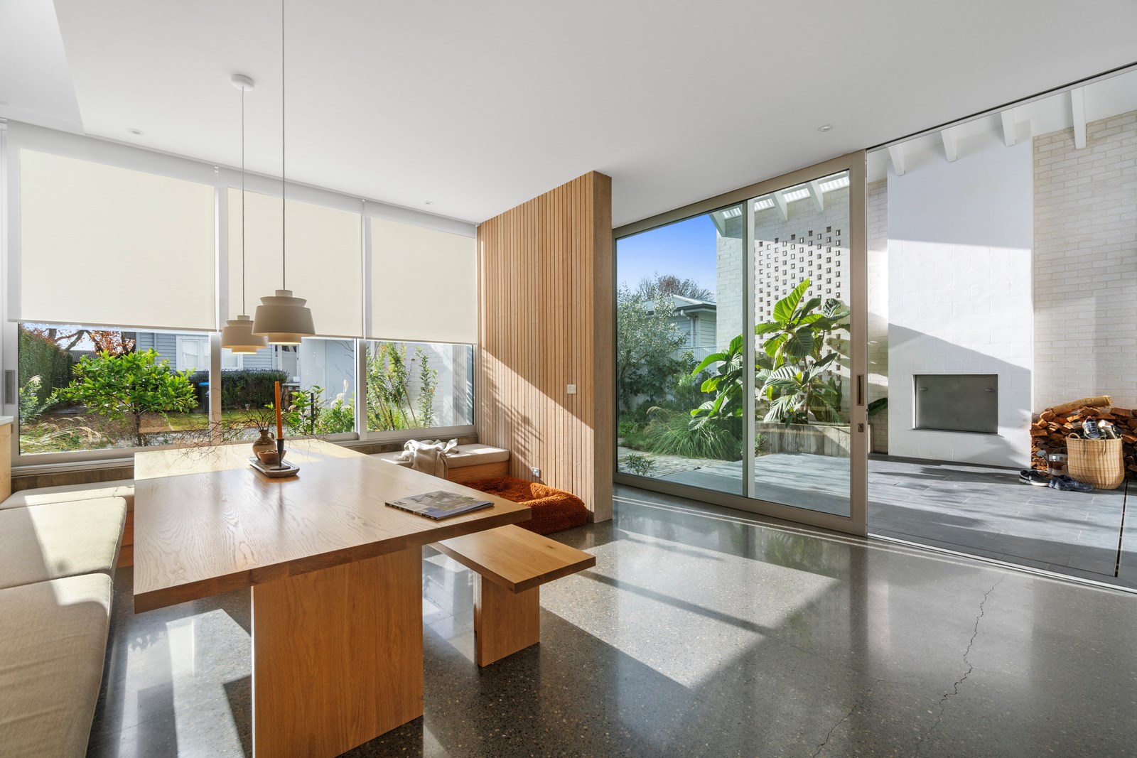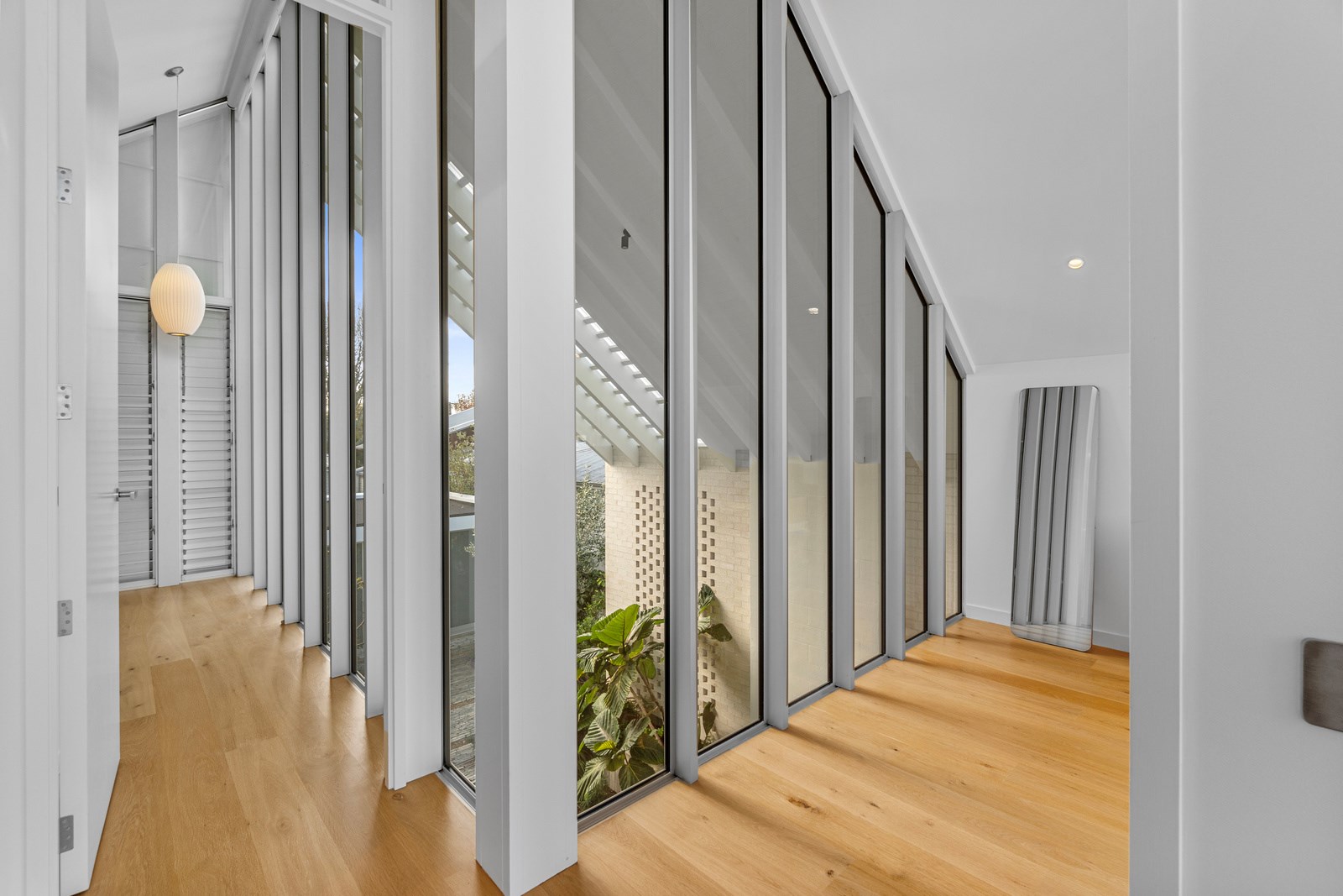 To the west are a 100-year-old church and hall. The home is a delightful addition to its neighbourhood and a model for building within our city suburbs. A square footprint has been expertly designed around the outdoor room. Downstairs is all about light, bright living spaces, including a streamlined kitchen with timber and grey tiles. Upstairs has the bedrooms and a bathroom. Here, windows and built-in shelving make the most of every square centimetre of the space created by the ceiling lines. This is elegance articulated with true craftsmanship