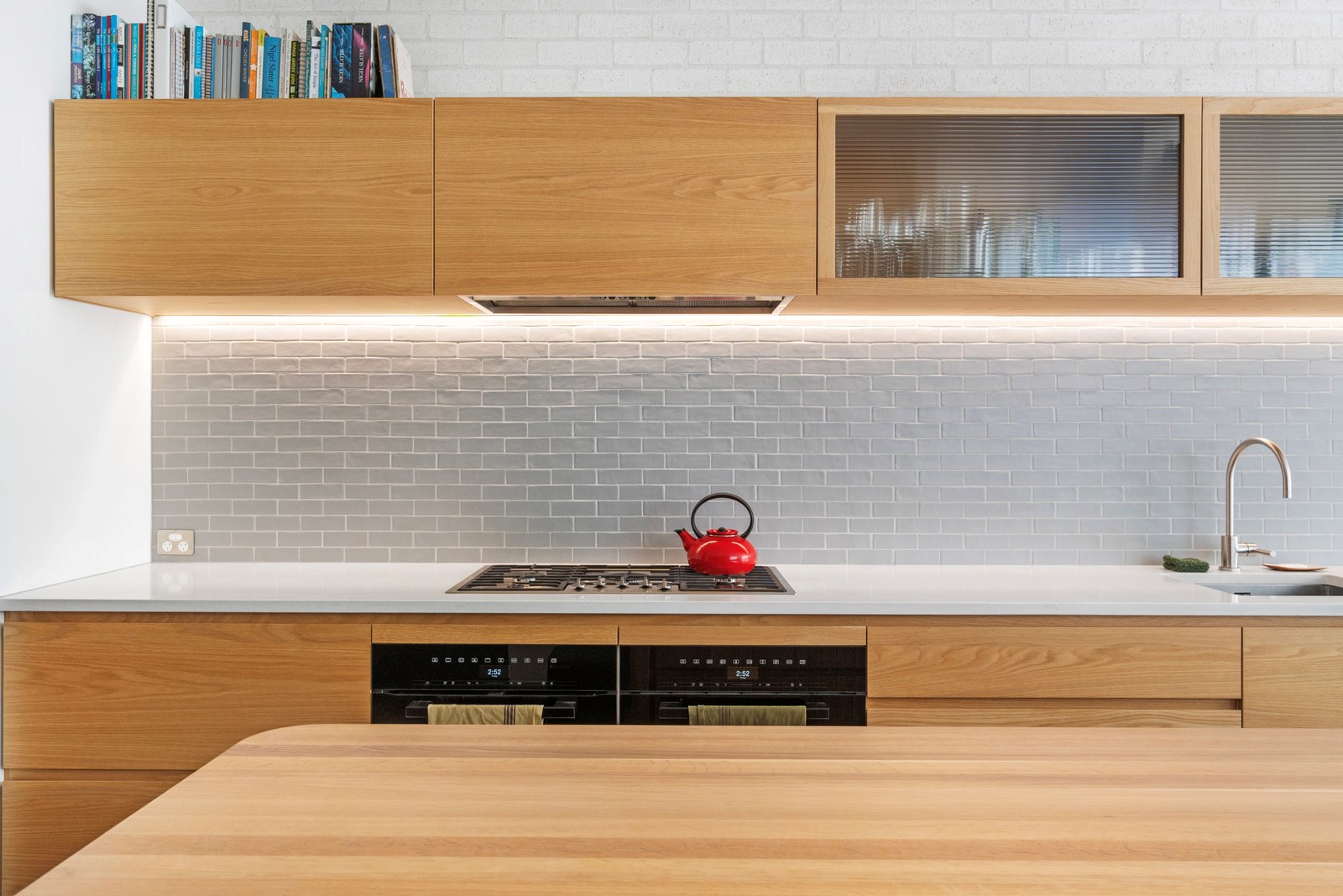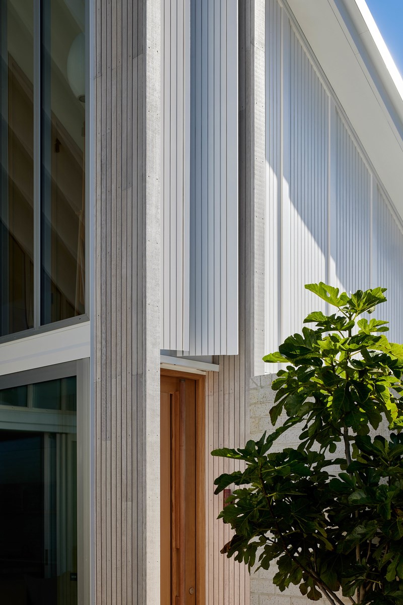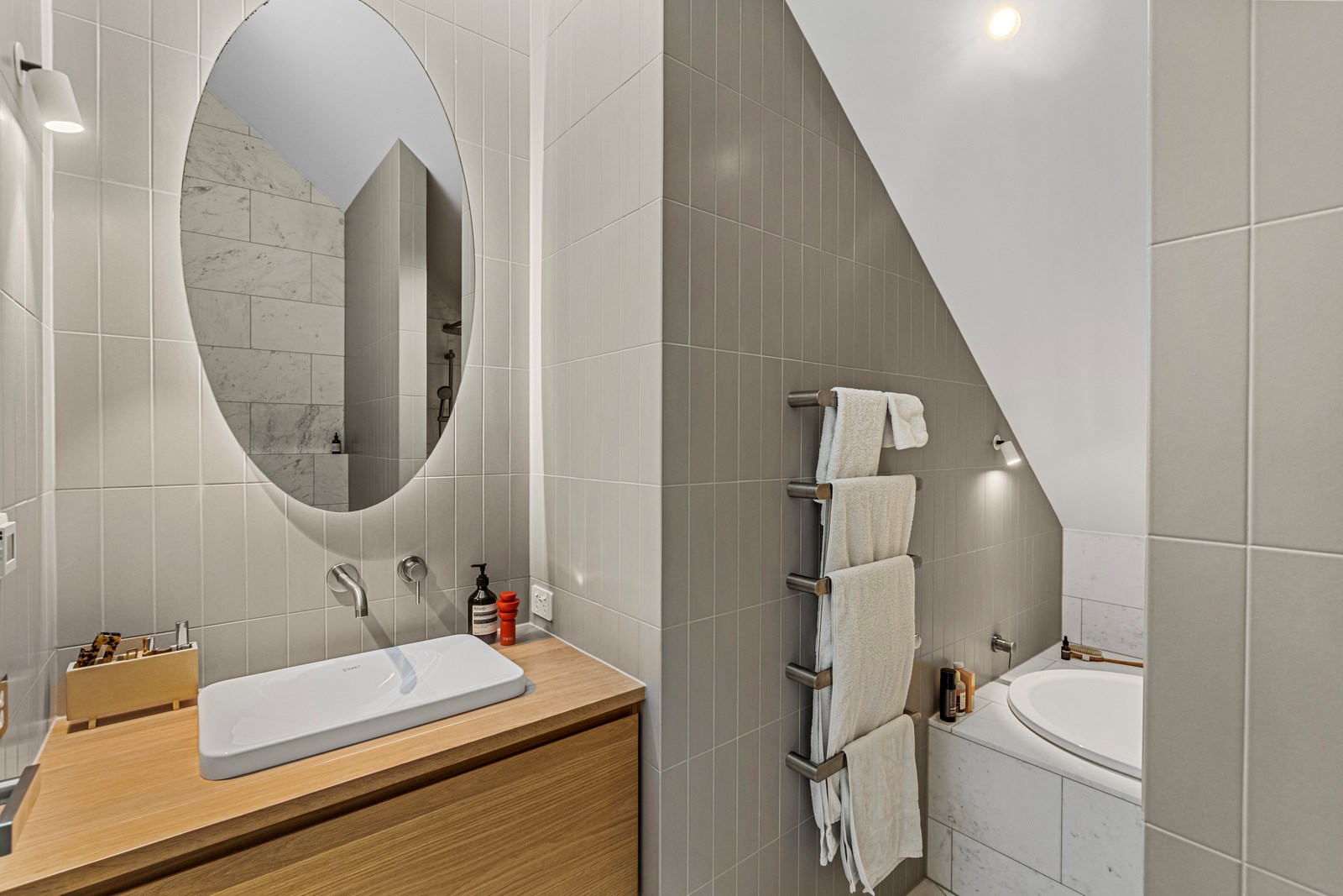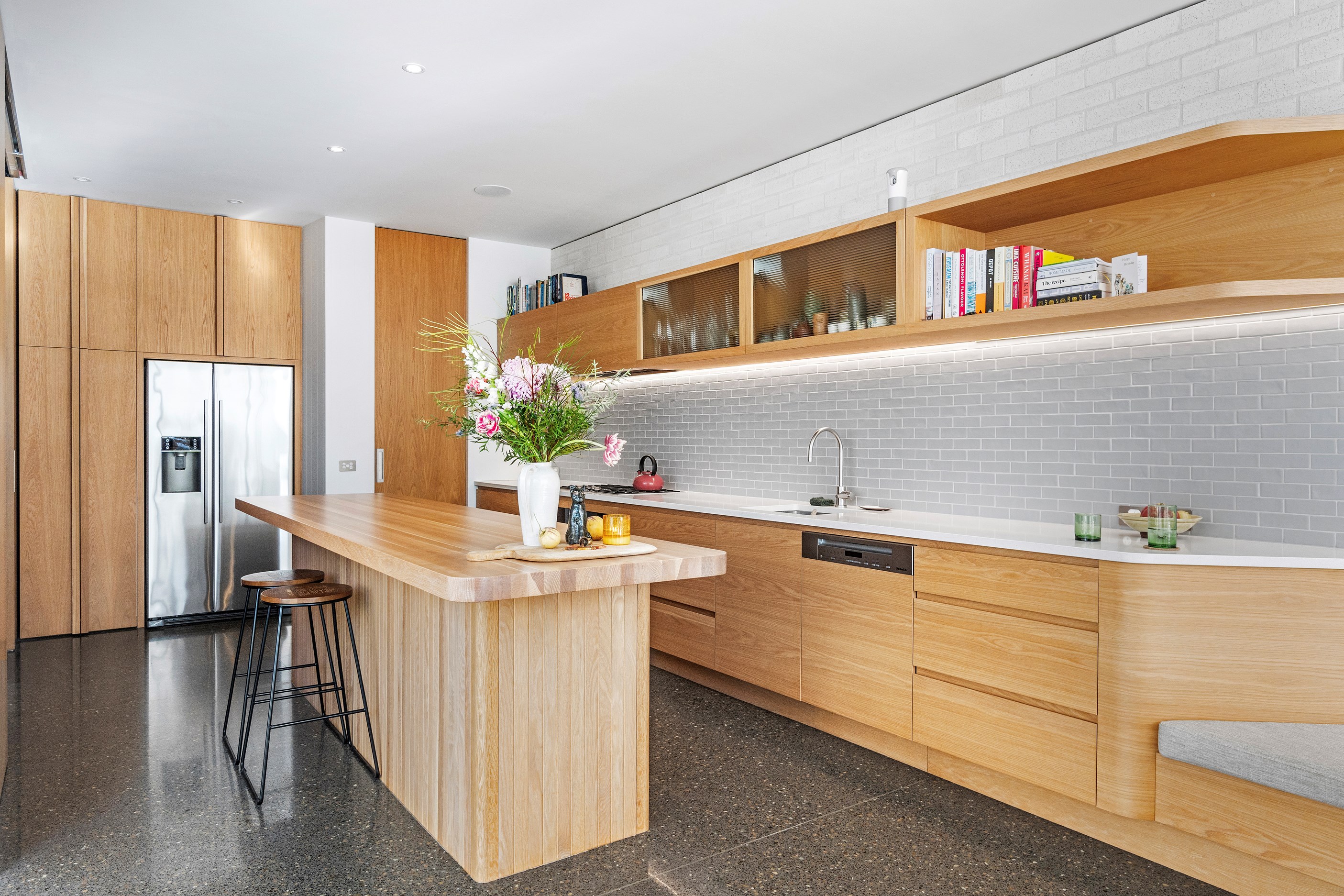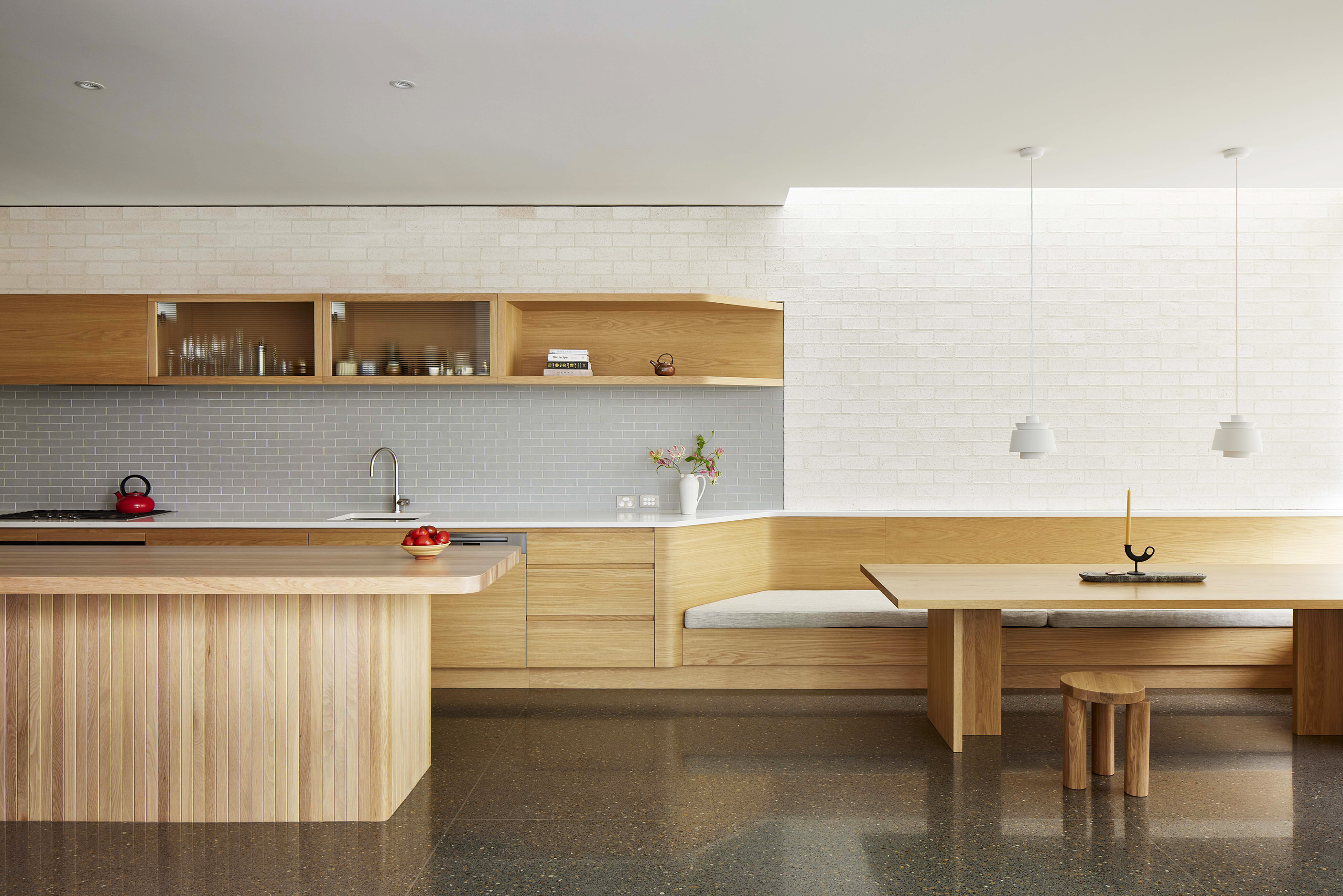 To the west are a 100-year-old church and hall. The home is a delightful addition to its neighbourhood and a model for building within our city suburbs. A square footprint has been expertly designed around the outdoor room. Downstairs is all about light, bright living spaces, including a streamlined kitchen with timber and grey tiles. Upstairs has the bedrooms and a bathroom. Here, windows and built-in shelving make the most of every square centimetre of the space created by the ceiling lines. This is elegance articulated with true craftsmanship
