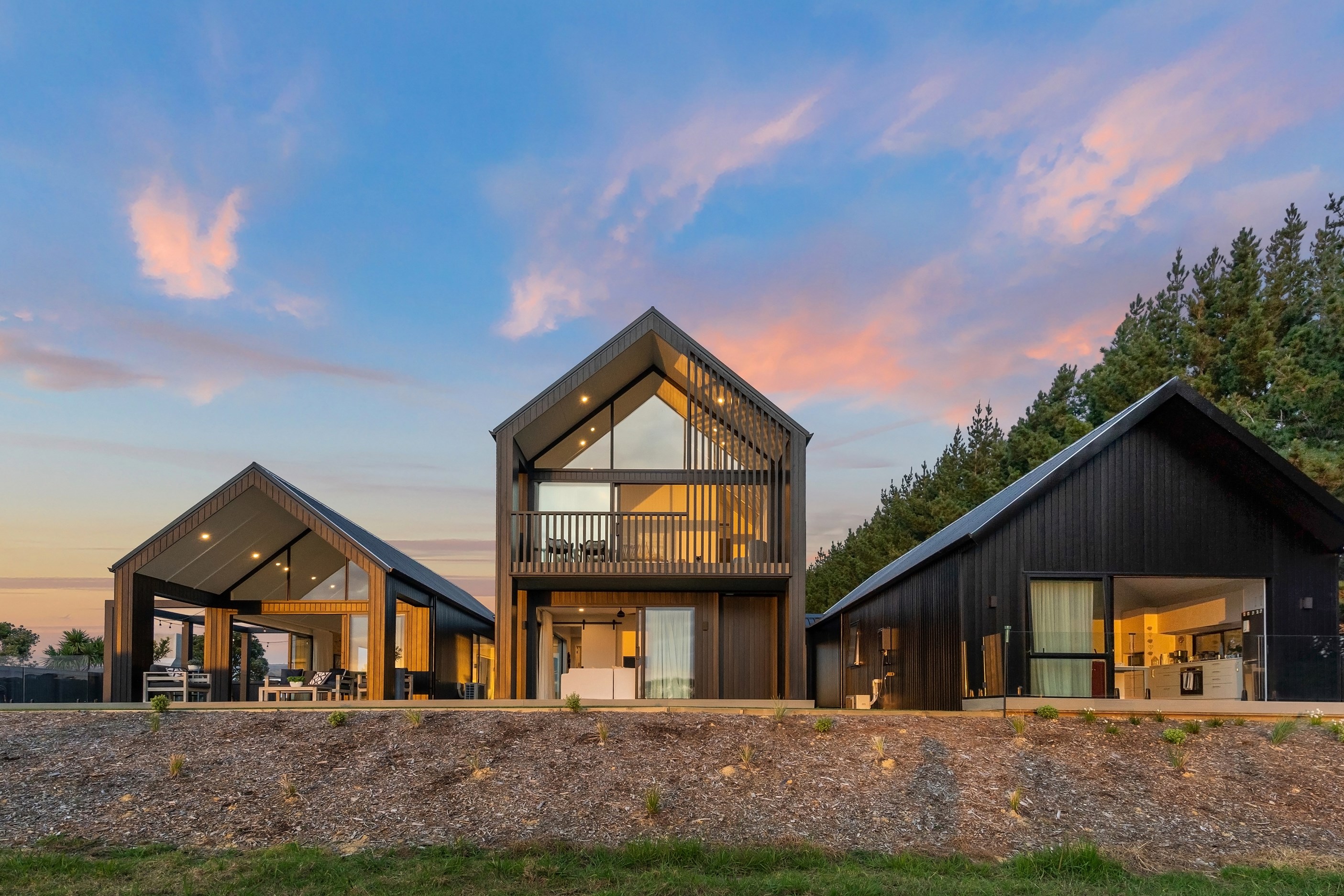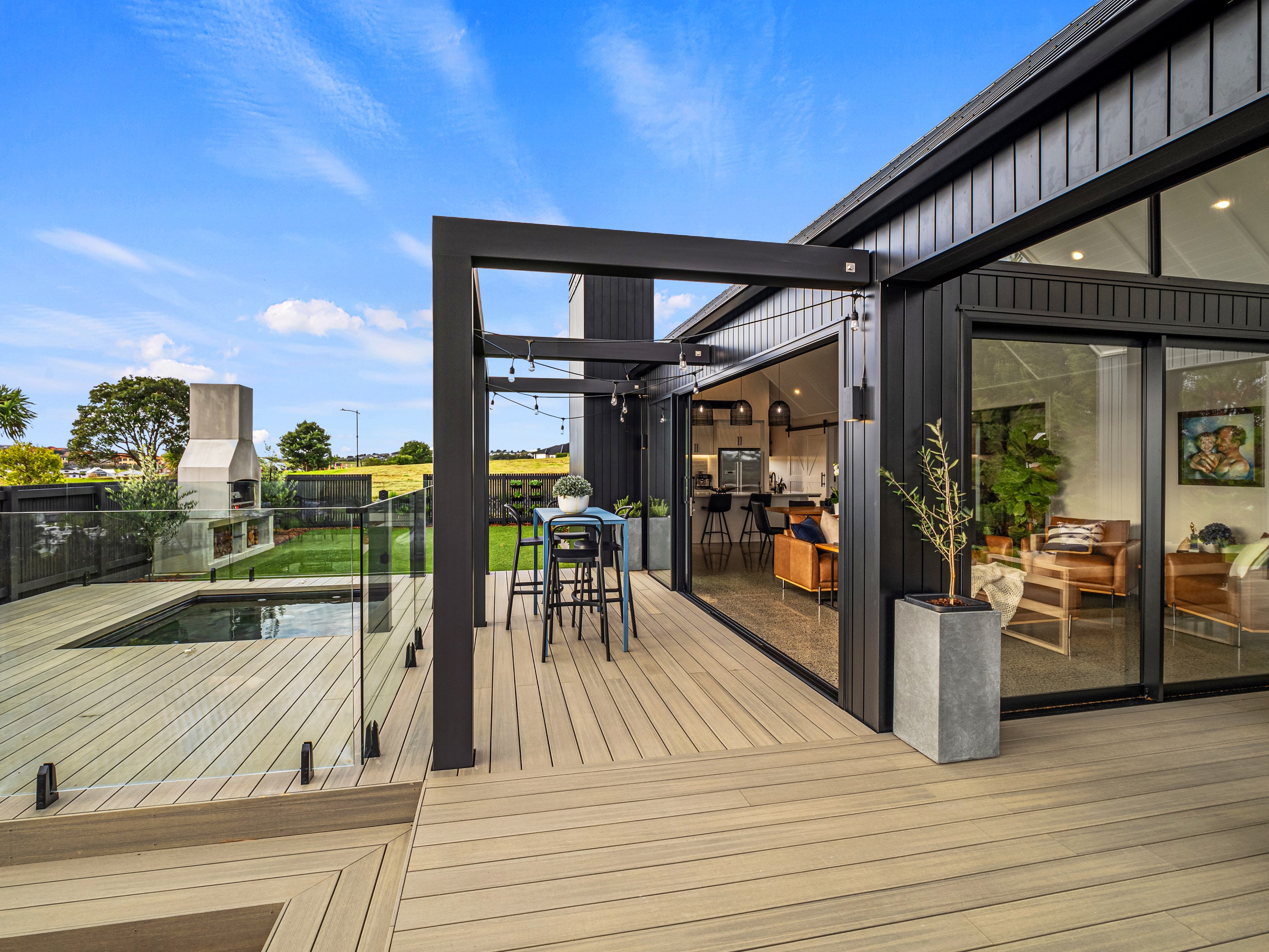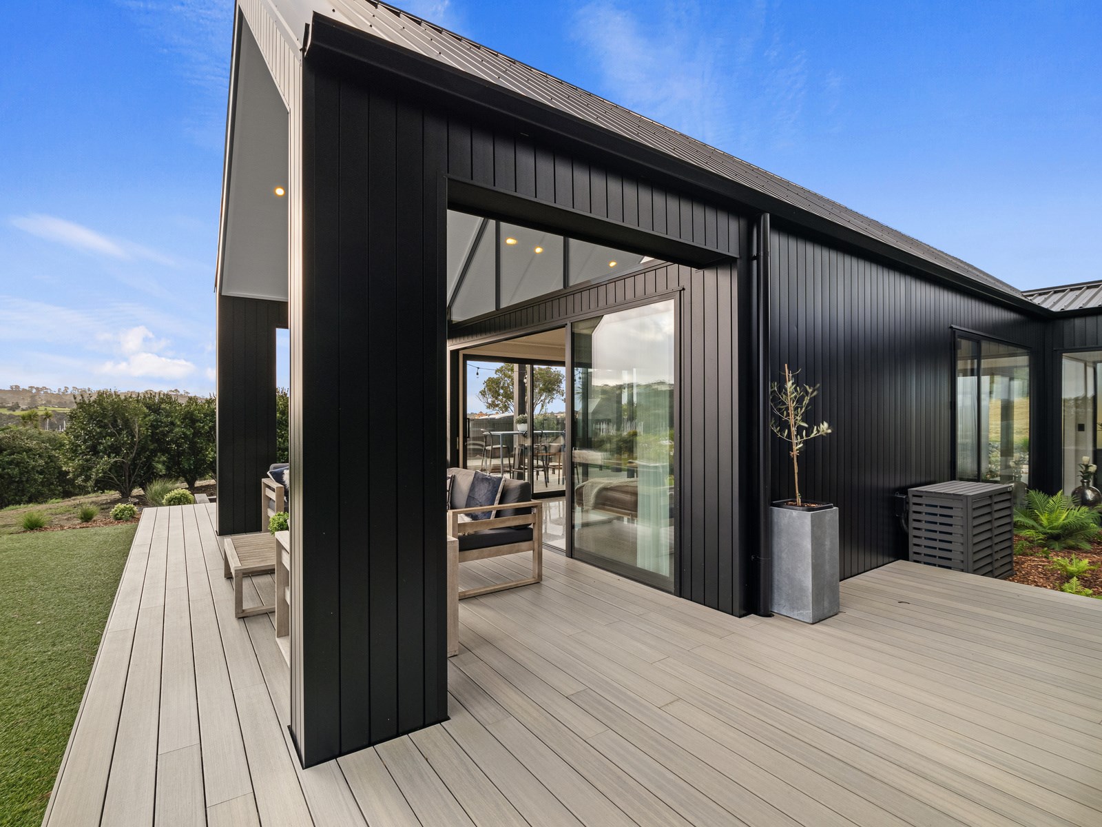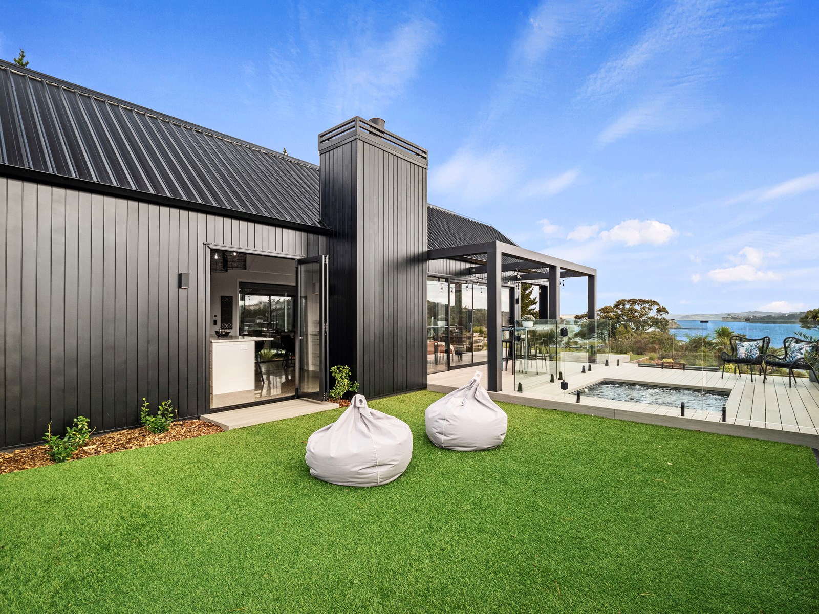 You’ll find many reasons to admire this 319sqm house, and three of them are its handsomely linked pavilion forms. The trio, in vertical Eurowood cladding, draw the eye, but they also have supremely practical functions. The middle pavilion, for instance, is family central with two floors, three bedrooms, three ensuite bathrooms, an office, separate toilet and a kids’ lounge. In the north-west wing are the open-plan communal living zones, which flow from the kitchen –with scullery – to a dining space, living room and out into a portico and swathe of Outdure decking. From there you can step down to the spa pool, lawn and barbecue. It’s entertaining bliss. The final pavilion has a double garage, plus a one-bedroom apartment with its own bathroom, kitchen, sitting room and deck. As a result, the welcome mat is always out for friends and family.