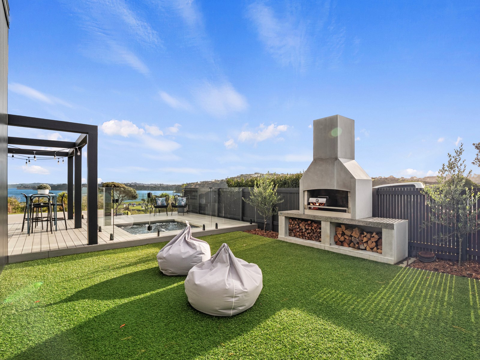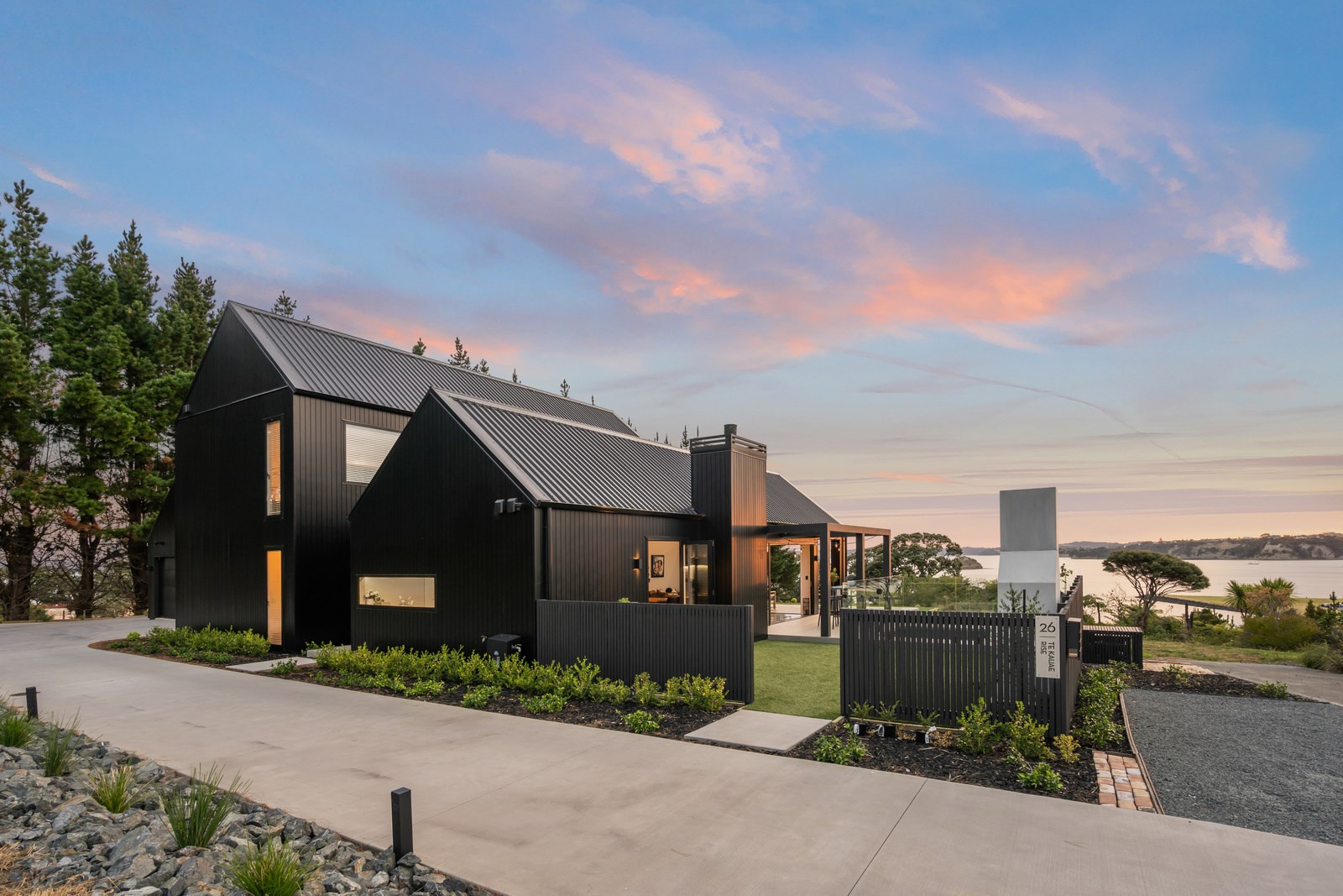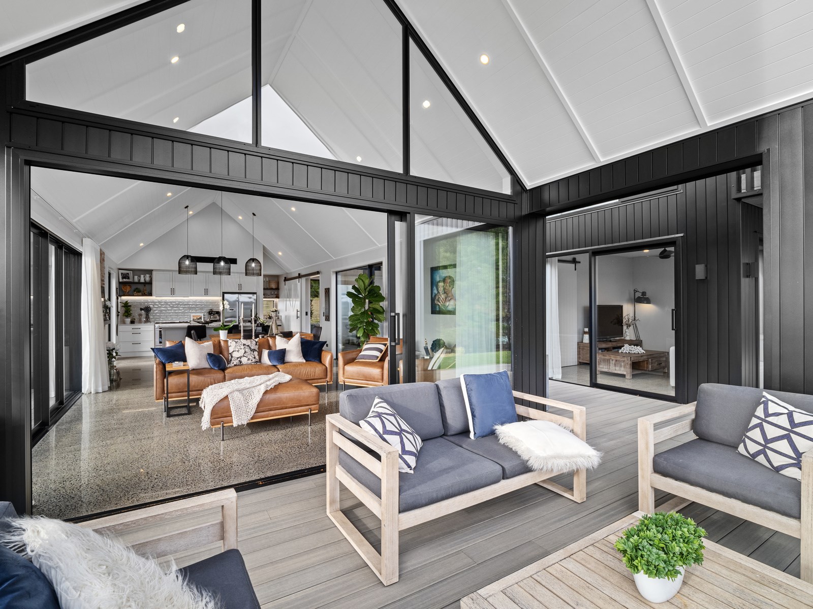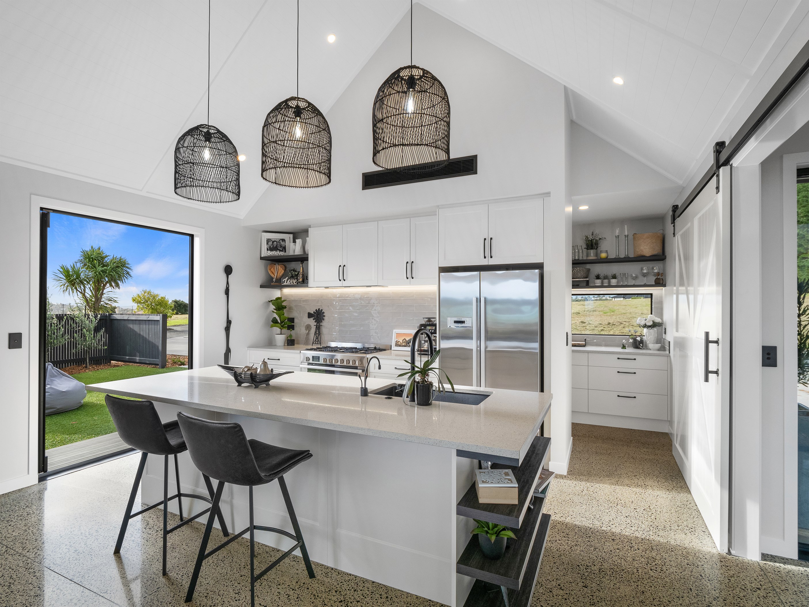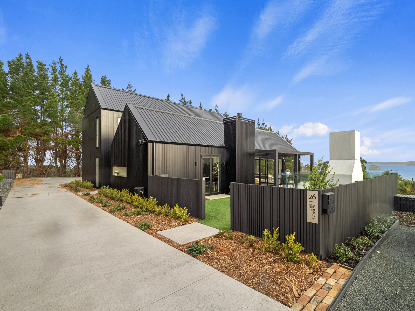 You’ll find many reasons to admire this 319sqm house, and three of them are its handsomely linked pavilion forms. The trio, in vertical Eurowood cladding, draw the eye, but they also have supremely practical functions. The middle pavilion, for instance, is family central with two floors, three bedrooms, three ensuite bathrooms, an office, separate toilet and a kids’ lounge. In the north-west wing are the open-plan communal living zones, which flow from the kitchen –with scullery – to a dining space, living room and out into a portico and swathe of Outdure decking. From there you can step down to the spa pool, lawn and barbecue. It’s entertaining bliss. The final pavilion has a double garage, plus a one-bedroom apartment with its own bathroom, kitchen, sitting room and deck. As a result, the welcome mat is always out for friends and family.