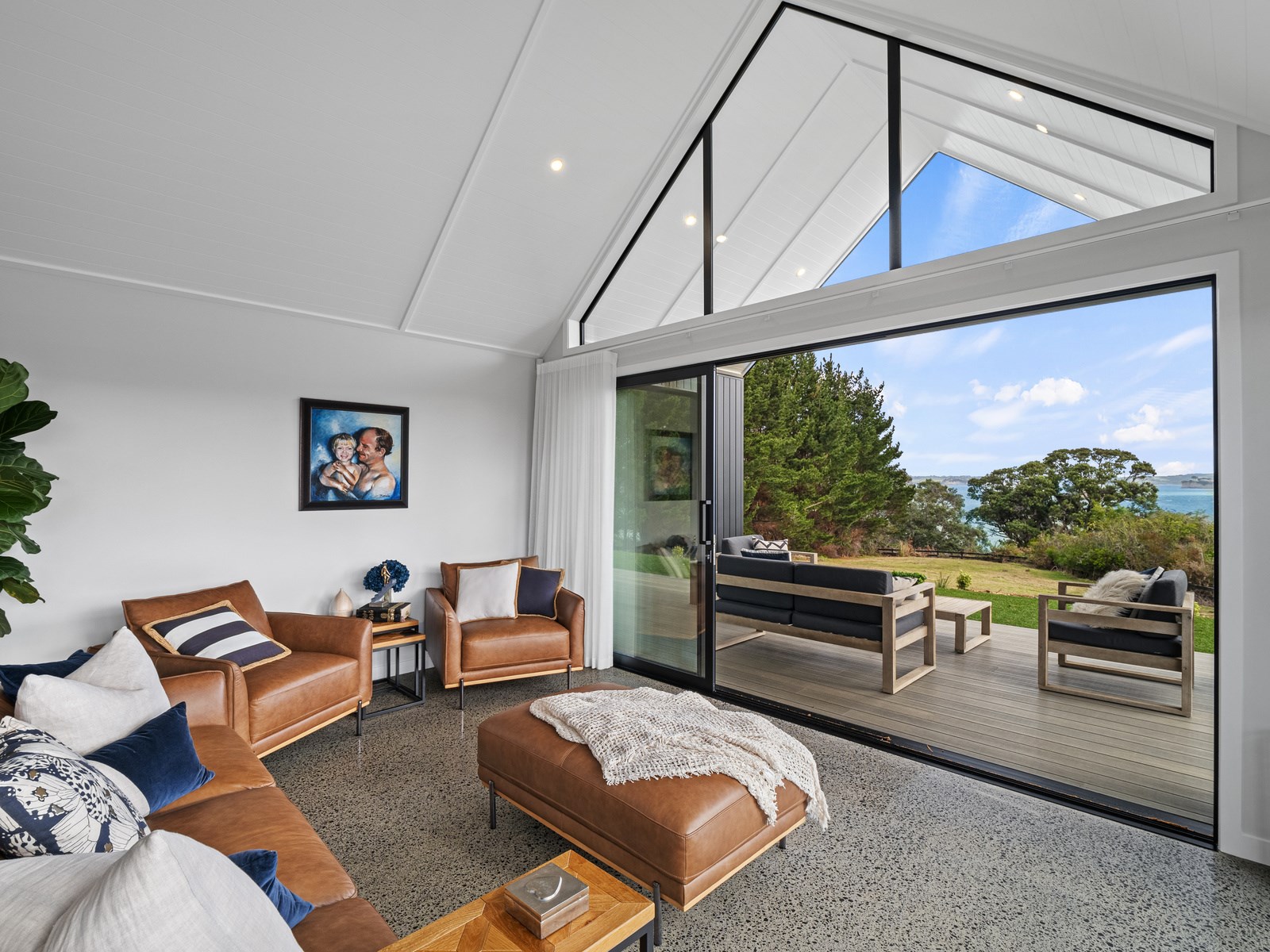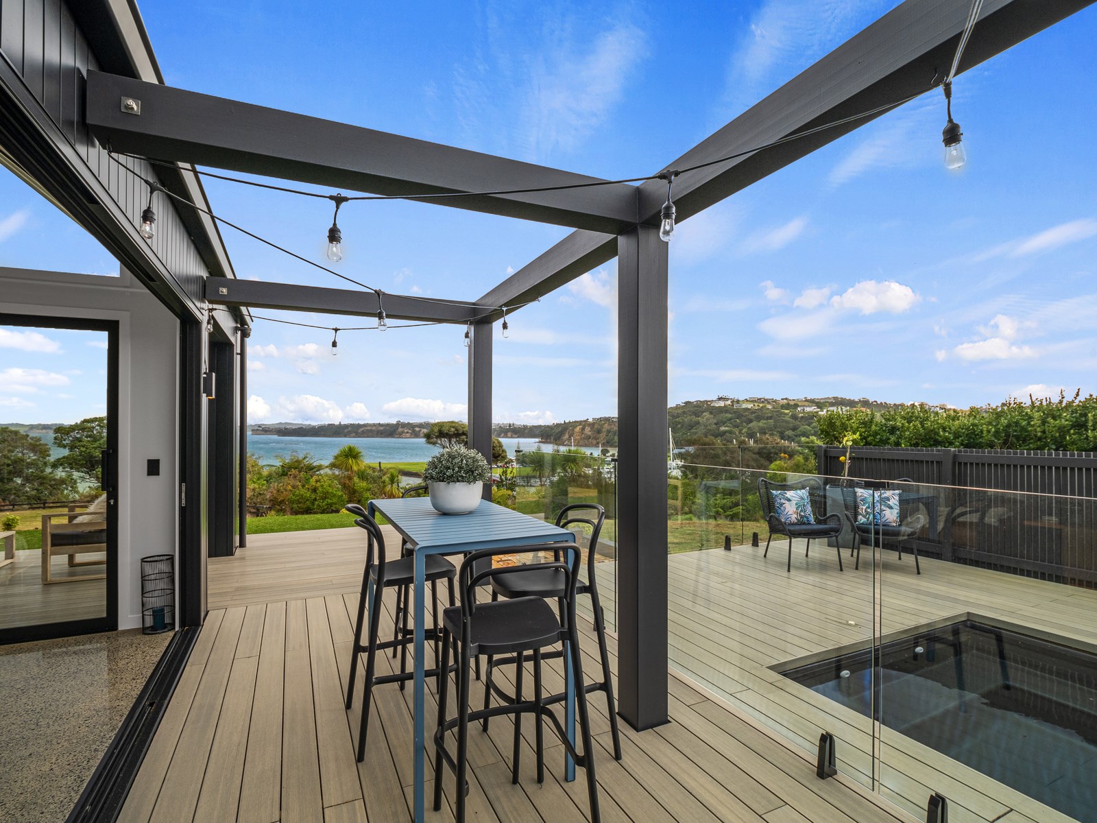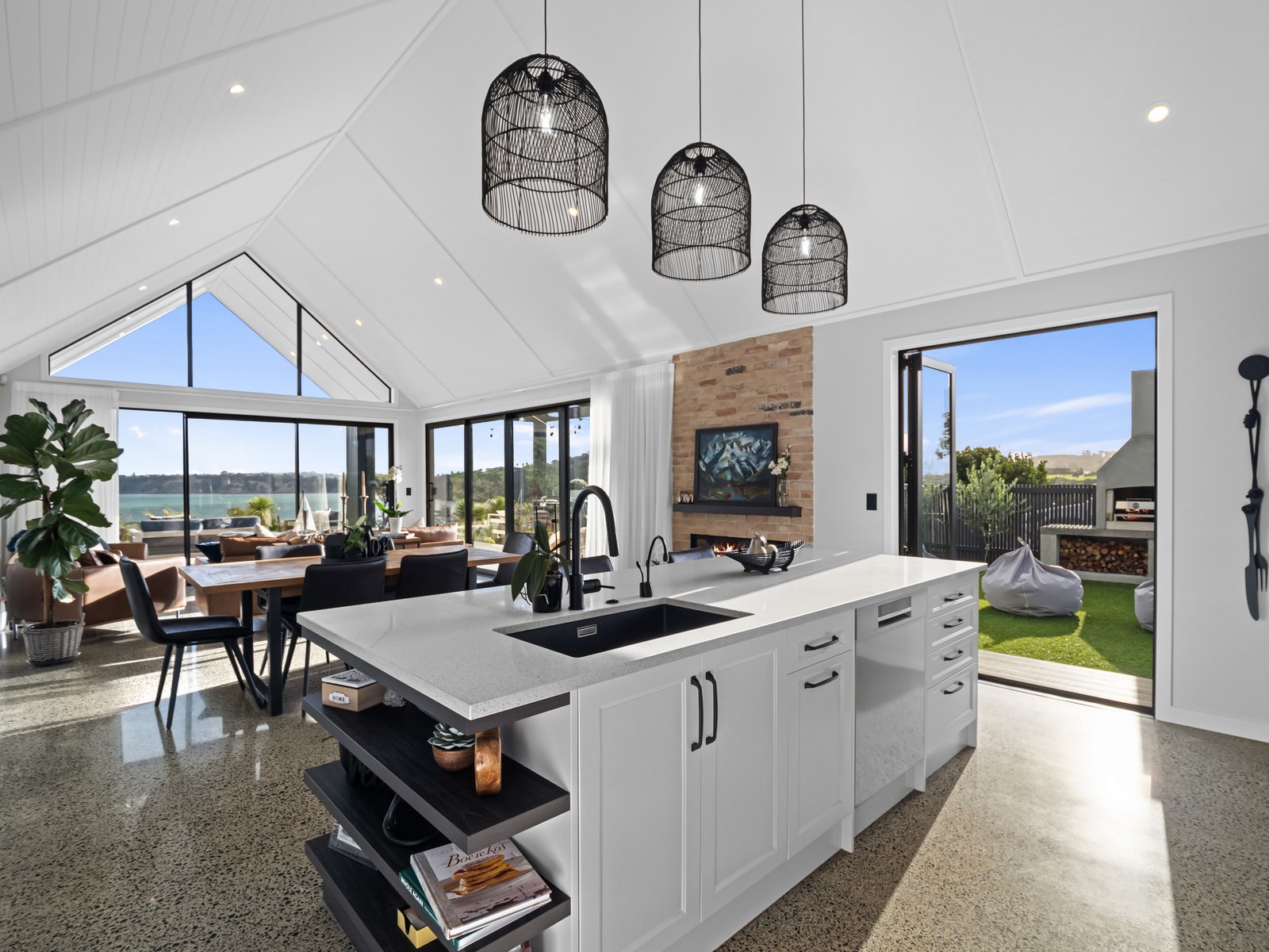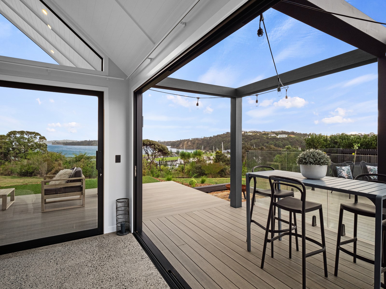 You’ll find many reasons to admire this 319sqm house, and three of them are its handsomely linked pavilion forms. The trio, in vertical Eurowood cladding, draw the eye, but they also have supremely practical functions. The middle pavilion, for instance, is family central with two floors, three bedrooms, three ensuite bathrooms, an office, separate toilet and a kids’ lounge. In the north-west wing are the open-plan communal living zones, which flow from the kitchen –with scullery – to a dining space, living room and out into a portico and swathe of Outdure decking. From there you can step down to the spa pool, lawn and barbecue. It’s entertaining bliss. The final pavilion has a double garage, plus a one-bedroom apartment with its own bathroom, kitchen, sitting room and deck. As a result, the welcome mat is always out for friends and family.