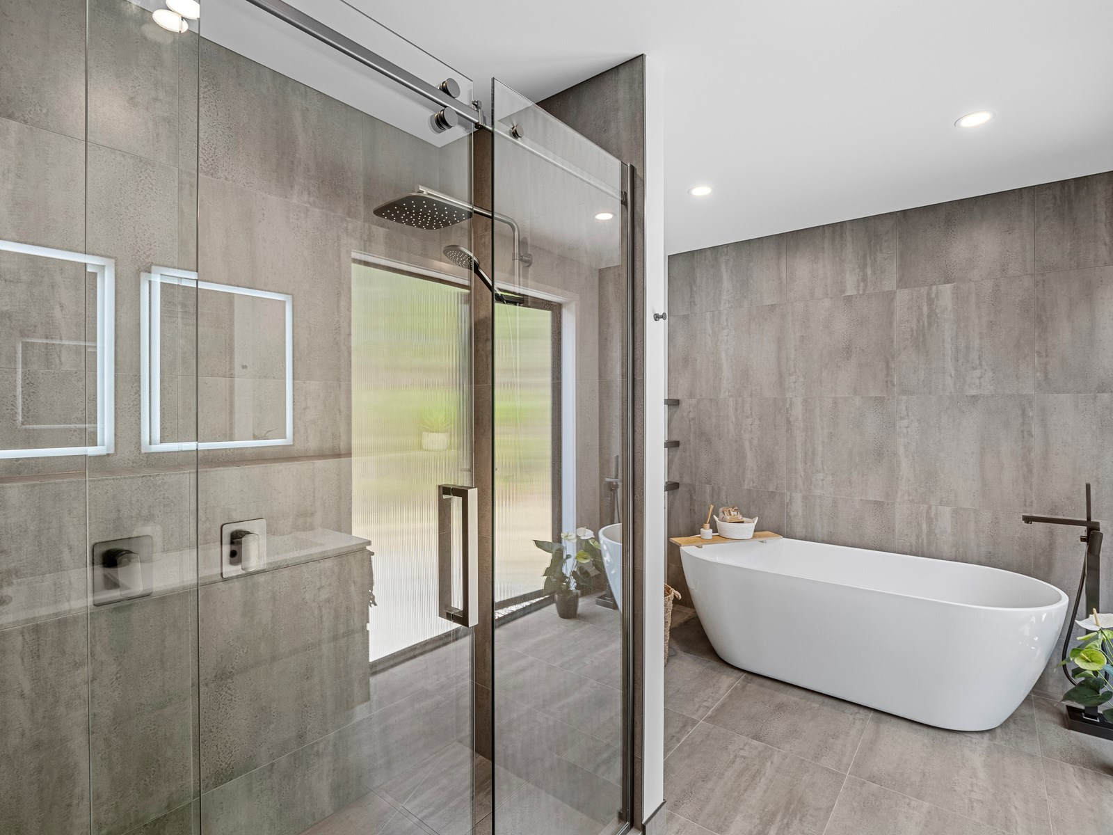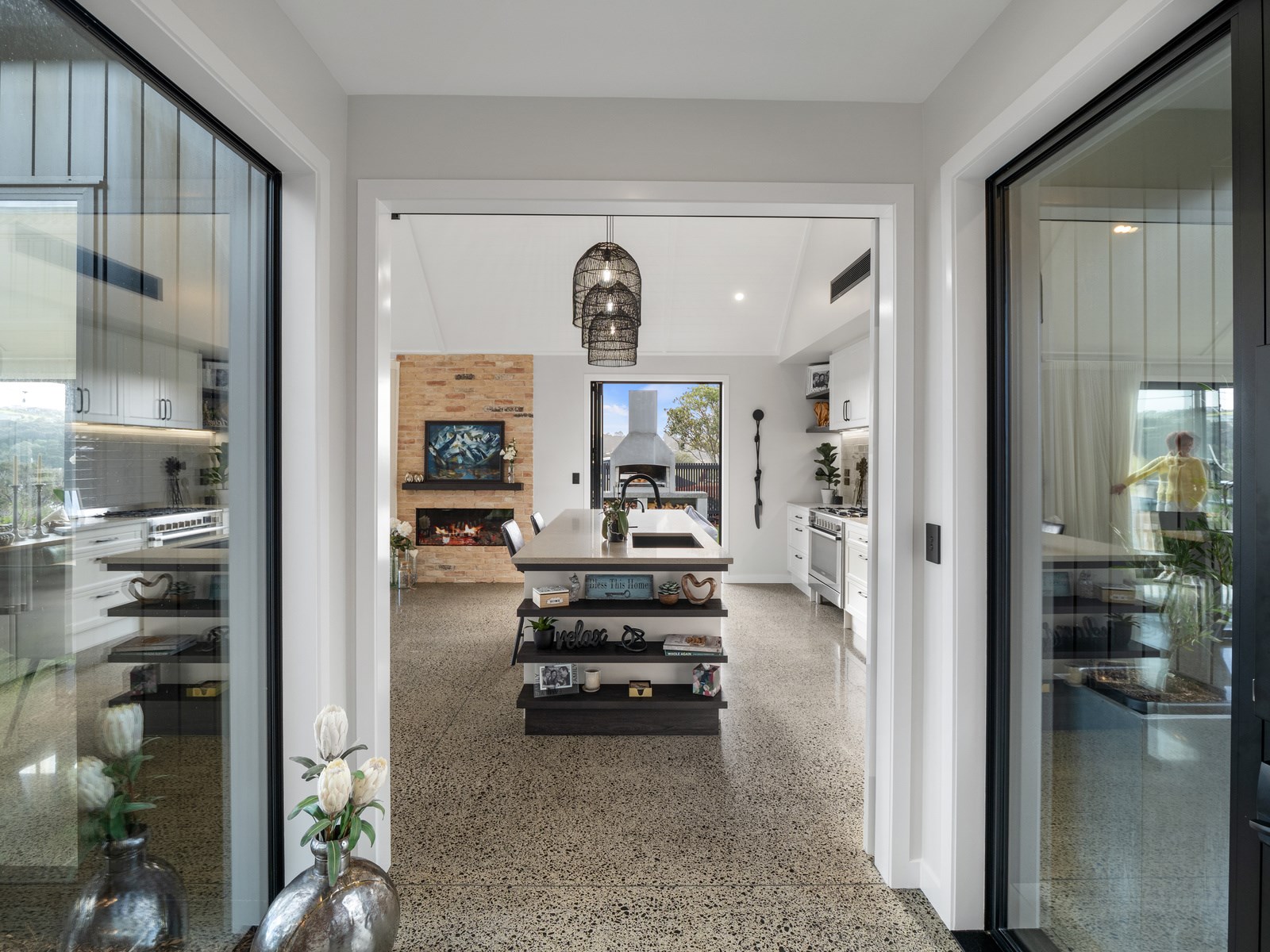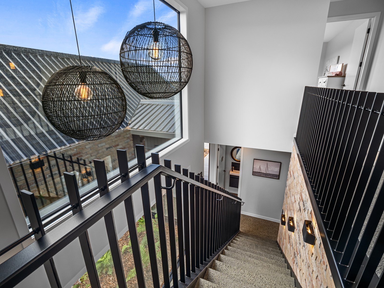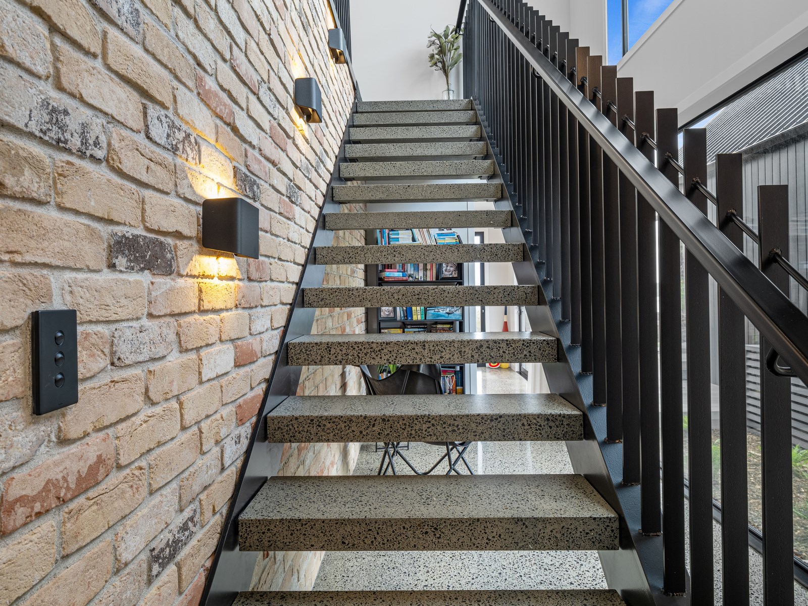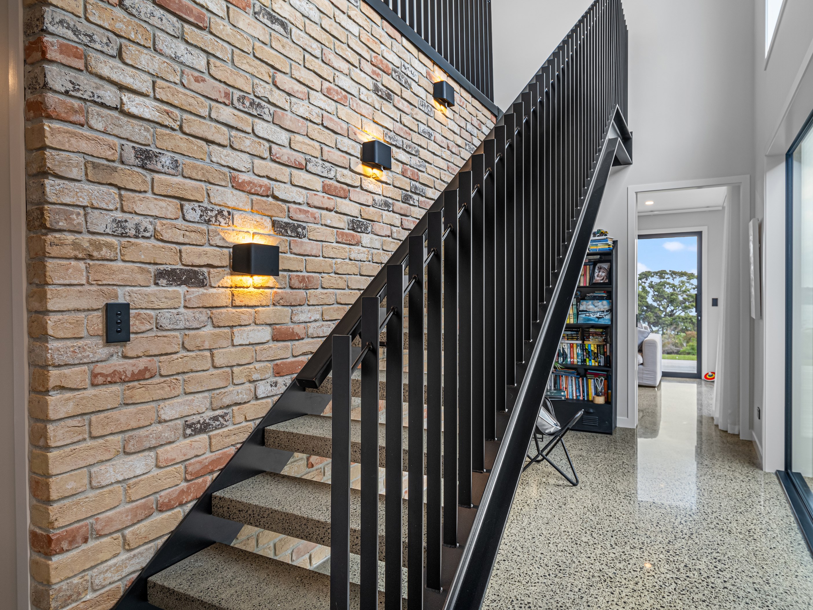 This home has been meticulously designed for a family with young adult children and it shows. There’s plenty of room for being together, but also private spaces for each person. The house also maximises panoramic views, which the owners can enjoy knowing their home is low maintenance. The interior aesthetic leans towards the industrial, and the staircase made of concrete and steel with a brick backdrop is just one example of this edgy elegance. It’s also proof of a great collaboration between visionary clients, designers and builders.
