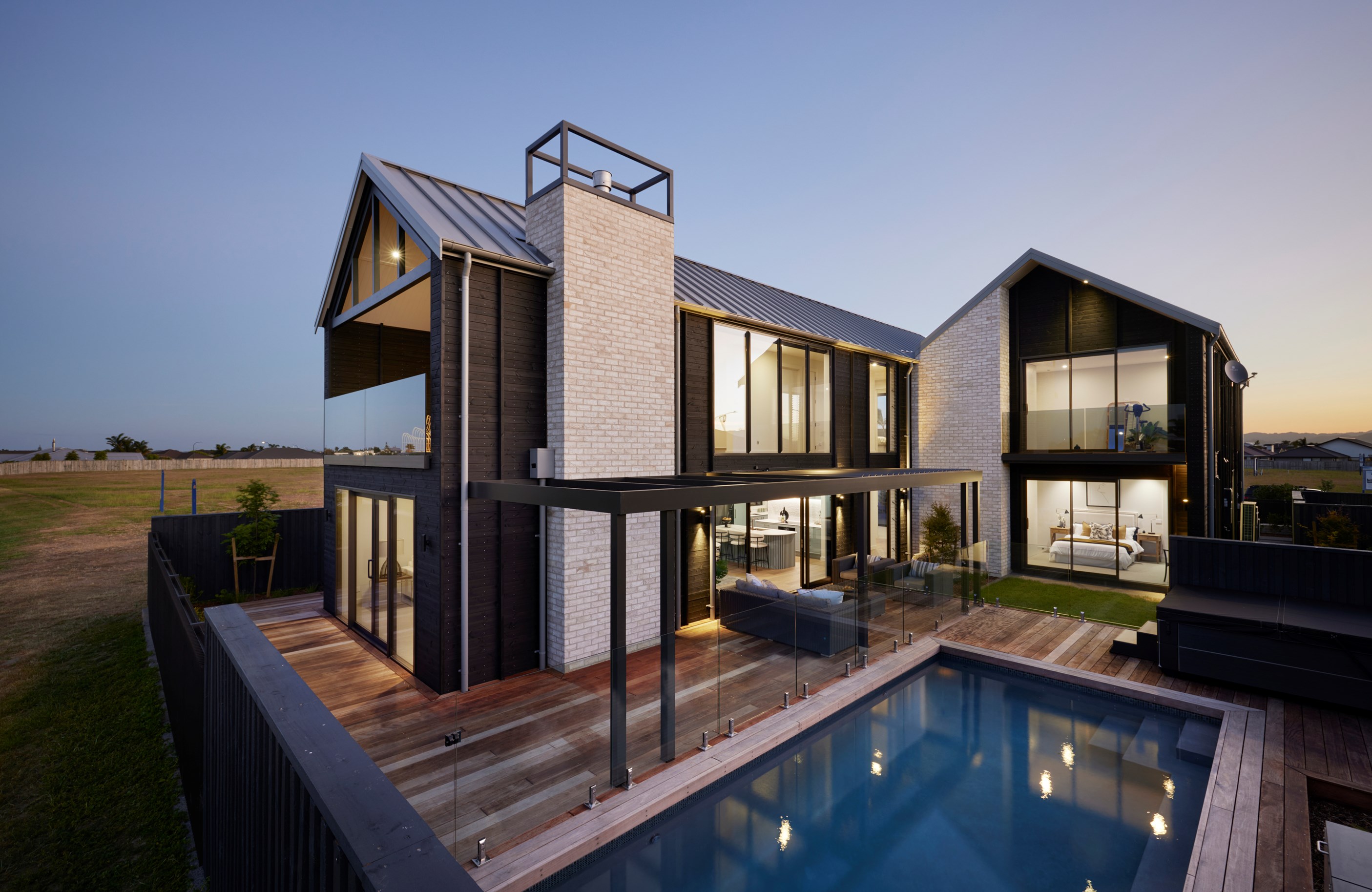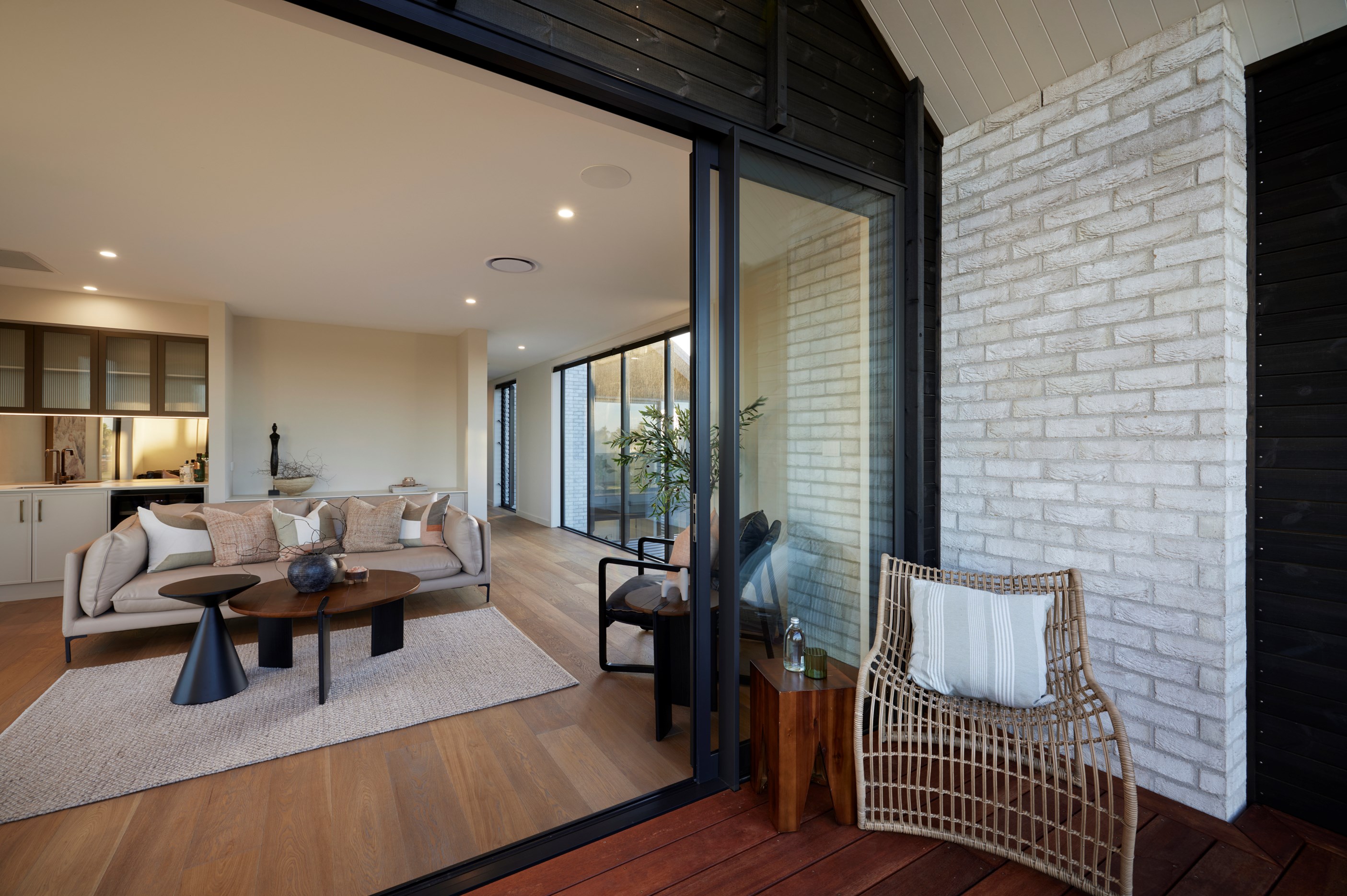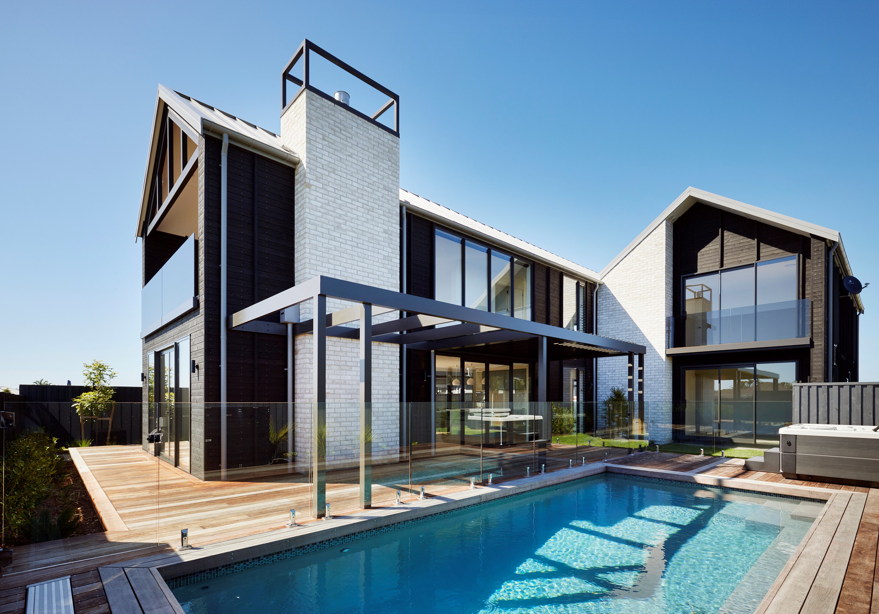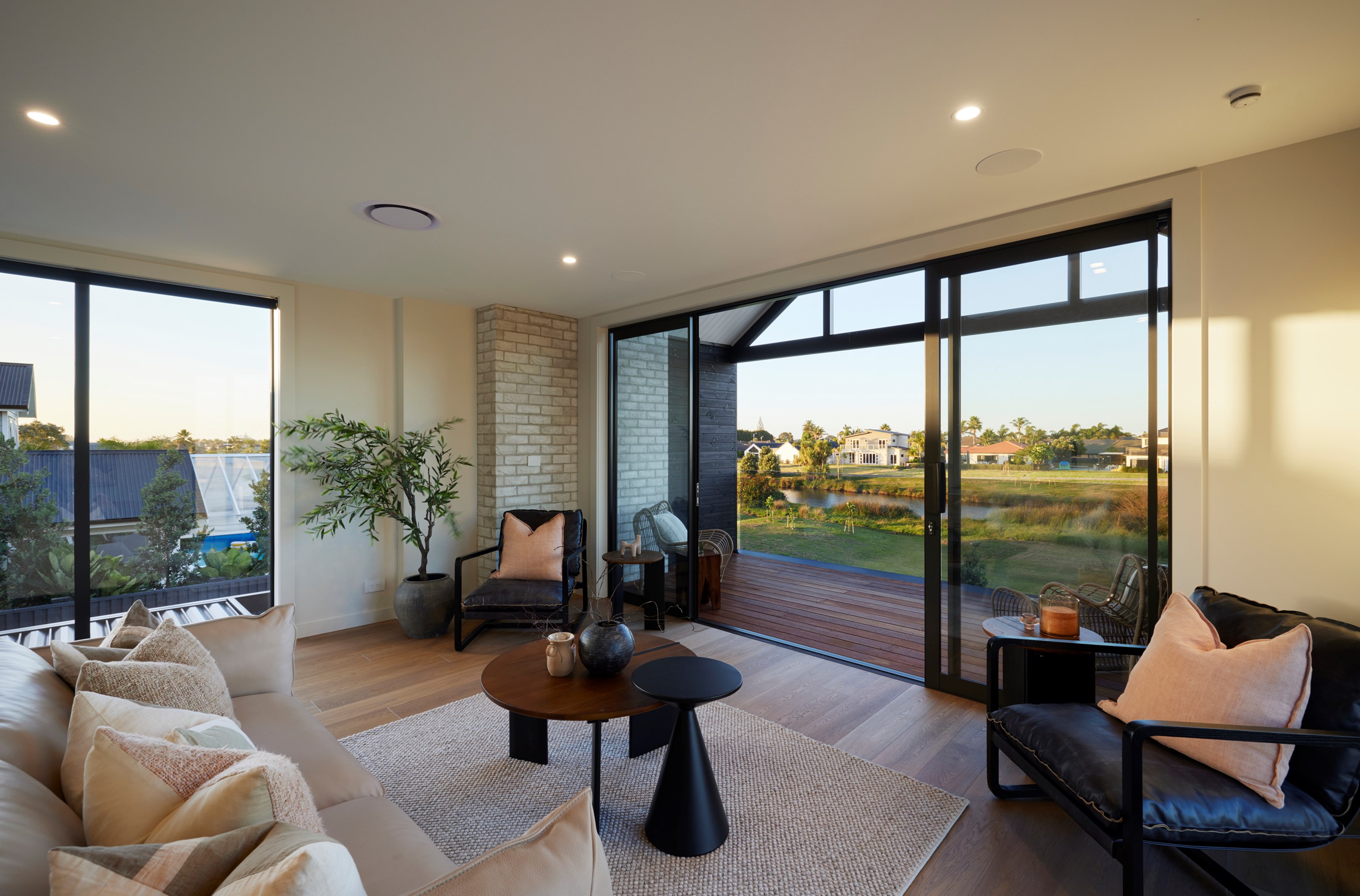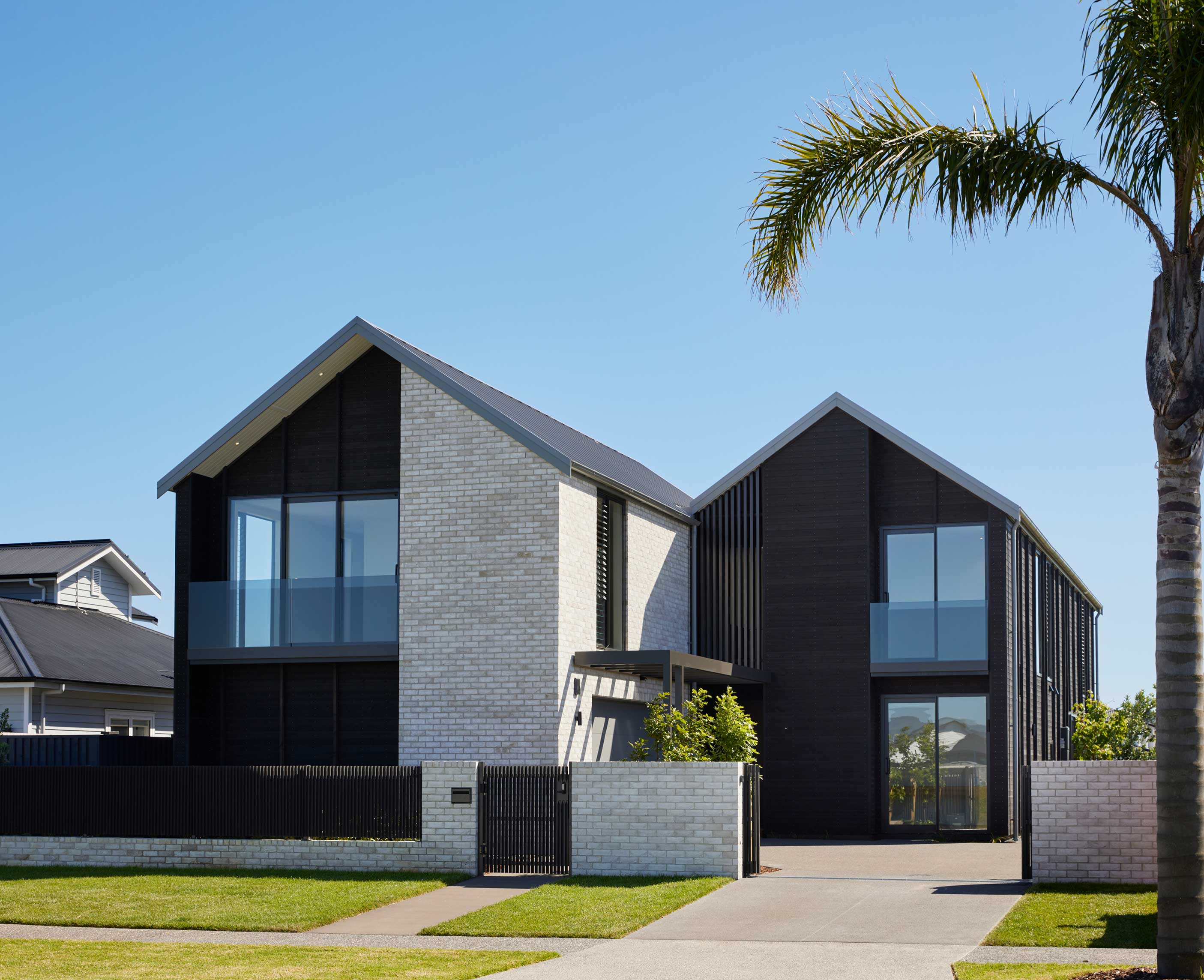 Striking and strong, this house on a waterway in the Palm Springs coastal development has instant street appeal. The property stands out for another reason: it brings the mountains to the beach. The four-bedroom, three-bathroom home in an exclusive Harwood Homes development, is part of the company’s Alpine collection, curated by JMAC Architecture and inspired by the soaring landscapes of Aotearoa. This is a significant residence in terms of scale and style. It comprises two staggered double-storey wings with gables in a clever 343sqm floorplan. Black-stained Lunawood, rumbled brick, board and batten, and sandstone grey seam-tray roofing bring the stark beauty and contrasts of southern climes to mind.