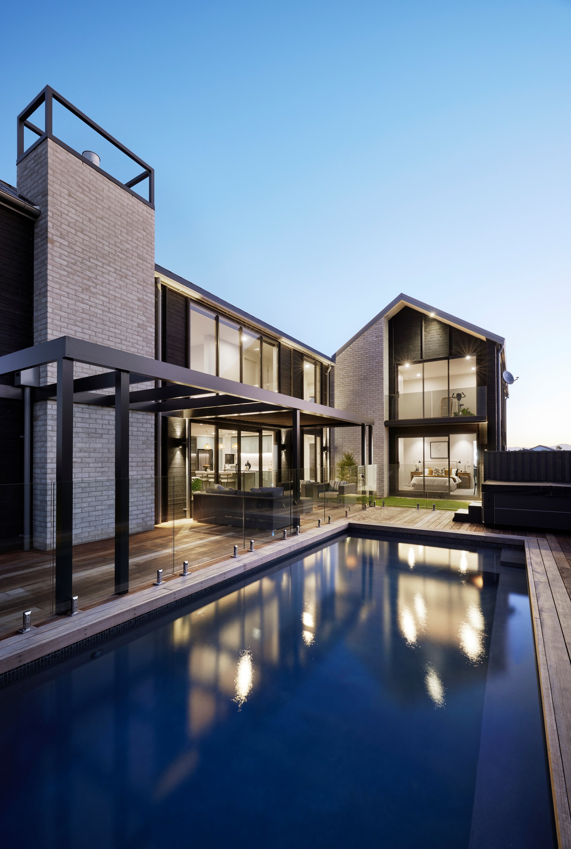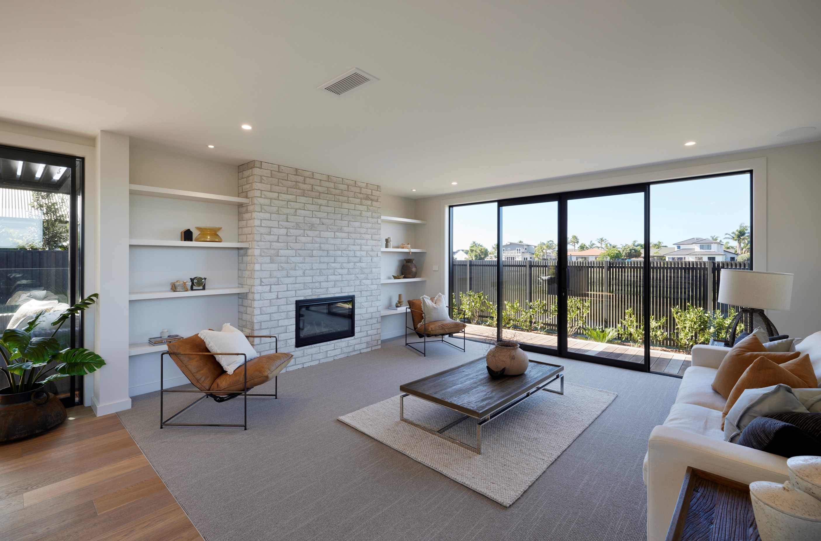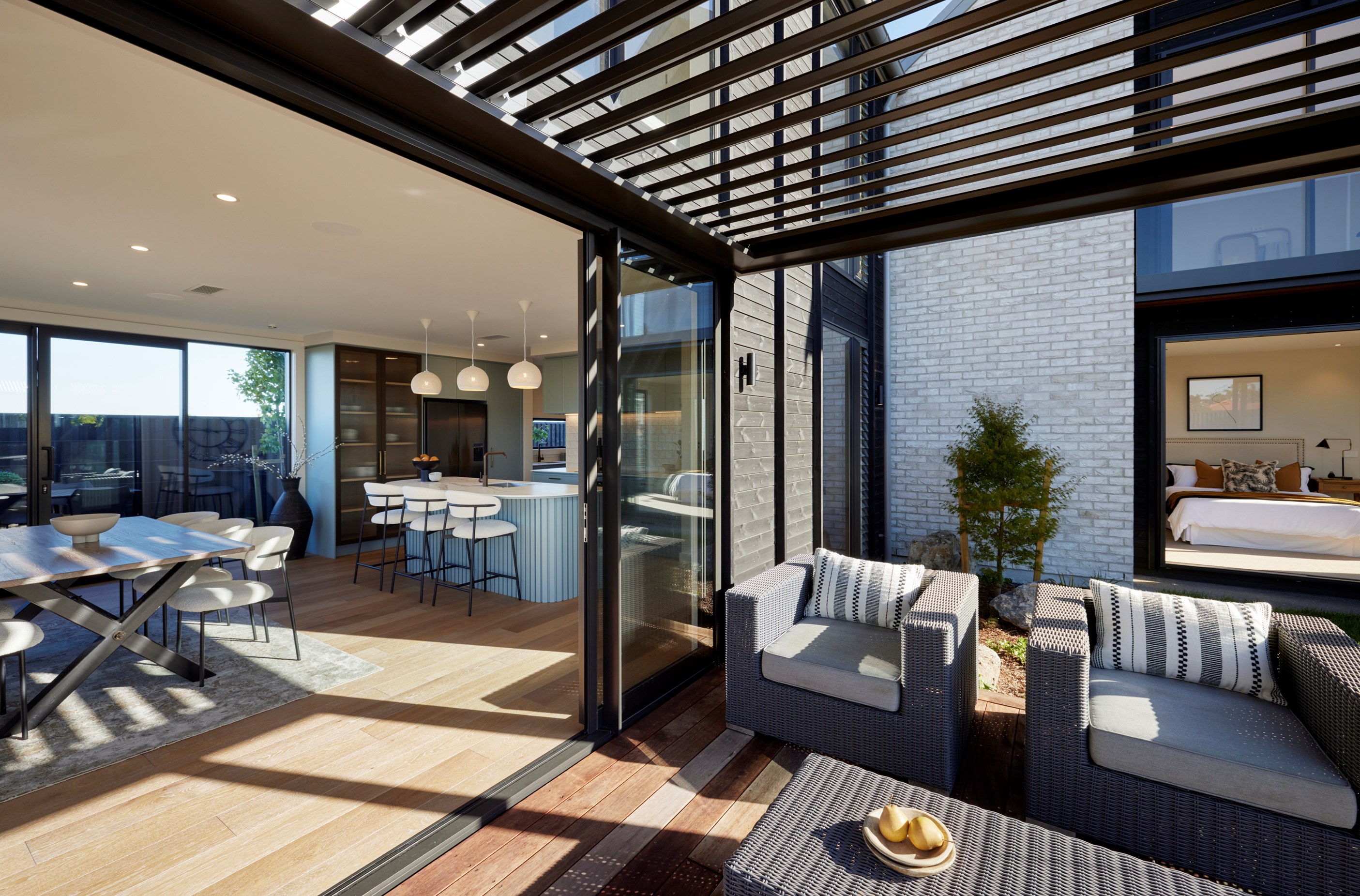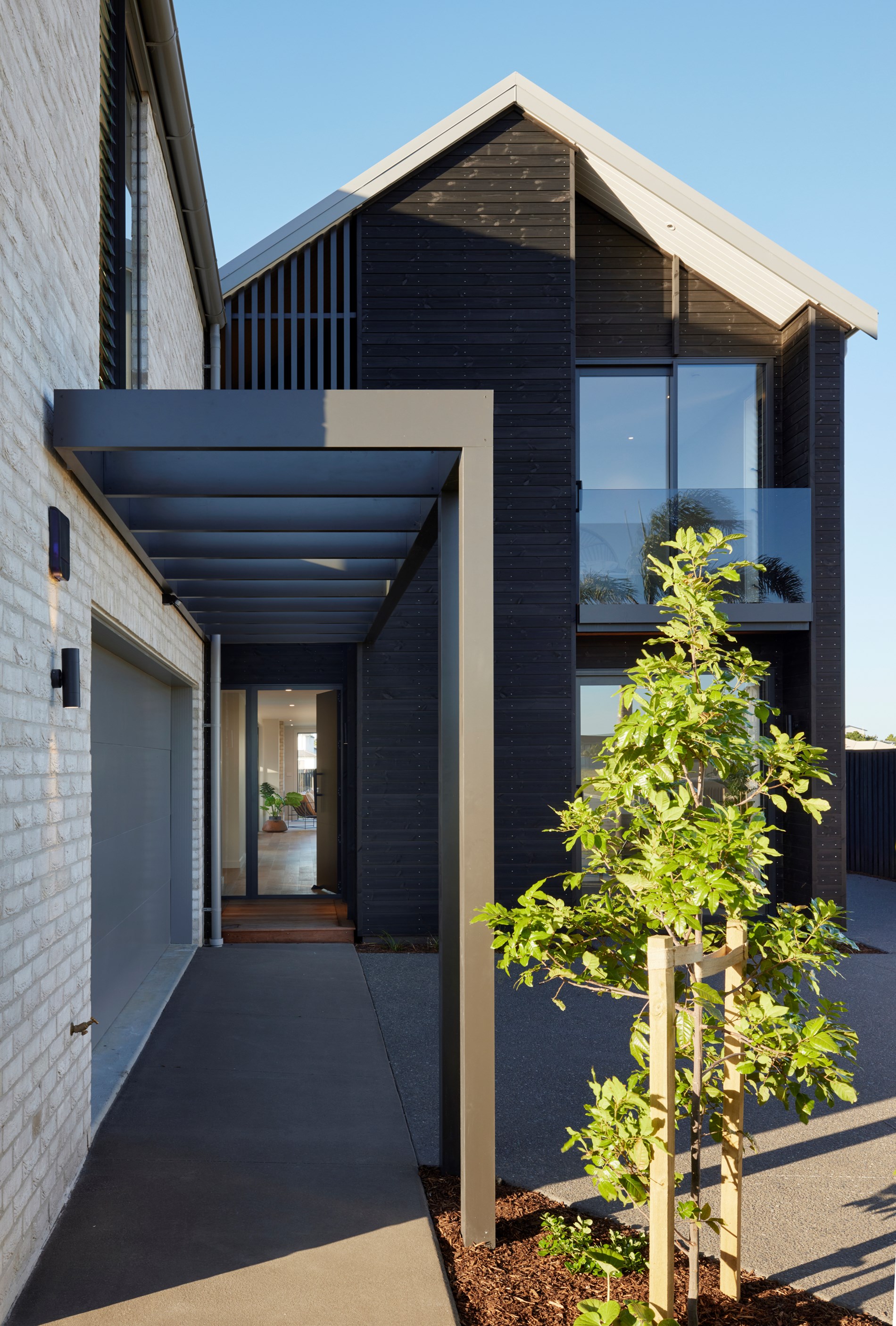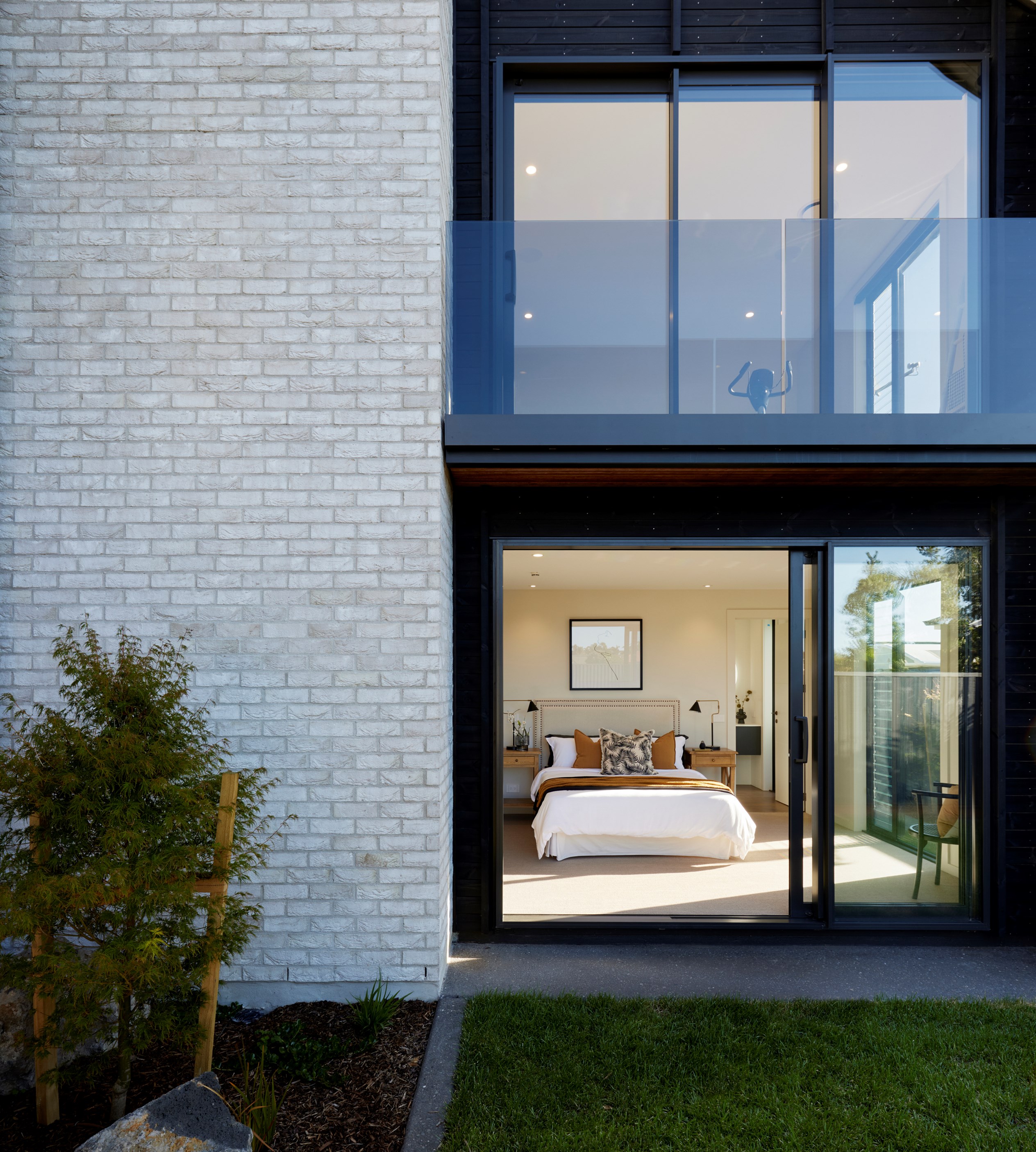 Striking and strong, this house on a waterway in the Palm Springs coastal development has instant street appeal. The property stands out for another reason: it brings the mountains to the beach. The four-bedroom, three-bathroom home in an exclusive Harwood Homes development, is part of the company’s Alpine collection, curated by JMAC Architecture and inspired by the soaring landscapes of Aotearoa. This is a significant residence in terms of scale and style. It comprises two staggered double-storey wings with gables in a clever 343sqm floorplan. Black-stained Lunawood, rumbled brick, board and batten, and sandstone grey seam-tray roofing bring the stark beauty and contrasts of southern climes to mind.