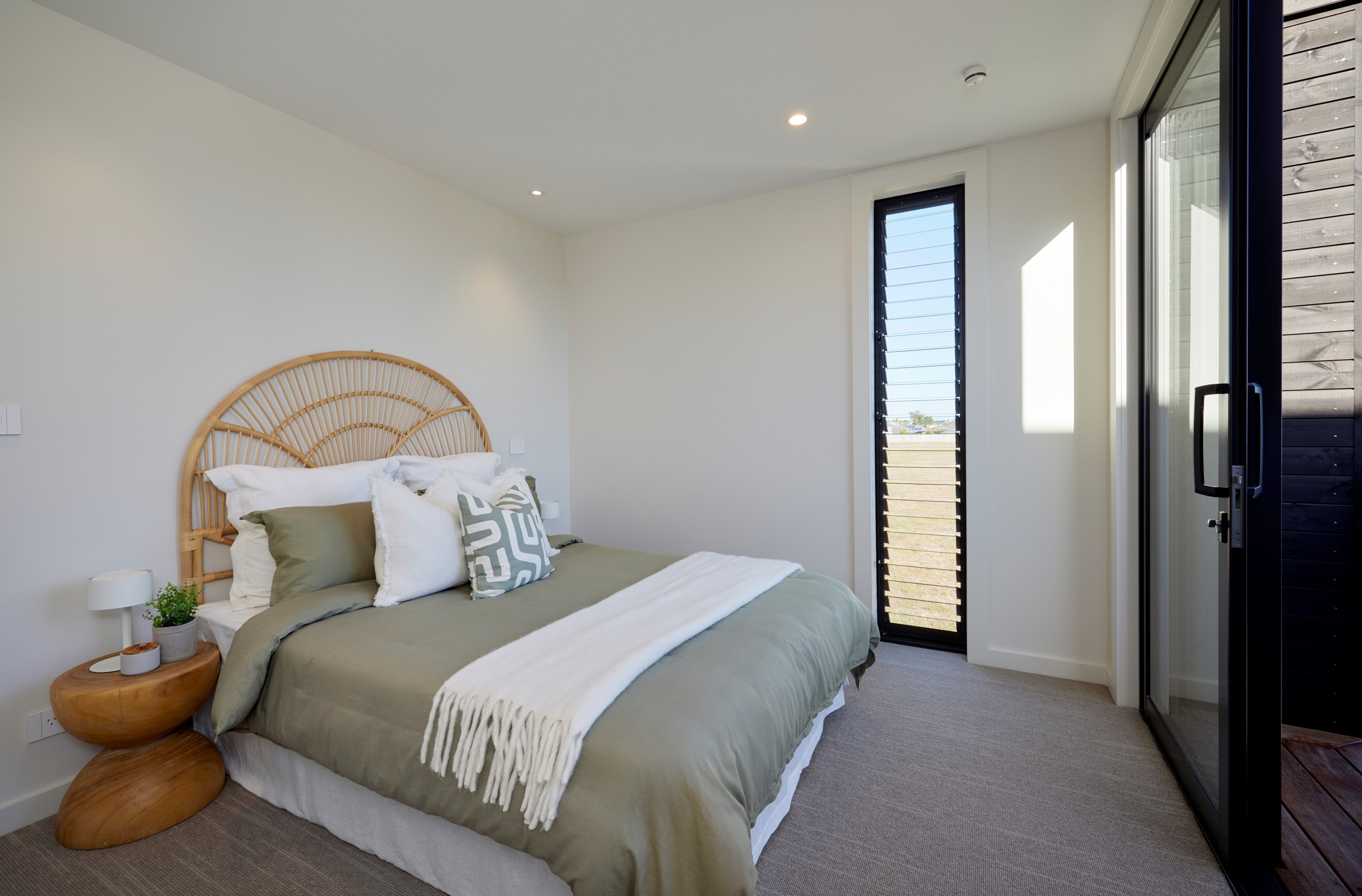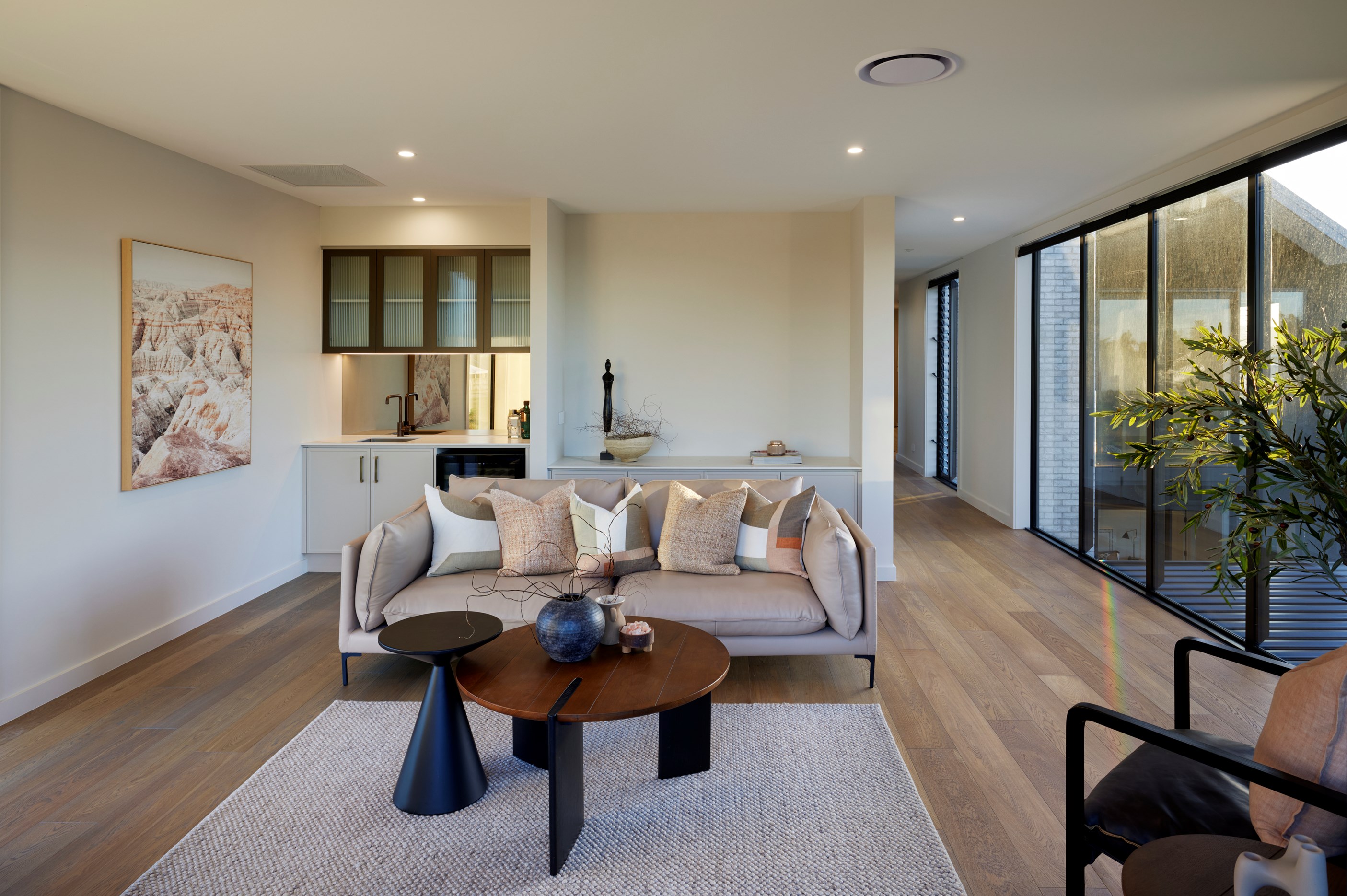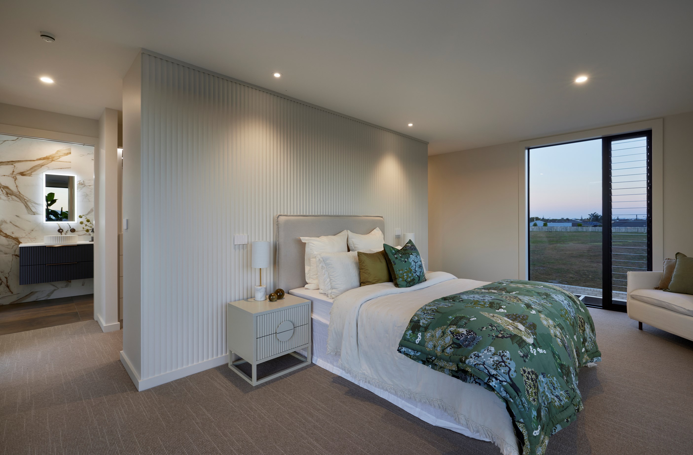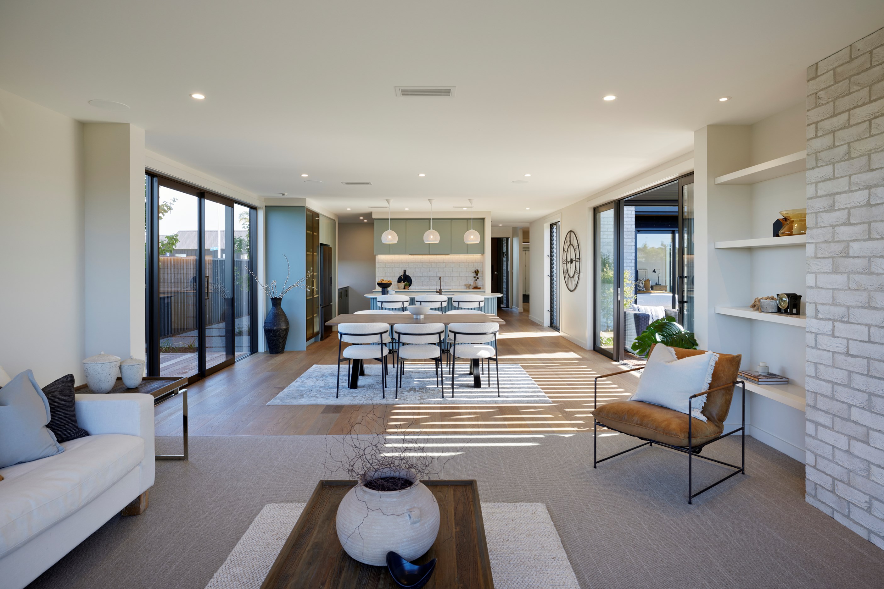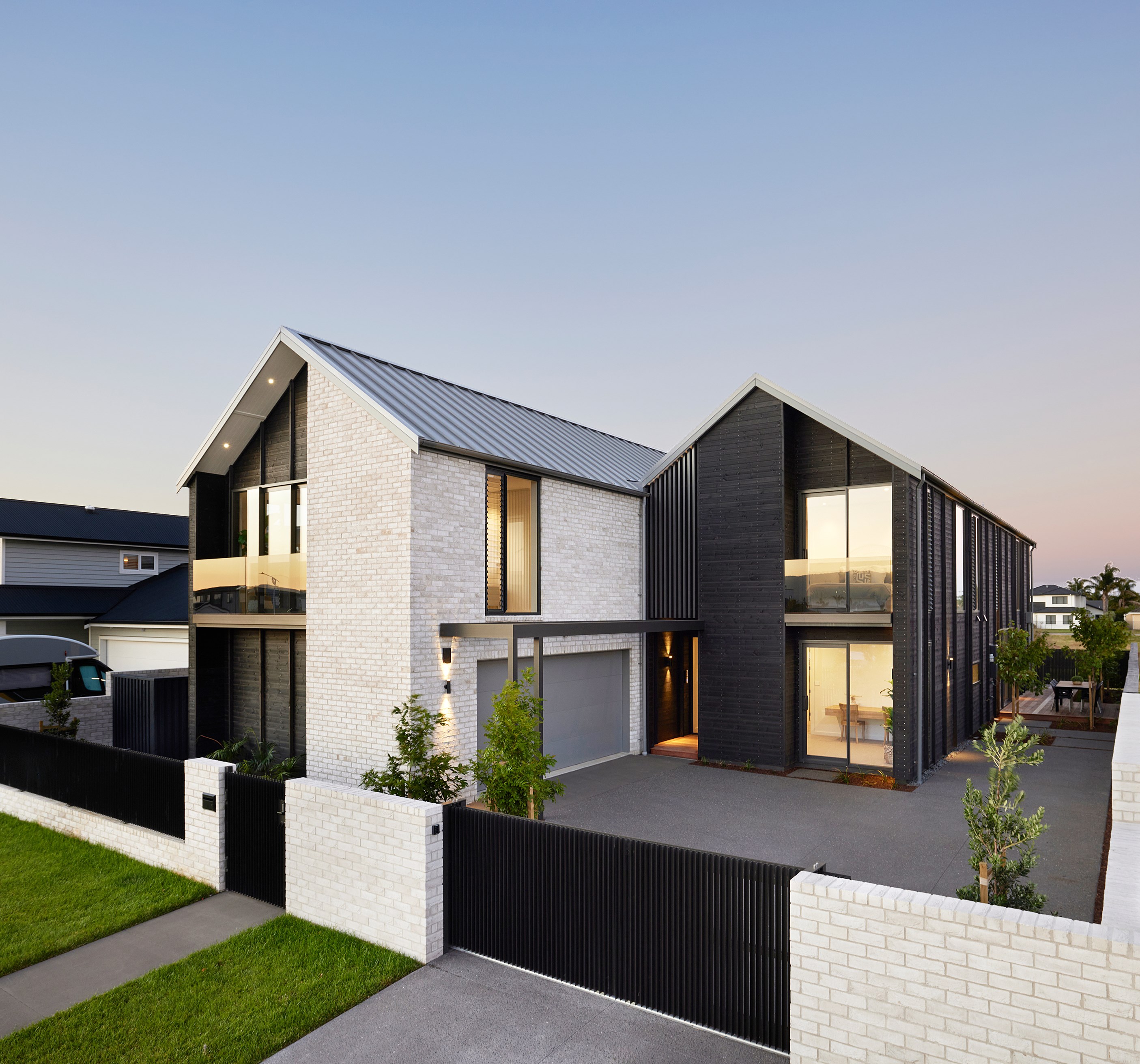 Striking and strong, this house on a waterway in the Palm Springs coastal development has instant street appeal. The property stands out for another reason: it brings the mountains to the beach. The four-bedroom, three-bathroom home in an exclusive Harwood Homes development, is part of the company’s Alpine collection, curated by JMAC Architecture and inspired by the soaring landscapes of Aotearoa. This is a significant residence in terms of scale and style. It comprises two staggered double-storey wings with gables in a clever 343sqm floorplan. Black-stained Lunawood, rumbled brick, board and batten, and sandstone grey seam-tray roofing bring the stark beauty and contrasts of southern climes to mind.