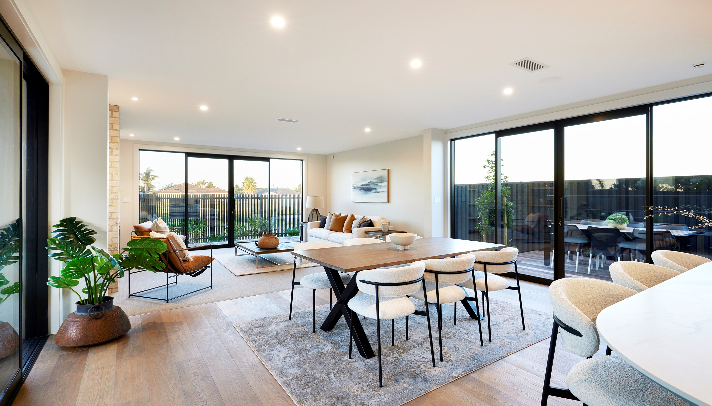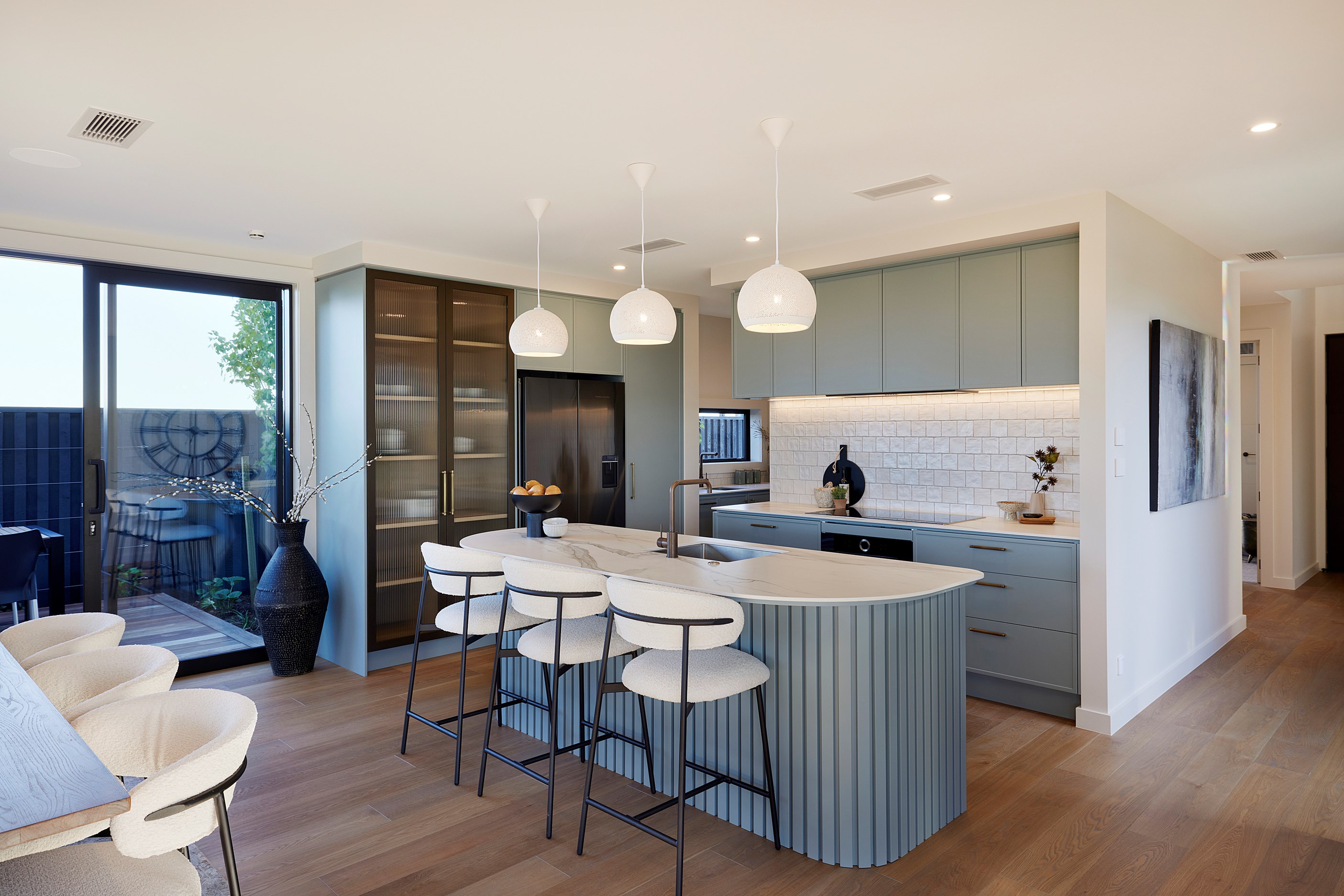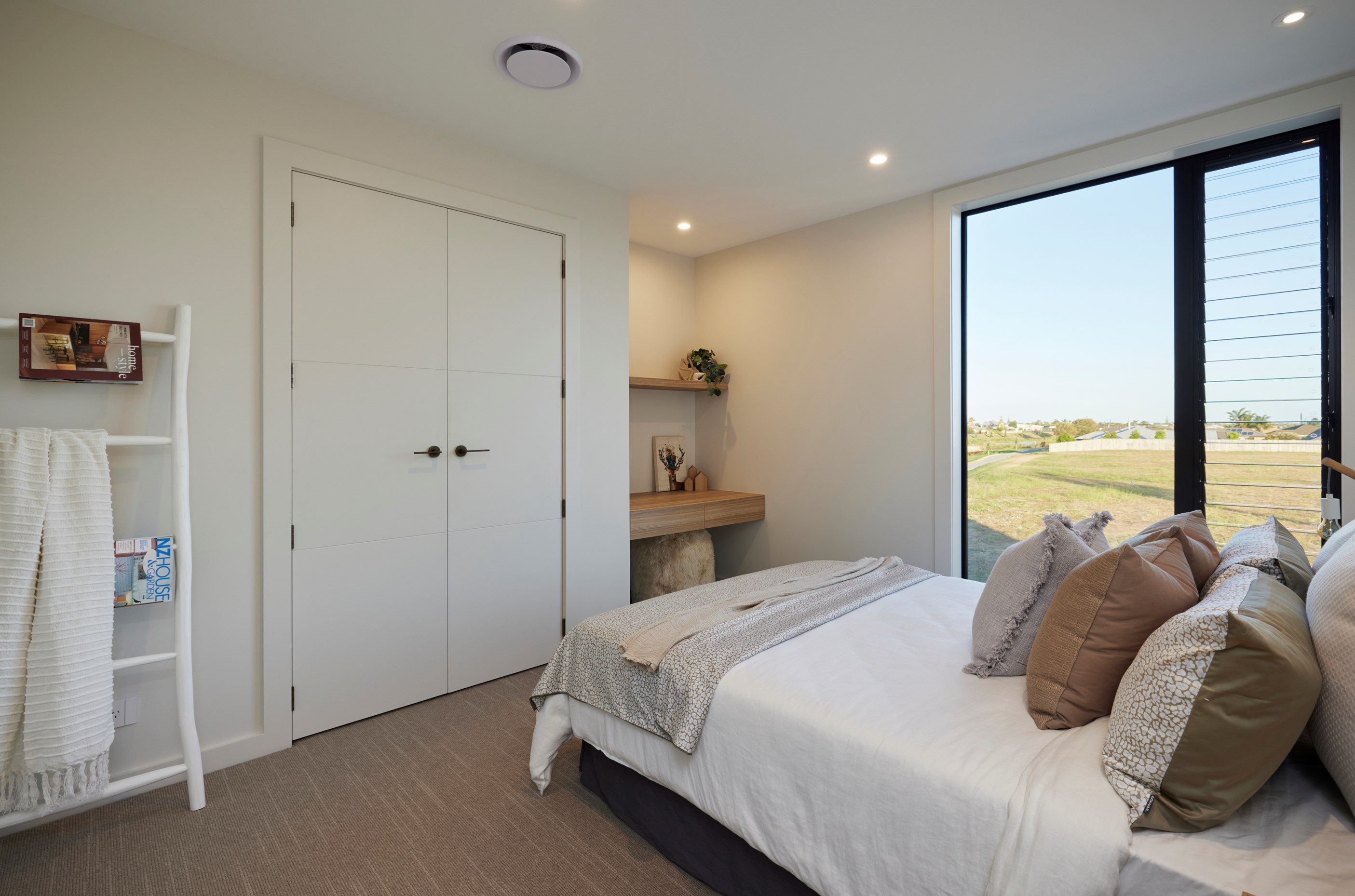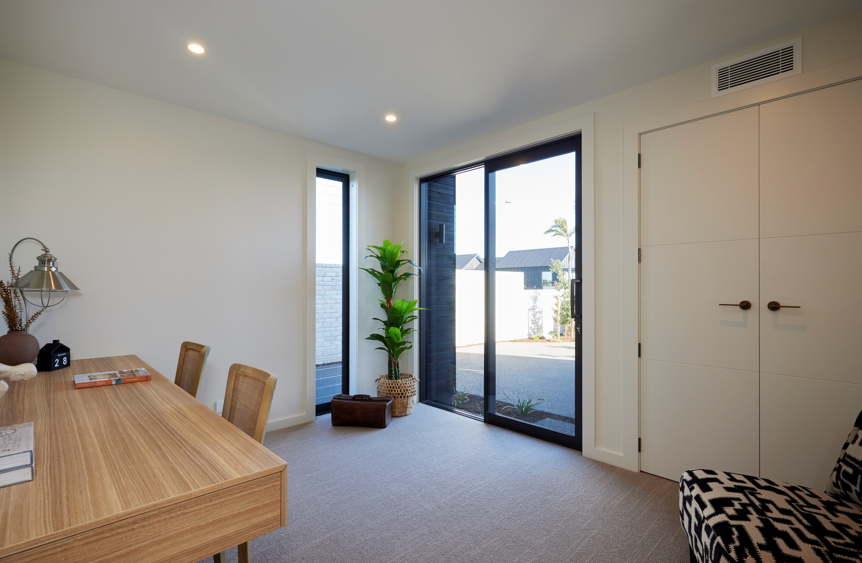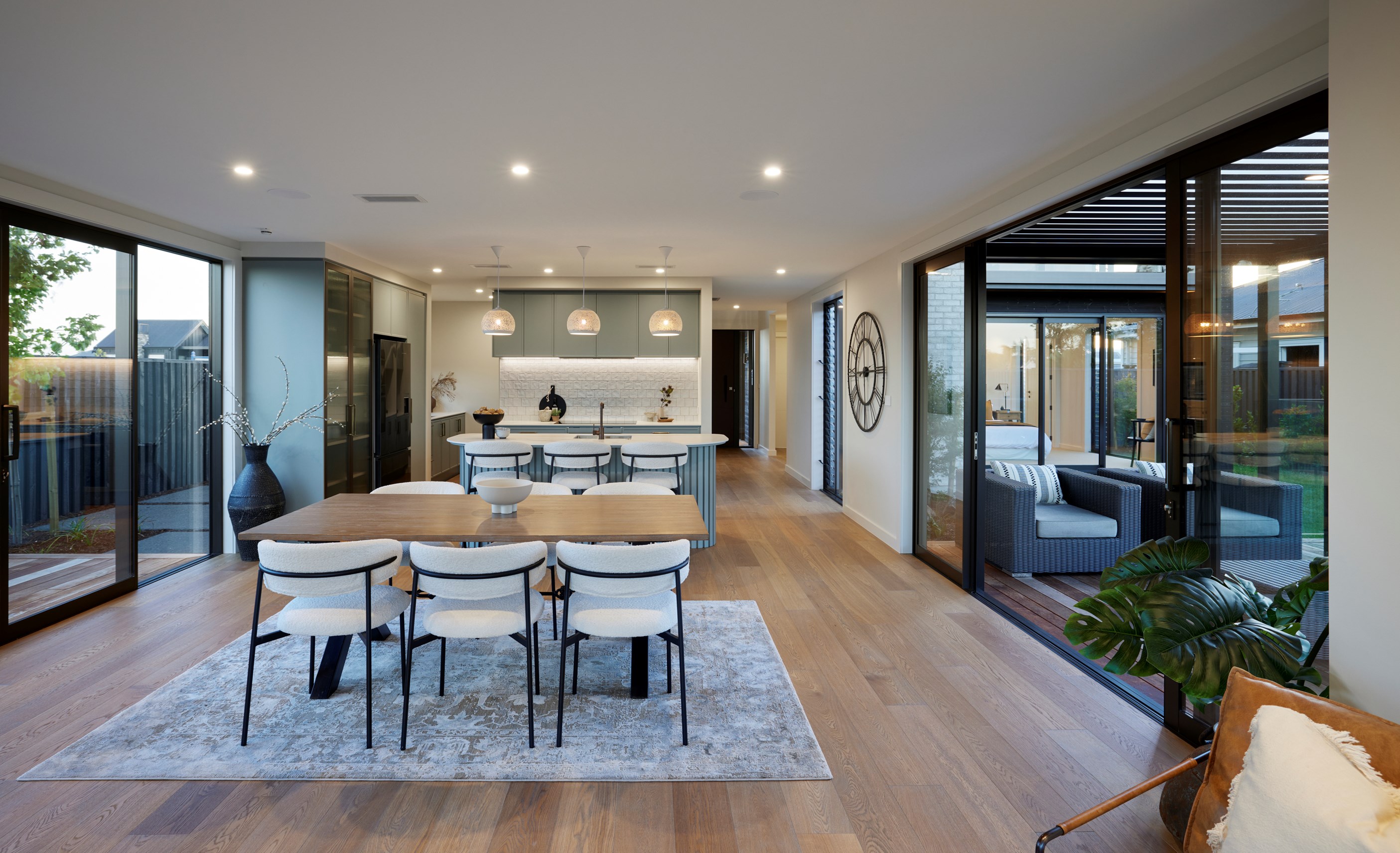 Striking and strong, this house on a waterway in the Palm Springs coastal development has instant street appeal. The property stands out for another reason: it brings the mountains to the beach. The four-bedroom, three-bathroom home in an exclusive Harwood Homes development, is part of the company’s Alpine collection, curated by JMAC Architecture and inspired by the soaring landscapes of Aotearoa. This is a significant residence in terms of scale and style. It comprises two staggered double-storey wings with gables in a clever 343sqm floorplan. Black-stained Lunawood, rumbled brick, board and batten, and sandstone grey seam-tray roofing bring the stark beauty and contrasts of southern climes to mind.