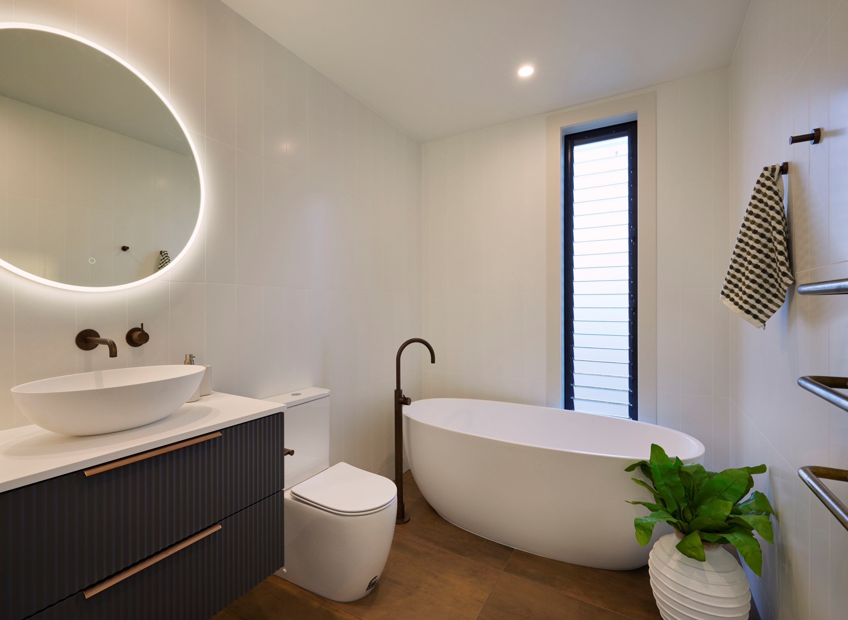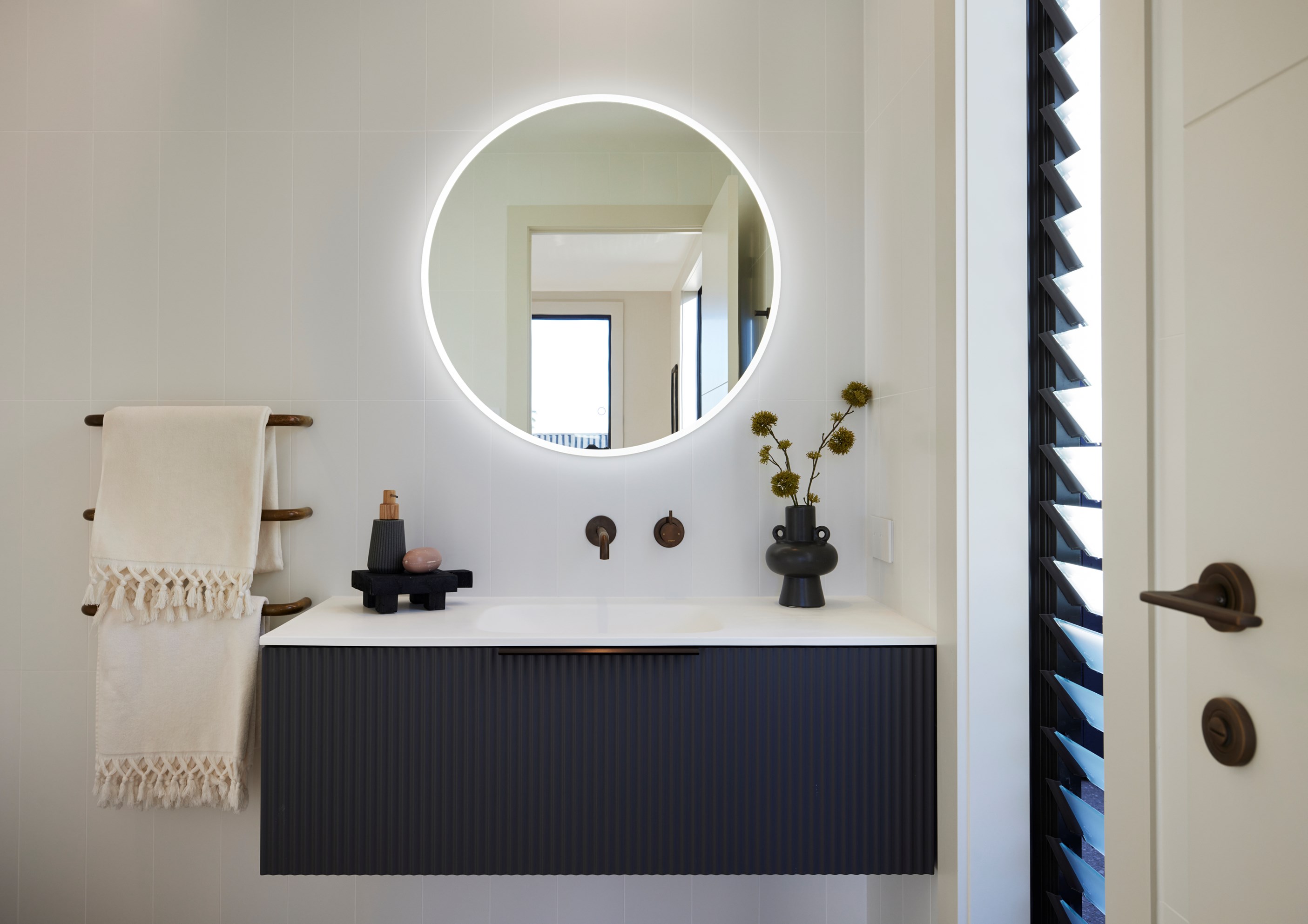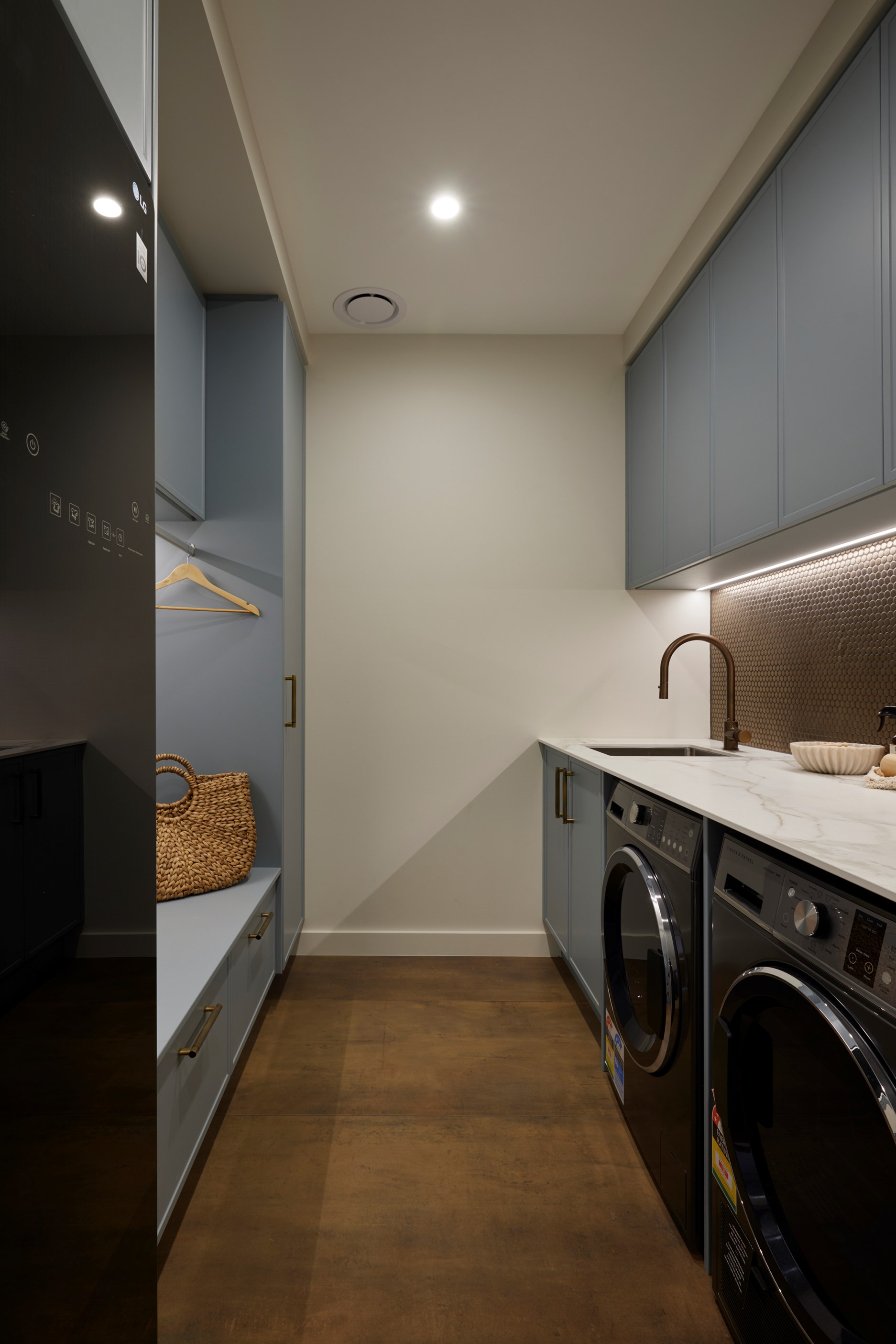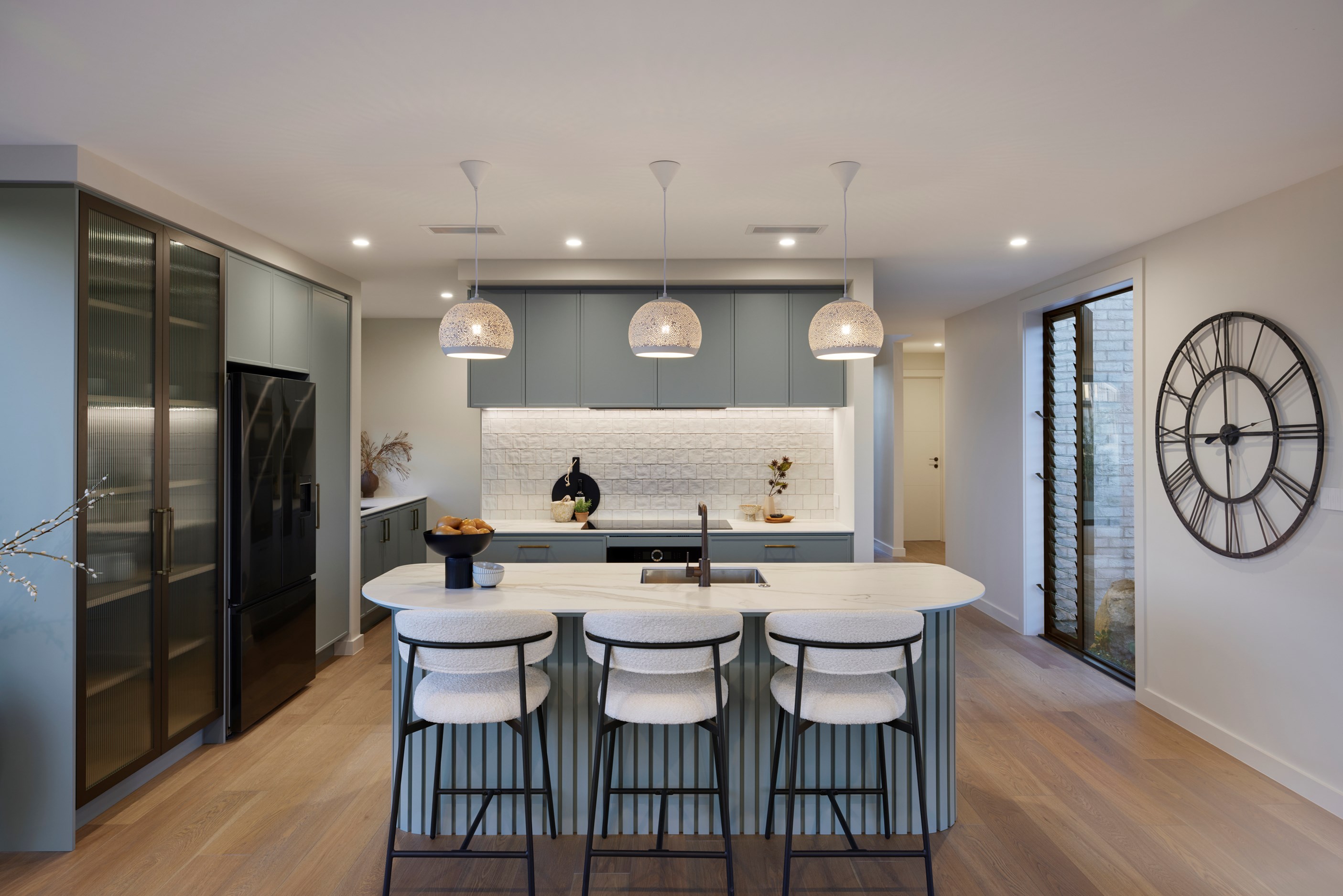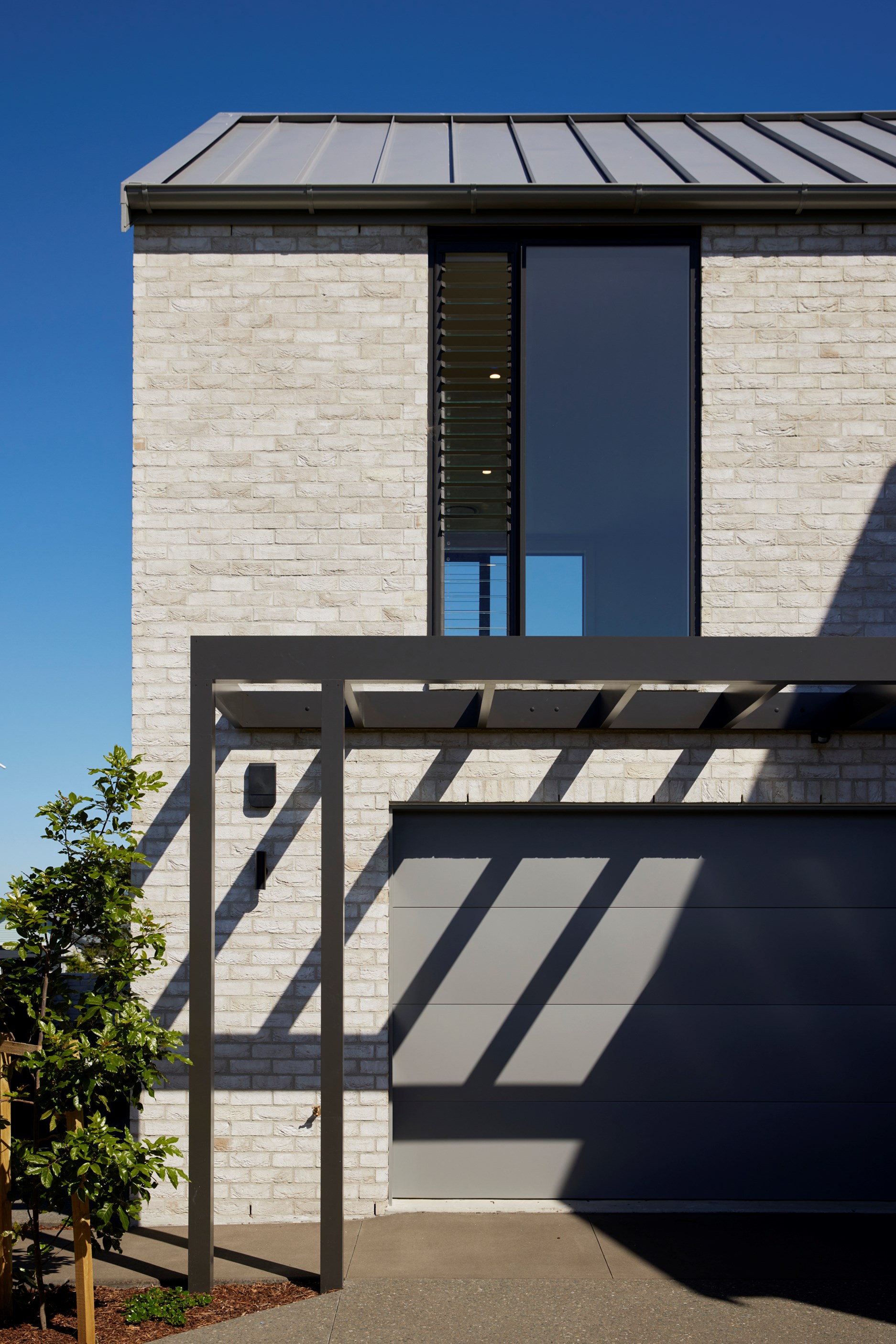 Striking and strong, this house on a waterway in the Palm Springs coastal development has instant street appeal. The property stands out for another reason: it brings the mountains to the beach. The four-bedroom, three-bathroom home in an exclusive Harwood Homes development, is part of the company’s Alpine collection, curated by JMAC Architecture and inspired by the soaring landscapes of Aotearoa. This is a significant residence in terms of scale and style. It comprises two staggered double-storey wings with gables in a clever 343sqm floorplan. Black-stained Lunawood, rumbled brick, board and batten, and sandstone grey seam-tray roofing bring the stark beauty and contrasts of southern climes to mind.