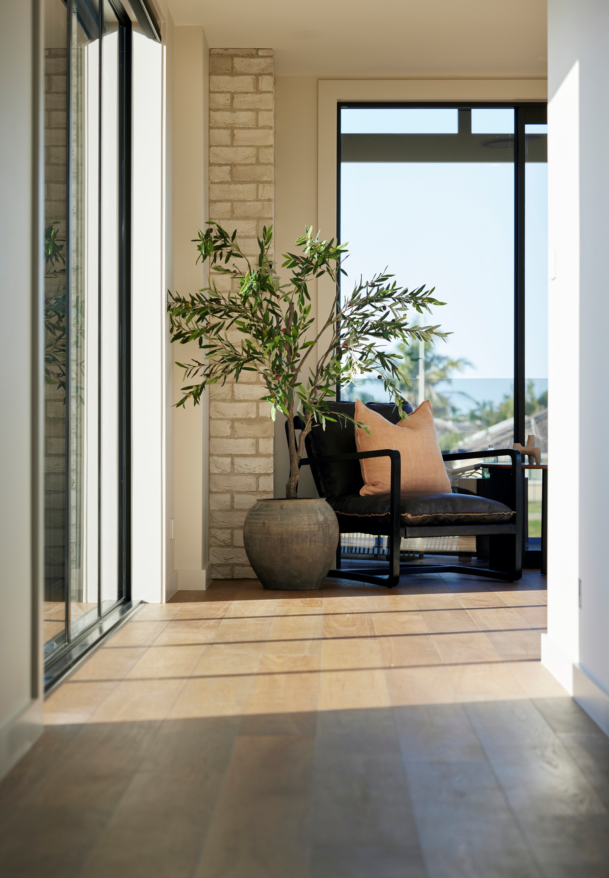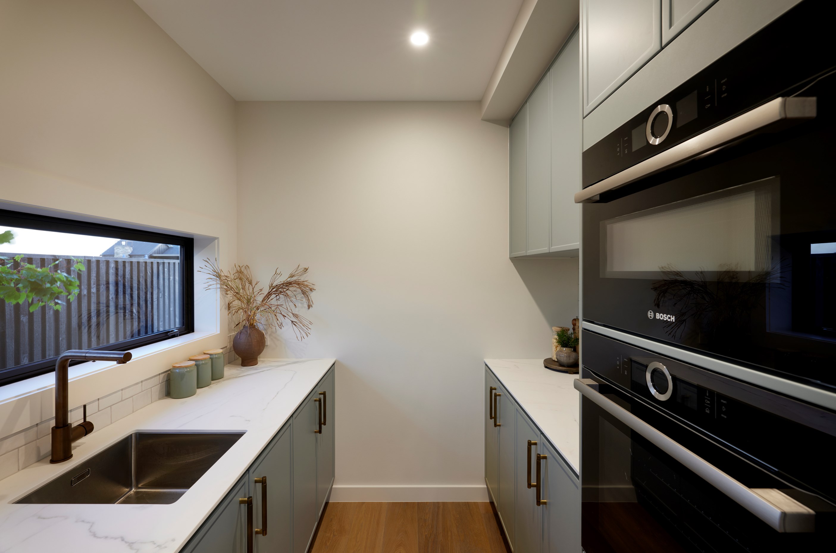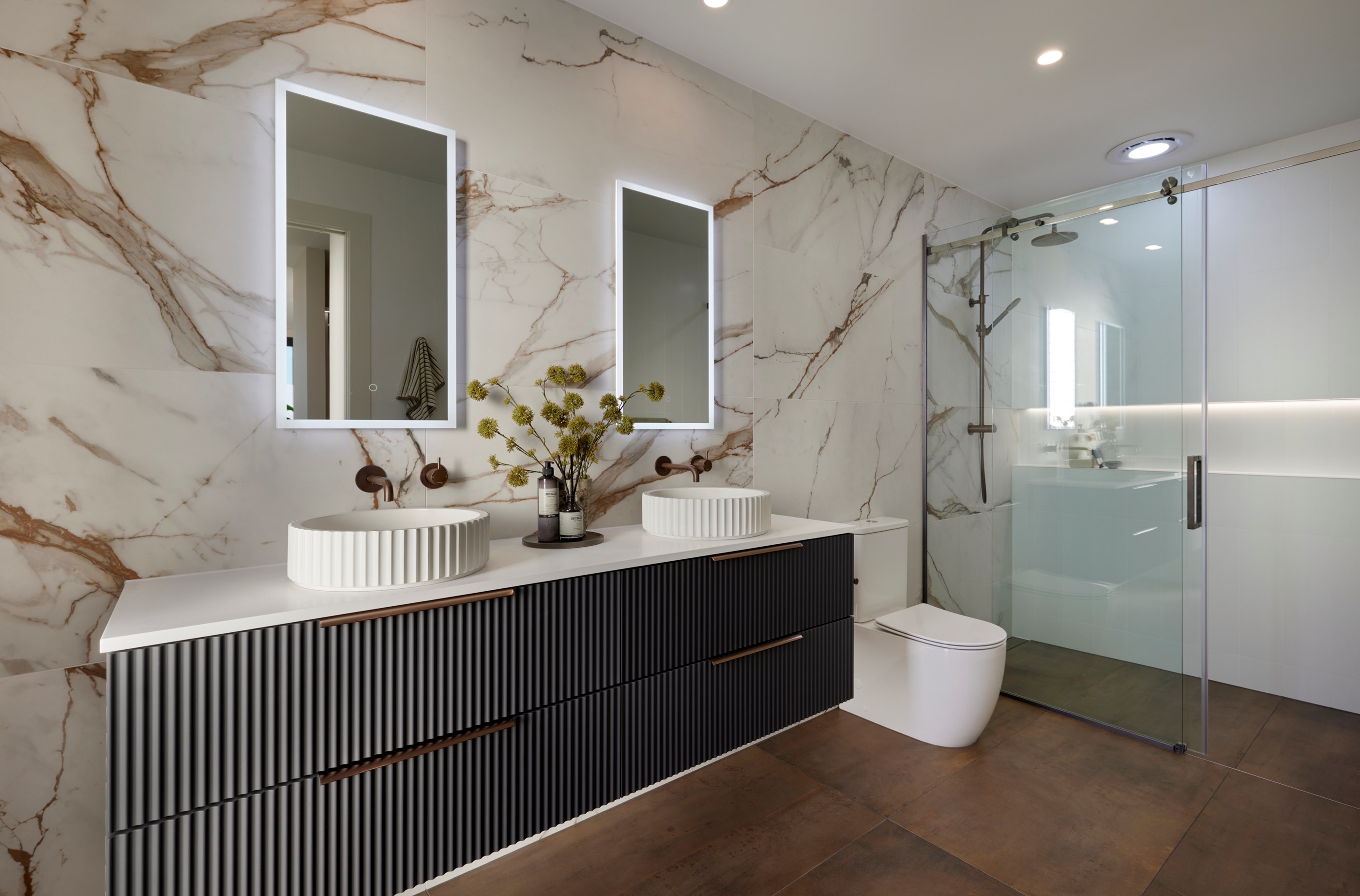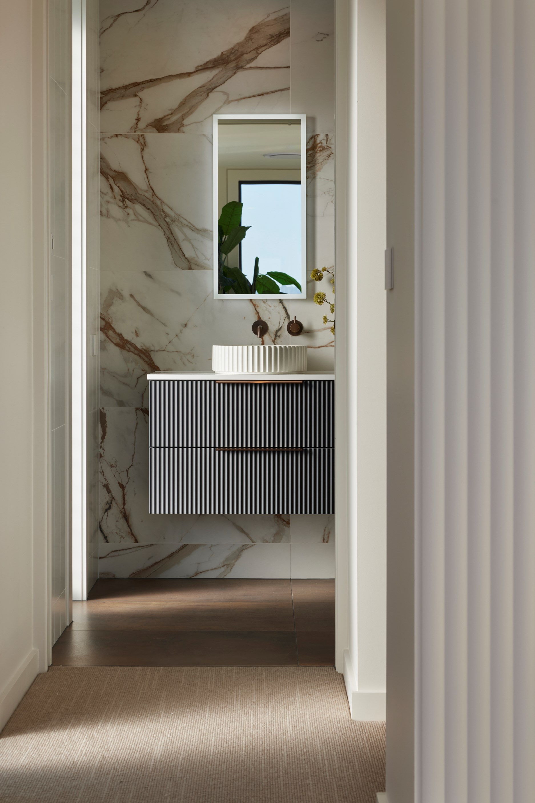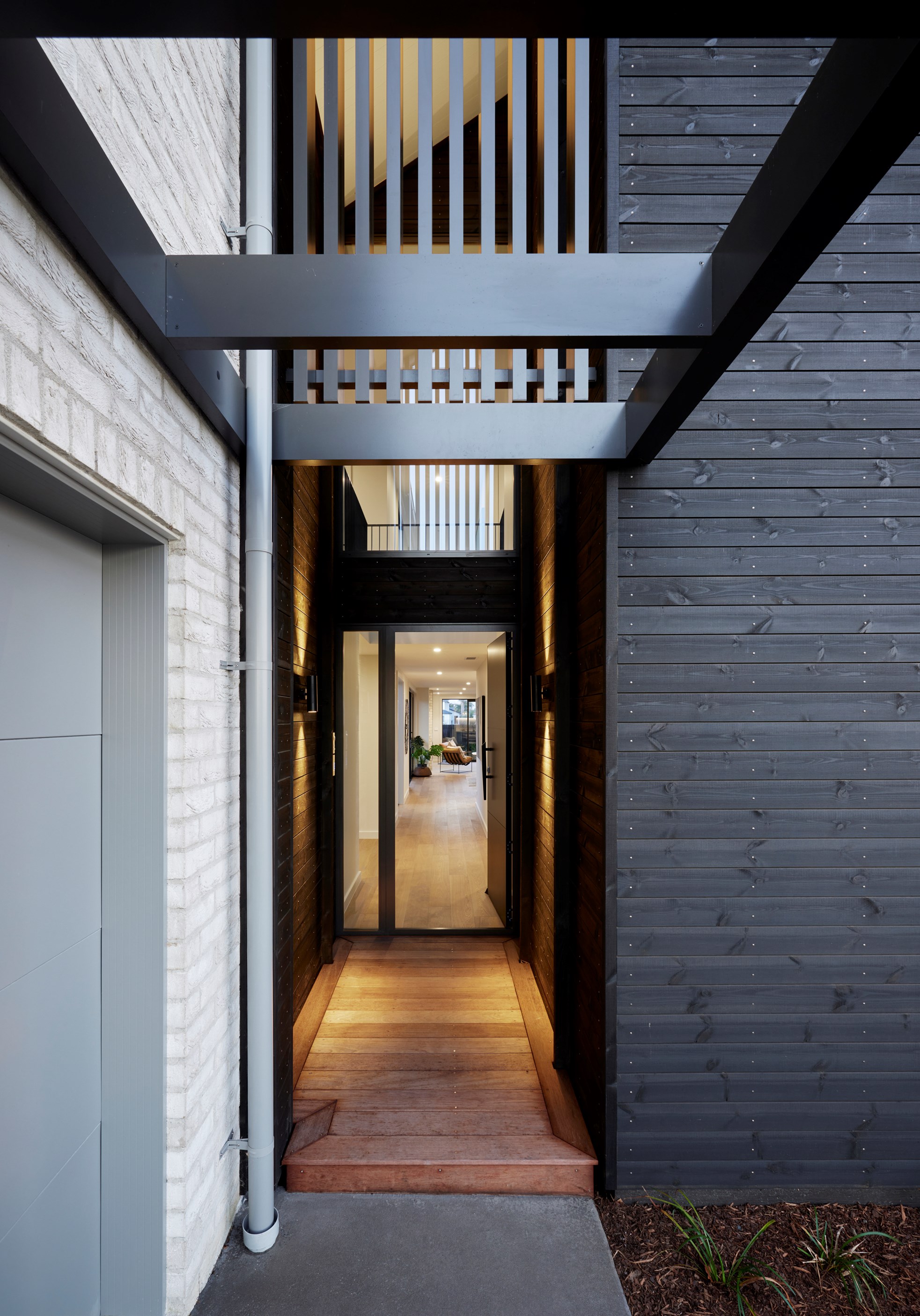 Striking and strong, this house on a waterway in the Palm Springs coastal development has instant street appeal. The property stands out for another reason: it brings the mountains to the beach. The four-bedroom, three-bathroom home in an exclusive Harwood Homes development, is part of the company’s Alpine collection, curated by JMAC Architecture and inspired by the soaring landscapes of Aotearoa. This is a significant residence in terms of scale and style. It comprises two staggered double-storey wings with gables in a clever 343sqm floorplan. Black-stained Lunawood, rumbled brick, board and batten, and sandstone grey seam-tray roofing bring the stark beauty and contrasts of southern climes to mind.