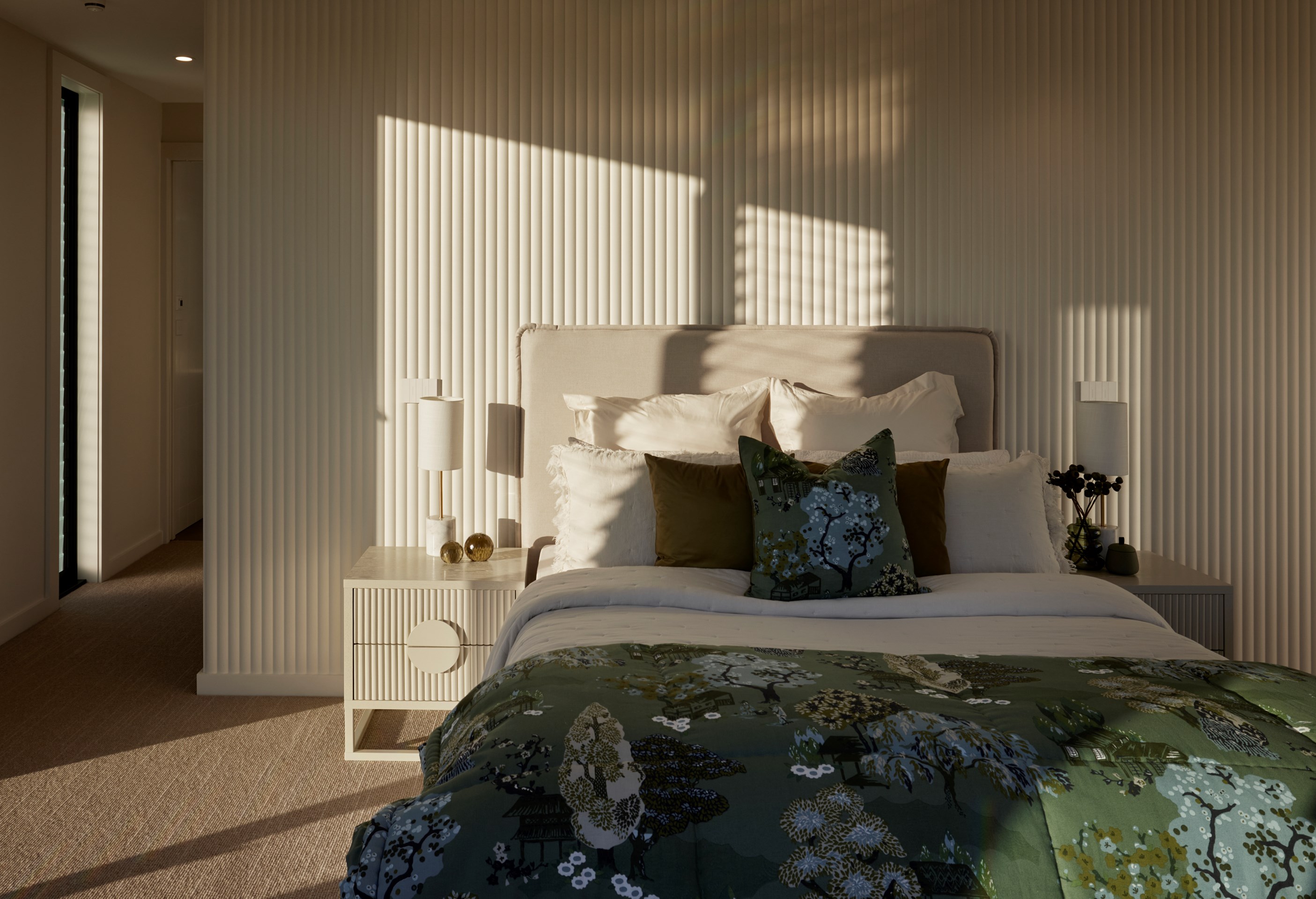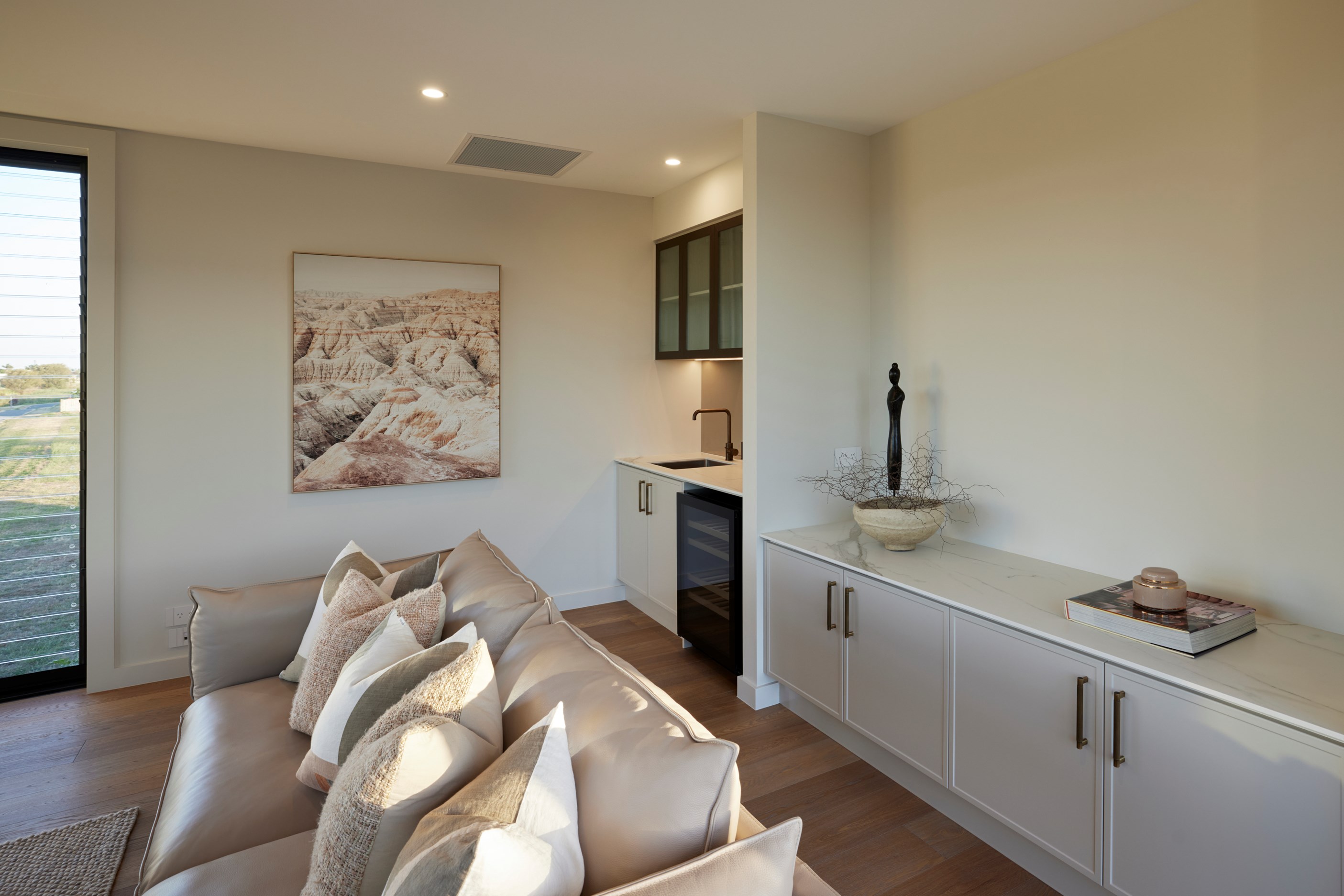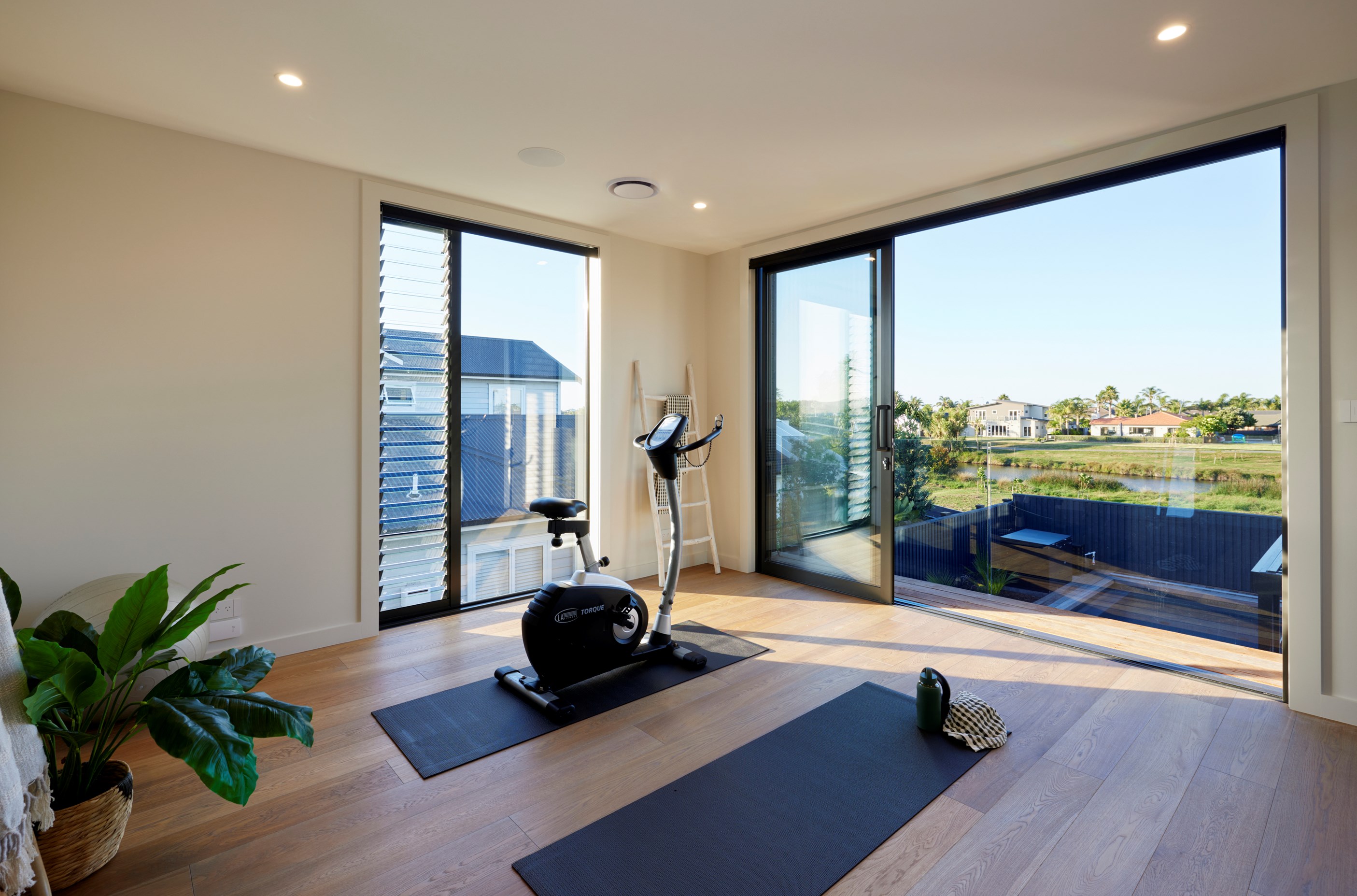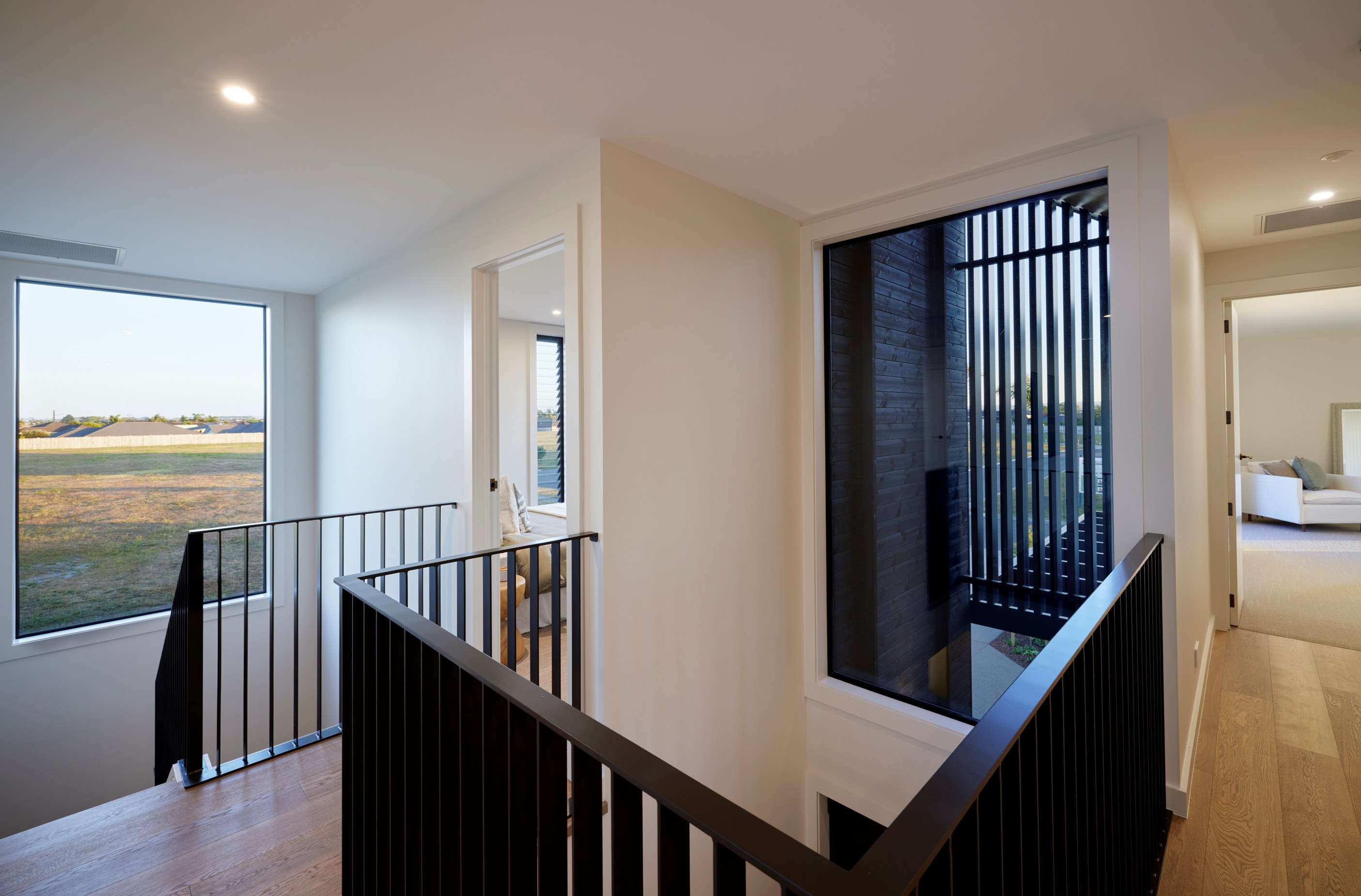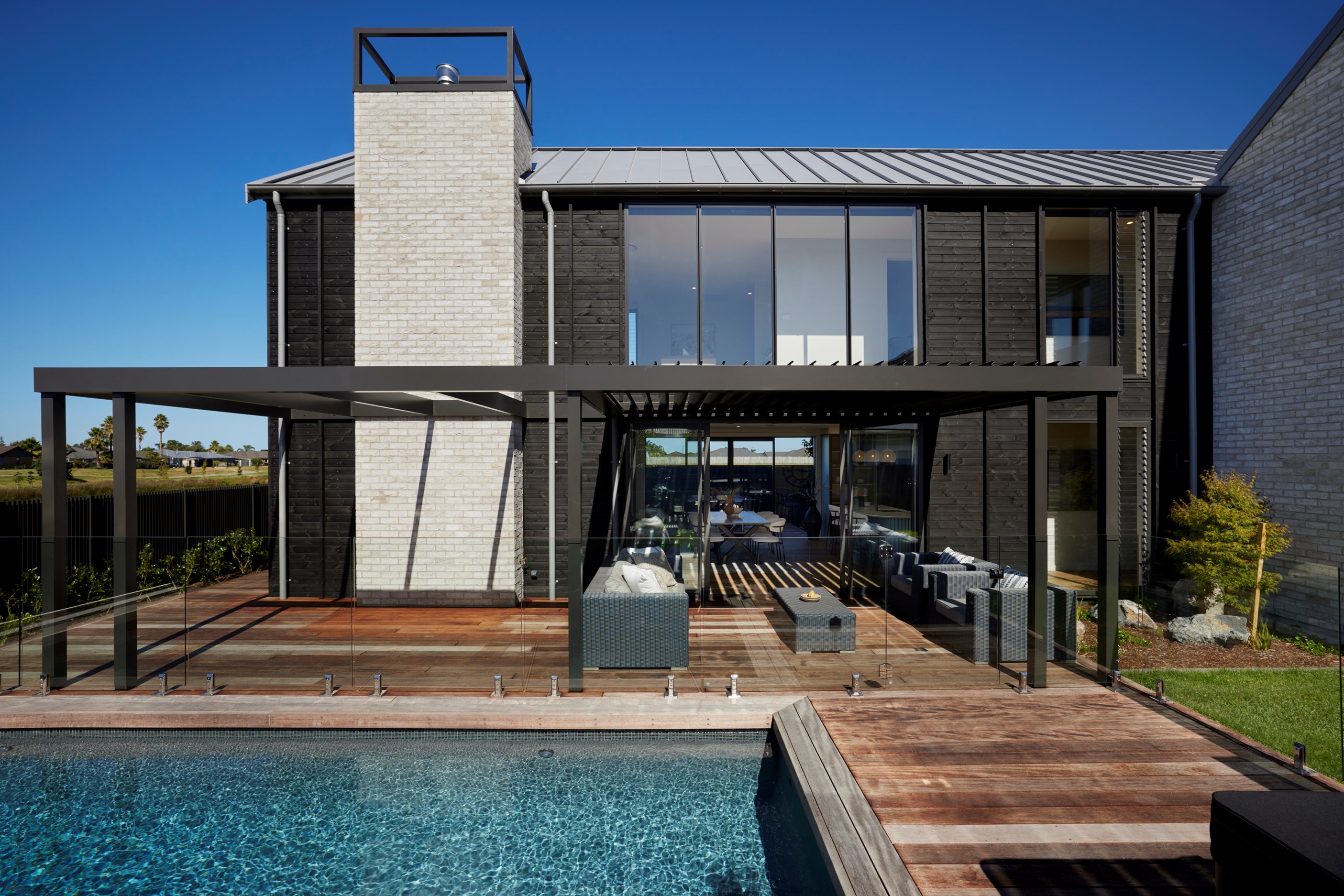 Inside, too, every detail has been carefully planned and articulated with skill. Even shadows formed by screens and open gables are factors in the design. Upper landing balustrades add depth to the vista of the Papamoa Hills, while floor-to-ceiling glazing reinforces the vertical features and welcomes in natural light and views of the pool. For all its beauty, this is also a practical house. Four bedrooms include main and guest rooms with ensuites. An upstairs gym can also be used as a fifth bedroom, an under-staircase space is designed as a wine cellar and a lift helps future-proof the house. Separate lounges and plenty of decks make it ideal for entertaining and family living.