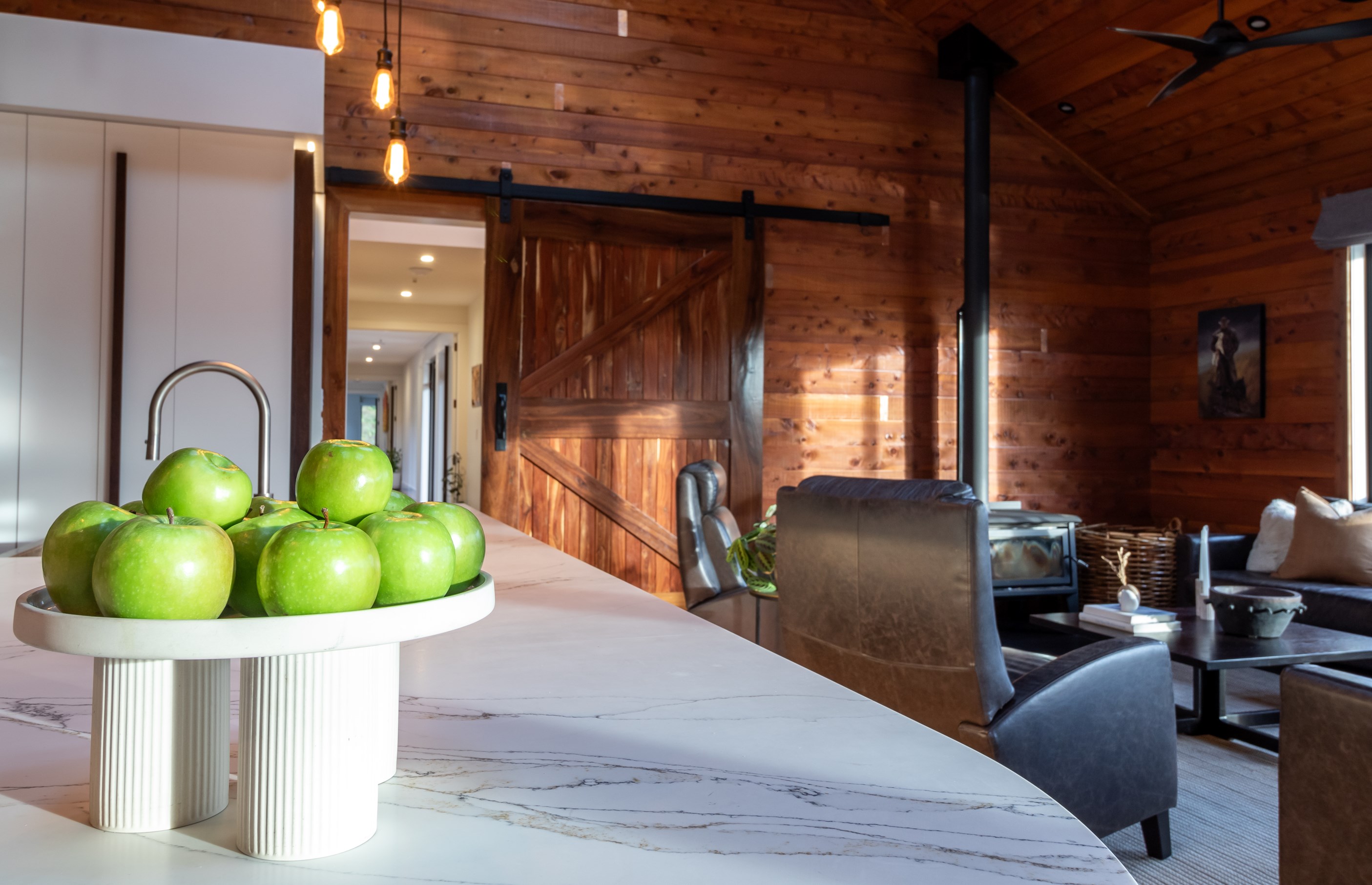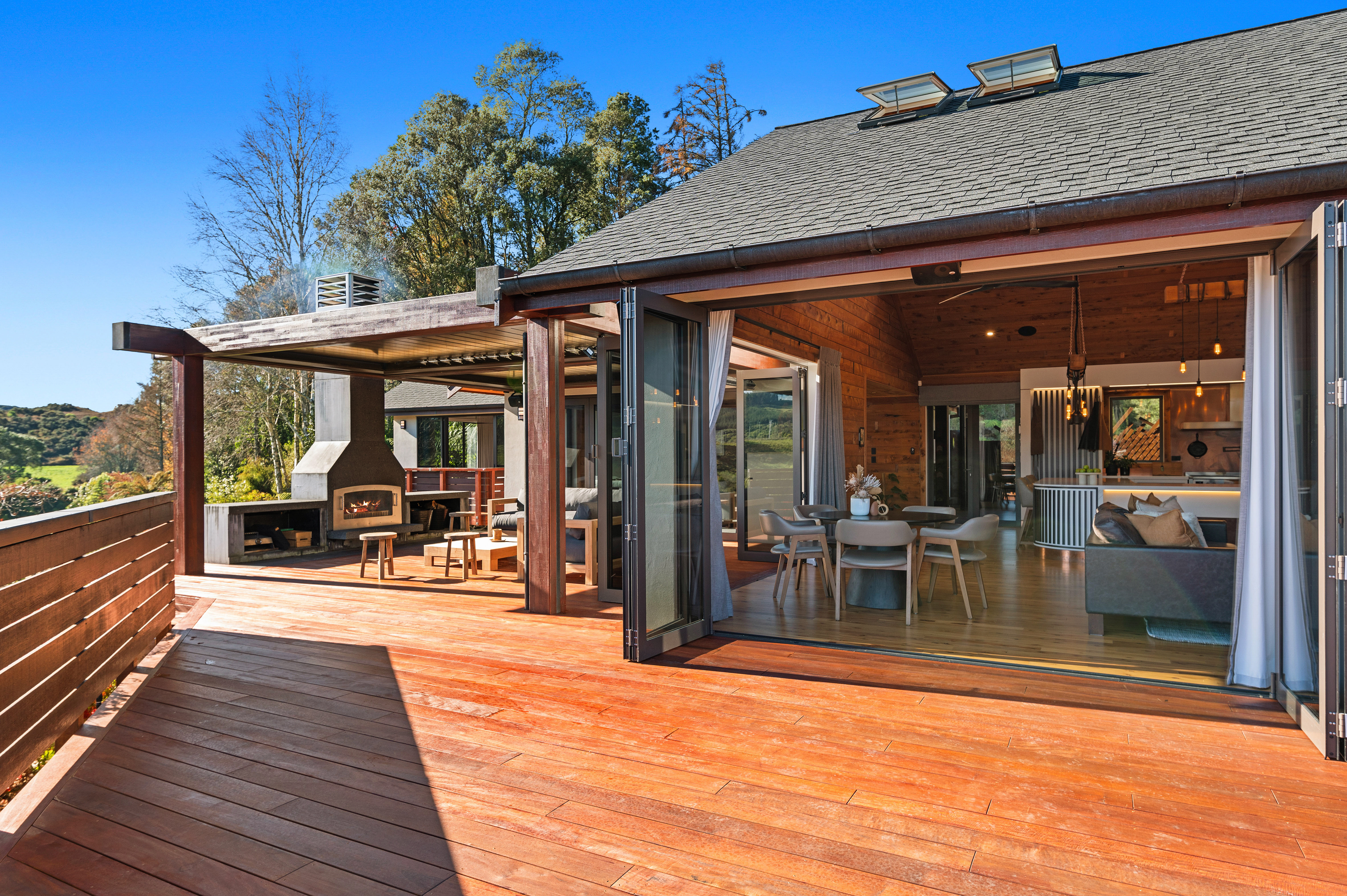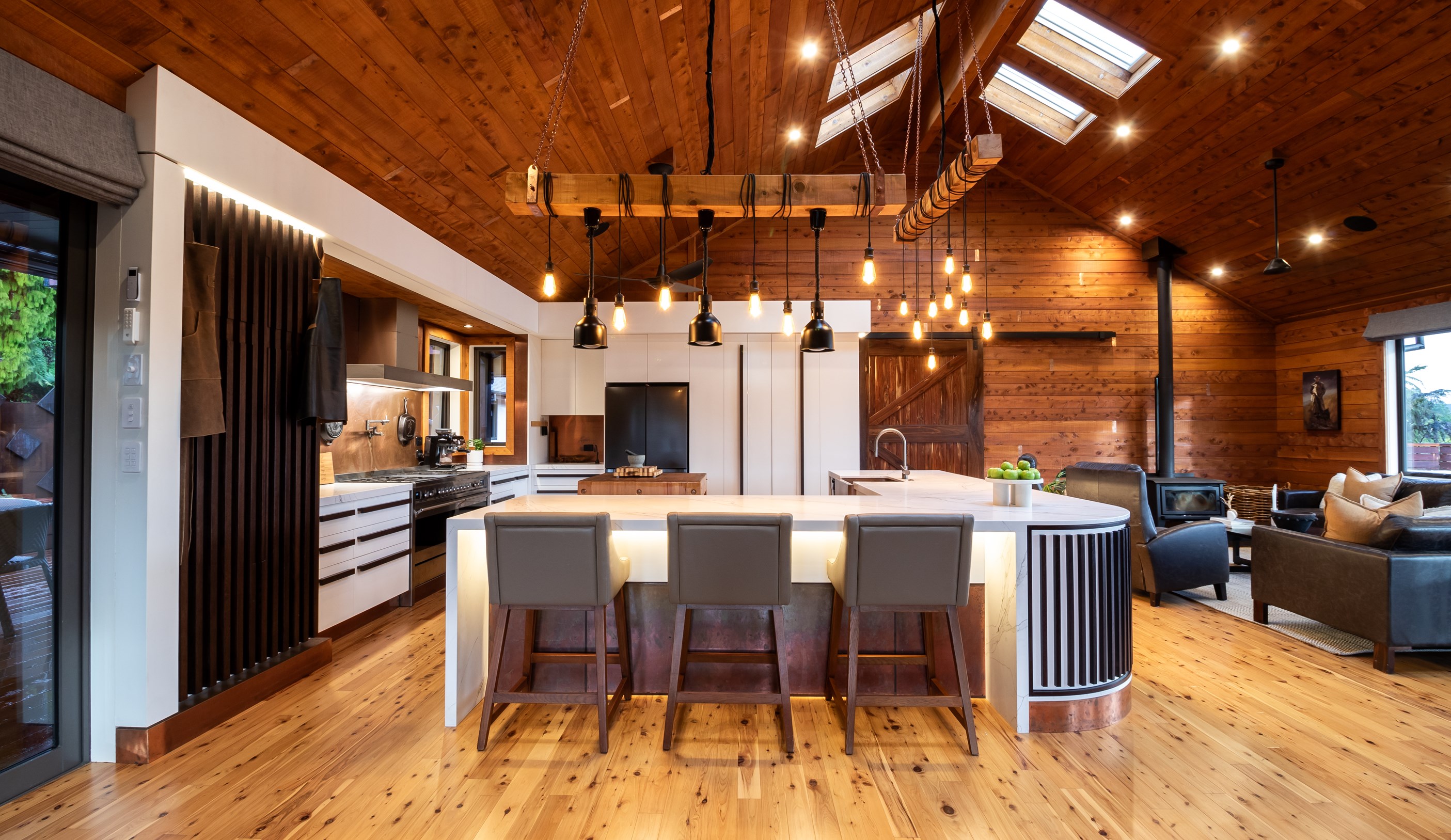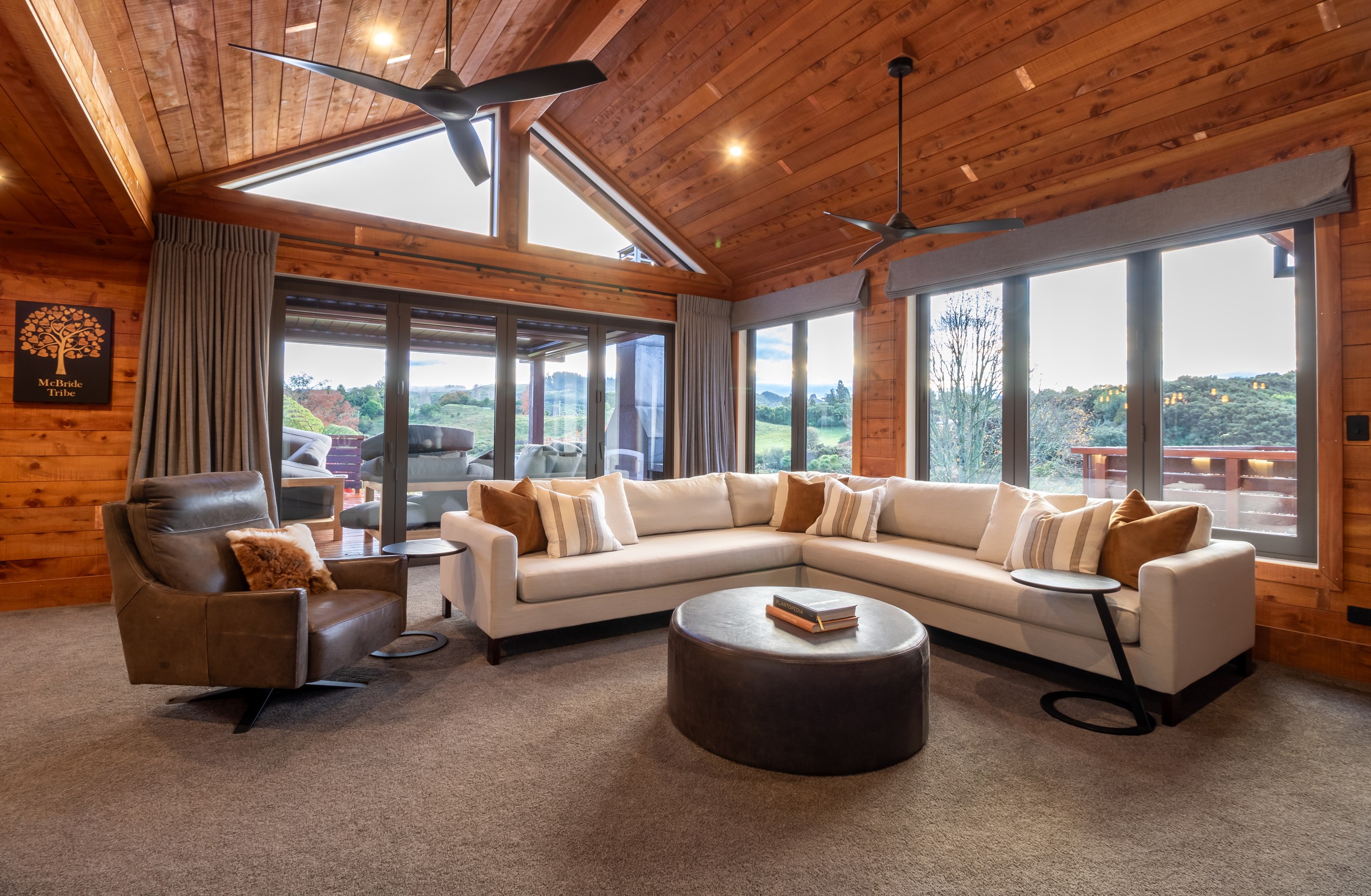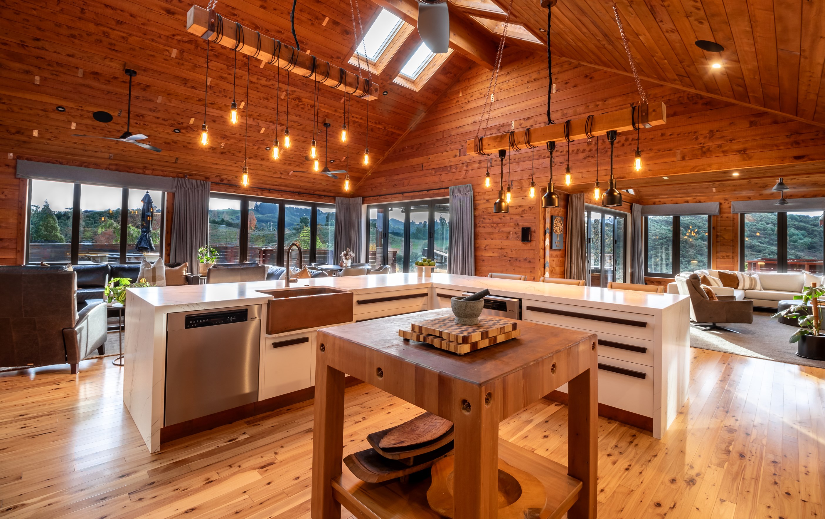 The words “substantial renovation” take on new meaning once you’ve seen this large-scale project. It’s not unusual for builders to be to hired to revamp and enlarge holiday homes for extended families, but this one had to cater to more than 40 people. As a result, this remarkable Lake Rotoiti family treasure now has 10 bedrooms, including two bunkrooms with 24 handmade bunk beds; 10 private bathrooms and 450sqm of decking. The cantilevered round deck is a sight to behold. In the 1184sqm lodge-style luxury bolthole and its environs you’ll find a cinema, wine cellar, barn with climbing walls, garage, playground and tennis court. Louvre-roof alfresco areas ensure that life can be enjoyed outside in any weather – with views of the lake, lawn and bush. The kitchen was also extended, not that you can discern which parts of the lodge are original and which parts are new.
