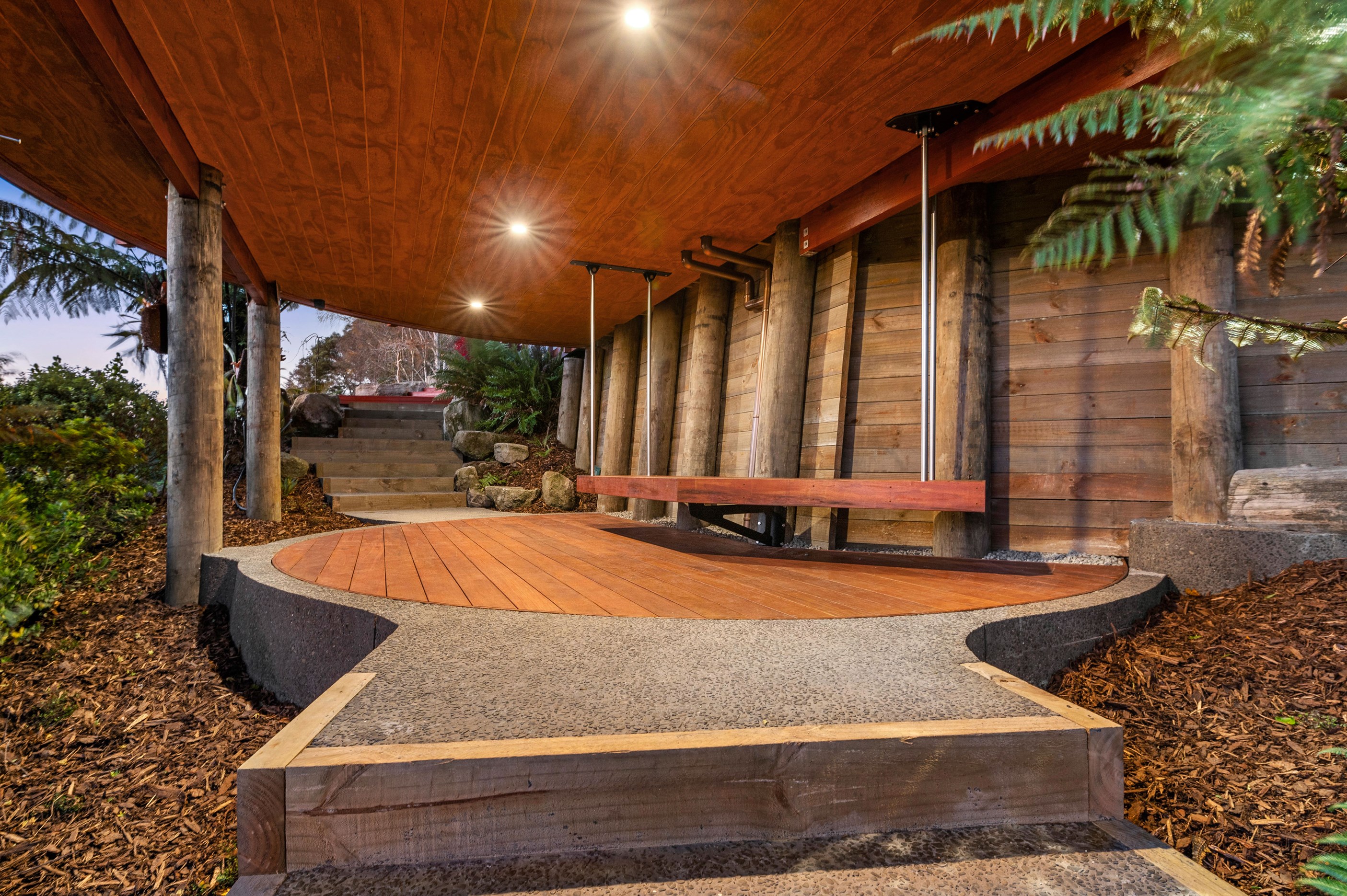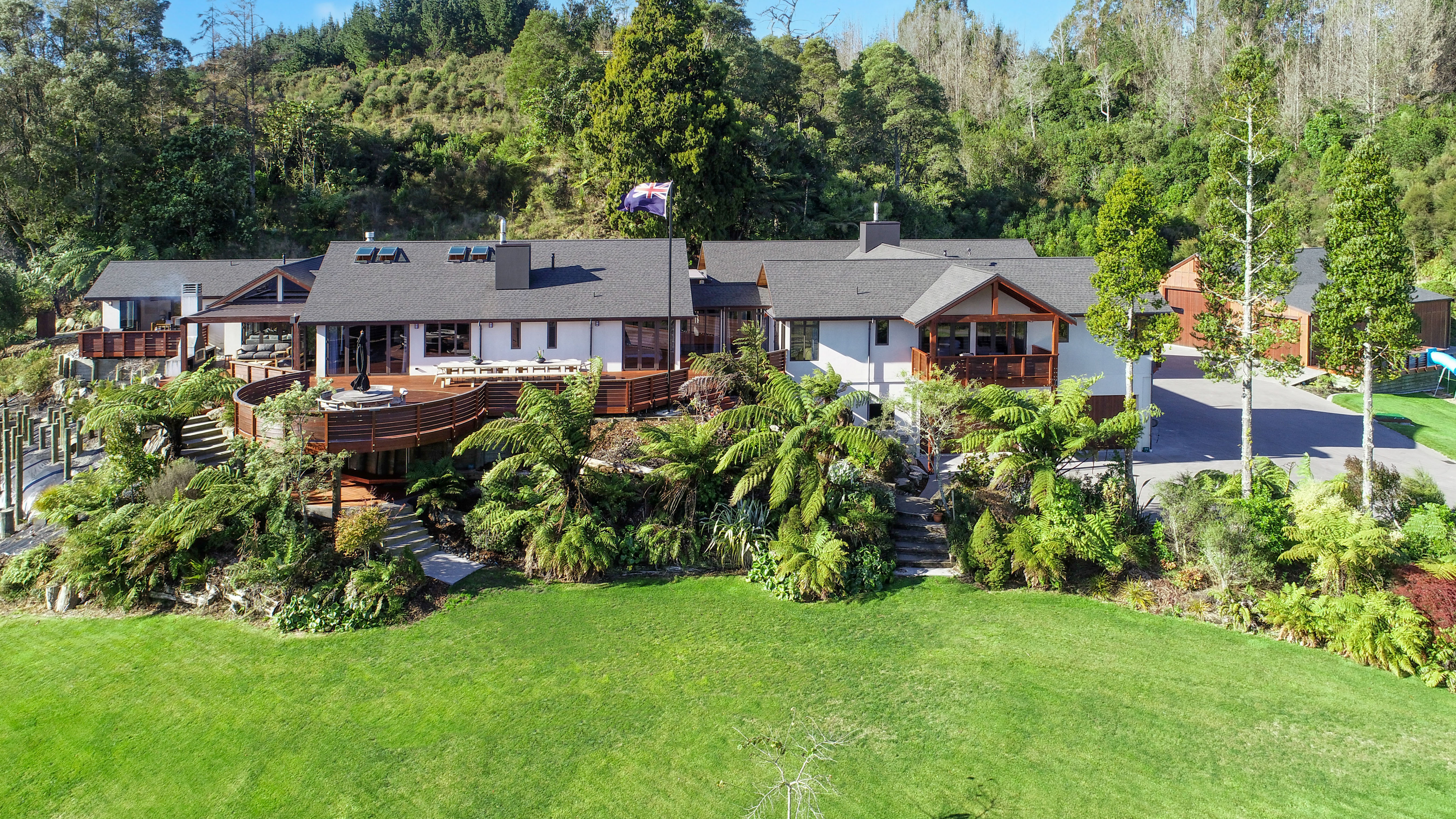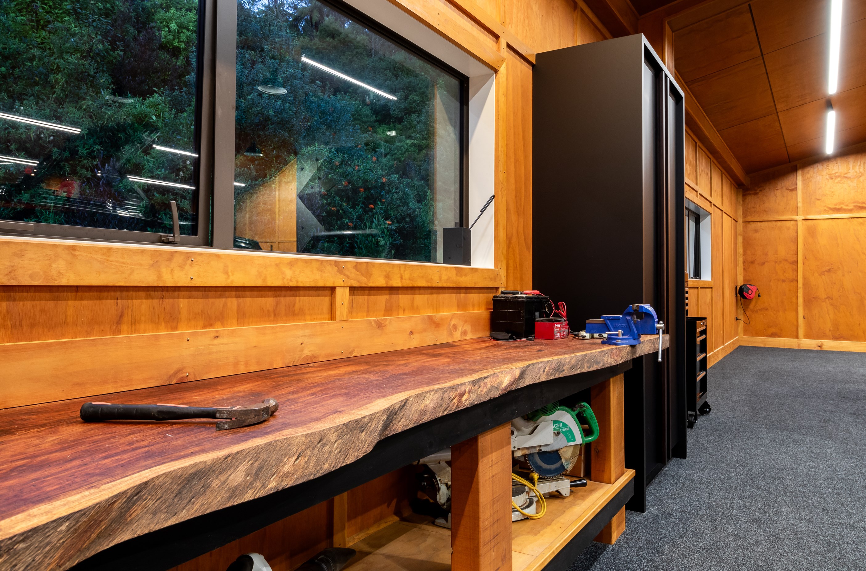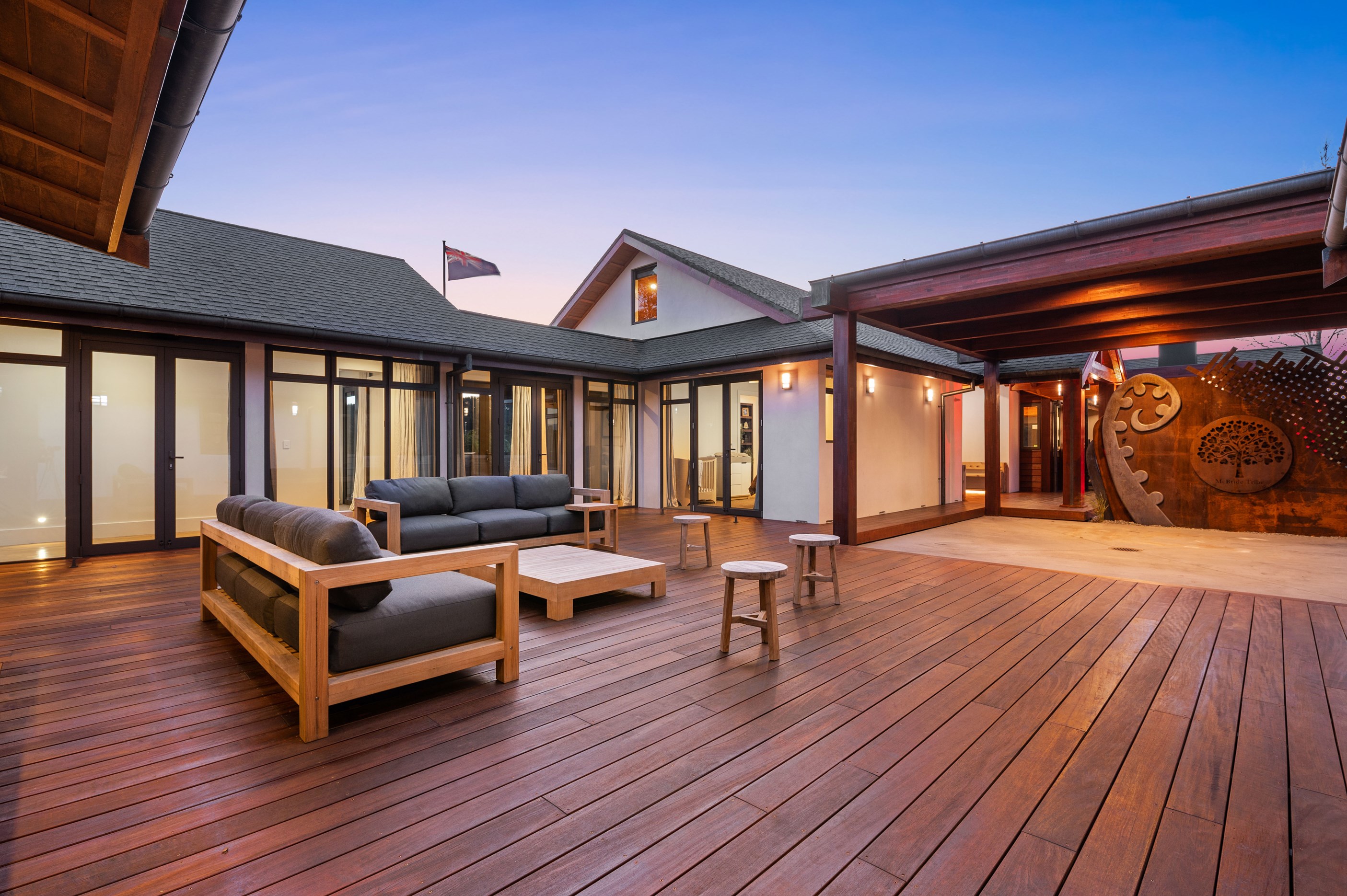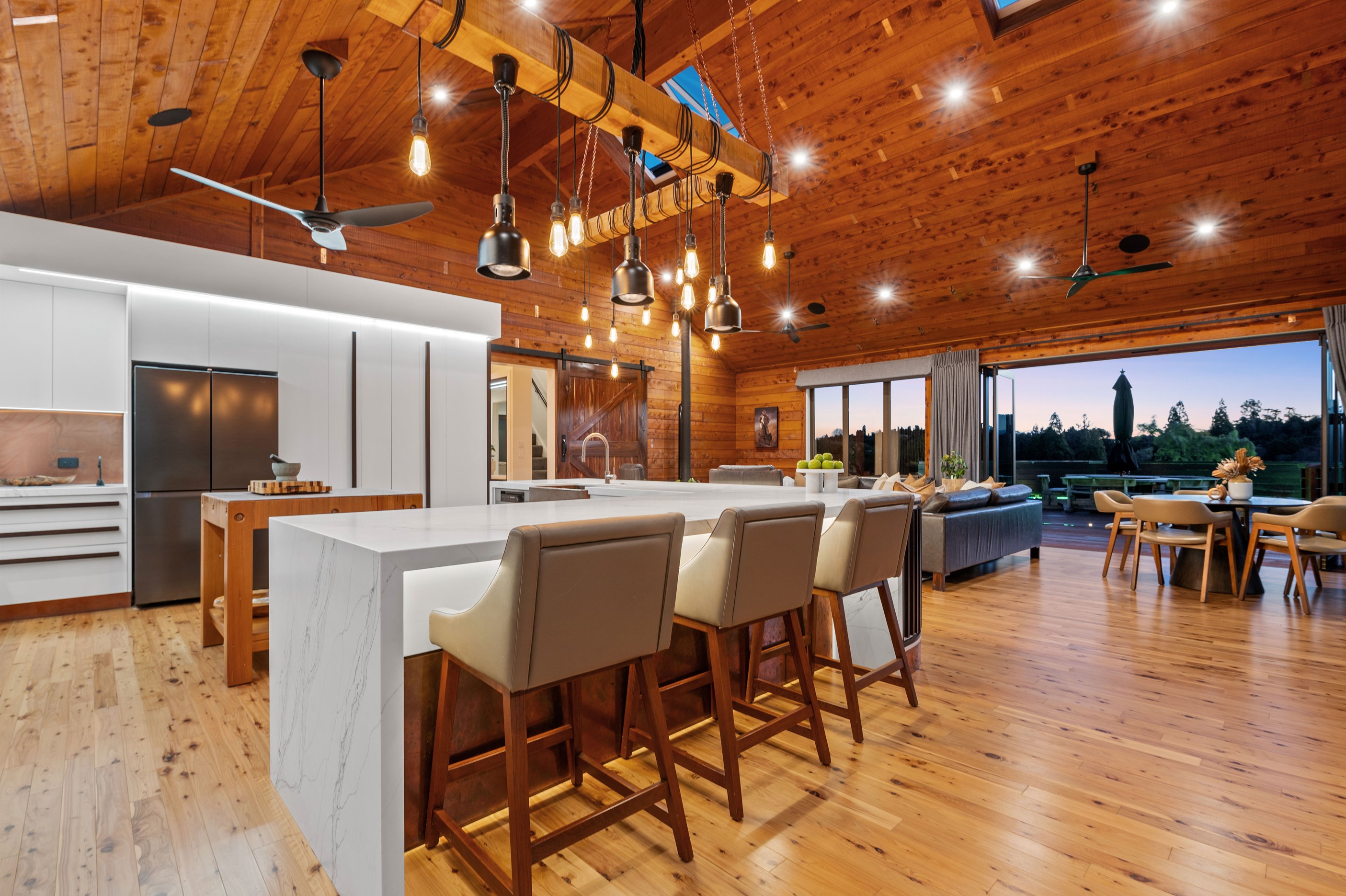 The words “substantial renovation” take on new meaning once you’ve seen this large-scale project. It’s not unusual for builders to be to hired to revamp and enlarge holiday homes for extended families, but this one had to cater to more than 40 people. As a result, this remarkable Lake Rotoiti family treasure now has 10 bedrooms, including two bunkrooms with 24 handmade bunk beds; 10 private bathrooms and 450sqm of decking. The cantilevered round deck is a sight to behold. In the 1184sqm lodge-style luxury bolthole and its environs you’ll find a cinema, wine cellar, barn with climbing walls, garage, playground and tennis court. Louvre-roof alfresco areas ensure that life can be enjoyed outside in any weather – with views of the lake, lawn and bush. The kitchen was also extended, not that you can discern which parts of the lodge are original and which parts are new.