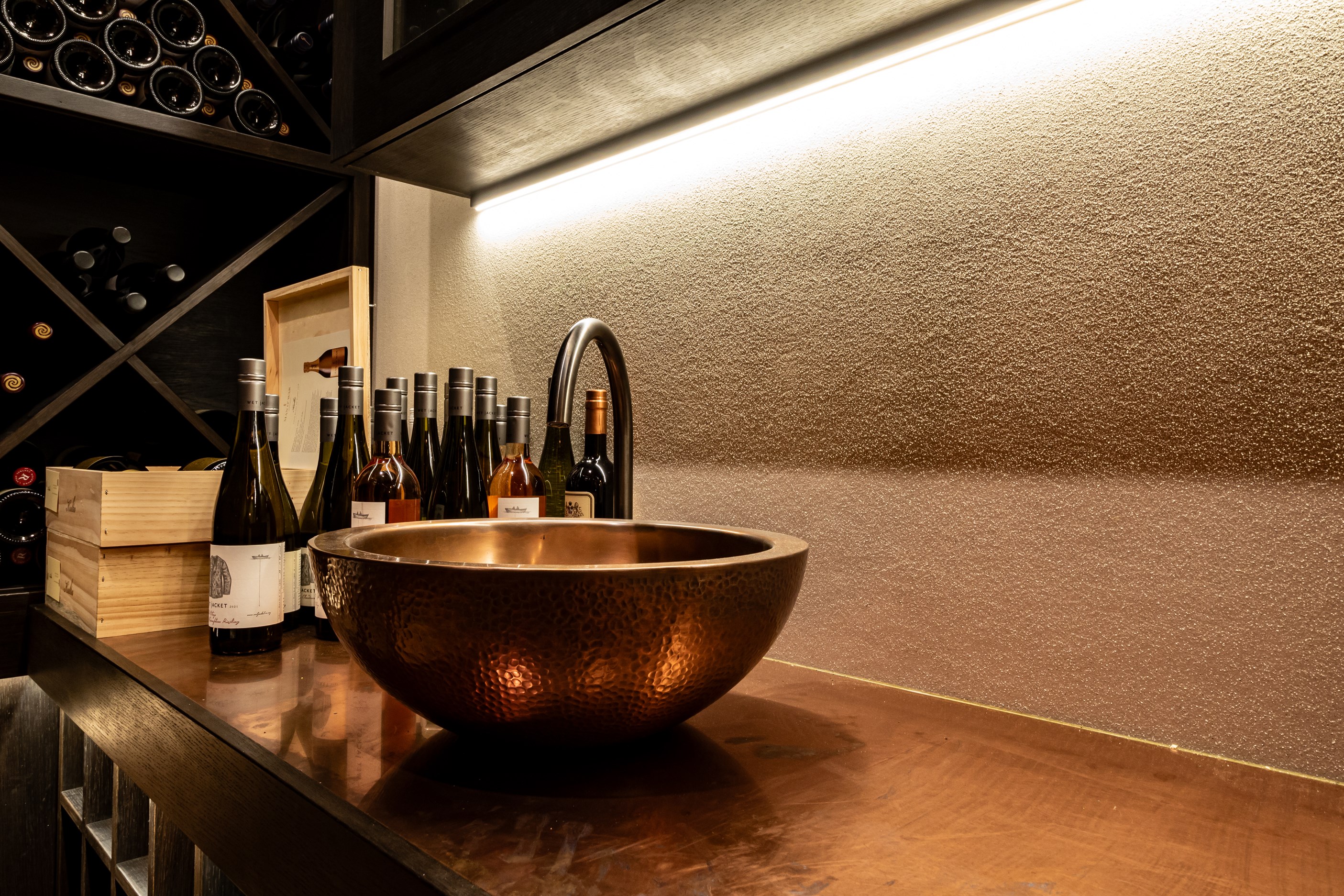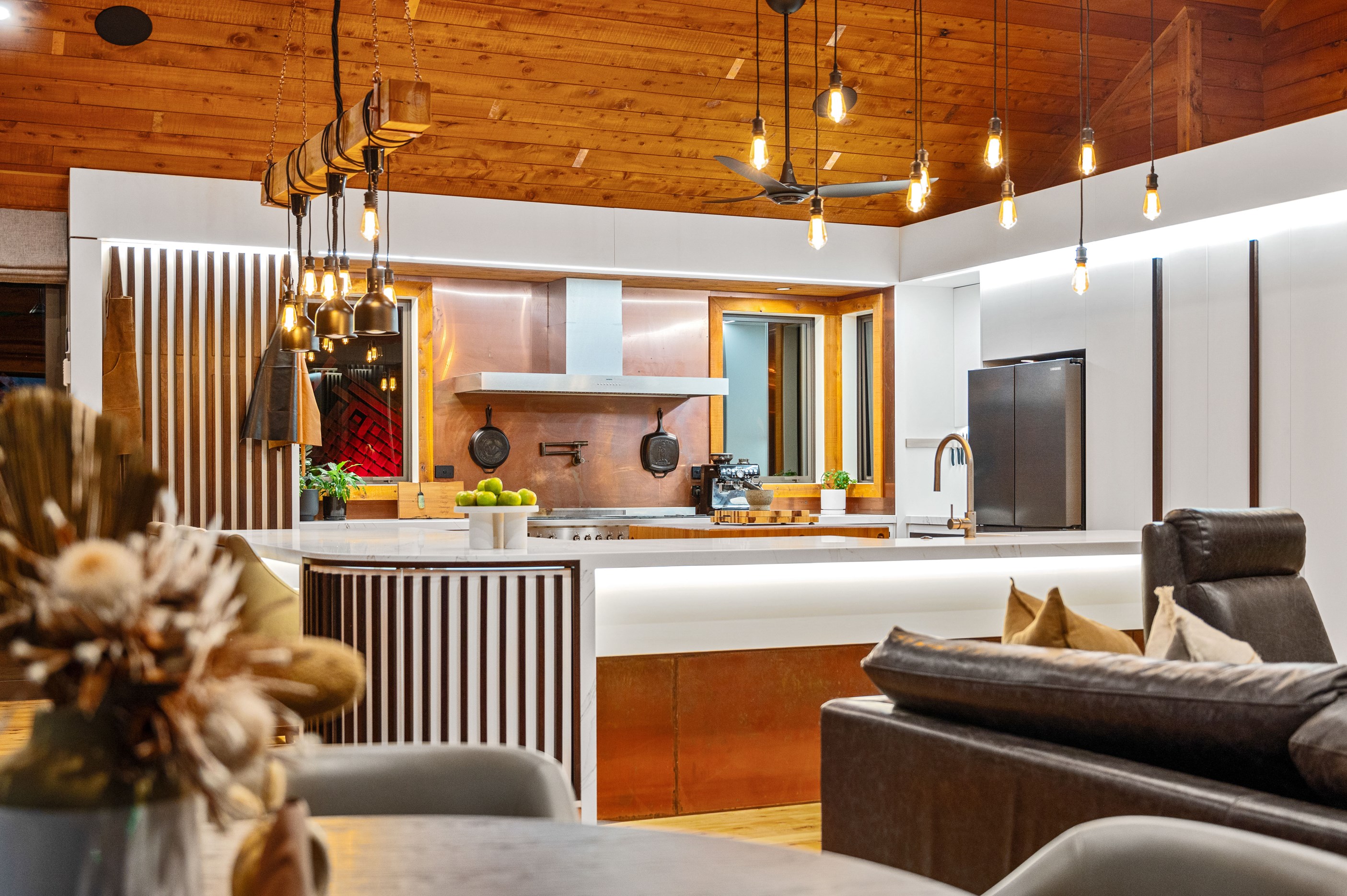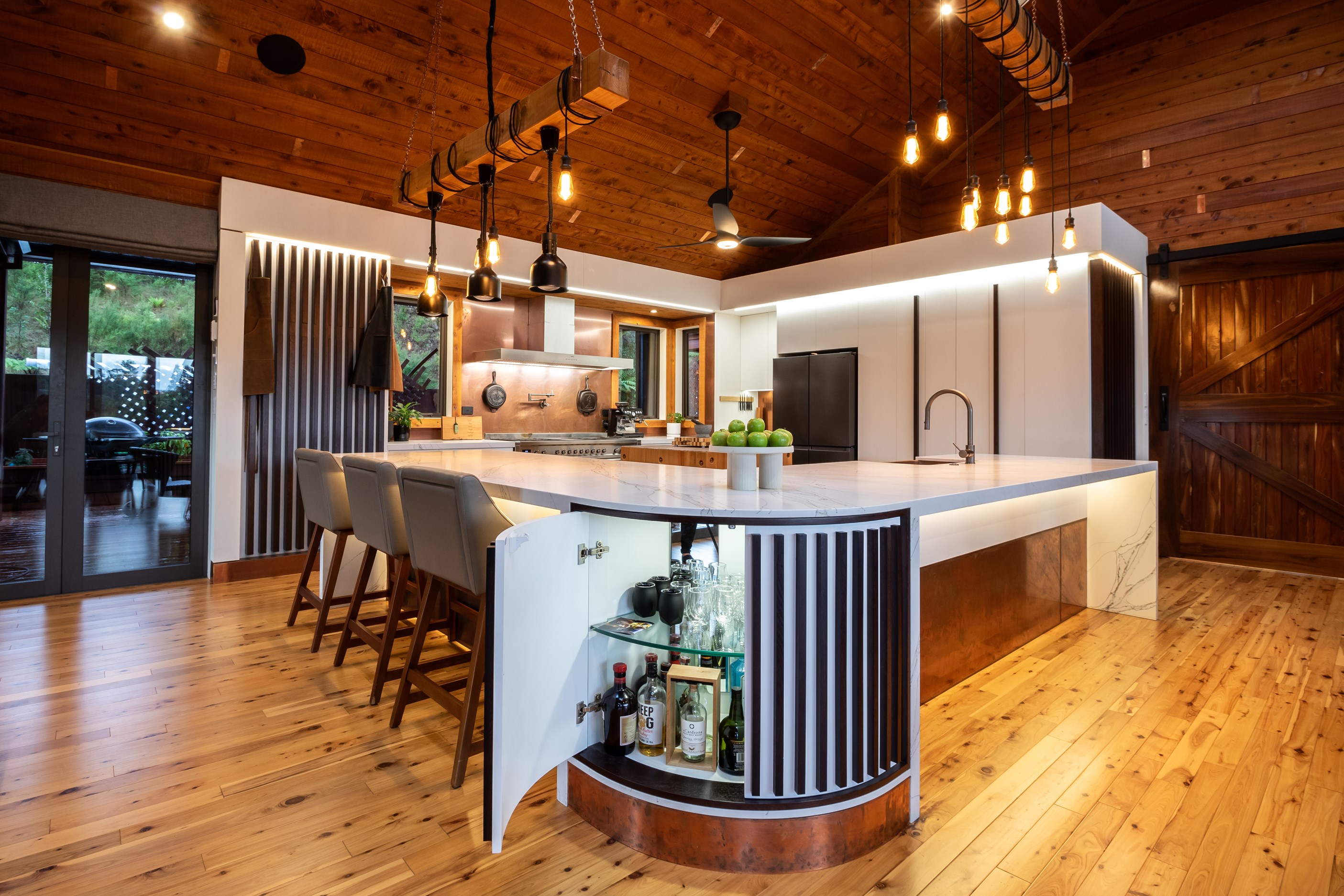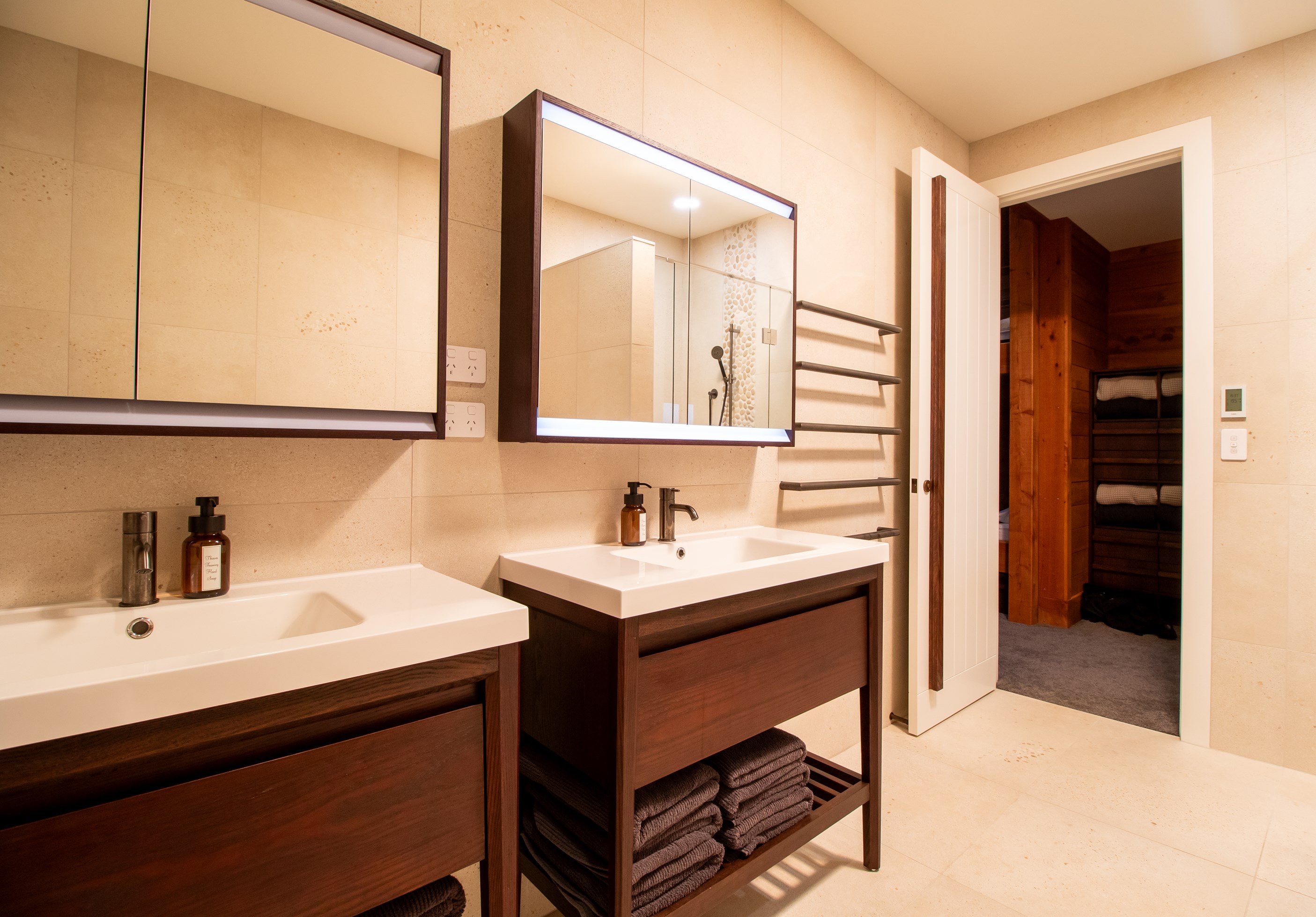 The words “substantial renovation” take on new meaning once you’ve seen this large-scale project. It’s not unusual for builders to be to hired to revamp and enlarge holiday homes for extended families, but this one had to cater to more than 40 people. As a result, this remarkable Lake Rotoiti family treasure now has 10 bedrooms, including two bunkrooms with 24 handmade bunk beds; 10 private bathrooms and 450sqm of decking. The cantilevered round deck is a sight to behold. In the 1184sqm lodge-style luxury bolthole and its environs you’ll find a cinema, wine cellar, barn with climbing walls, garage, playground and tennis court. Louvre-roof alfresco areas ensure that life can be enjoyed outside in any weather – with views of the lake, lawn and bush. The kitchen was also extended, not that you can discern which parts of the lodge are original and which parts are new.