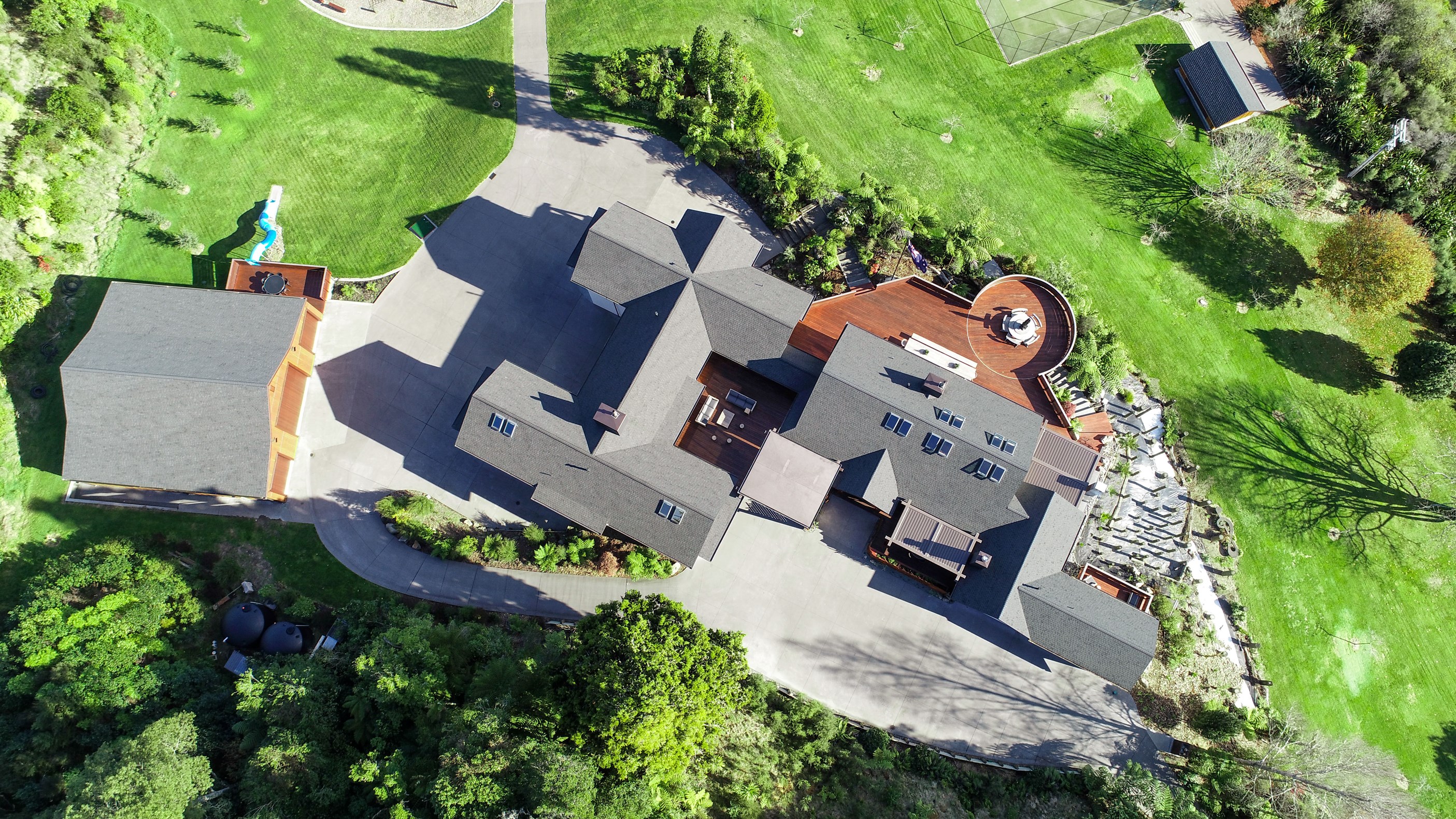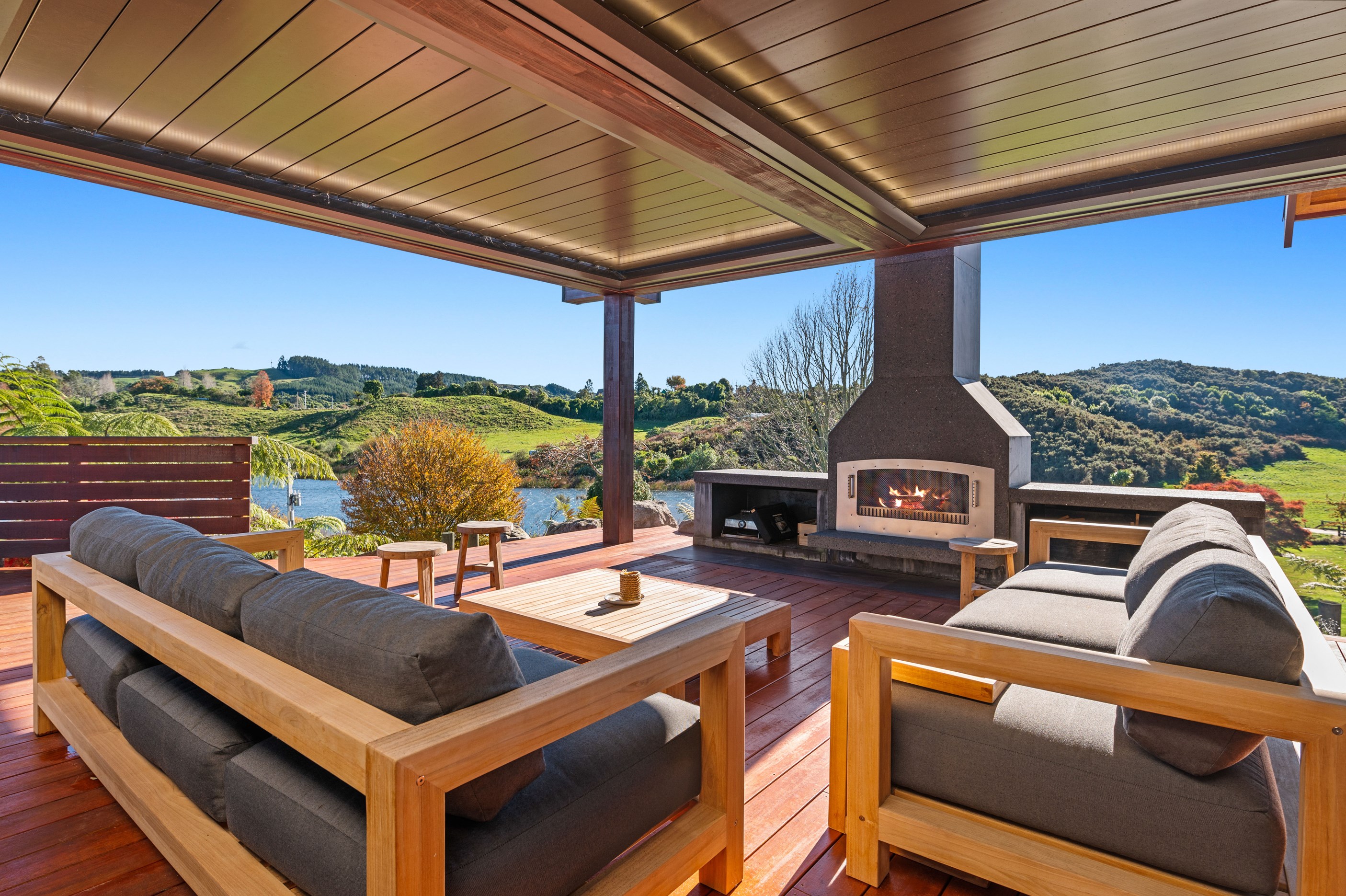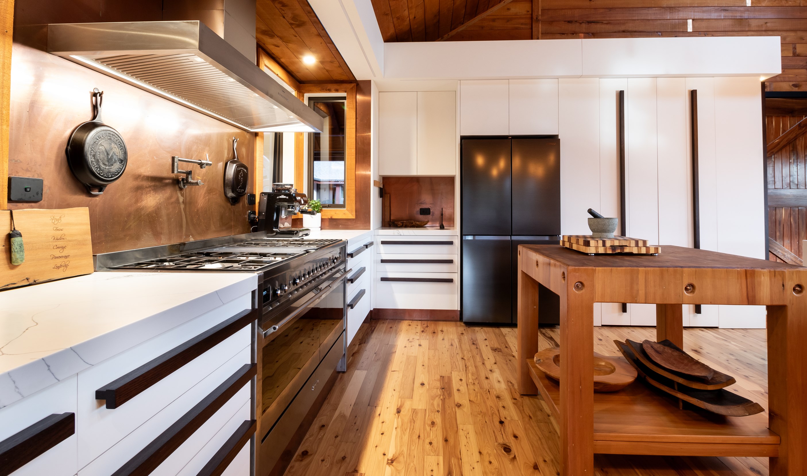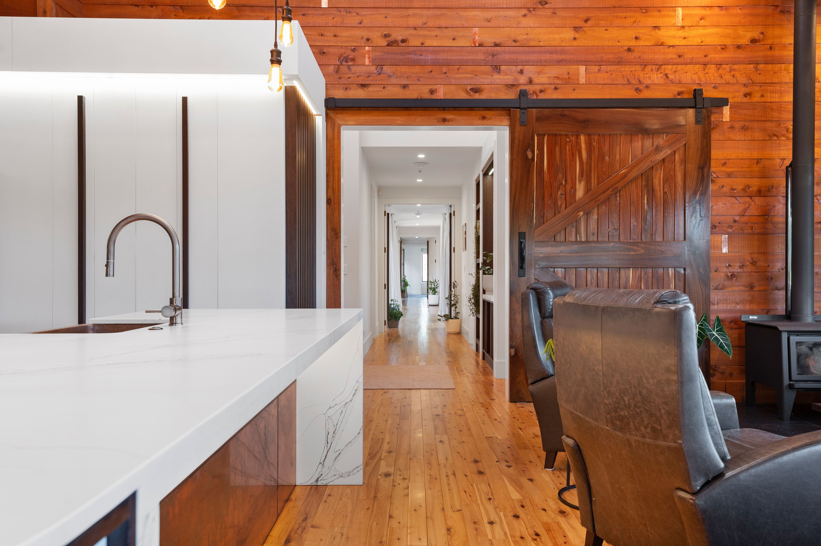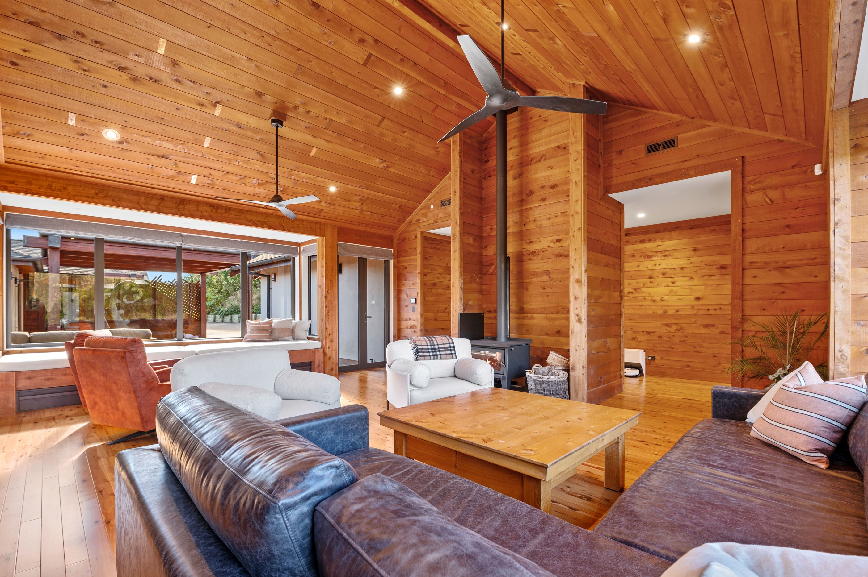 The words “substantial renovation” take on new meaning once you’ve seen this large-scale project. It’s not unusual for builders to be to hired to revamp and enlarge holiday homes for extended families, but this one had to cater to more than 40 people. As a result, this remarkable Lake Rotoiti family treasure now has 10 bedrooms, including two bunkrooms with 24 handmade bunk beds; 10 private bathrooms and 450sqm of decking. The cantilevered round deck is a sight to behold. In the 1184sqm lodge-style luxury bolthole and its environs you’ll find a cinema, wine cellar, barn with climbing walls, garage, playground and tennis court. Louvre-roof alfresco areas ensure that life can be enjoyed outside in any weather – with views of the lake, lawn and bush. The kitchen was also extended, not that you can discern which parts of the lodge are original and which parts are new.