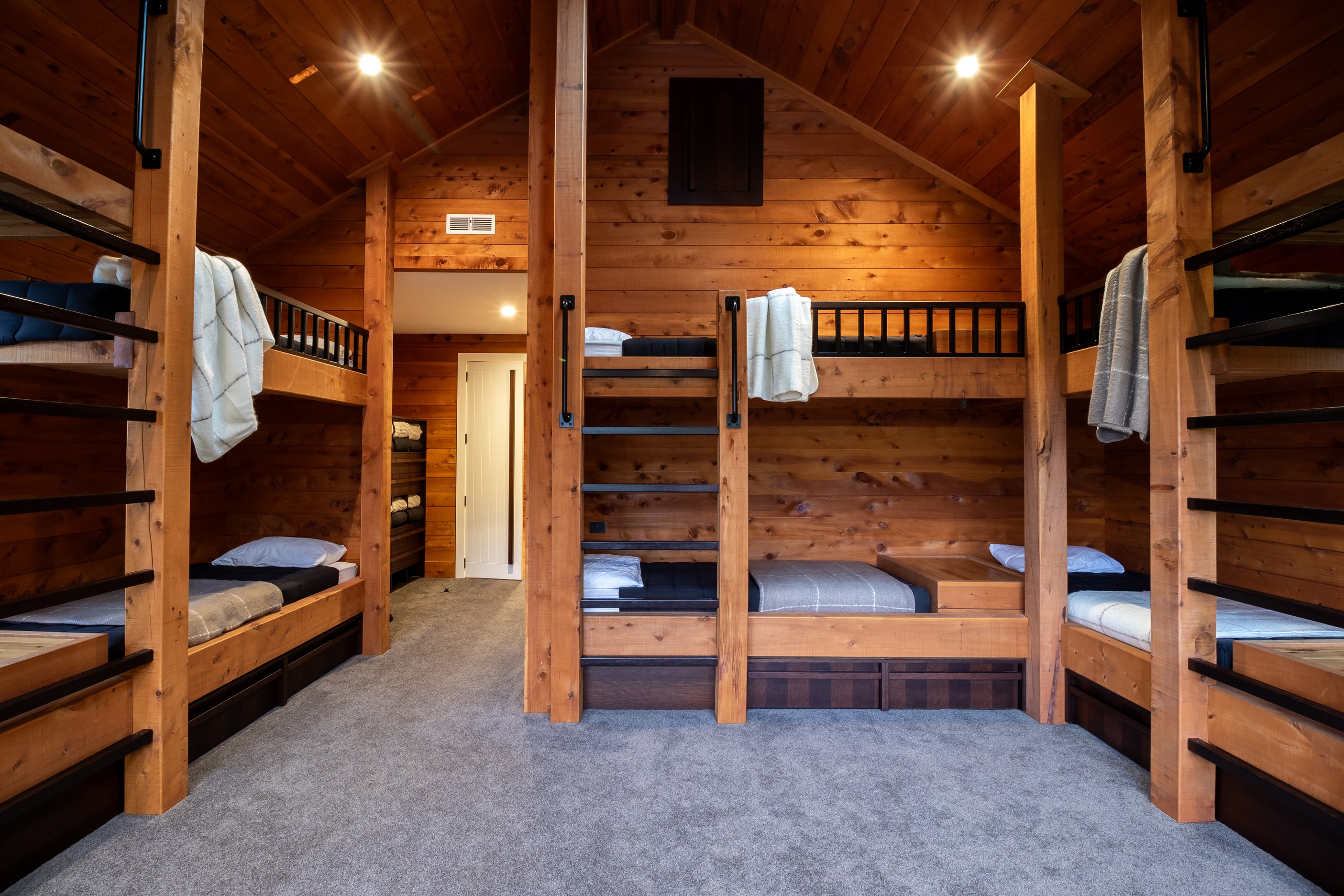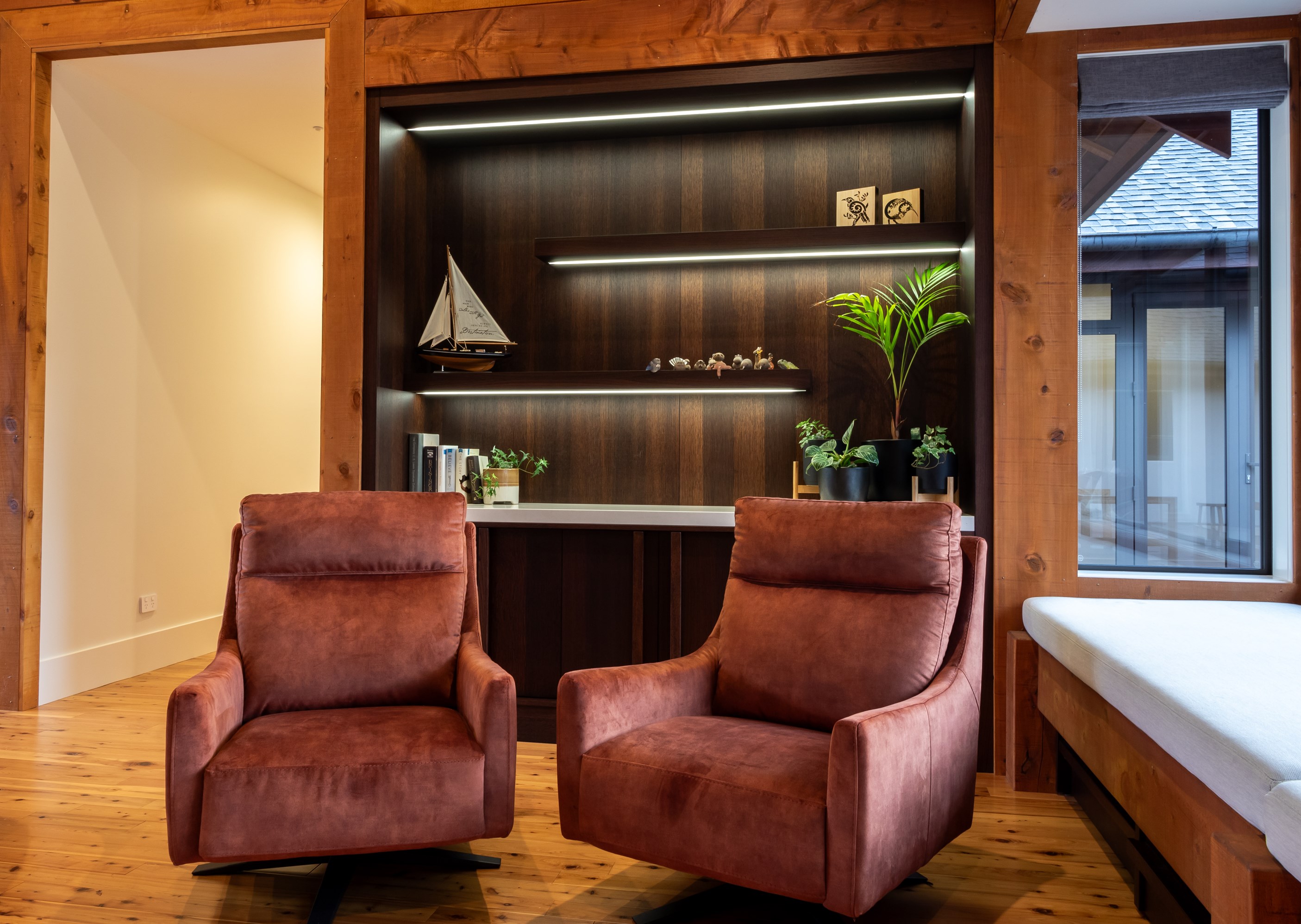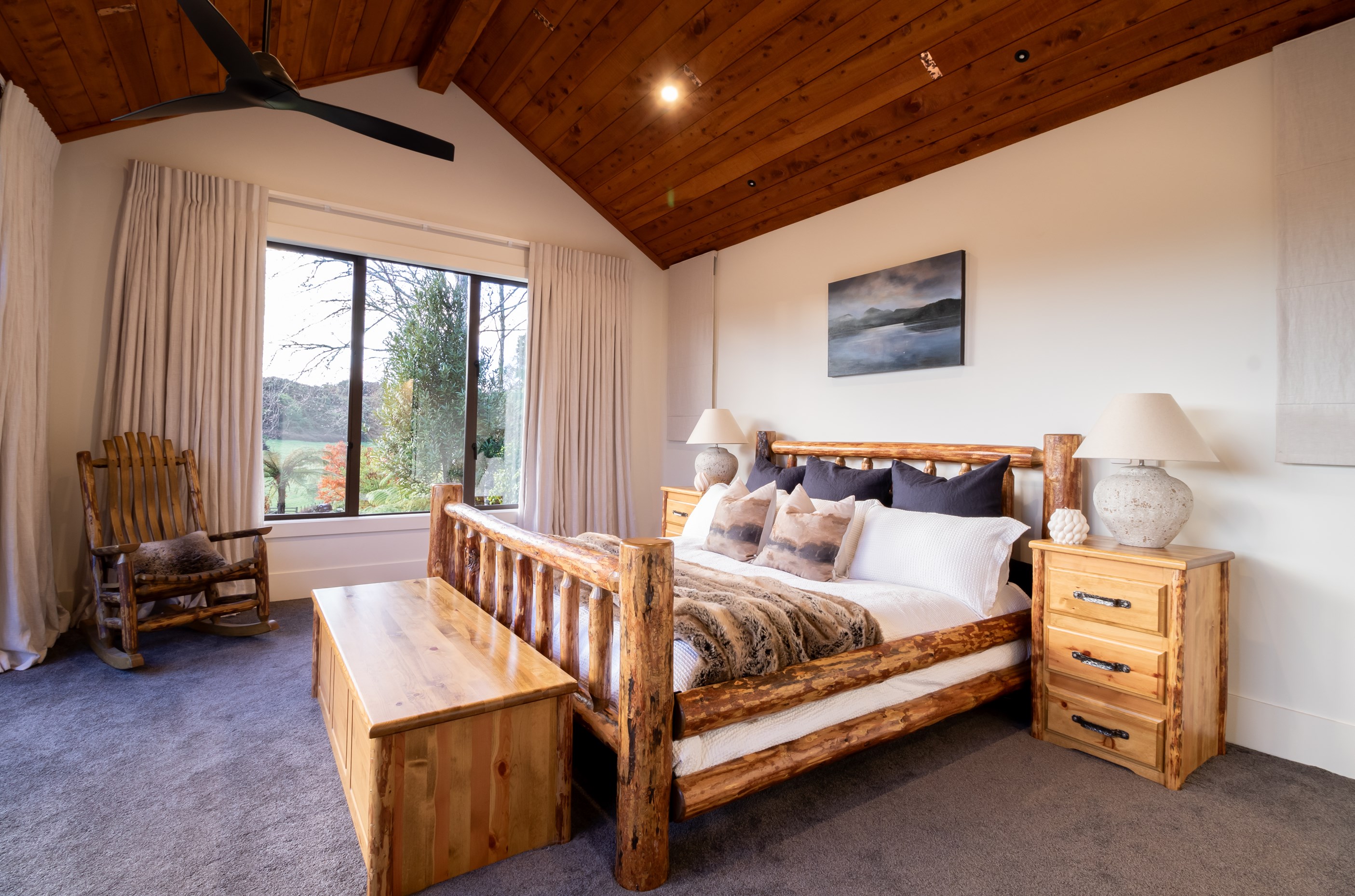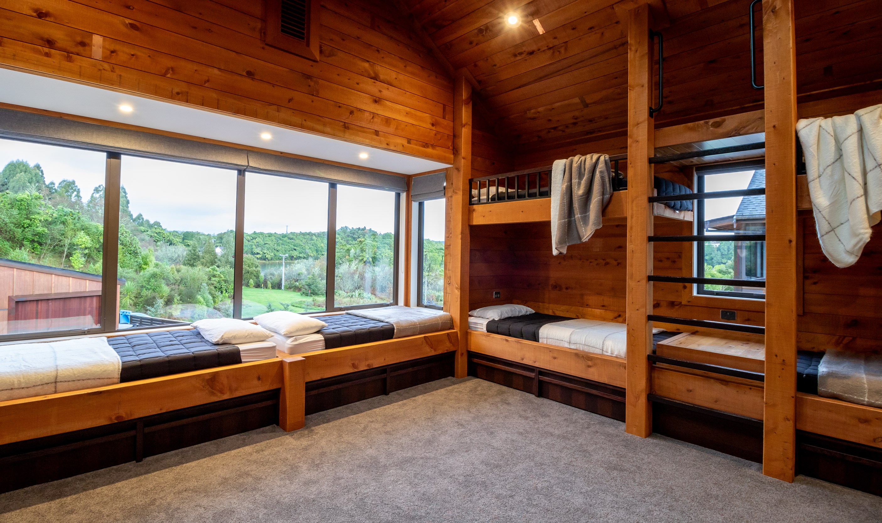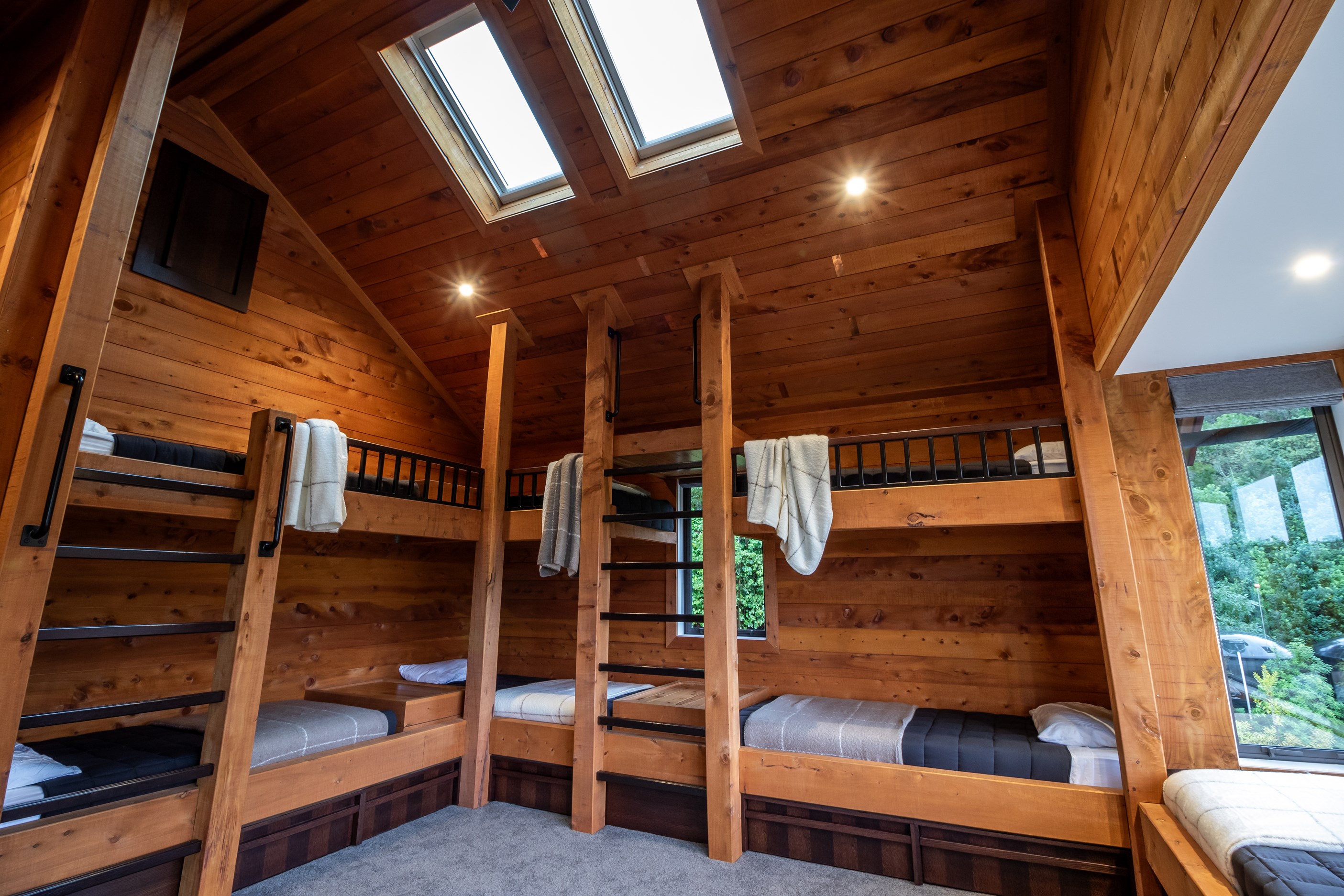 Given the scale, this project was completed in two stages over three years. It’s now a meticulous showcase of natural timber. As well as the bunks, you’ll see columns, beams, features and finishes in rustic macrocarpa and dark oak. Cedar and copper features add warmth and earthiness. Fireplaces provide a different kind of warmth. When you approach the 3.8ha property down its private driveway, you’re struck by it scale, but also by how unpretentious it is and how well the lakeside haven fits into its stunning landscape.