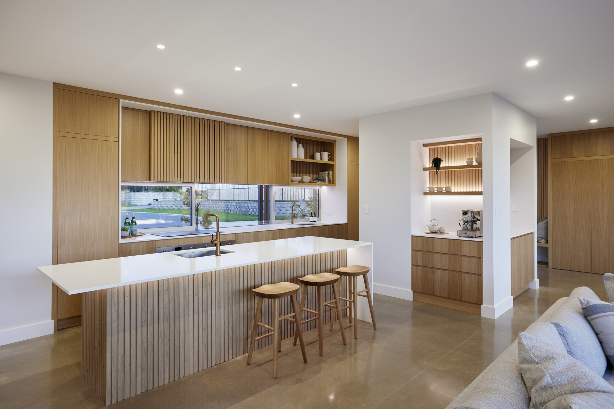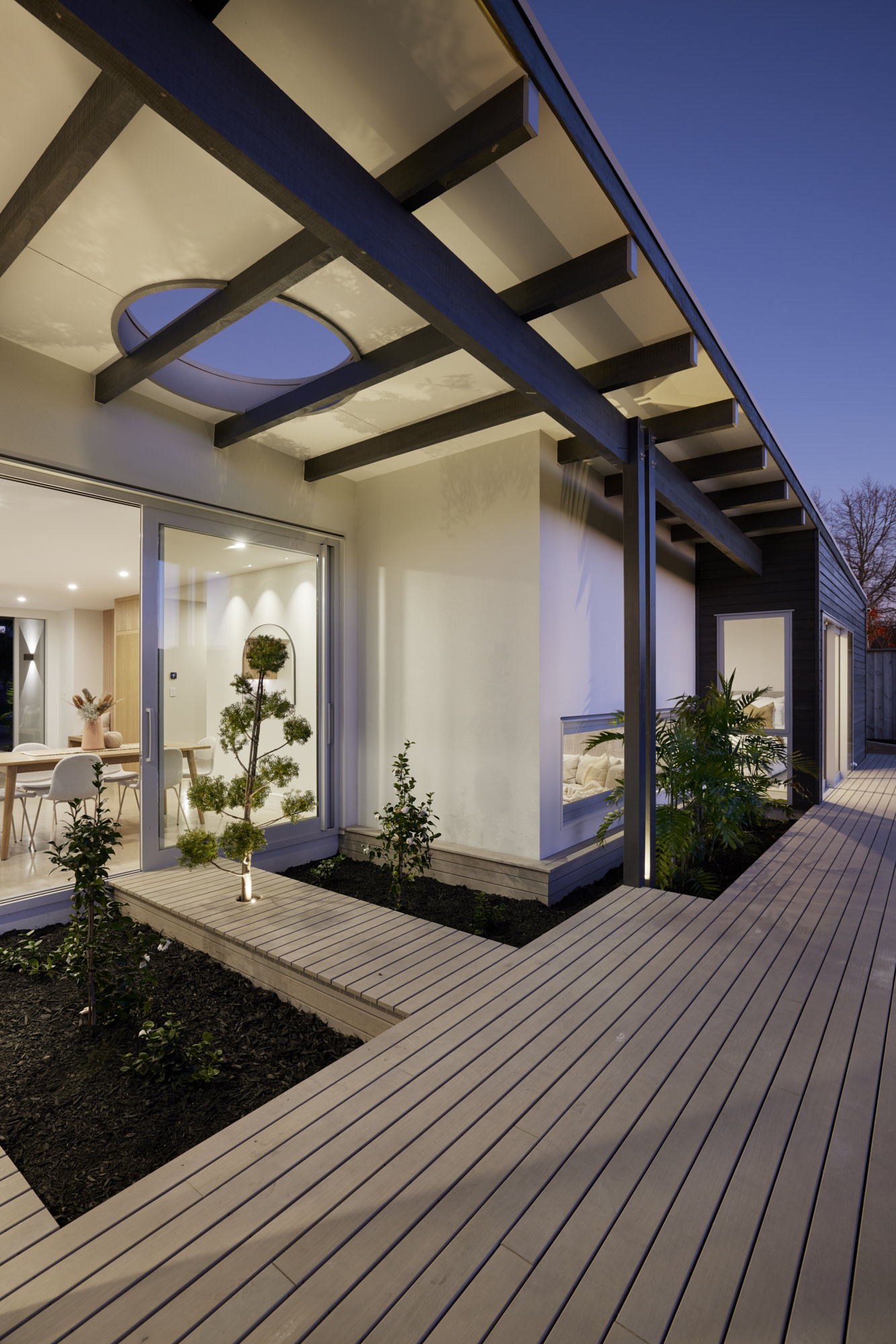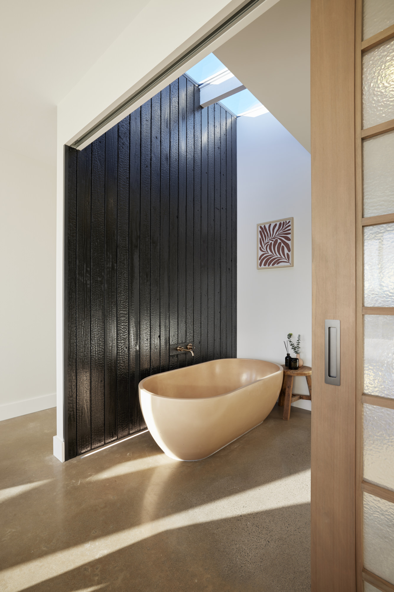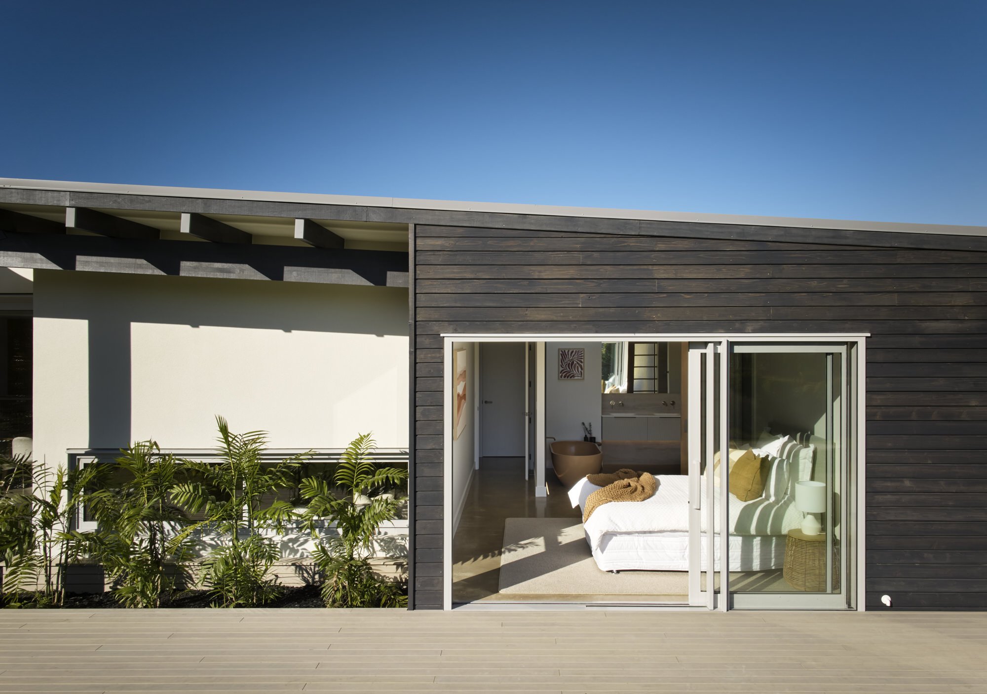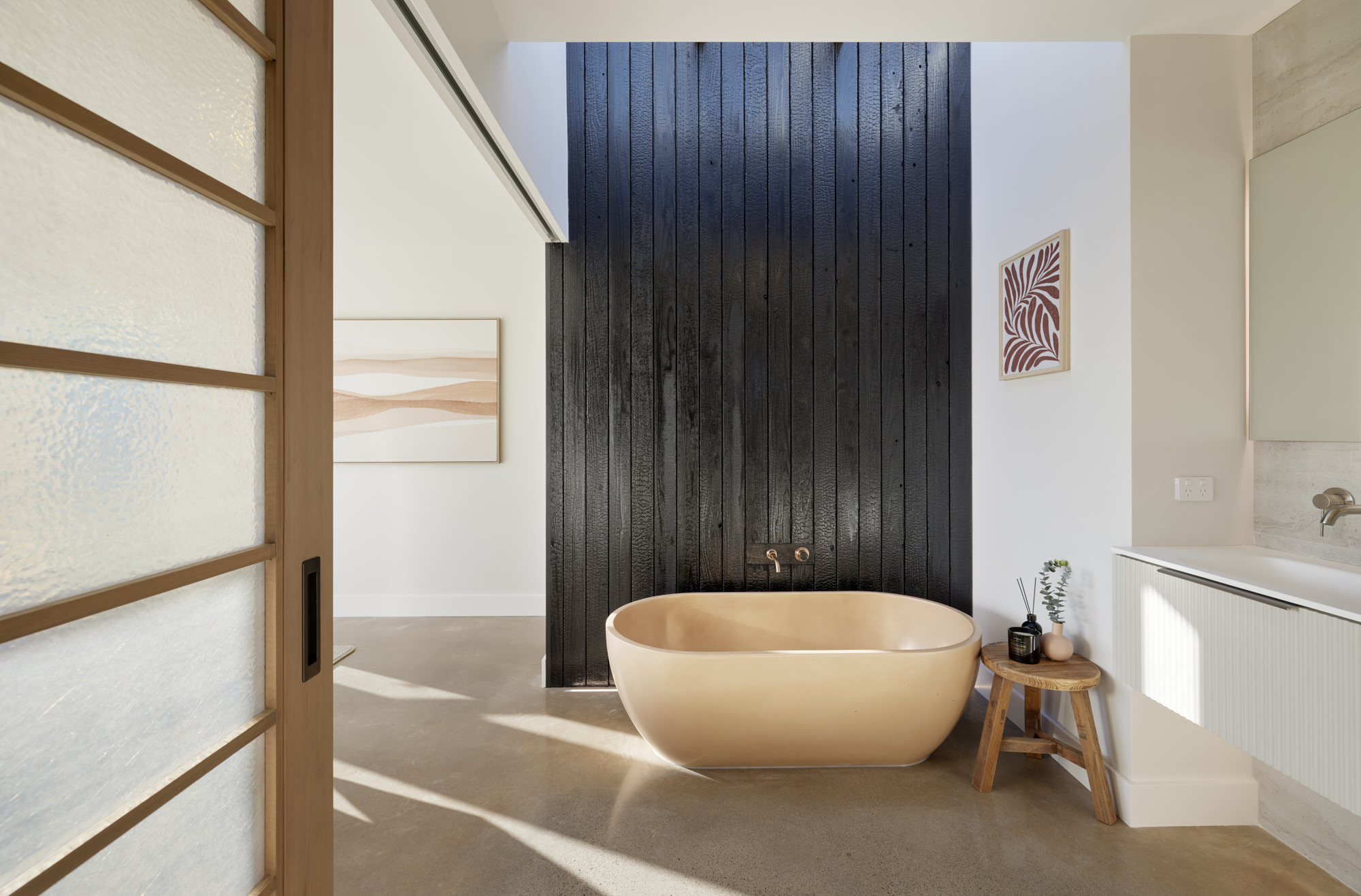 The picture of serenity continues inside with skylights and floor-to-ceiling windows flooding the living spaces with natural light. Finely detailed oak joinery extends beyond the kitchen to the cupboards and seat in the entrance and creates a coffee station, a bar and study nook. Polished concrete floors flow through corner-opening doors to covered decking and a patio with built-in seating around a fire pit. Two bedrooms, a bathroom and powder room enjoy privacy through a shoji slider off to one side of the living with a TV room, main suite and laundry off the other. The final touch of modern Japanese luxury is the spa-inspired ensuite with a yakisugi wall and a shoji screen that opens the bathtub to the bedroom and the garden beyond.