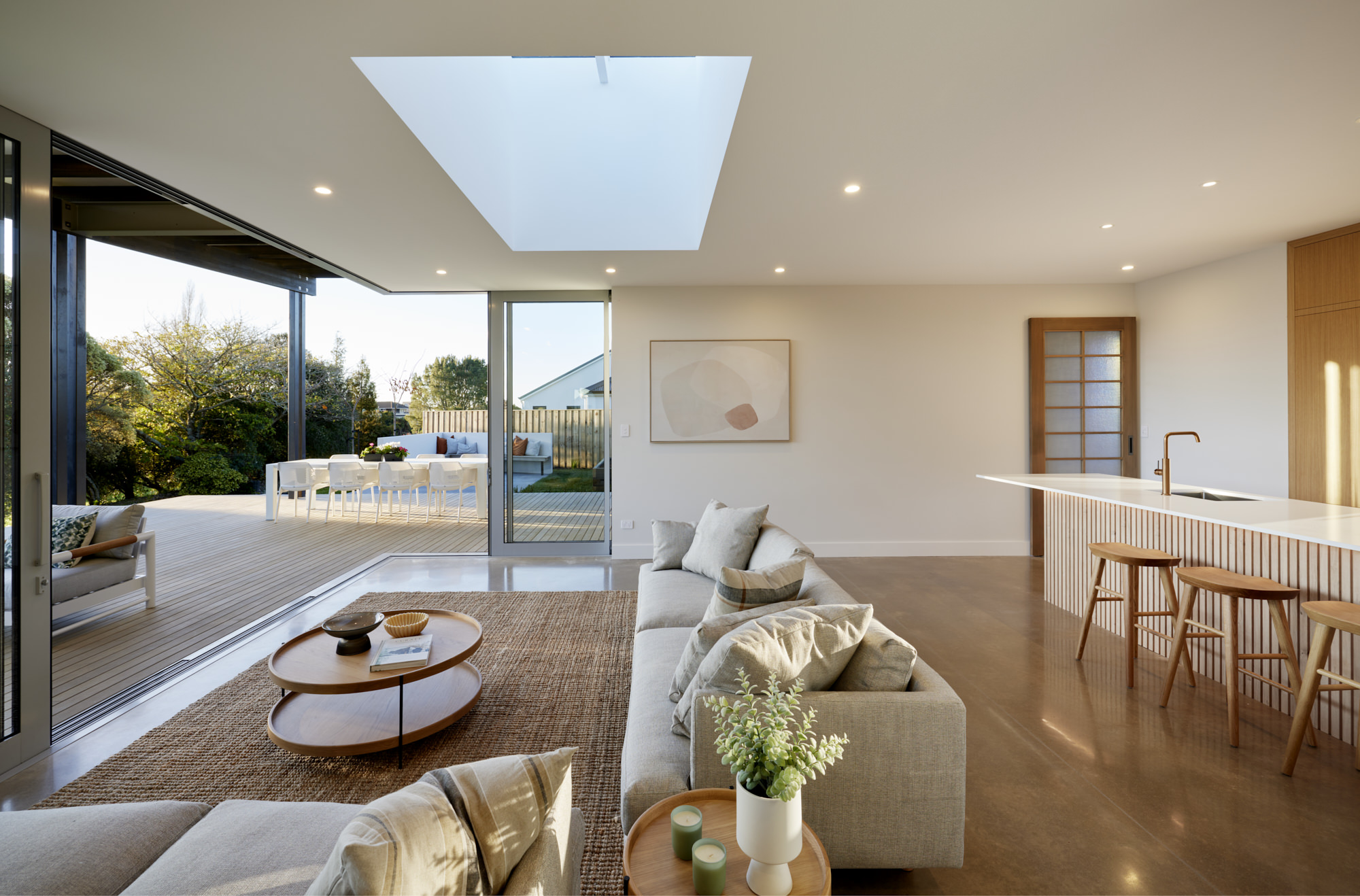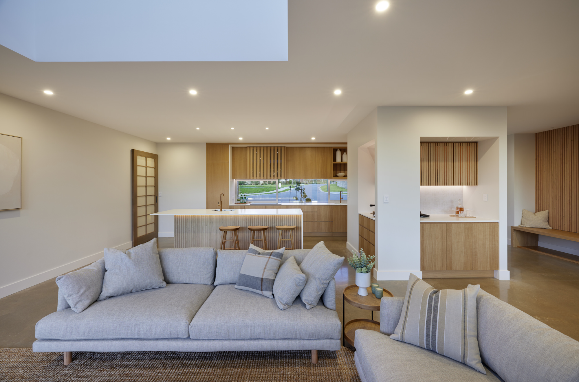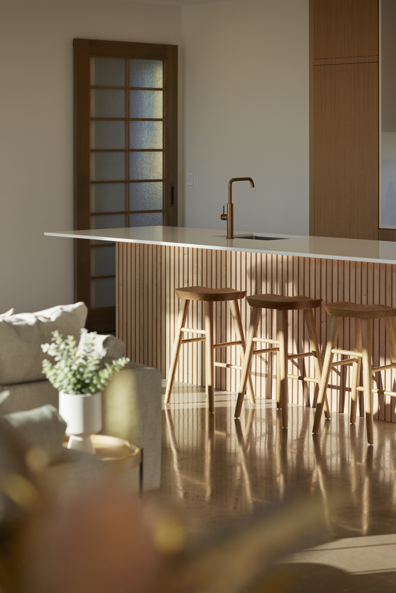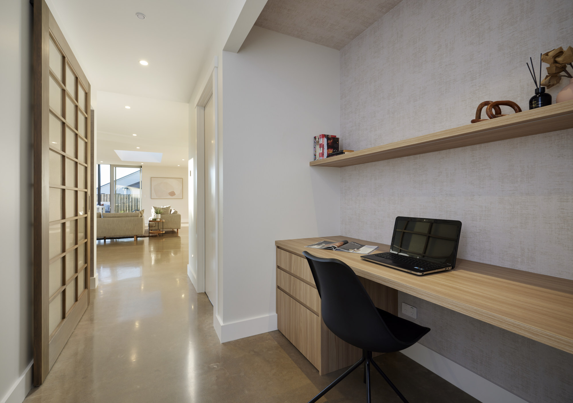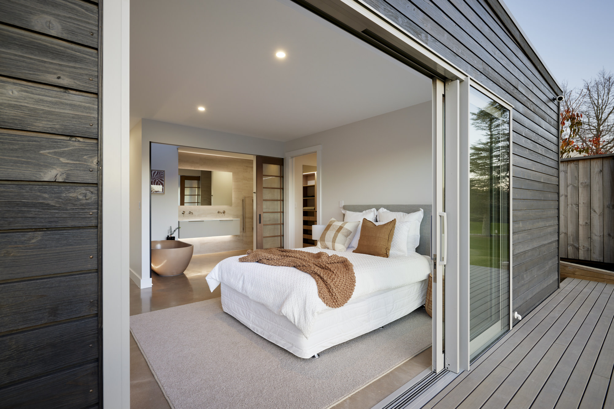 The picture of serenity continues inside with skylights and floor-to-ceiling windows flooding the living spaces with natural light. Finely detailed oak joinery extends beyond the kitchen to the cupboards and seat in the entrance and creates a coffee station, a bar and study nook. Polished concrete floors flow through corner-opening doors to covered decking and a patio with built-in seating around a fire pit. Two bedrooms, a bathroom and powder room enjoy privacy through a shoji slider off to one side of the living with a TV room, main suite and laundry off the other. The final touch of modern Japanese luxury is the spa-inspired ensuite with a yakisugi wall and a shoji screen that opens the bathtub to the bedroom and the garden beyond.