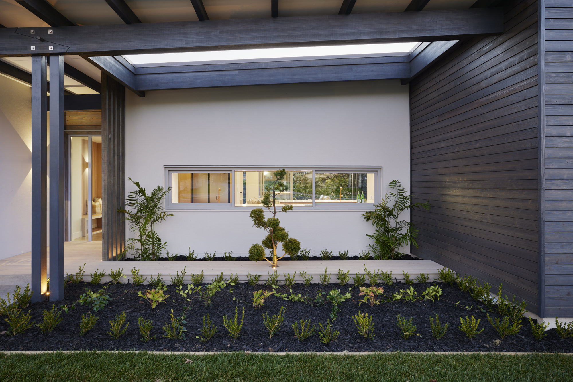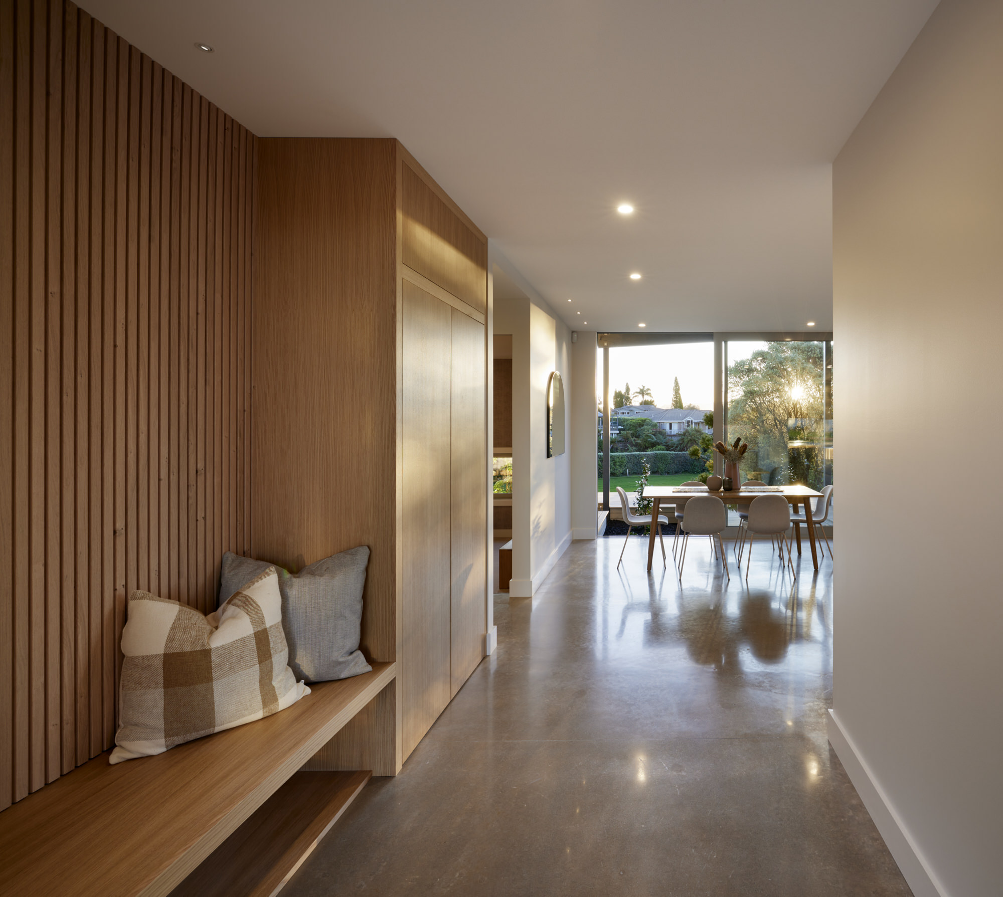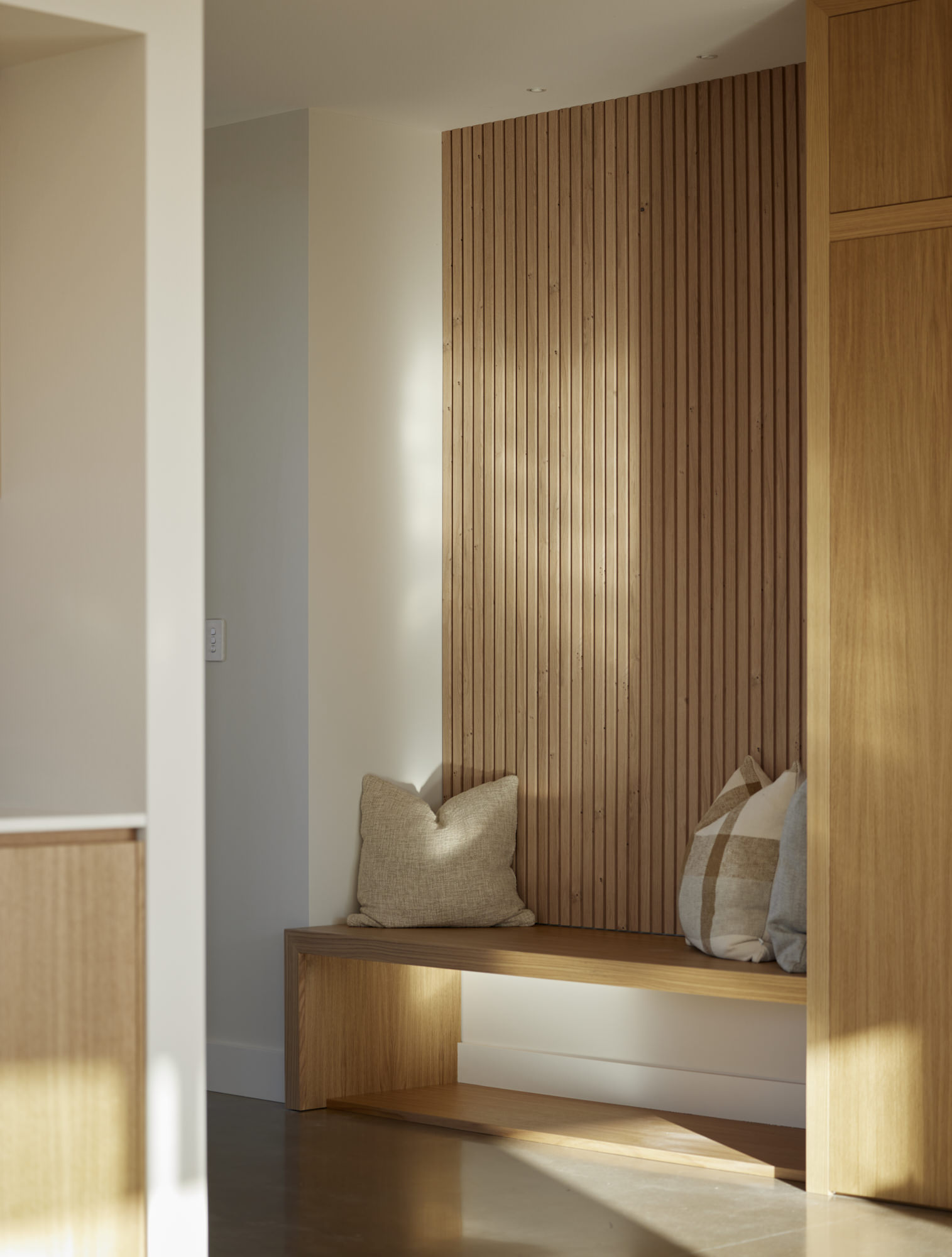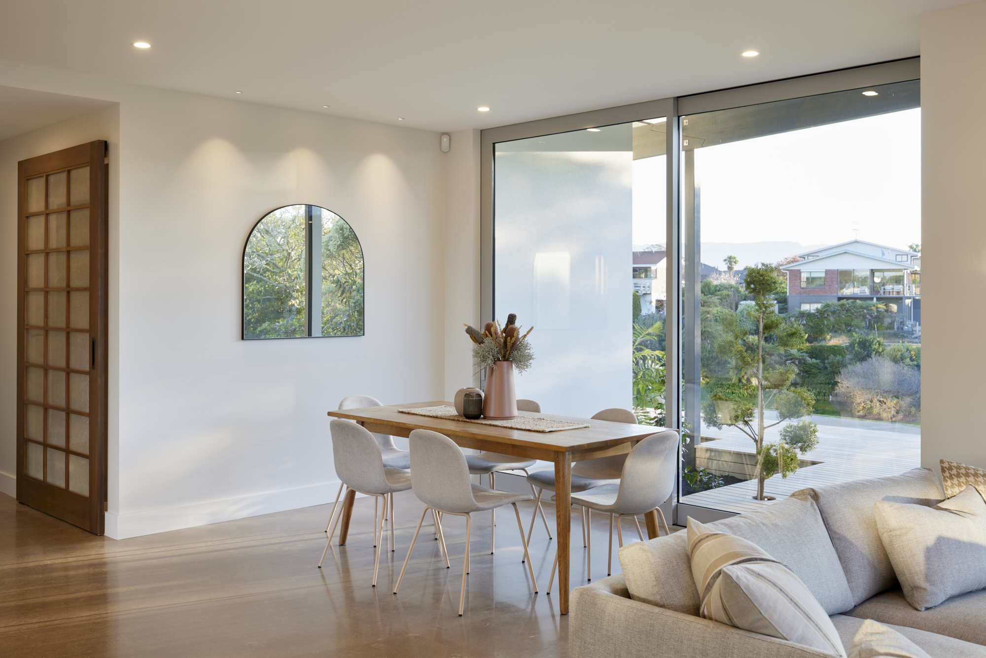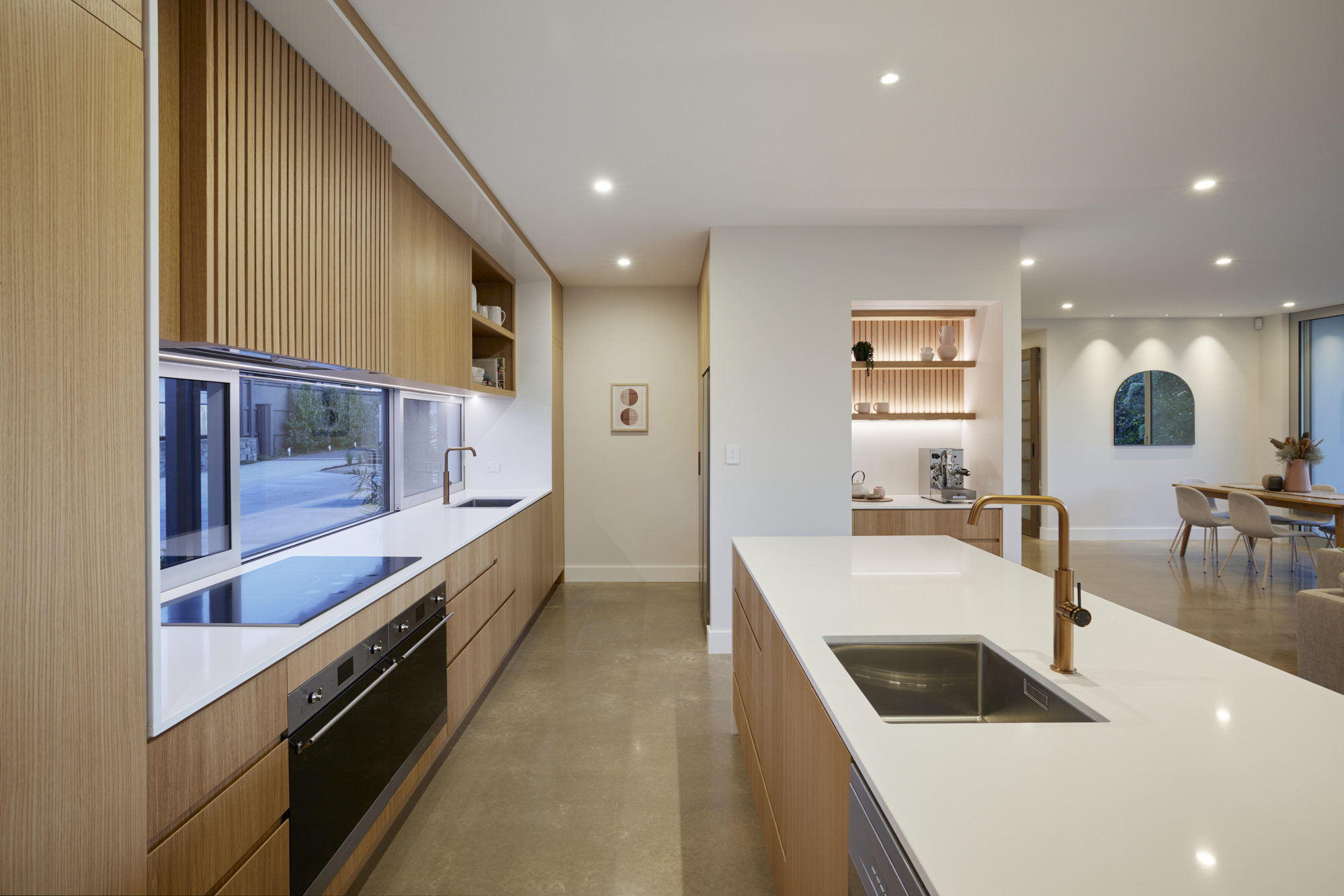 The picture of serenity continues inside with skylights and floor-to-ceiling windows flooding the living spaces with natural light. Finely detailed oak joinery extends beyond the kitchen to the cupboards and seat in the entrance and creates a coffee station, a bar and study nook. Polished concrete floors flow through corner-opening doors to covered decking and a patio with built-in seating around a fire pit. Two bedrooms, a bathroom and powder room enjoy privacy through a shoji slider off to one side of the living with a TV room, main suite and laundry off the other. The final touch of modern Japanese luxury is the spa-inspired ensuite with a yakisugi wall and a shoji screen that opens the bathtub to the bedroom and the garden beyond.
