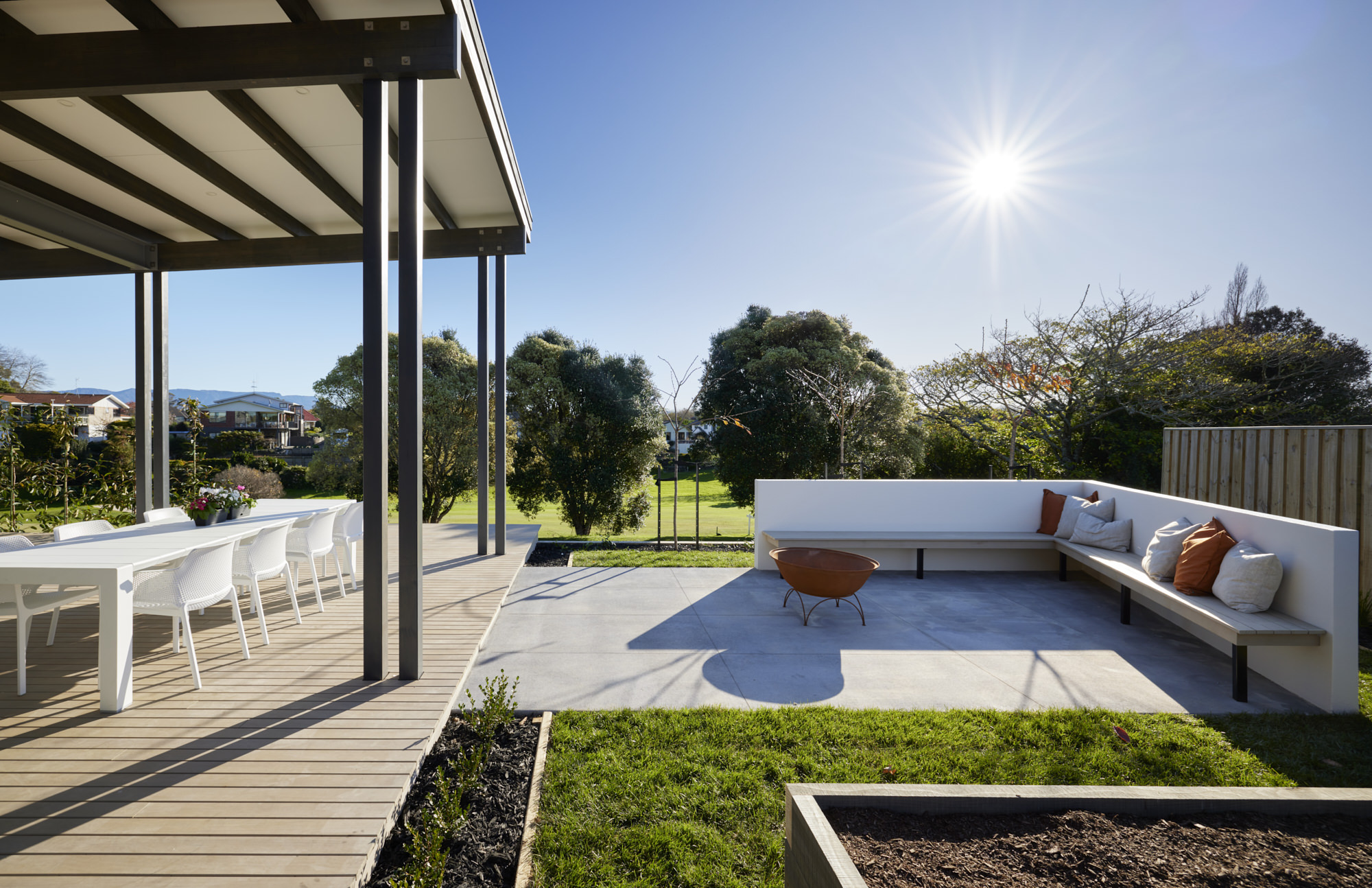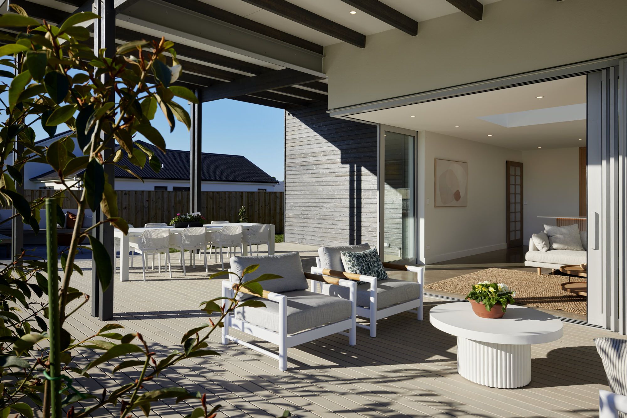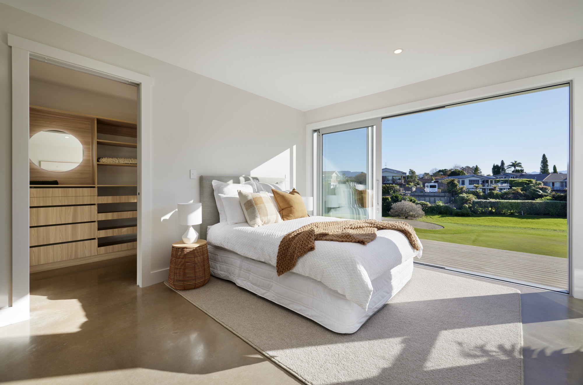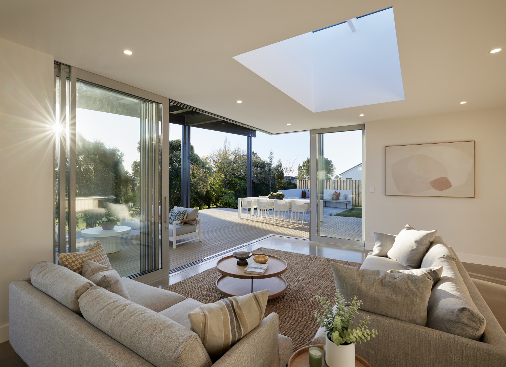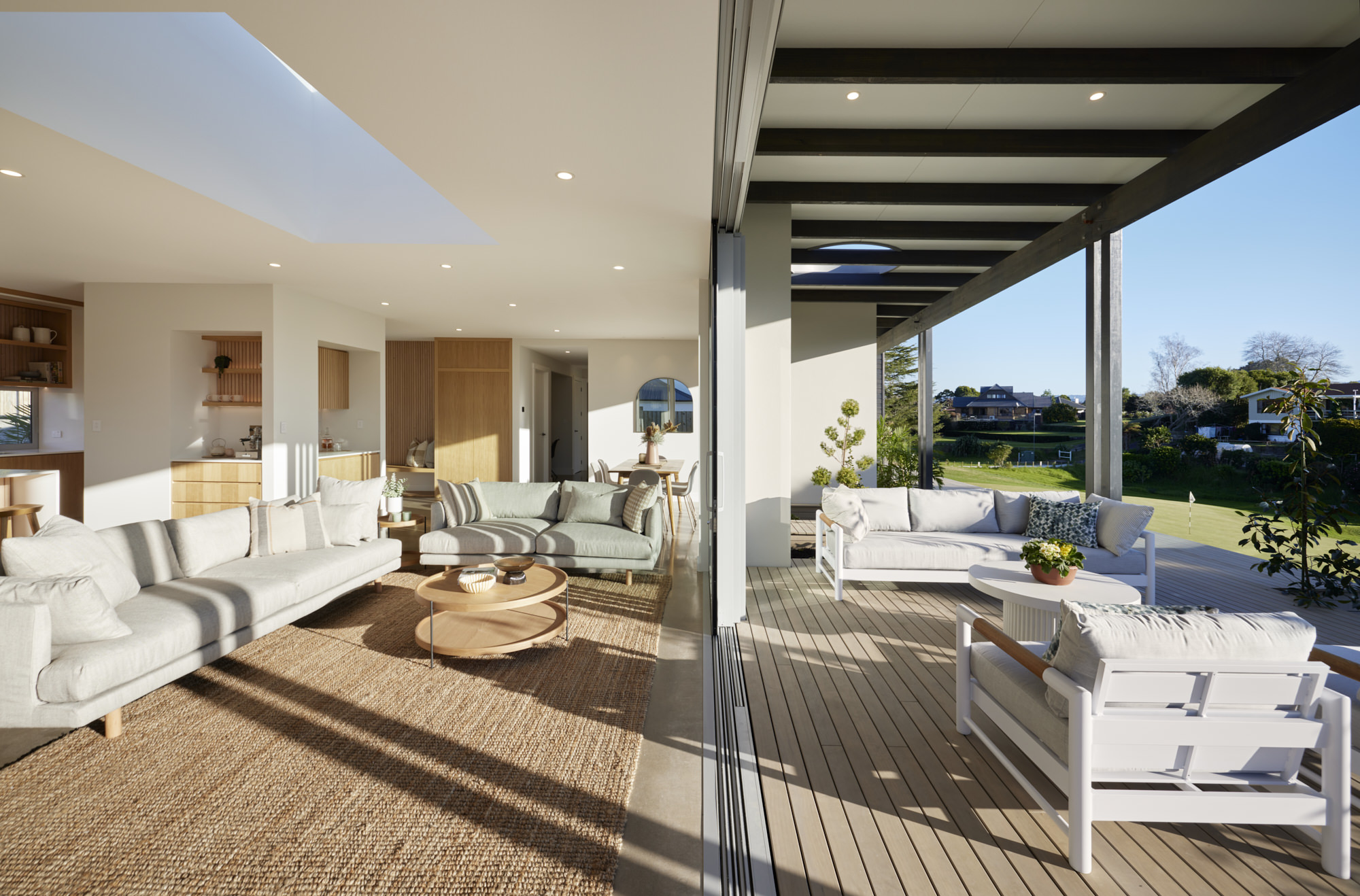 The picture of serenity continues inside with skylights and floor-to-ceiling windows flooding the living spaces with natural light. Finely detailed oak joinery extends beyond the kitchen to the cupboards and seat in the entrance and creates a coffee station, a bar and study nook. Polished concrete floors flow through corner-opening doors to covered decking and a patio with built-in seating around a fire pit. Two bedrooms, a bathroom and powder room enjoy privacy through a shoji slider off to one side of the living with a TV room, main suite and laundry off the other. The final touch of modern Japanese luxury is the spa-inspired ensuite with a yakisugi wall and a shoji screen that opens the bathtub to the bedroom and the garden beyond.