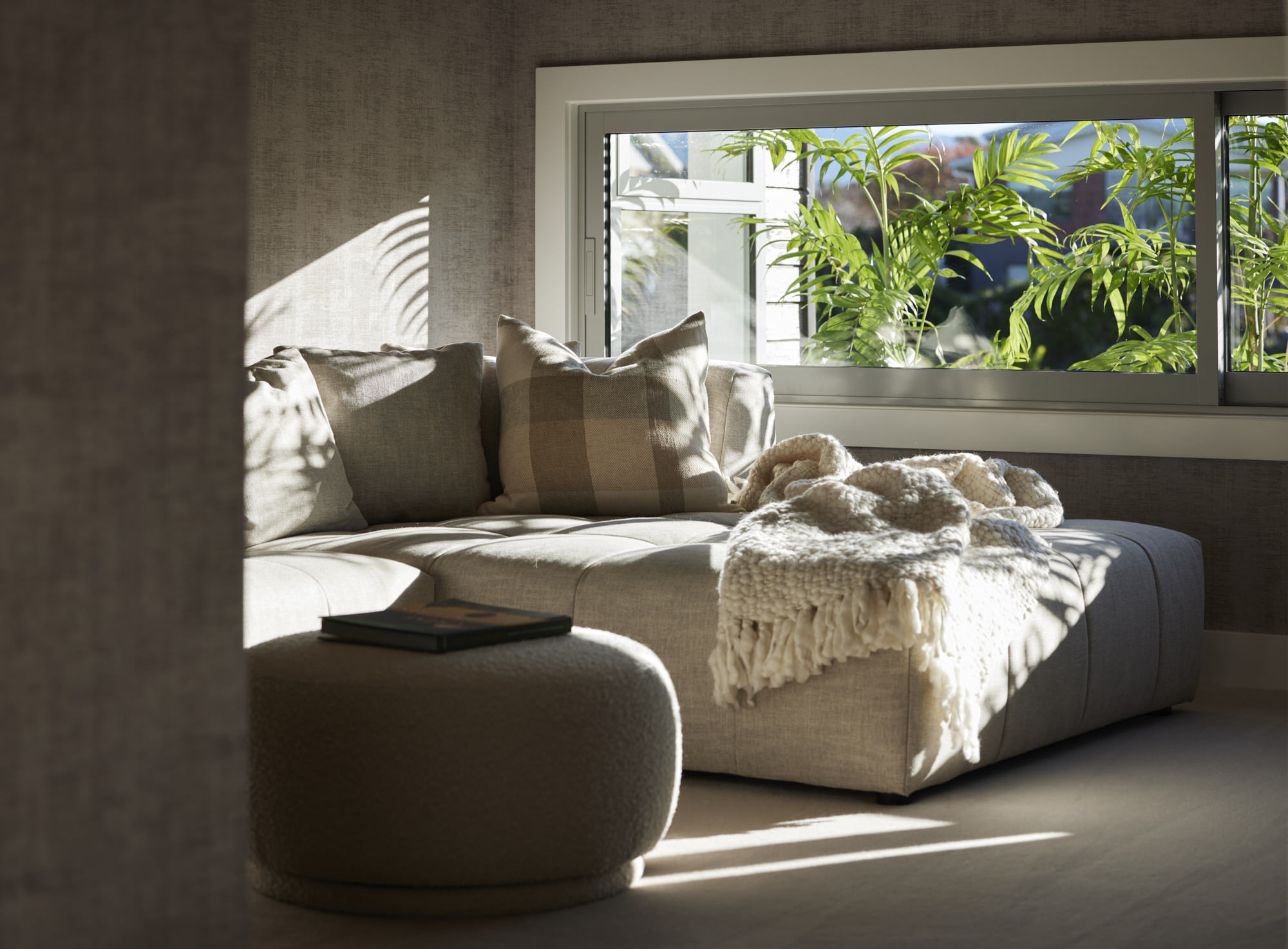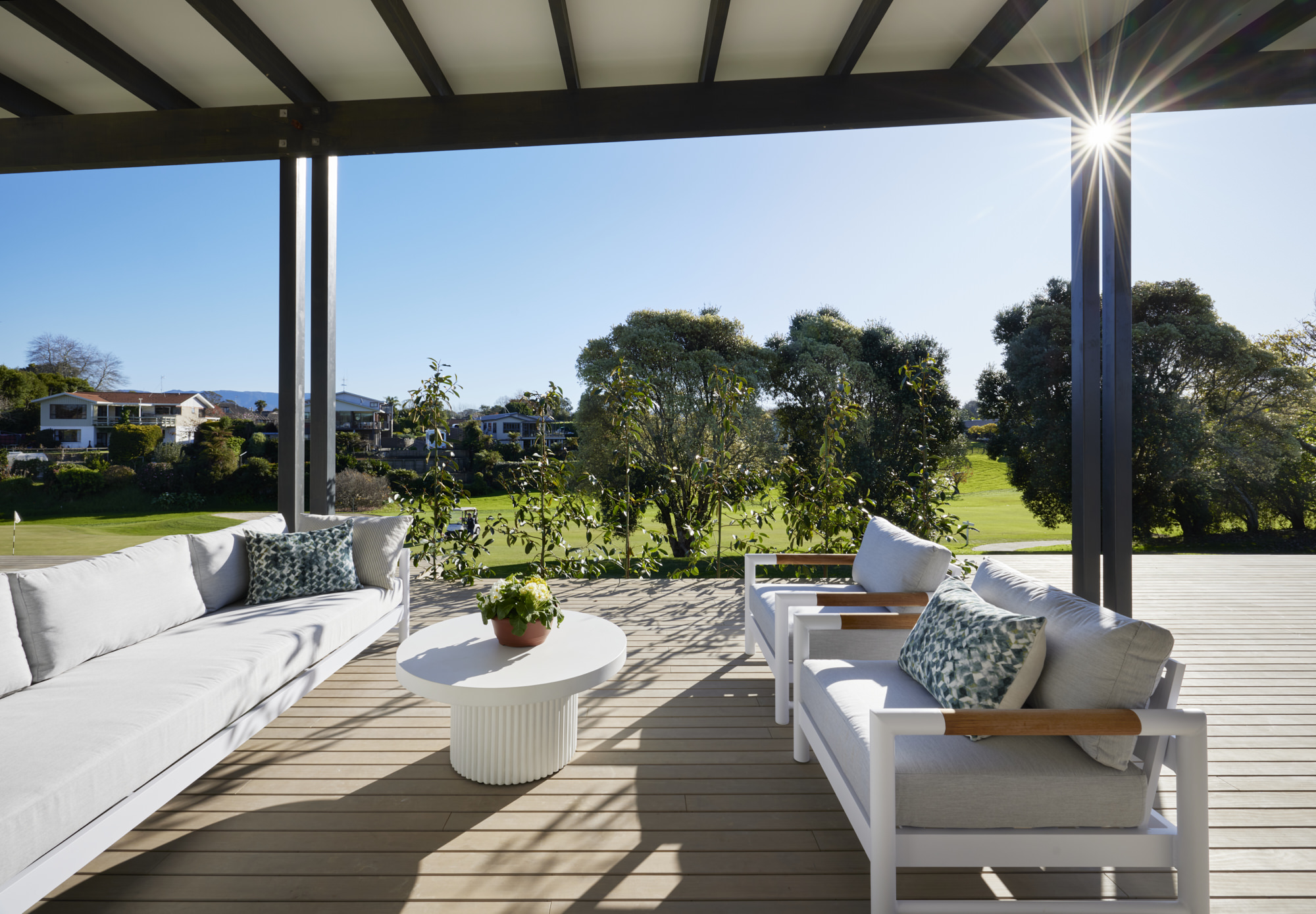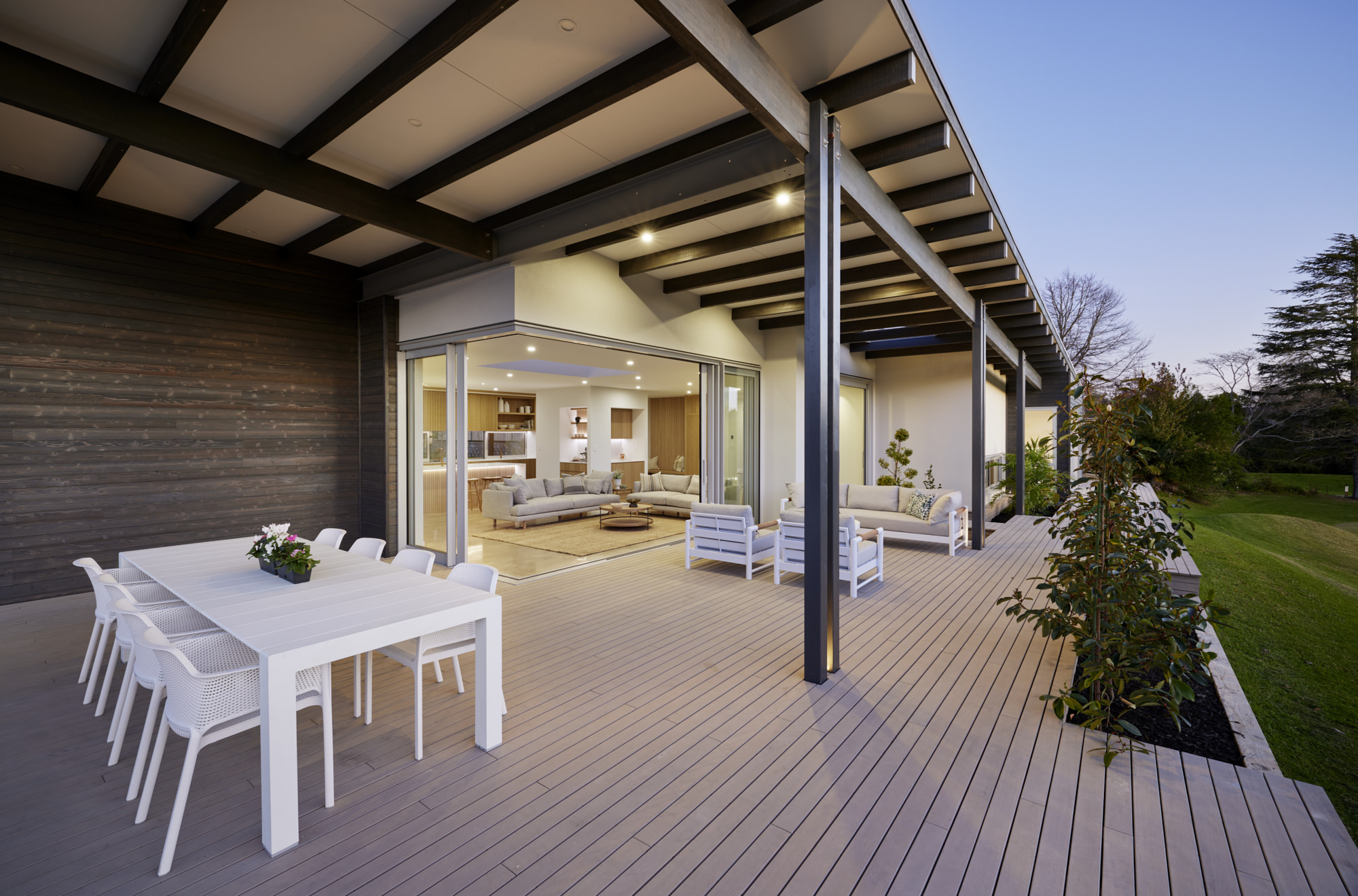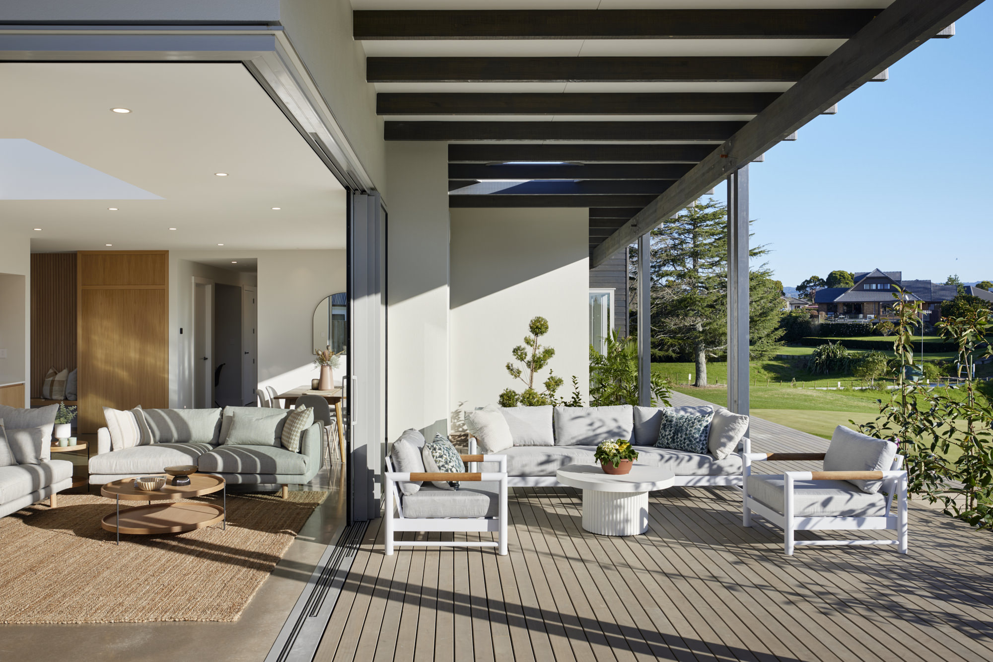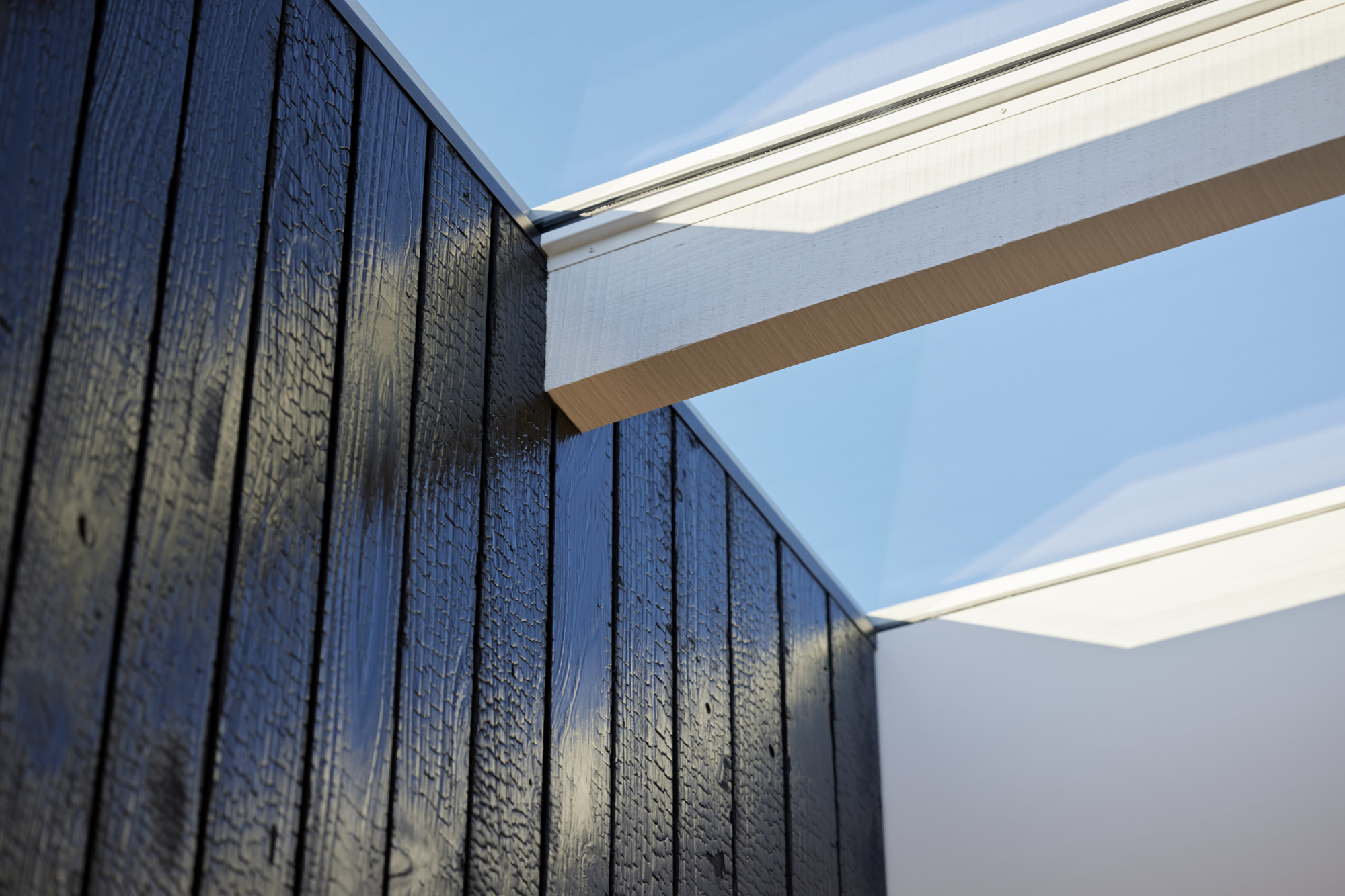 The picture of serenity continues inside with skylights and floor-to-ceiling windows flooding the living spaces with natural light. Finely detailed oak joinery extends beyond the kitchen to the cupboards and seat in the entrance and creates a coffee station, a bar and study nook. Polished concrete floors flow through corner-opening doors to covered decking and a patio with built-in seating around a fire pit. Two bedrooms, a bathroom and powder room enjoy privacy through a shoji slider off to one side of the living with a TV room, main suite and laundry off the other. The final touch of modern Japanese luxury is the spa-inspired ensuite with a yakisugi wall and a shoji screen that opens the bathtub to the bedroom and the garden beyond.