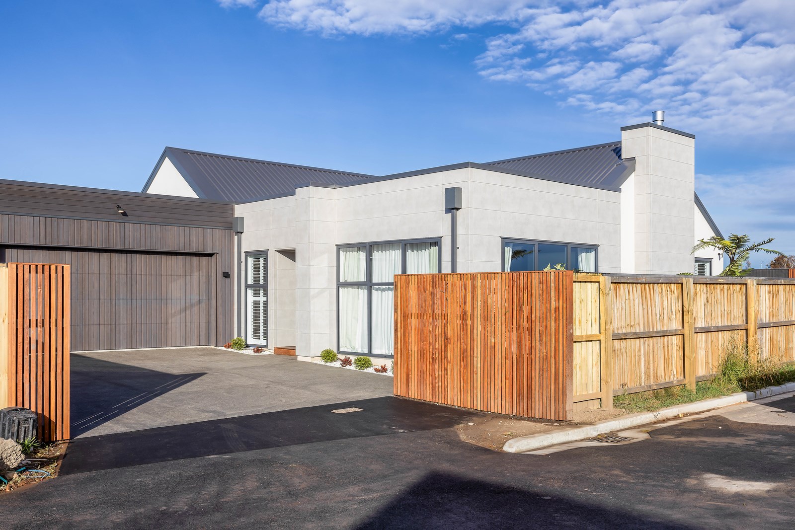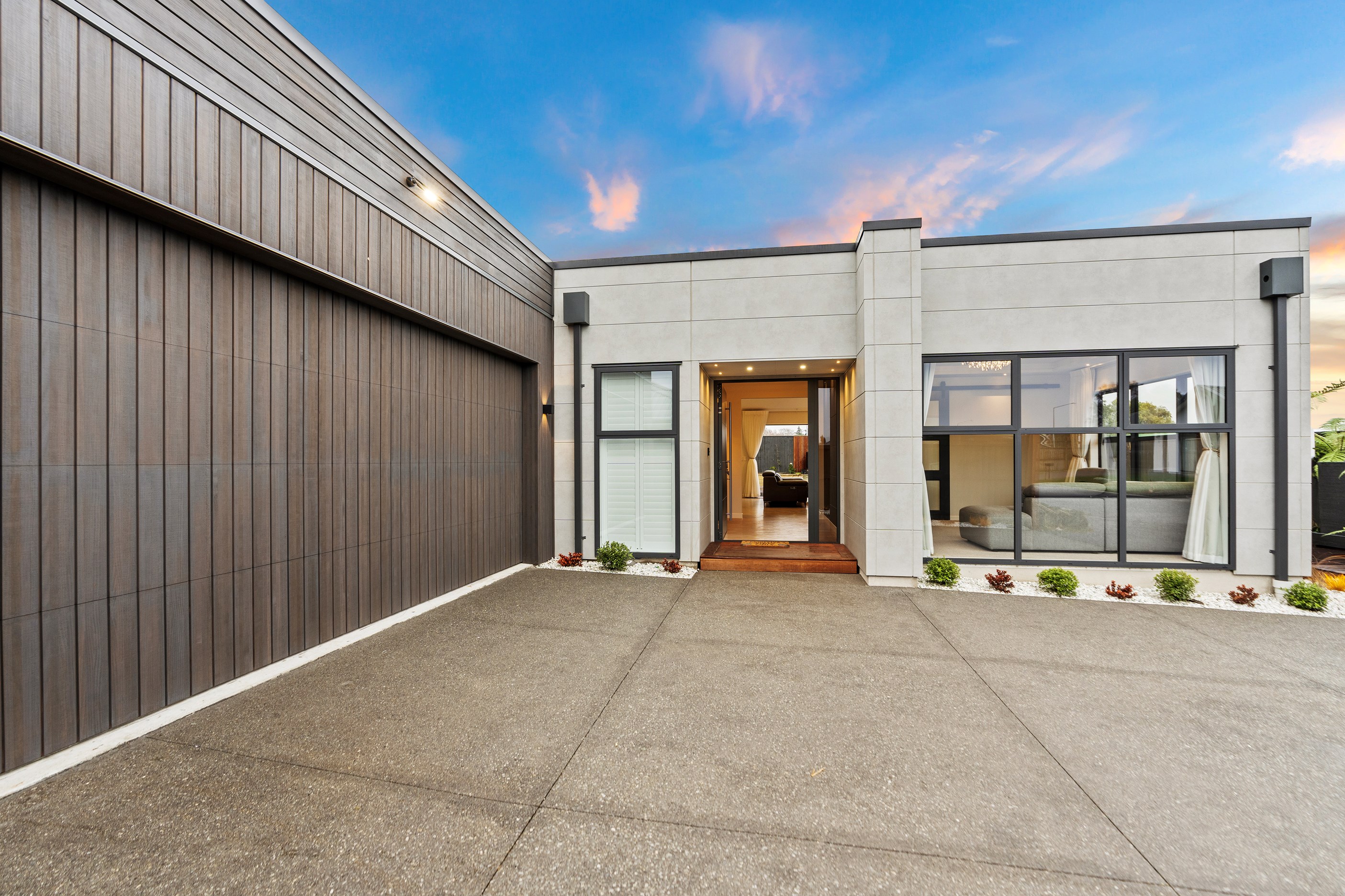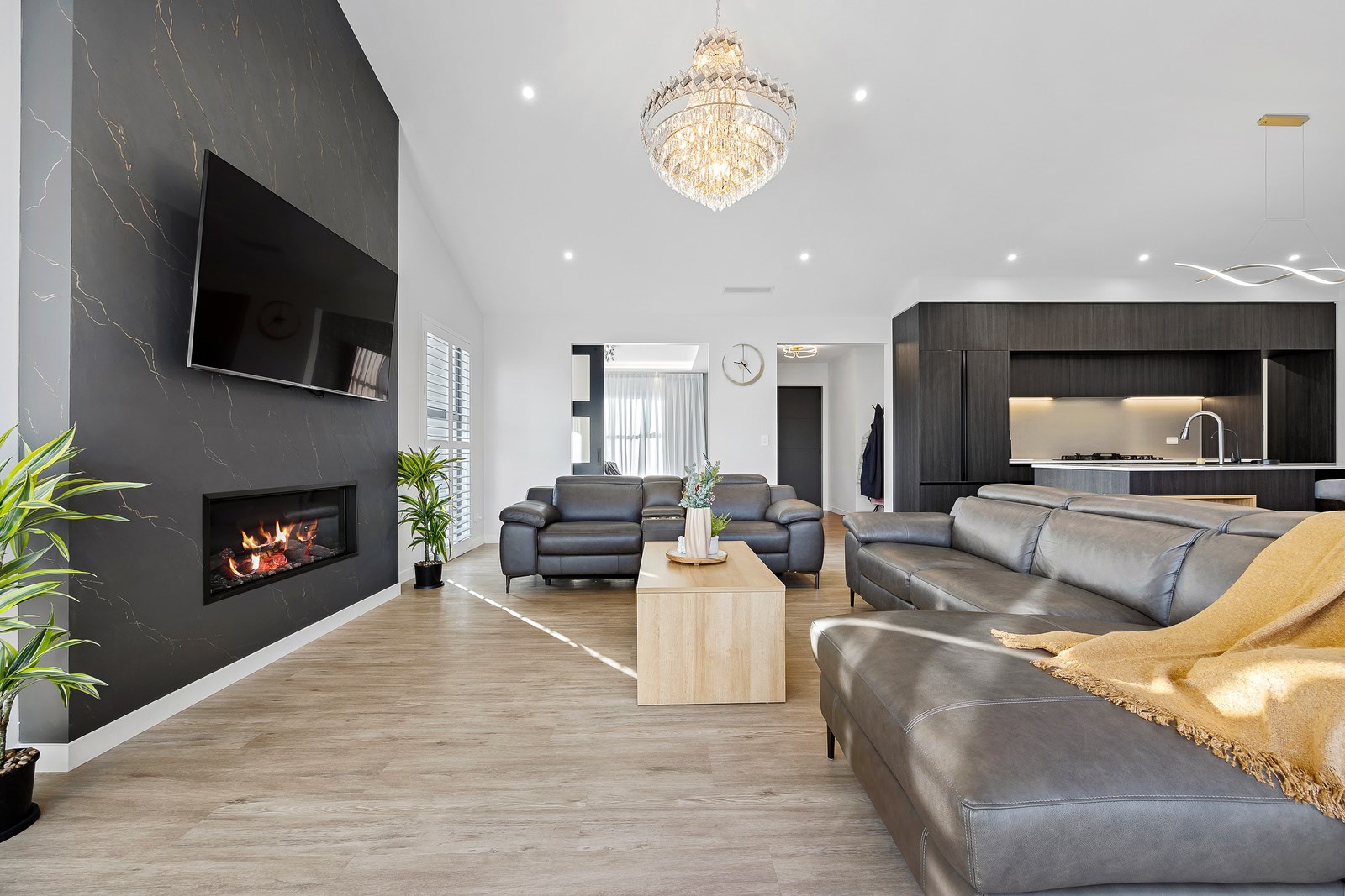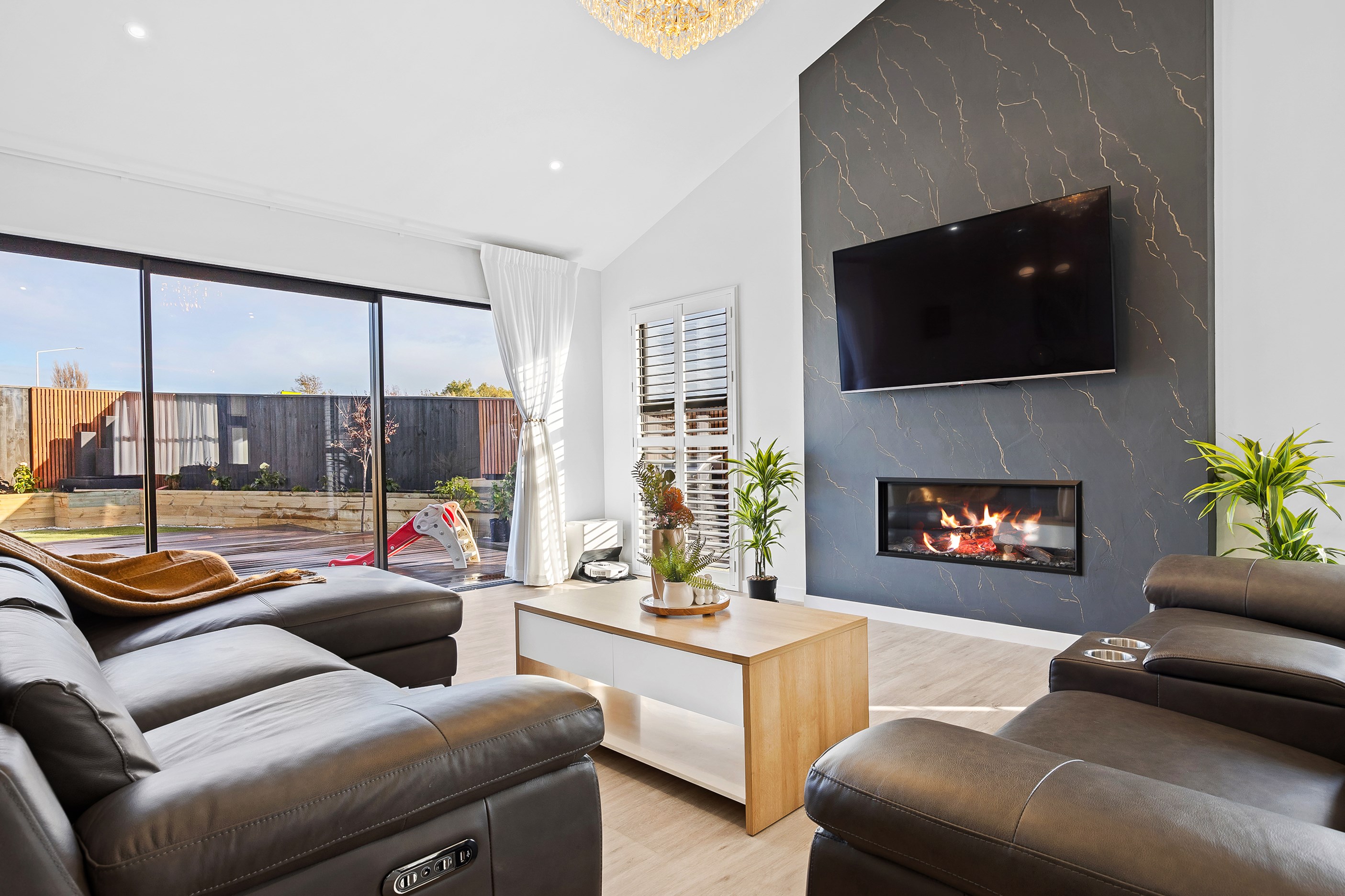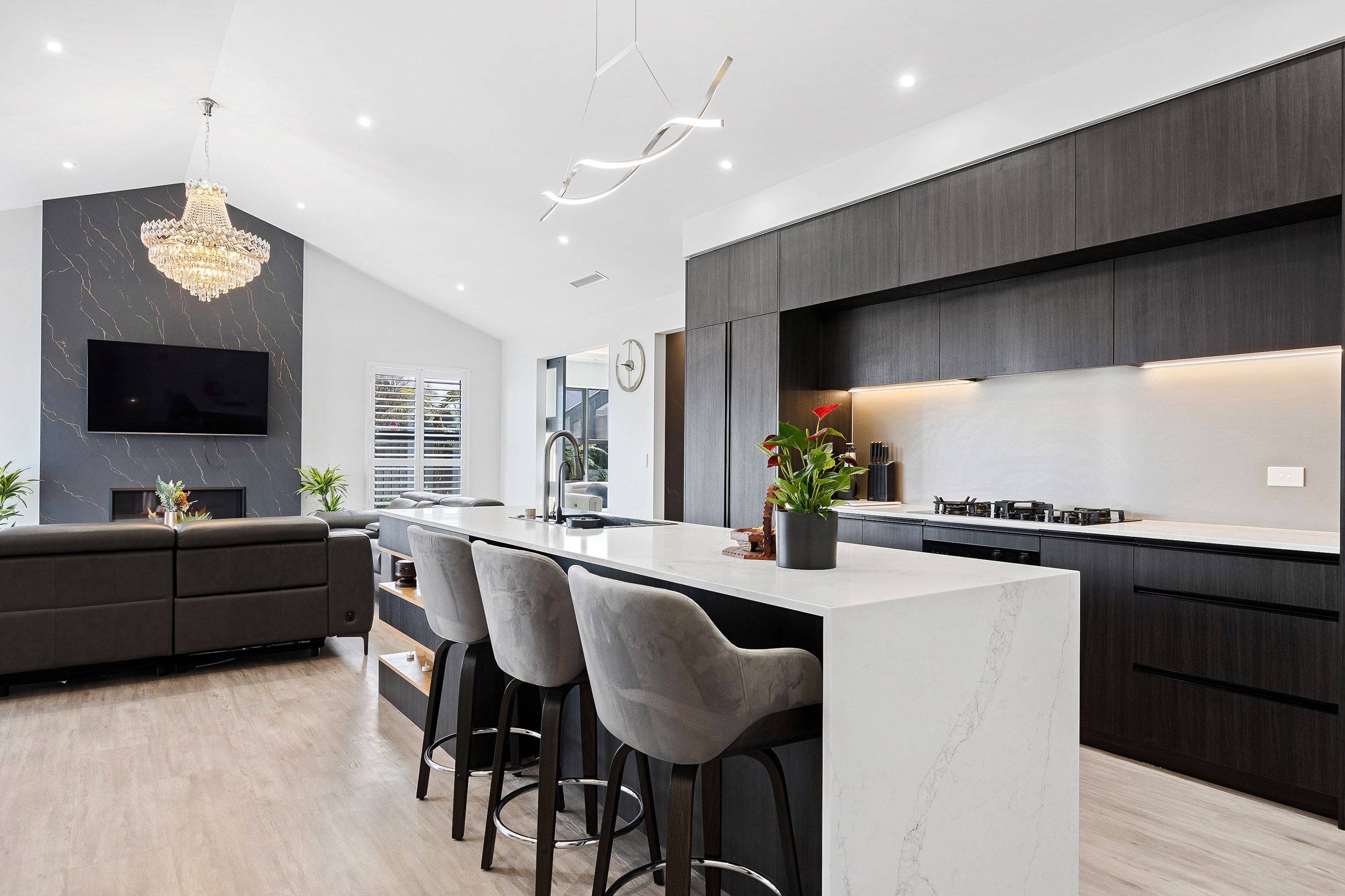 The spacious kitchen, with walk-in pantry, flows into a separate lounge with sliders that open onto the deck, flooding the interior with natural light. Stylish scissor ceilings accentuate the living areas, complemented by a box ceiling in the lounge. The durable and elegant exterior cladding features Abodo, Cemintal Territory panels, and a Rockcote Integra plaster system. The entry and fireplace showcase Rockcote Marrakesh lime plaster, while modern barn doors add sophistication. The fully tiled bathrooms are the epitome of luxury. This home is a testament to advanced stylish living.