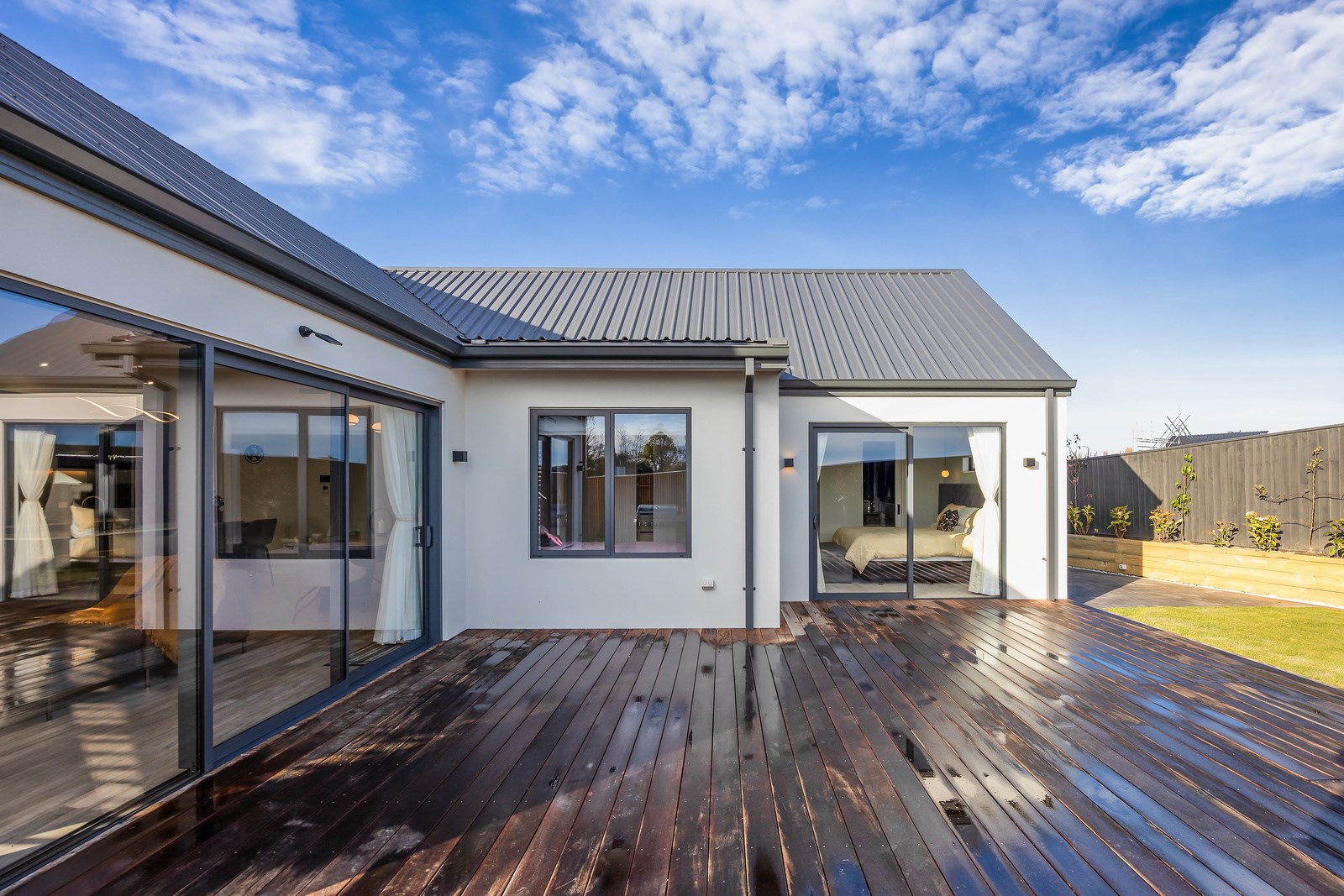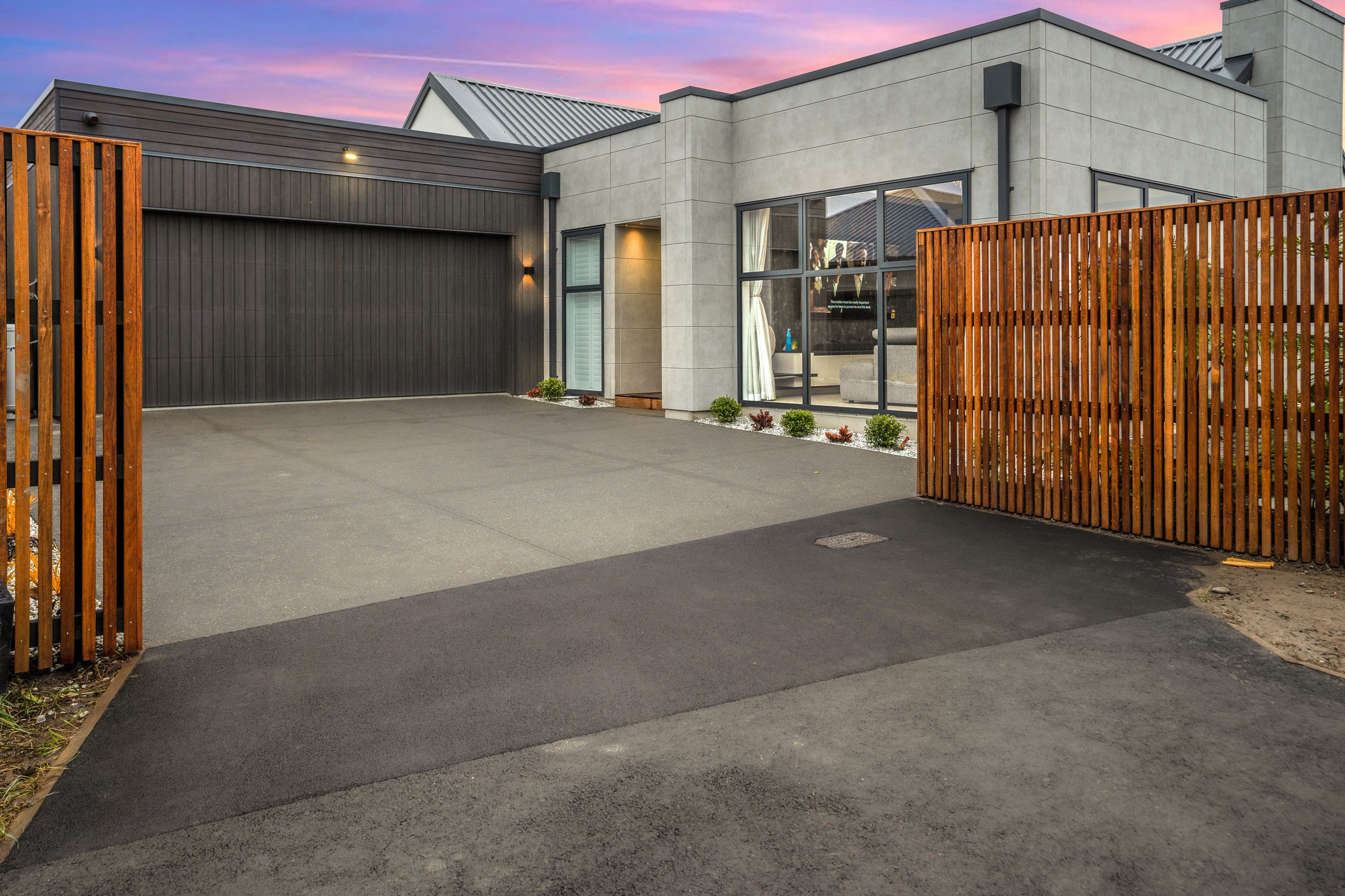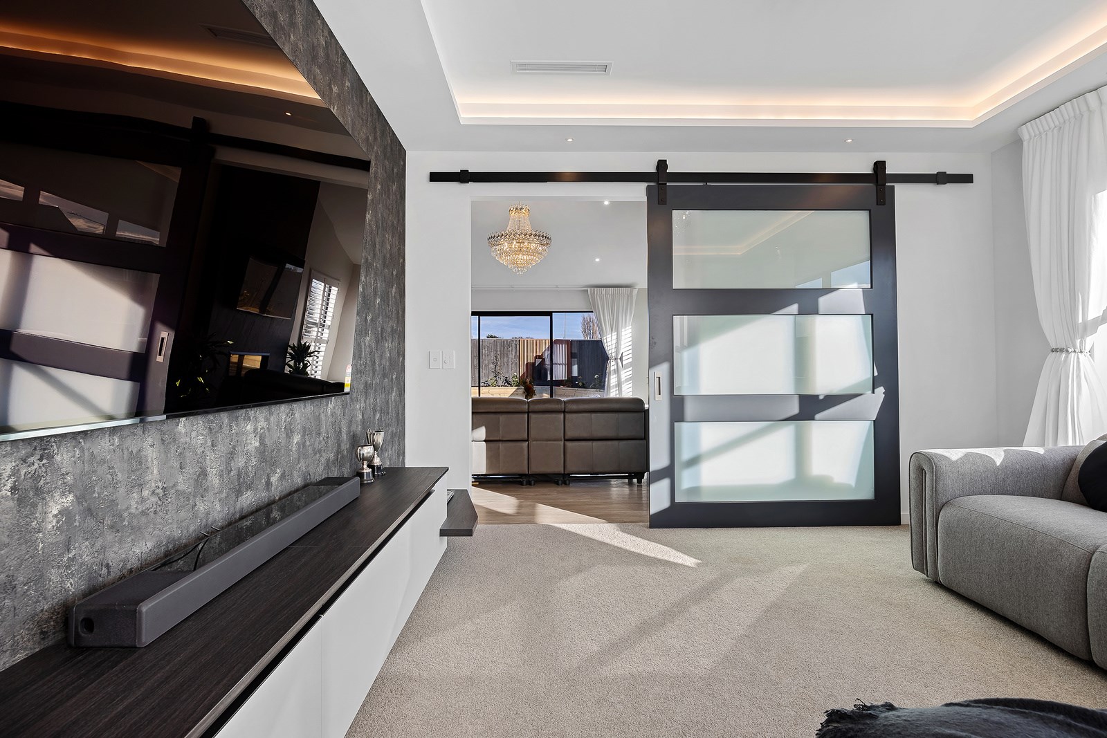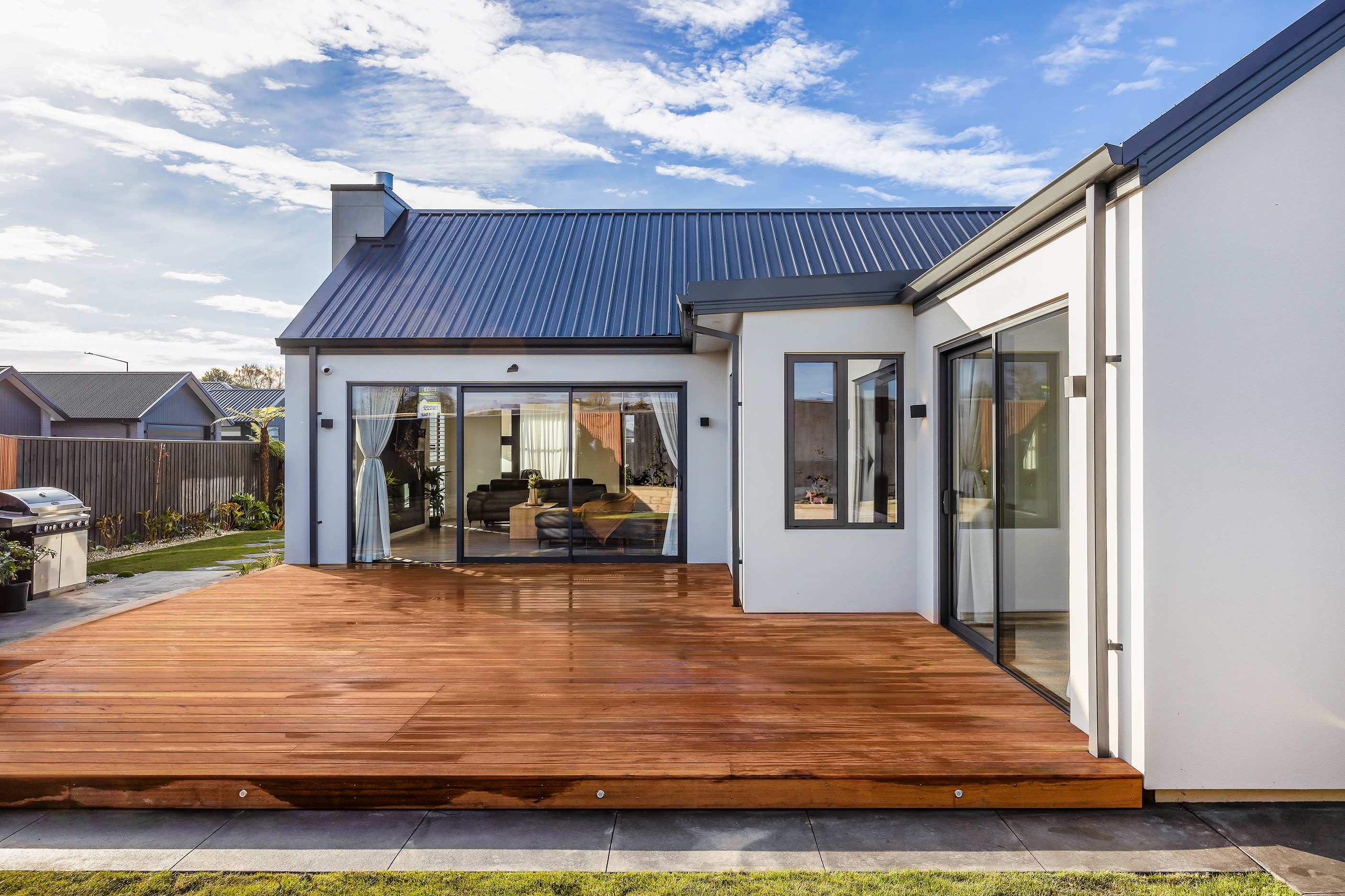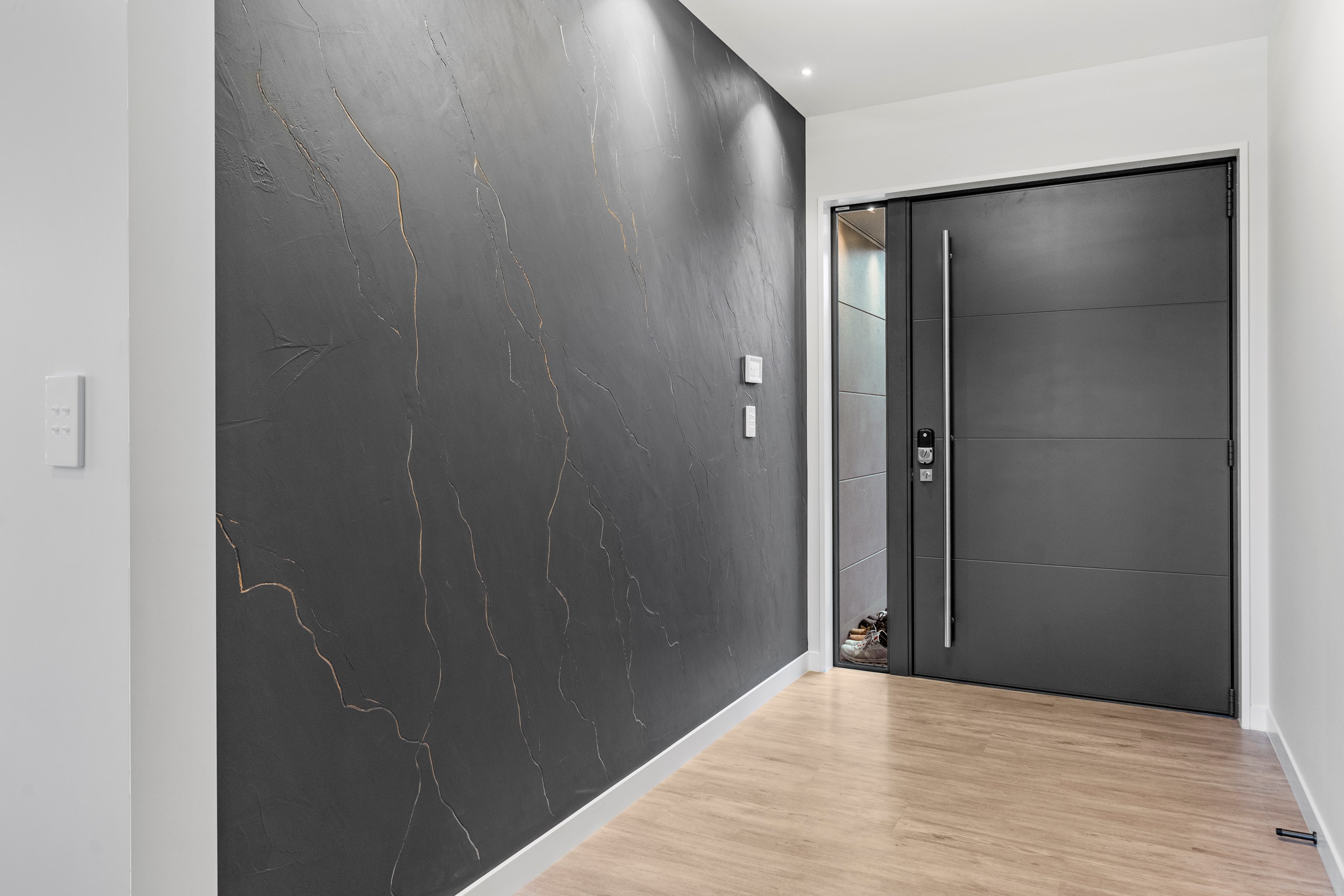 The spacious kitchen, with walk-in pantry, flows into a separate lounge with sliders that open onto the deck, flooding the interior with natural light. Stylish scissor ceilings accentuate the living areas, complemented by a box ceiling in the lounge. The durable and elegant exterior cladding features Abodo, Cemintal Territory panels, and a Rockcote Integra plaster system. The entry and fireplace showcase Rockcote Marrakesh lime plaster, while modern barn doors add sophistication. The fully tiled bathrooms are the epitome of luxury. This home is a testament to advanced stylish living.