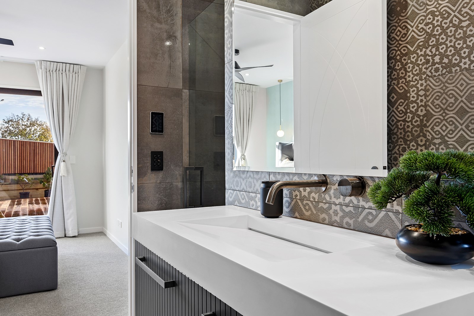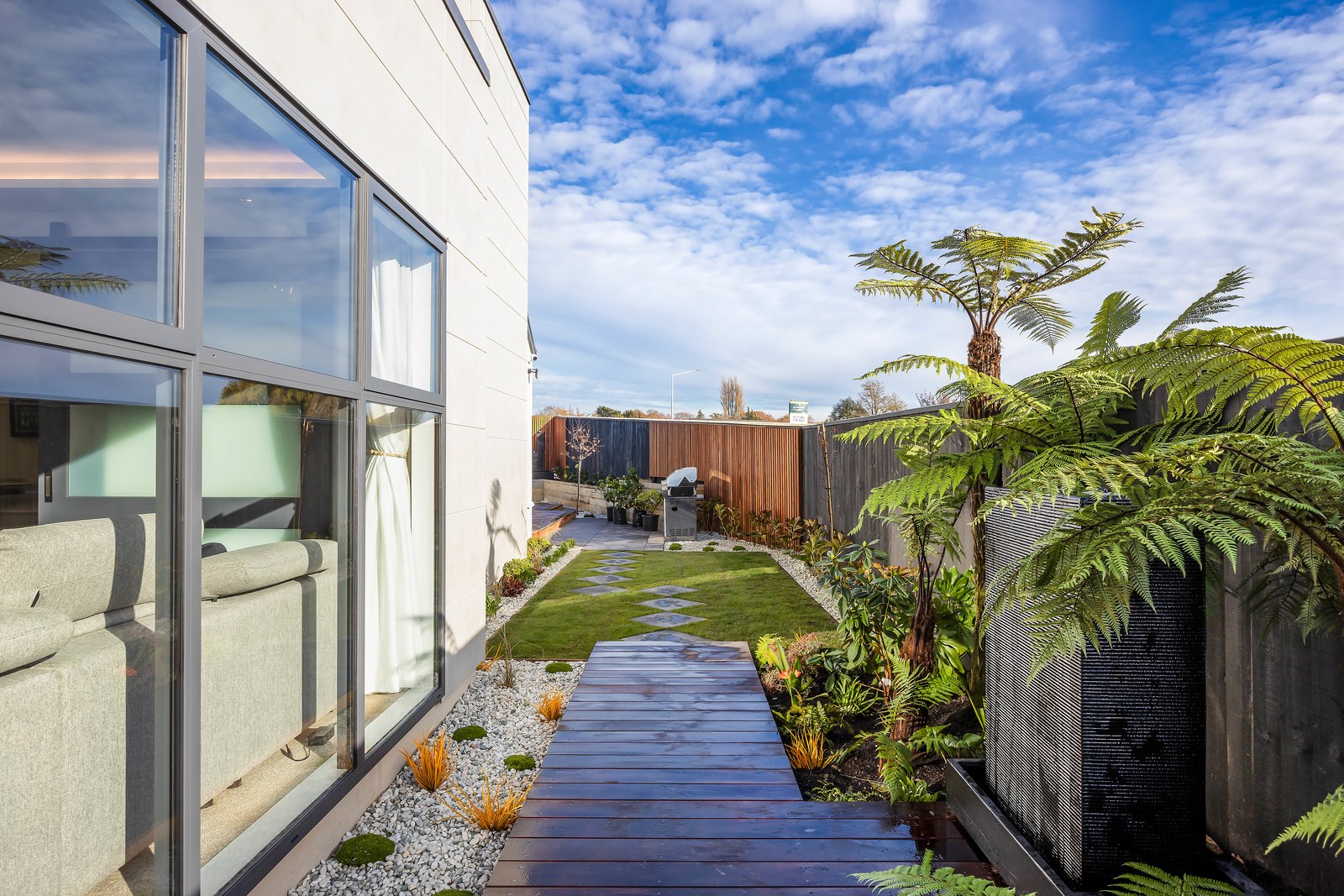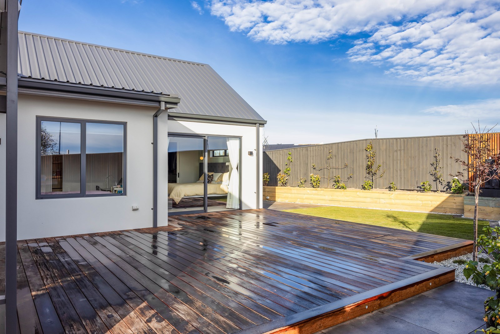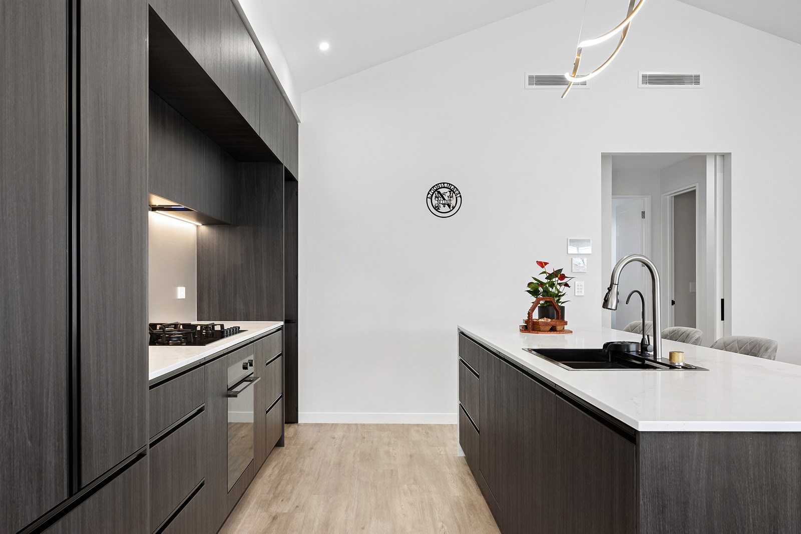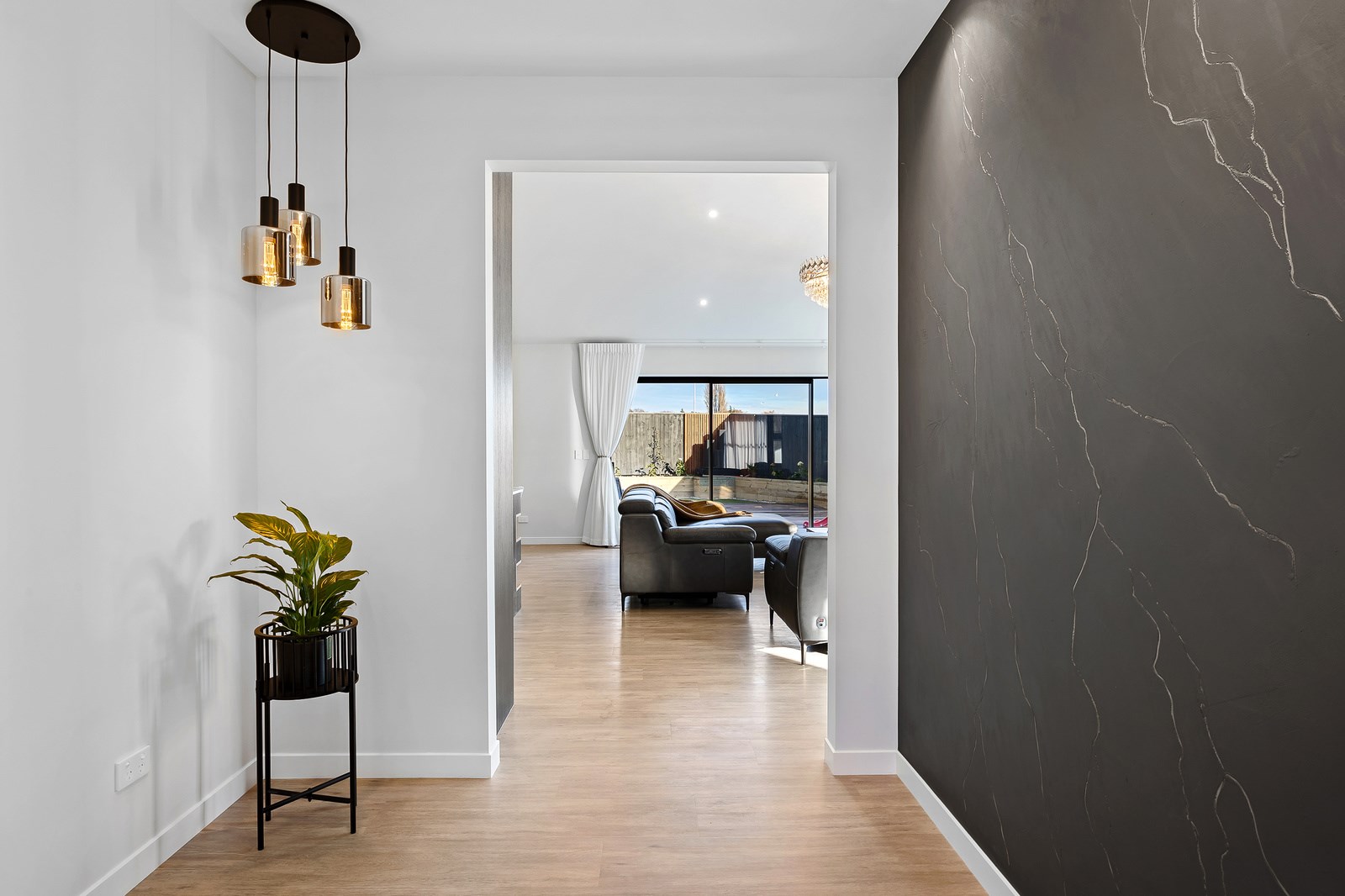 The spacious kitchen, with walk-in pantry, flows into a separate lounge with sliders that open onto the deck, flooding the interior with natural light. Stylish scissor ceilings accentuate the living areas, complemented by a box ceiling in the lounge. The durable and elegant exterior cladding features Abodo, Cemintal Territory panels, and a Rockcote Integra plaster system. The entry and fireplace showcase Rockcote Marrakesh lime plaster, while modern barn doors add sophistication. The fully tiled bathrooms are the epitome of luxury. This home is a testament to advanced stylish living.