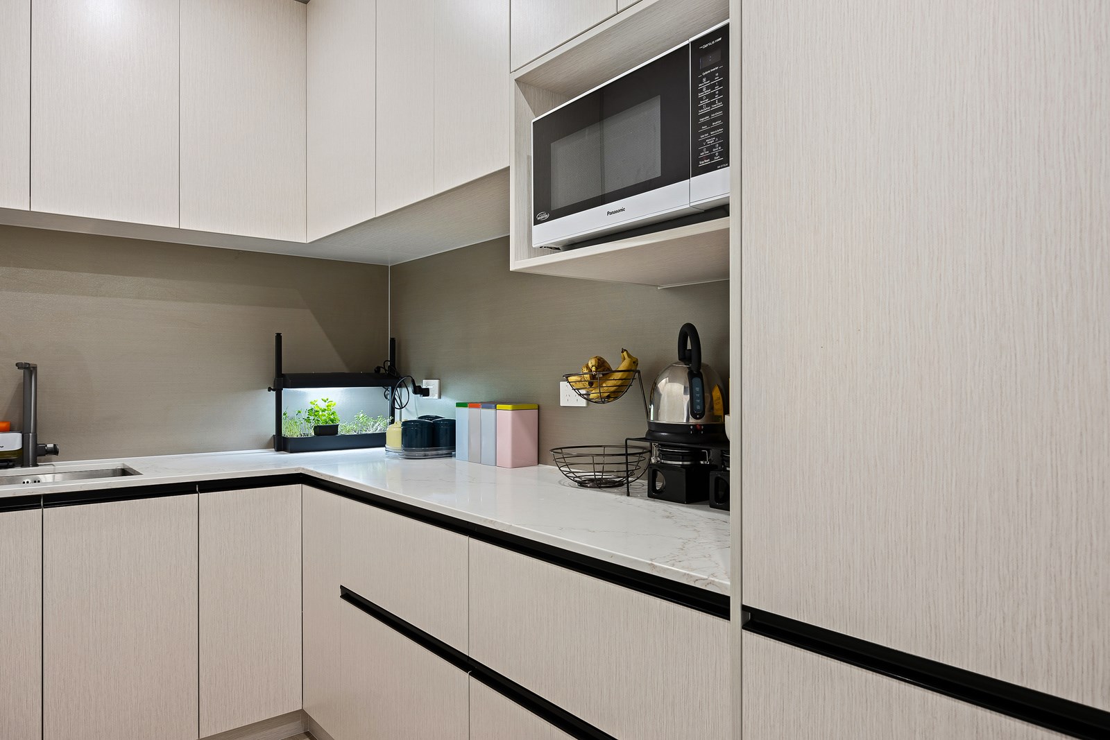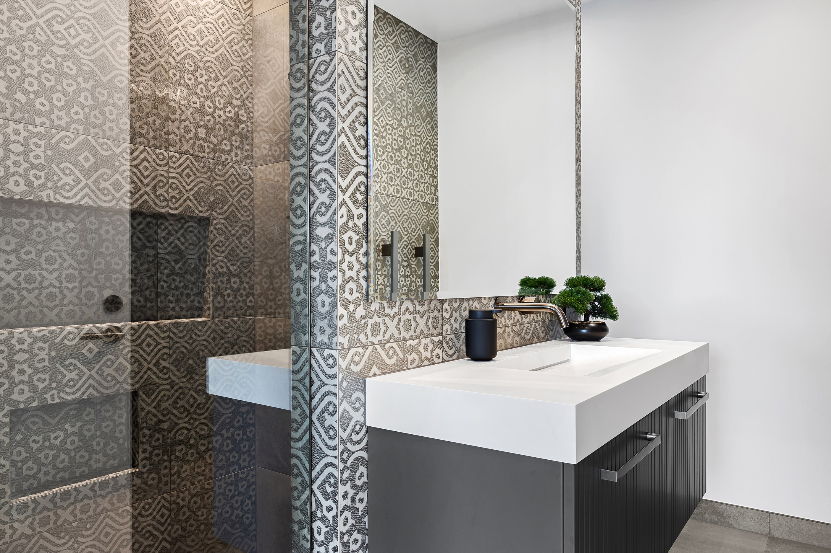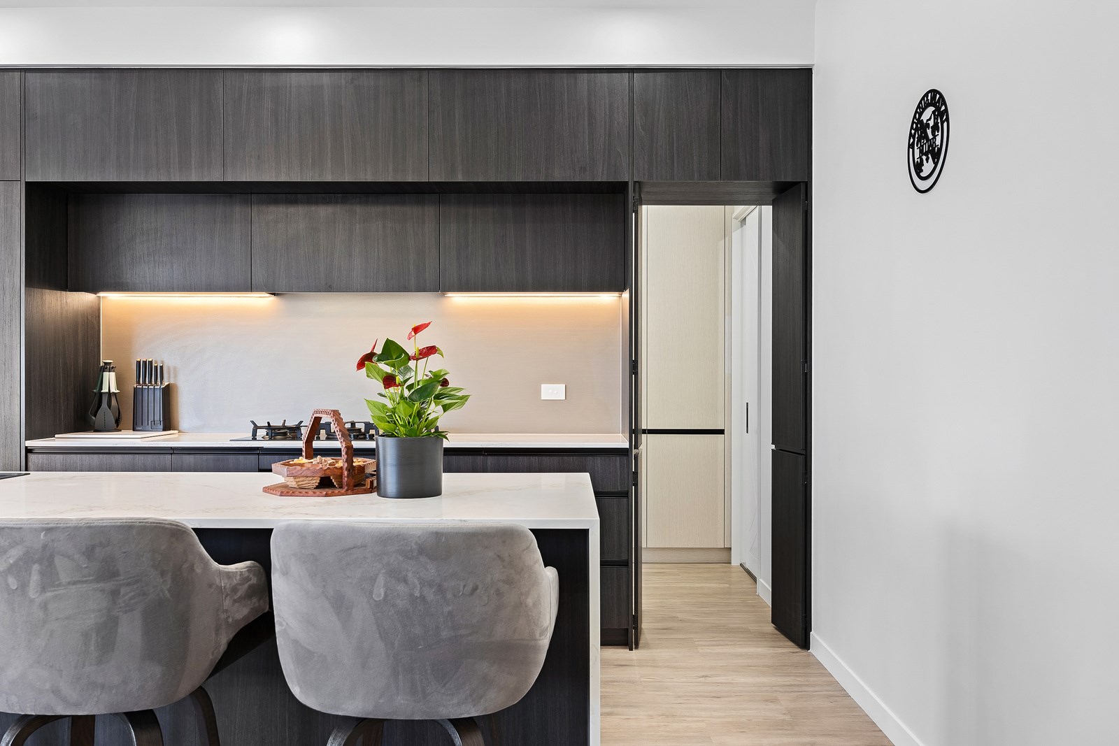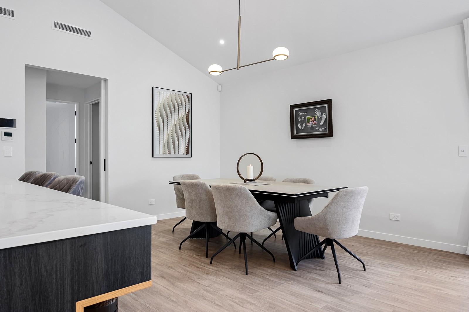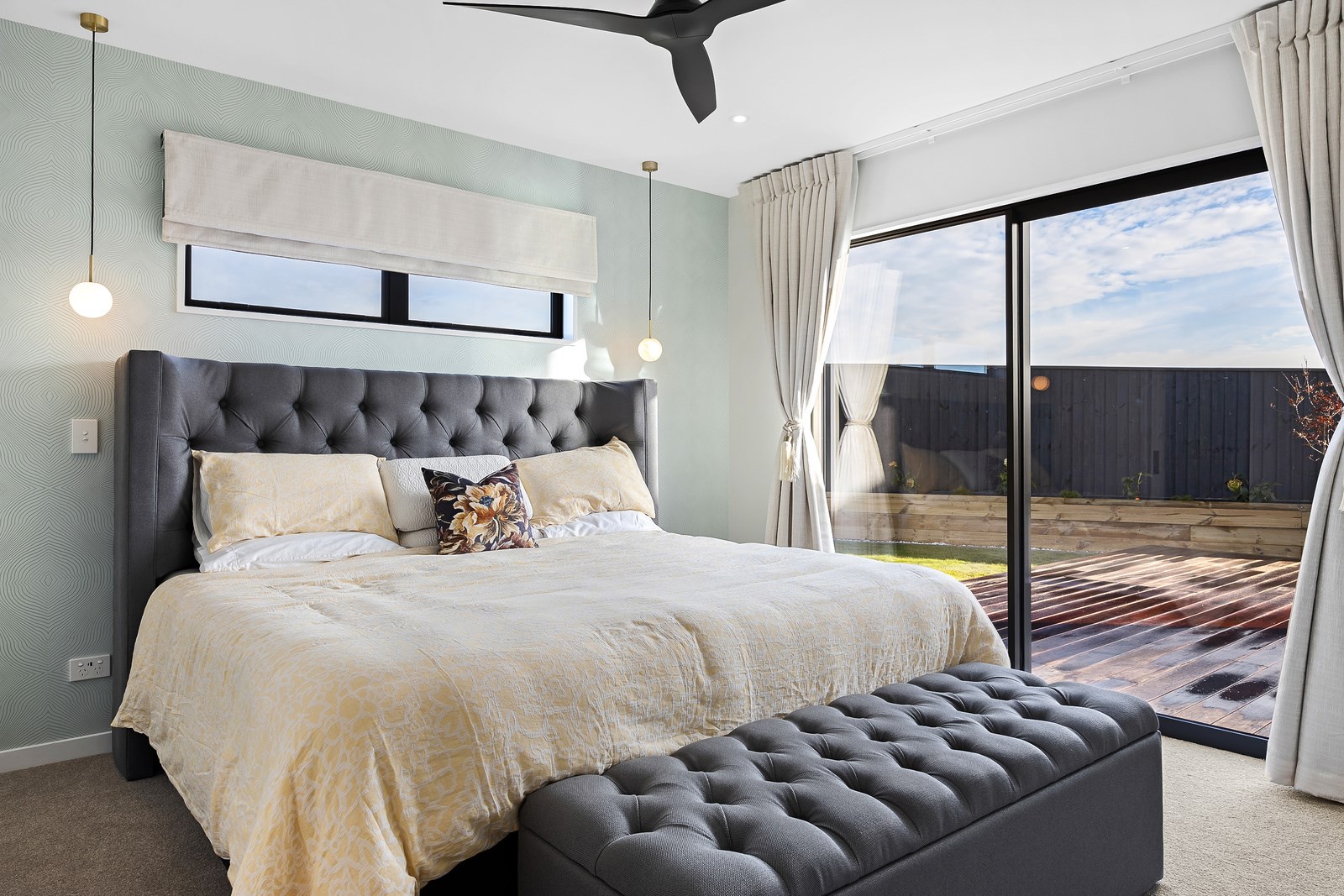 The spacious kitchen, with walk-in pantry, flows into a separate lounge with sliders that open onto the deck, flooding the interior with natural light. Stylish scissor ceilings accentuate the living areas, complemented by a box ceiling in the lounge. The durable and elegant exterior cladding features Abodo, Cemintal Territory panels, and a Rockcote Integra plaster system. The entry and fireplace showcase Rockcote Marrakesh lime plaster, while modern barn doors add sophistication. The fully tiled bathrooms are the epitome of luxury. This home is a testament to advanced stylish living.