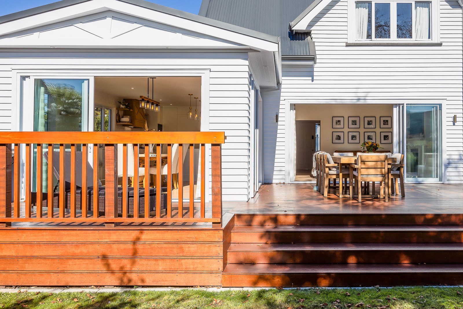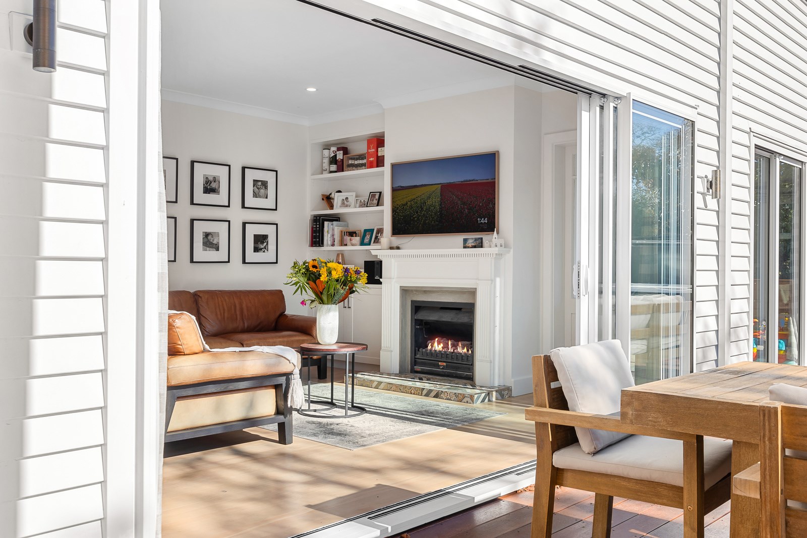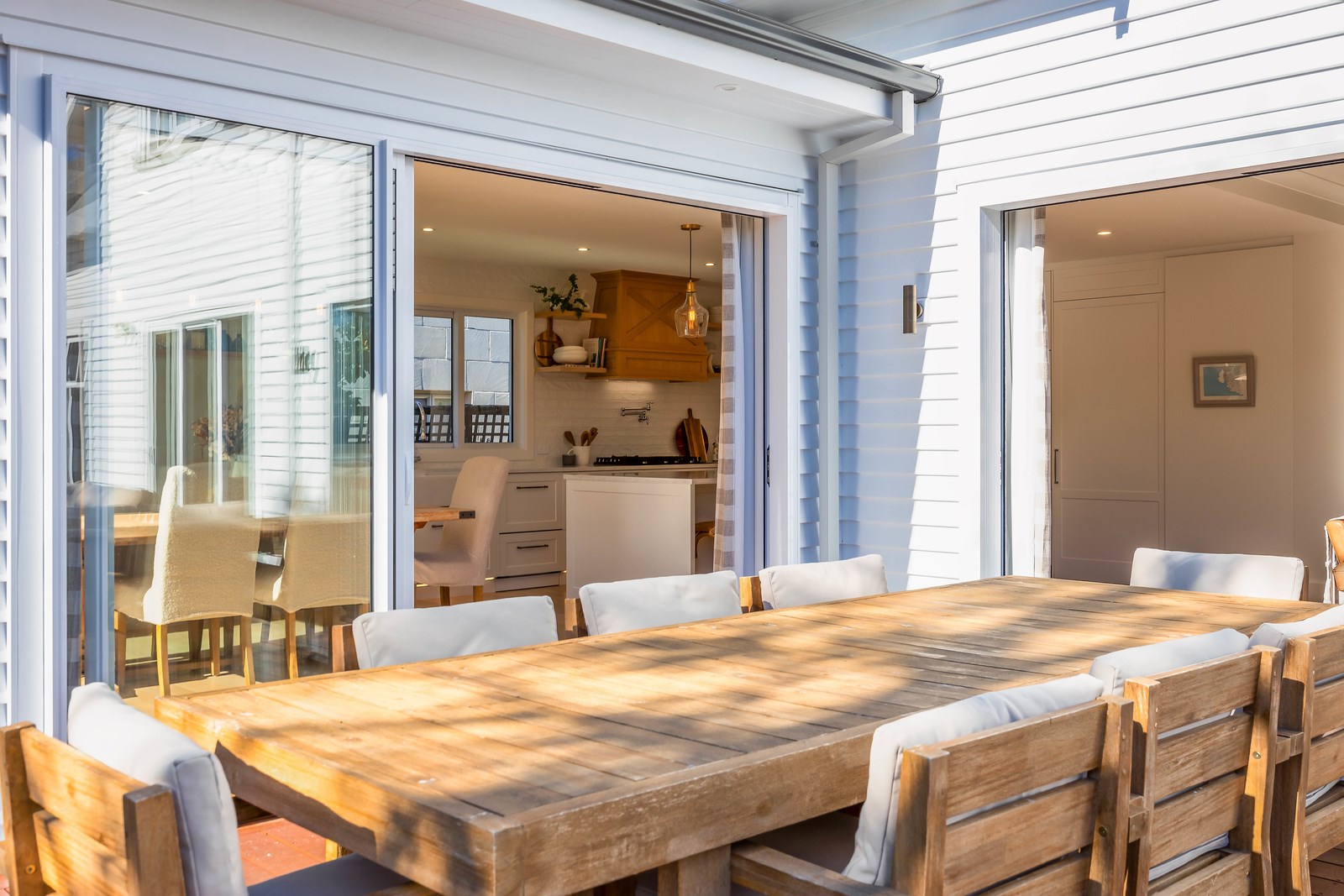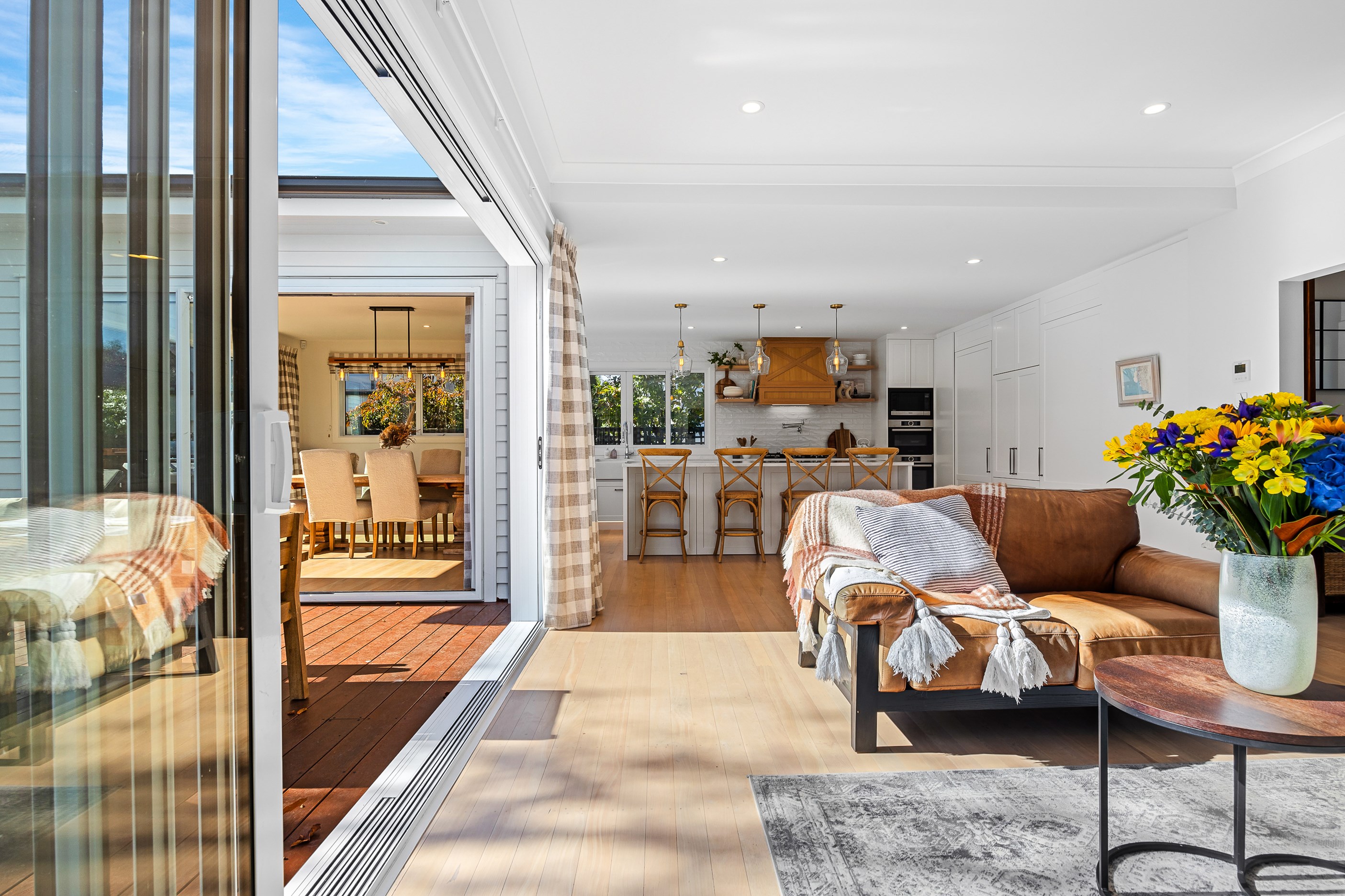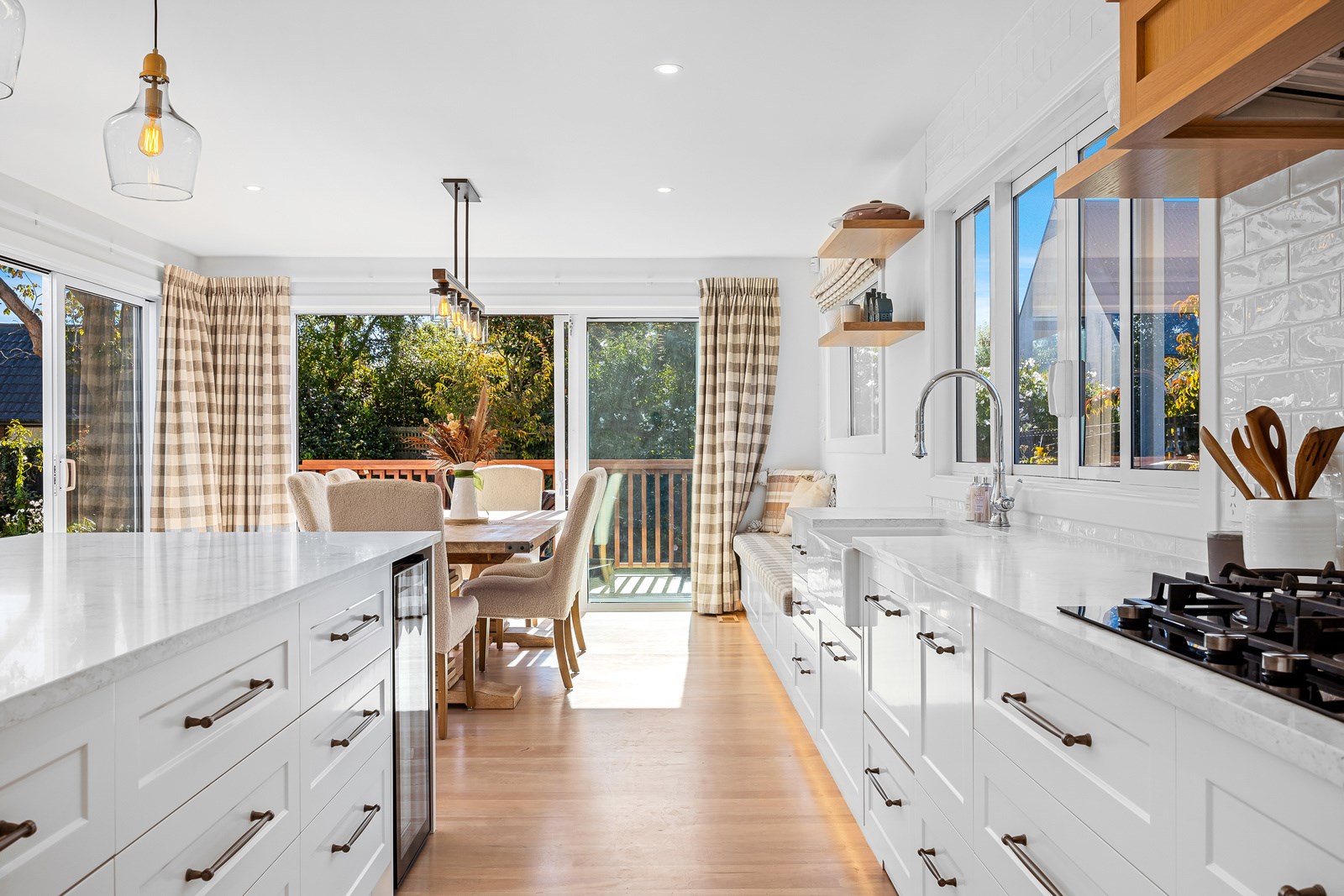 Bespoke joinery throughout the completely redone kitchen, walk-in pantry, laundry and powder room (which is now accessed from the entrance hall rather than the kitchen), has fittingly been designed in heritage style. A new back door was included in the redesign to allow access from the laundry to the garden. Rimu tongue-and-groove flooring throughout blends seamlessly with the existing floorboards while new windows and three large ranch sliders were installed onto an extended and refinished kwila deck. The cherry on top for the owners of this exquisite renovation was the removal of a load-bearing wall that worked to allow the two original garages to become one.