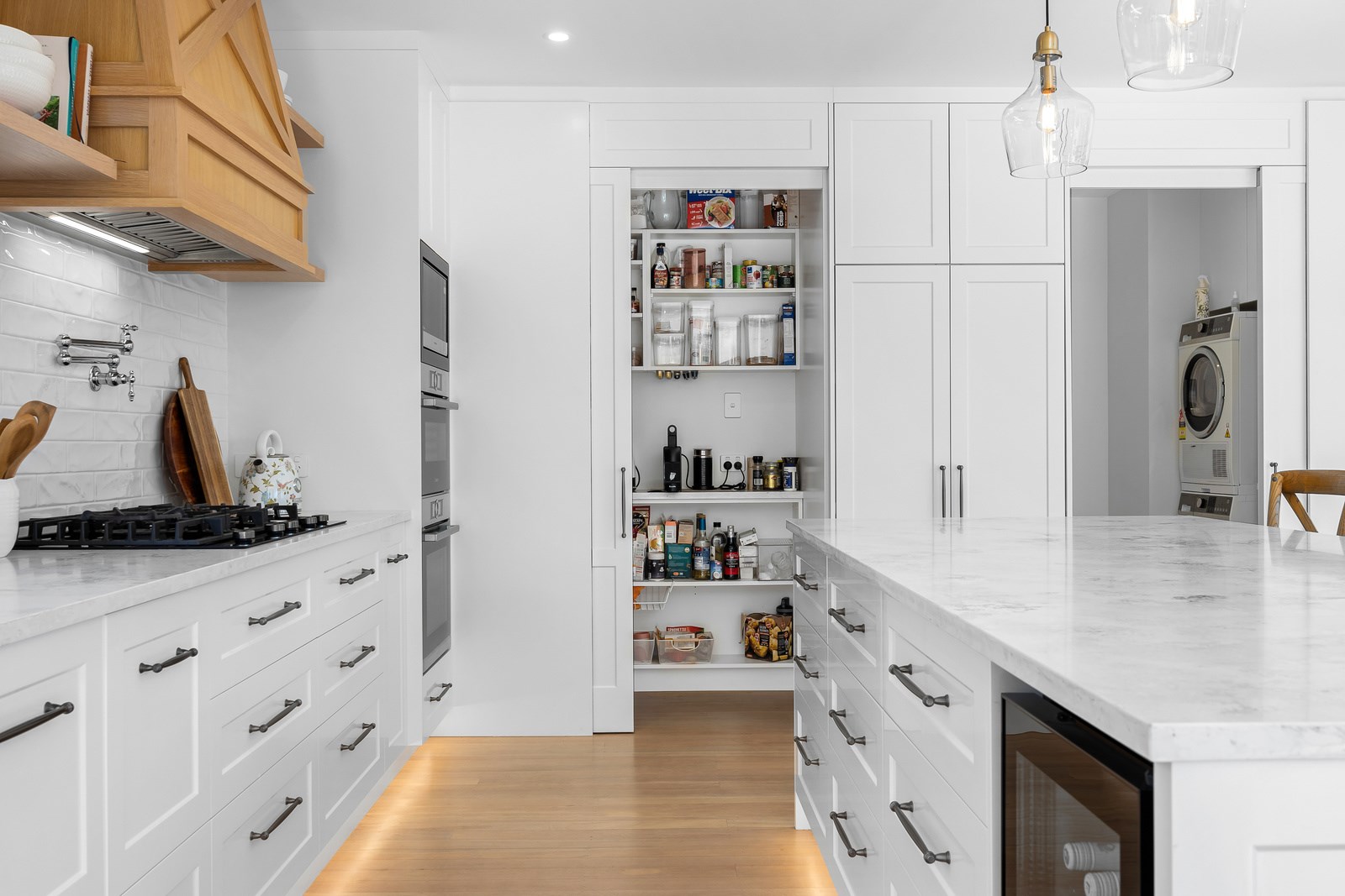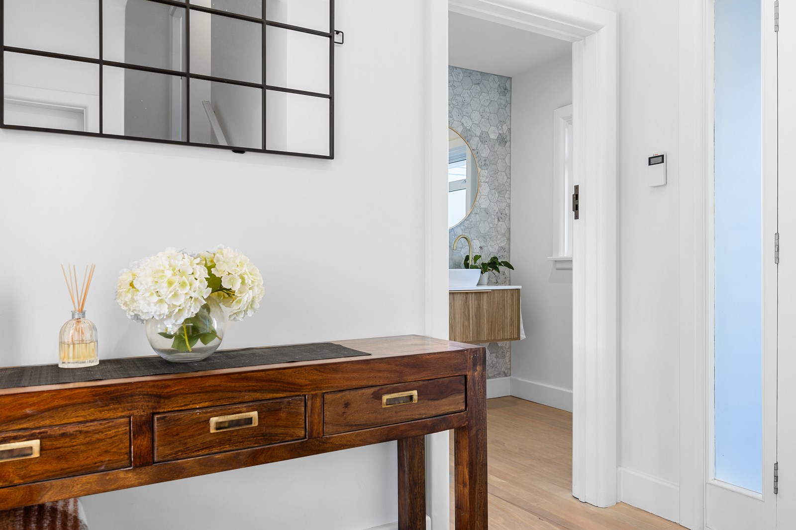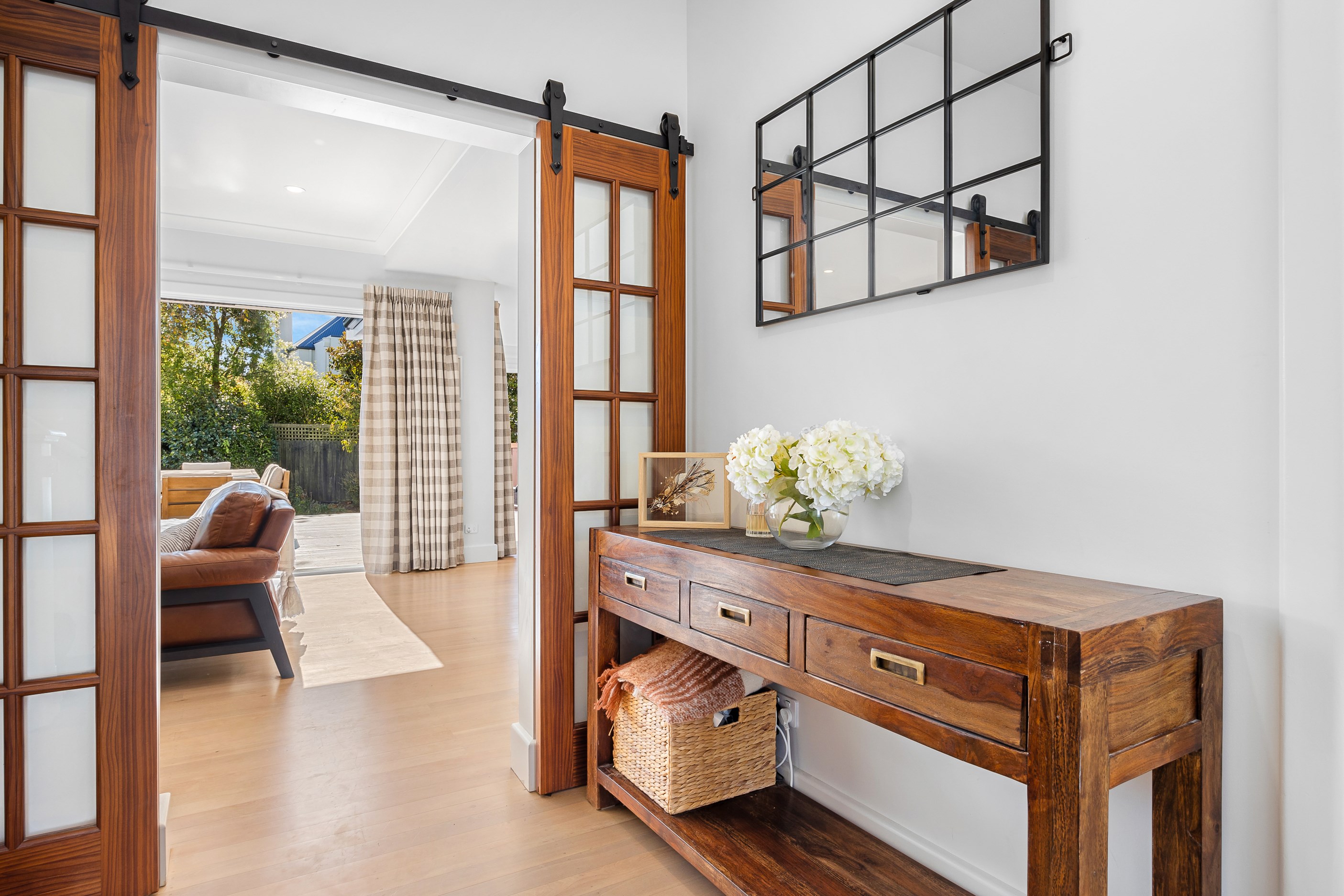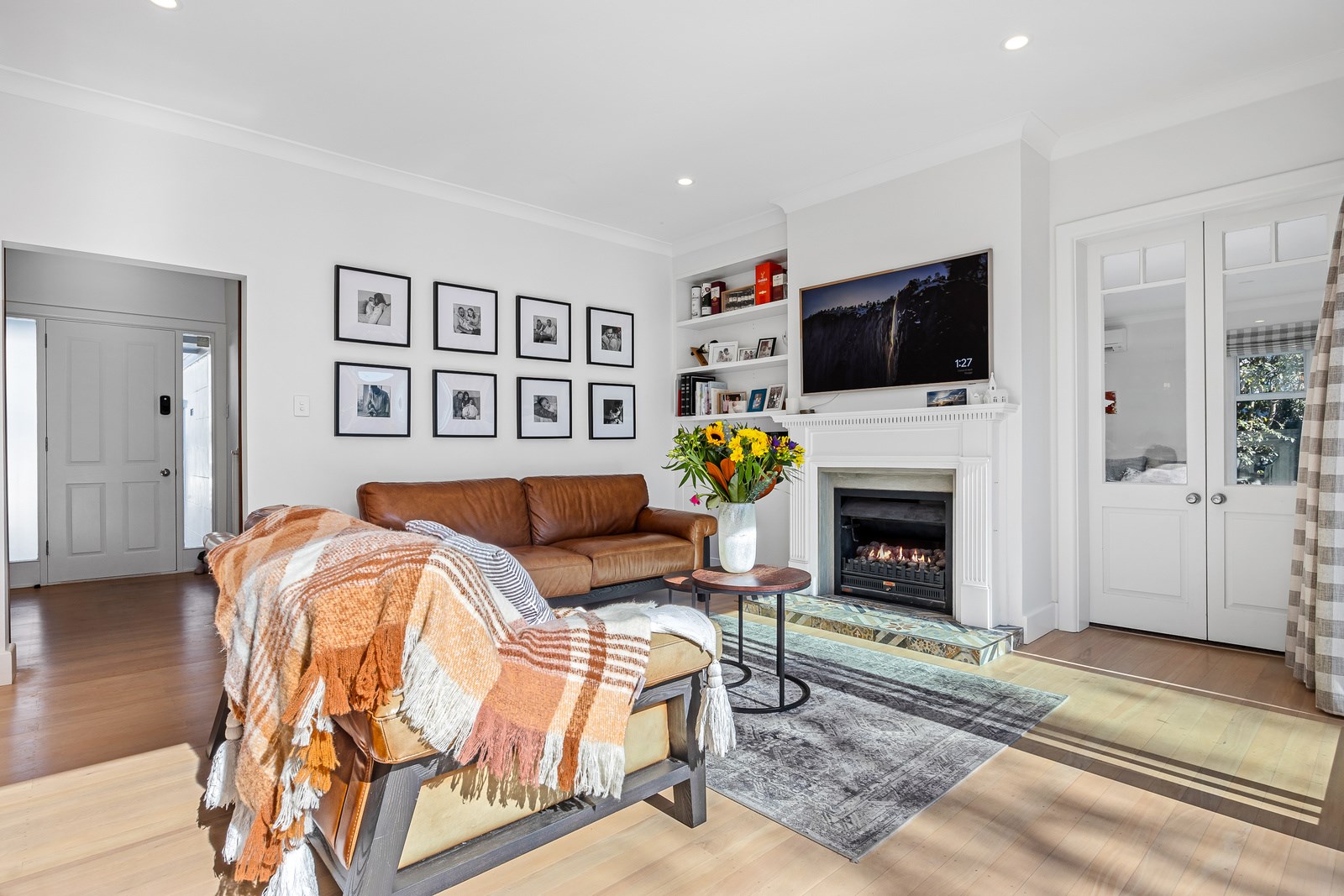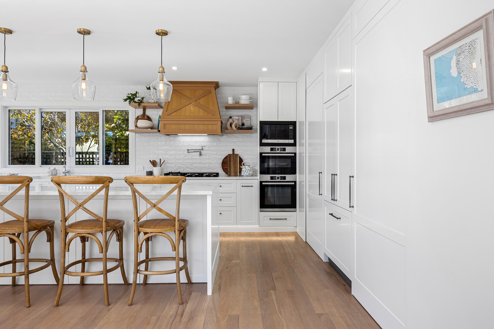 Bespoke joinery throughout the completely redone kitchen, walk-in pantry, laundry and powder room (which is now accessed from the entrance hall rather than the kitchen), has fittingly been designed in heritage style. A new back door was included in the redesign to allow access from the laundry to the garden. Rimu tongue-and-groove flooring throughout blends seamlessly with the existing floorboards while new windows and three large ranch sliders were installed onto an extended and refinished kwila deck. The cherry on top for the owners of this exquisite renovation was the removal of a load-bearing wall that worked to allow the two original garages to become one.