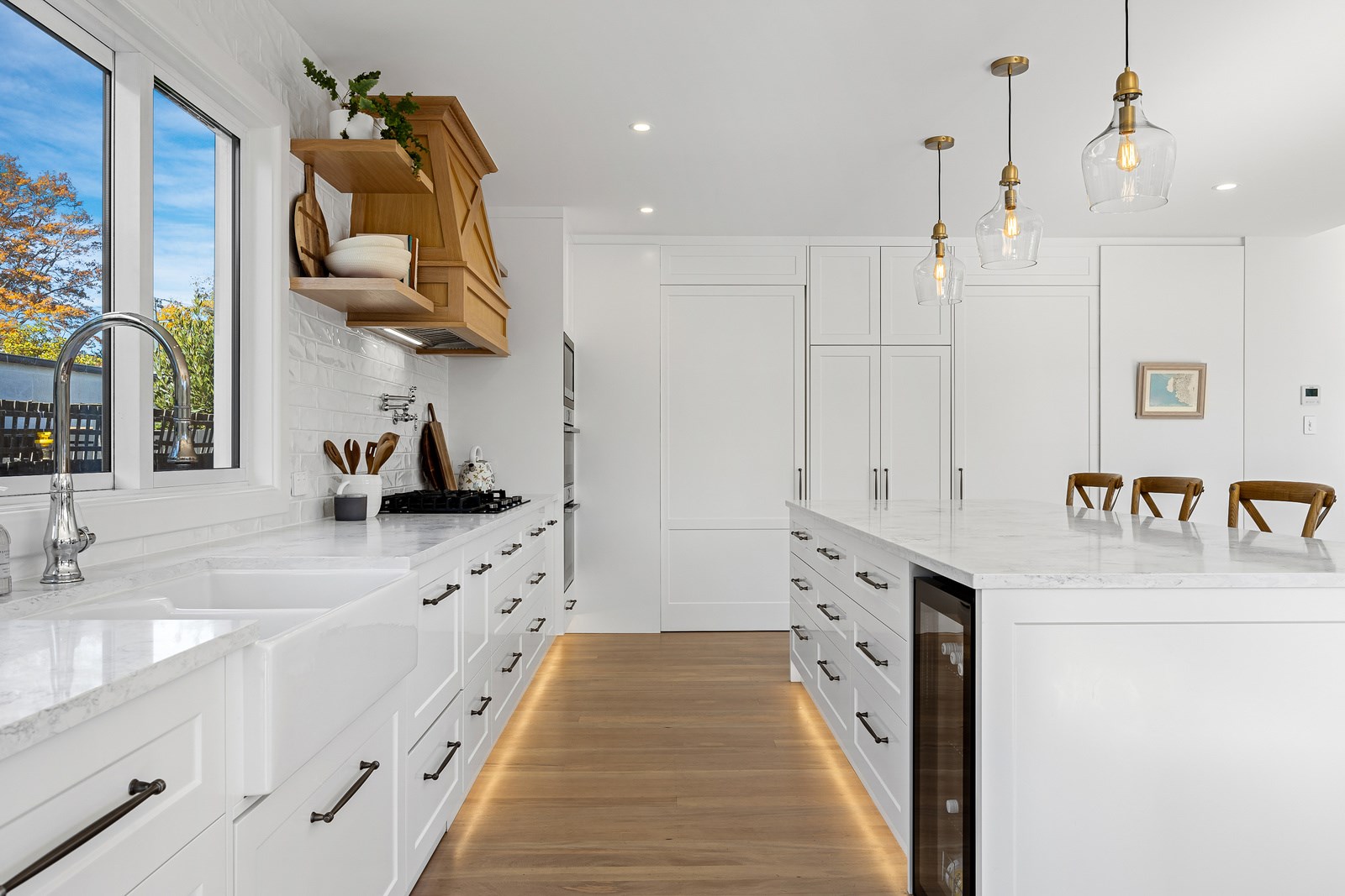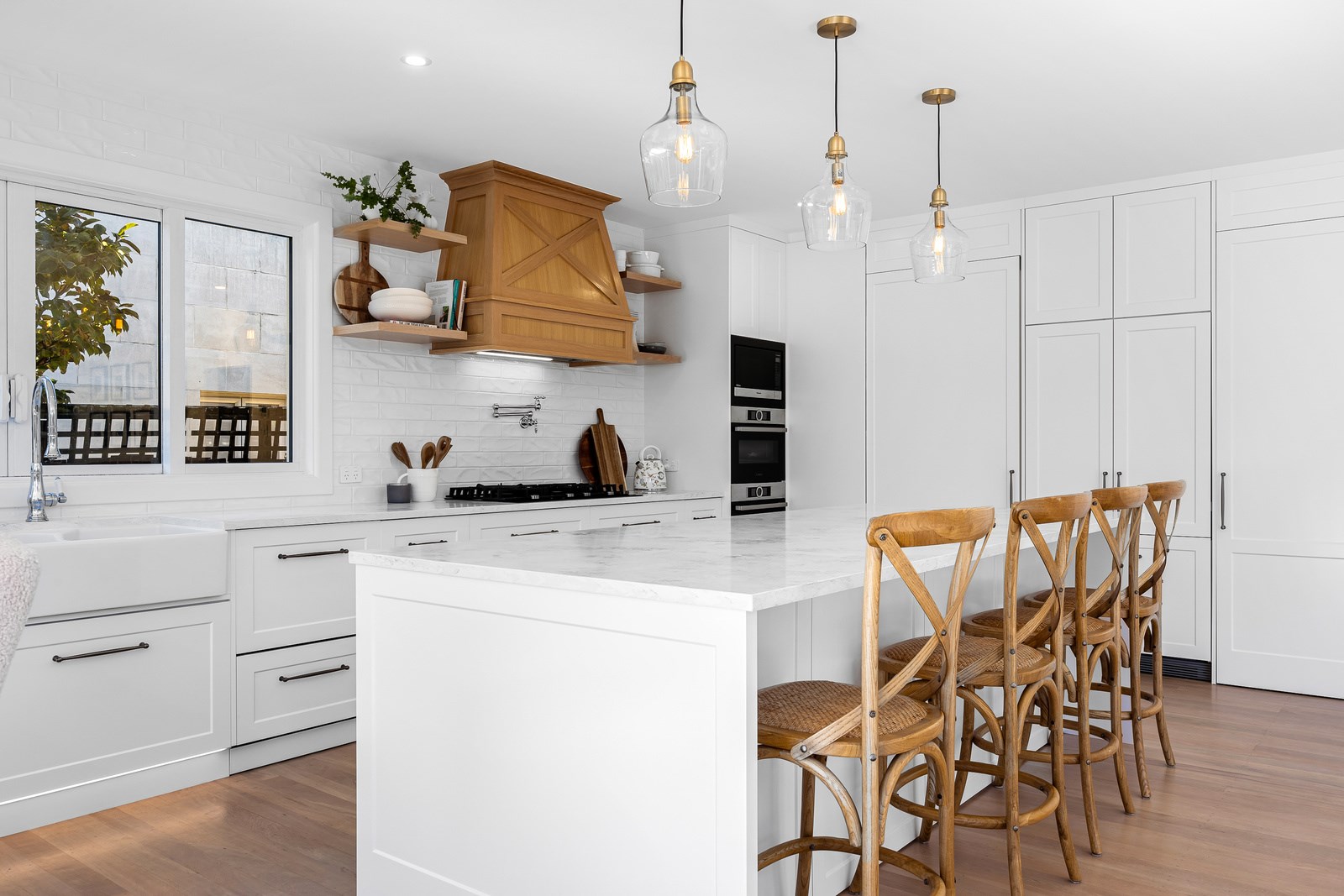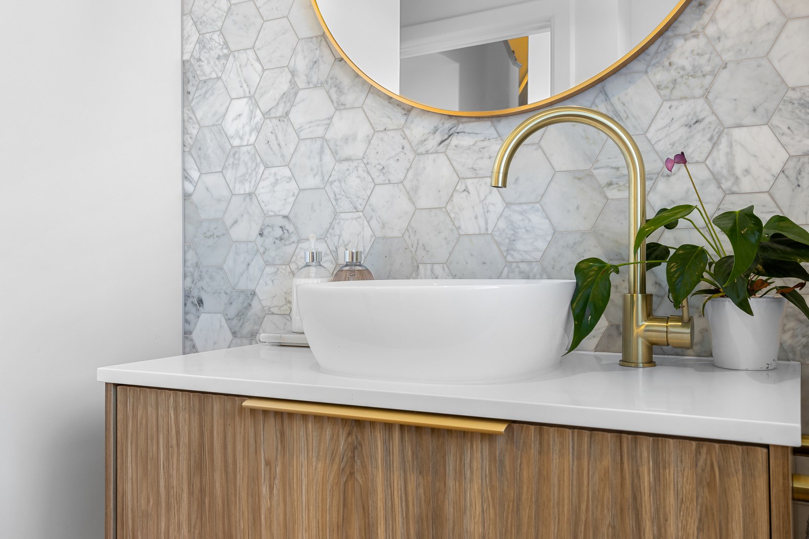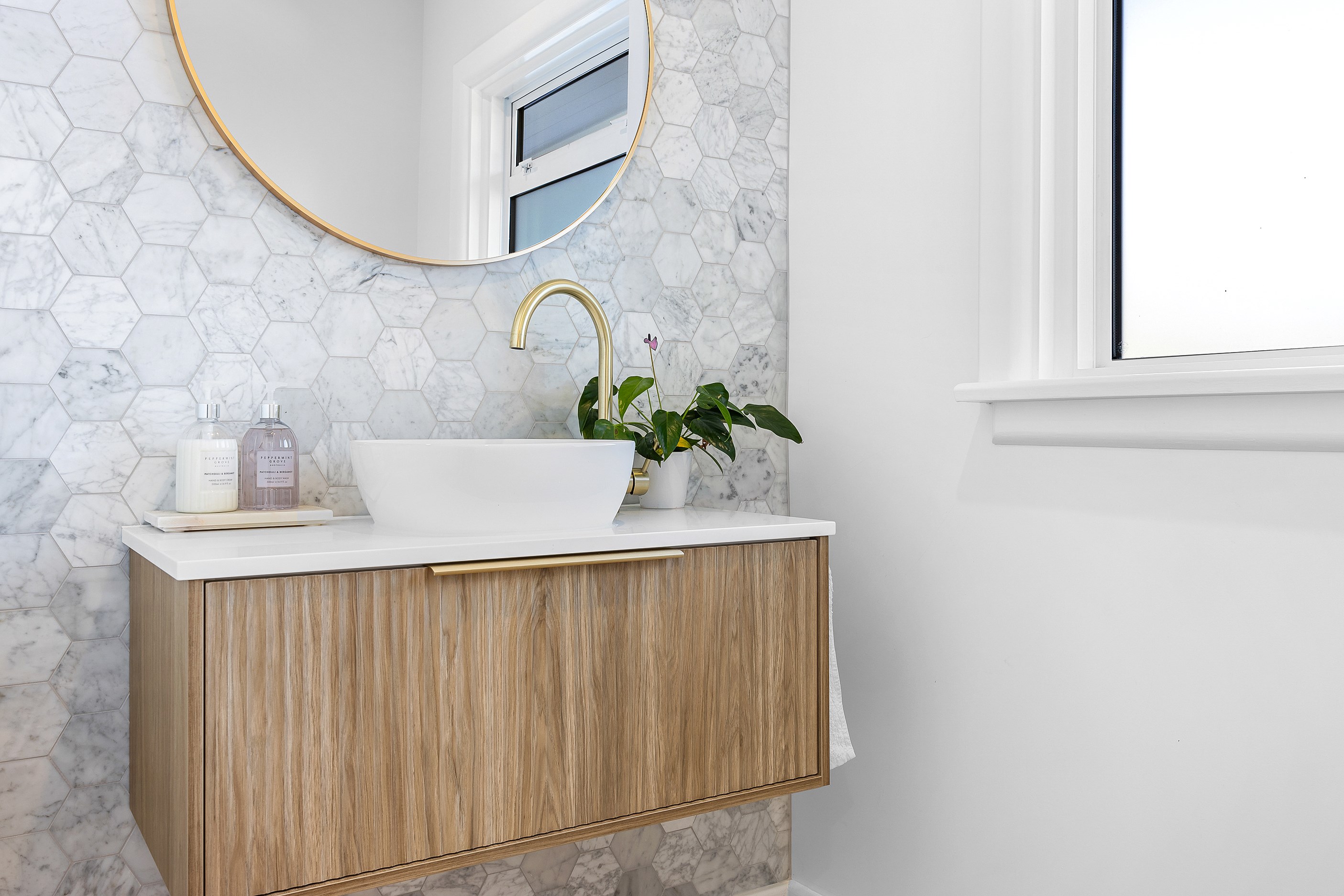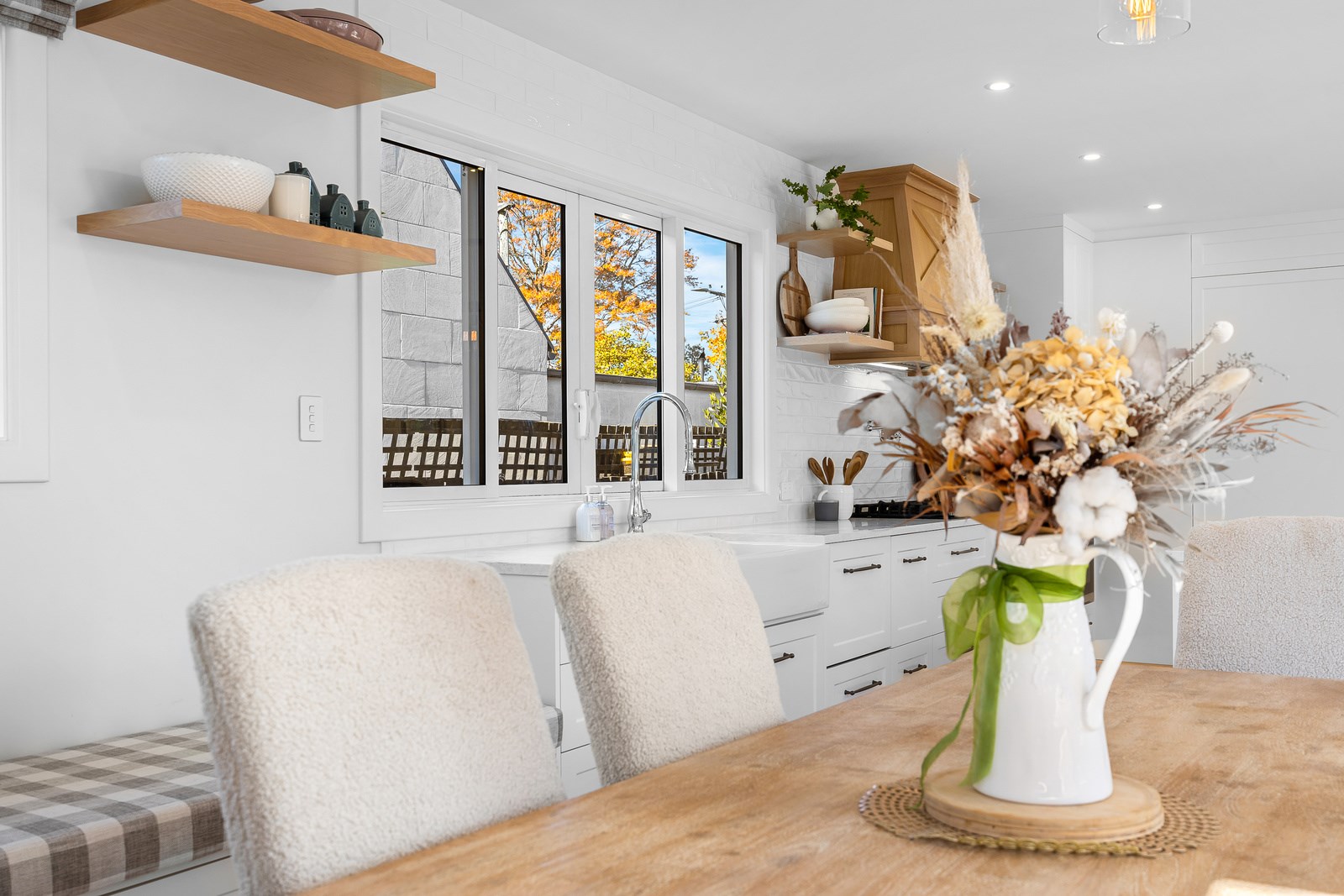 Bespoke joinery throughout the completely redone kitchen, walk-in pantry, laundry and powder room (which is now accessed from the entrance hall rather than the kitchen), has fittingly been designed in heritage style. A new back door was included in the redesign to allow access from the laundry to the garden. Rimu tongue-and-groove flooring throughout blends seamlessly with the existing floorboards while new windows and three large ranch sliders were installed onto an extended and refinished kwila deck. The cherry on top for the owners of this exquisite renovation was the removal of a load-bearing wall that worked to allow the two original garages to become one.
