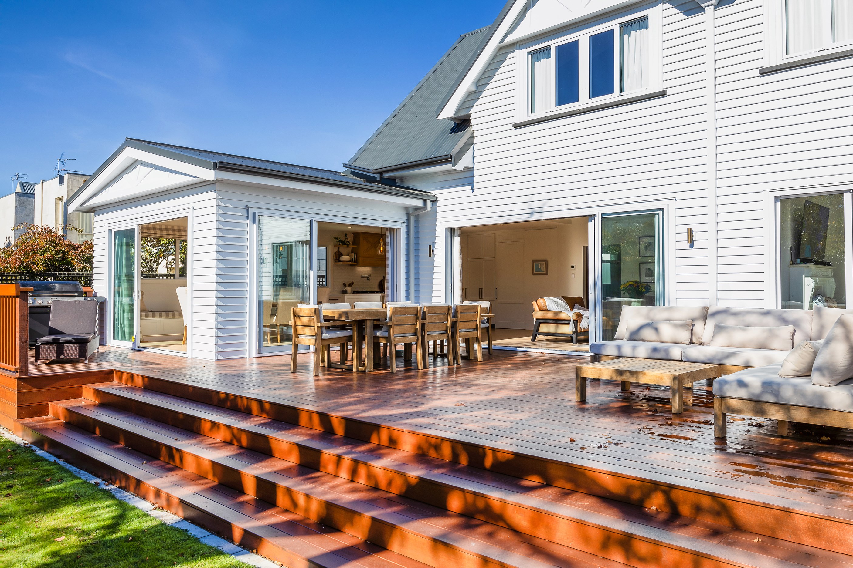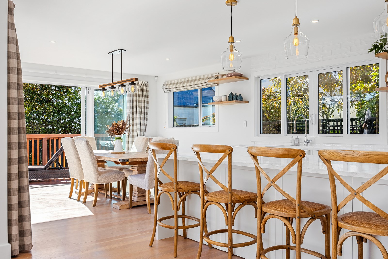 An extension of 26.93sqm doesn’t sound like much, but that small strip to the side of a character Christchurch residence makes acres of difference to life here. The removal of an existing deck and the incorporation of new foundations and steel beams have allowed what was a fairly standard U-shaped kitchen and compact dining area to become a lavish space with kitchen joinery running around two walls down to a window seat next to the dining table. A large island bench provides another spot to sit and divides kitchen from living with plenty of breathing space between each zone.