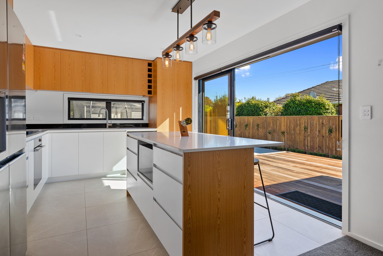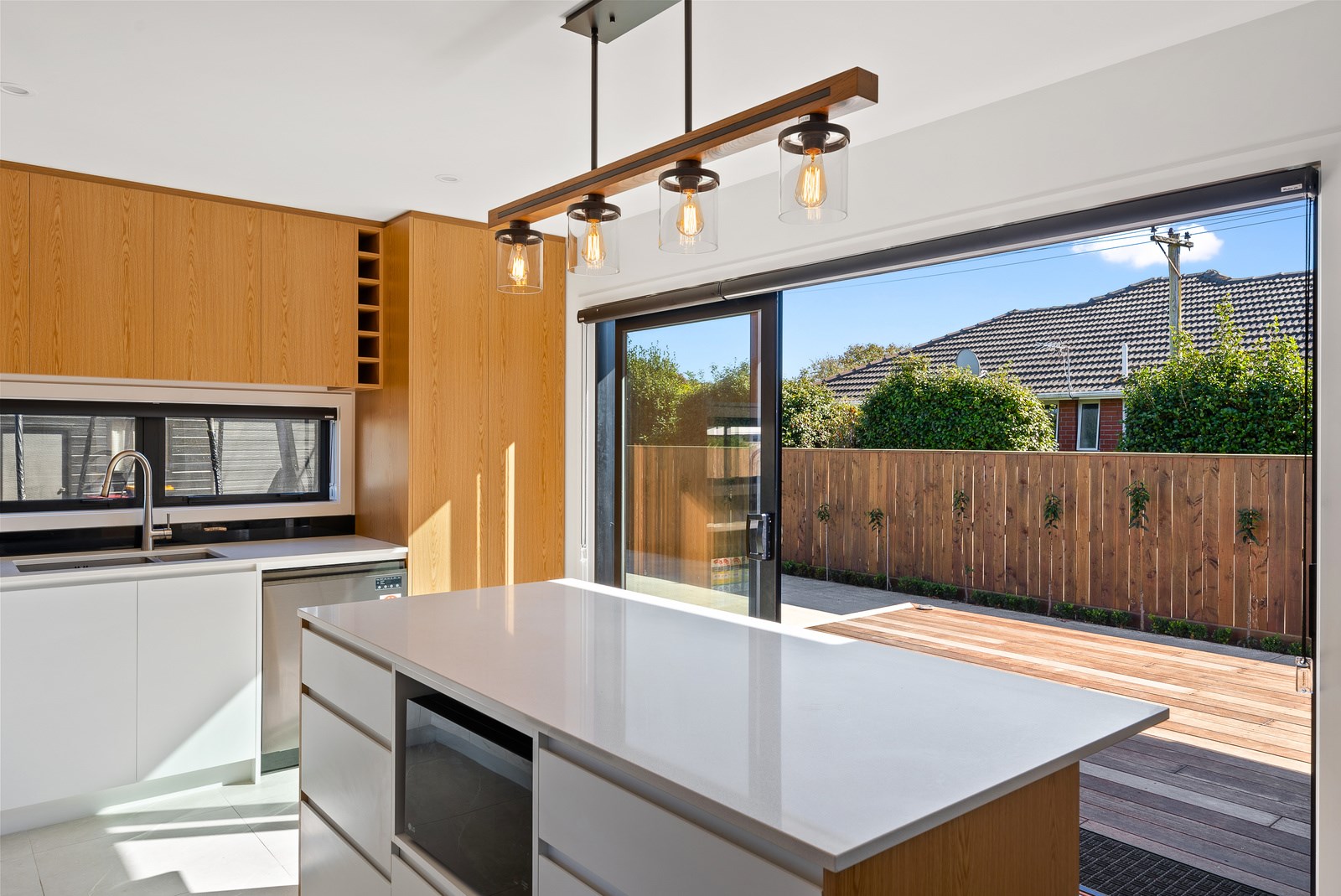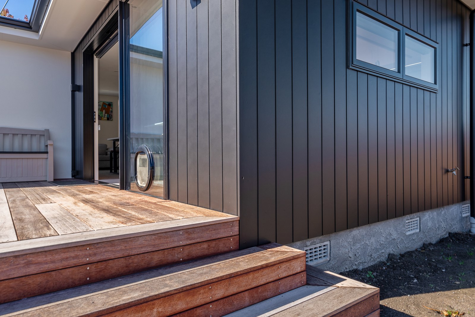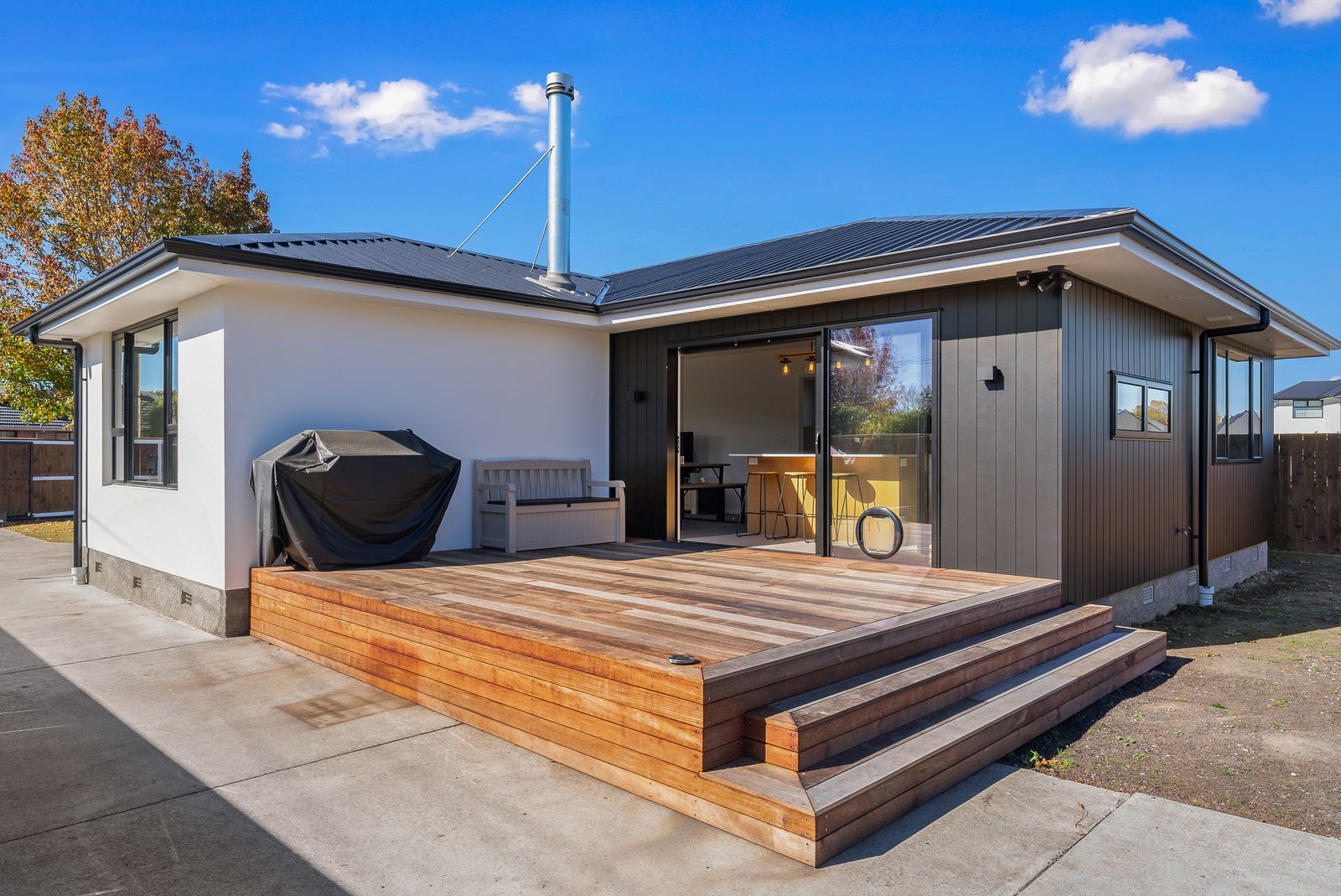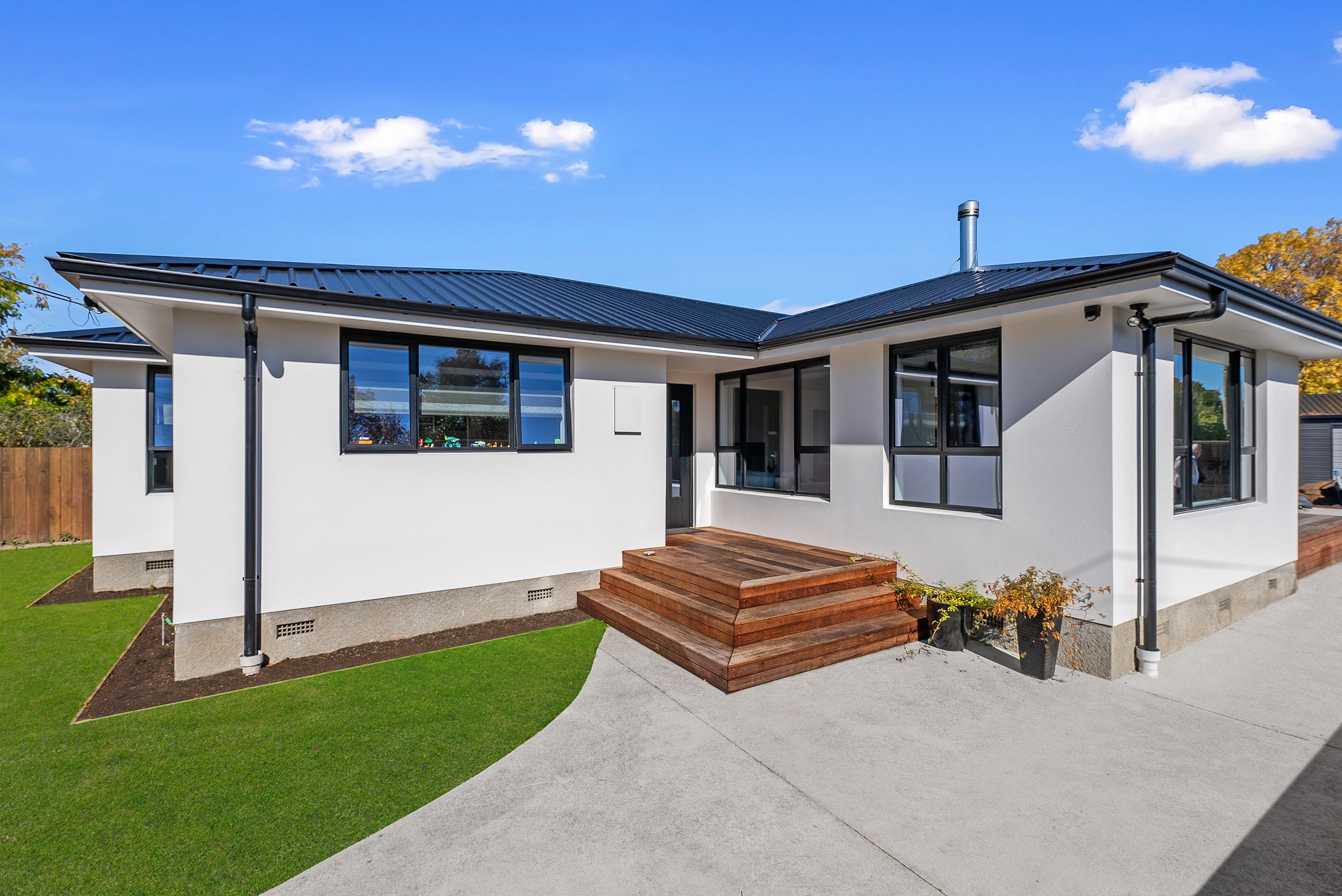 The clean lines of the kitchen joinery, bathroom fixtures and lighting create a bright, welcoming interior while on the exterior, a new dark colour scheme encompassing the roof, windows and cladding is an attractive contrast to the lighter exterior plastering and timber deck. With a large stacker slider from the open-plan kitchen/living providing connection to the north-west facing deck, and then to the garden, the house is now perfect for entertaining. We know the owners are going to enjoy it for years to come.