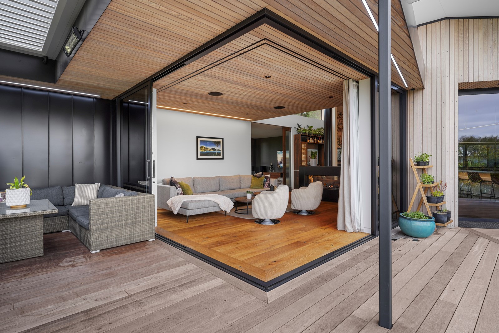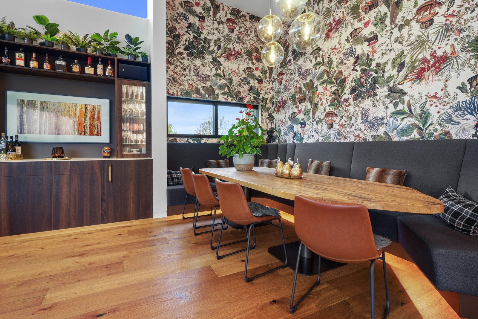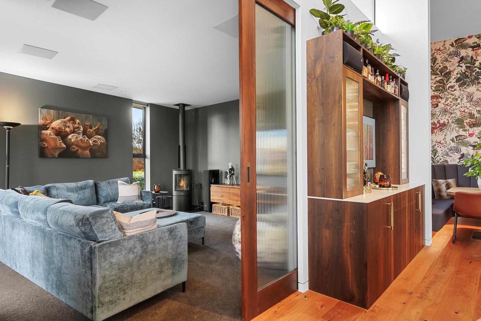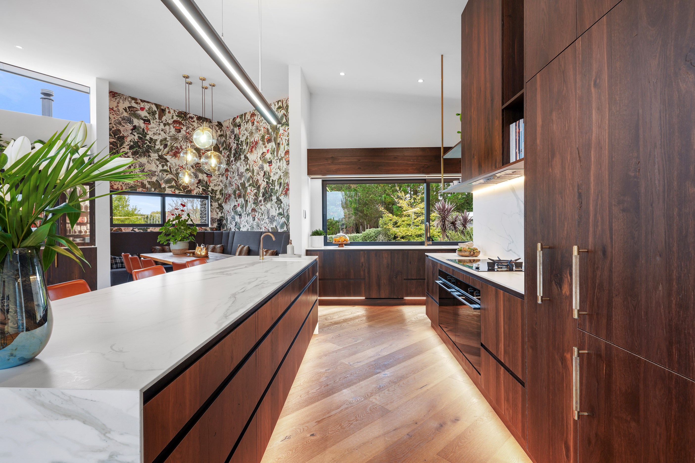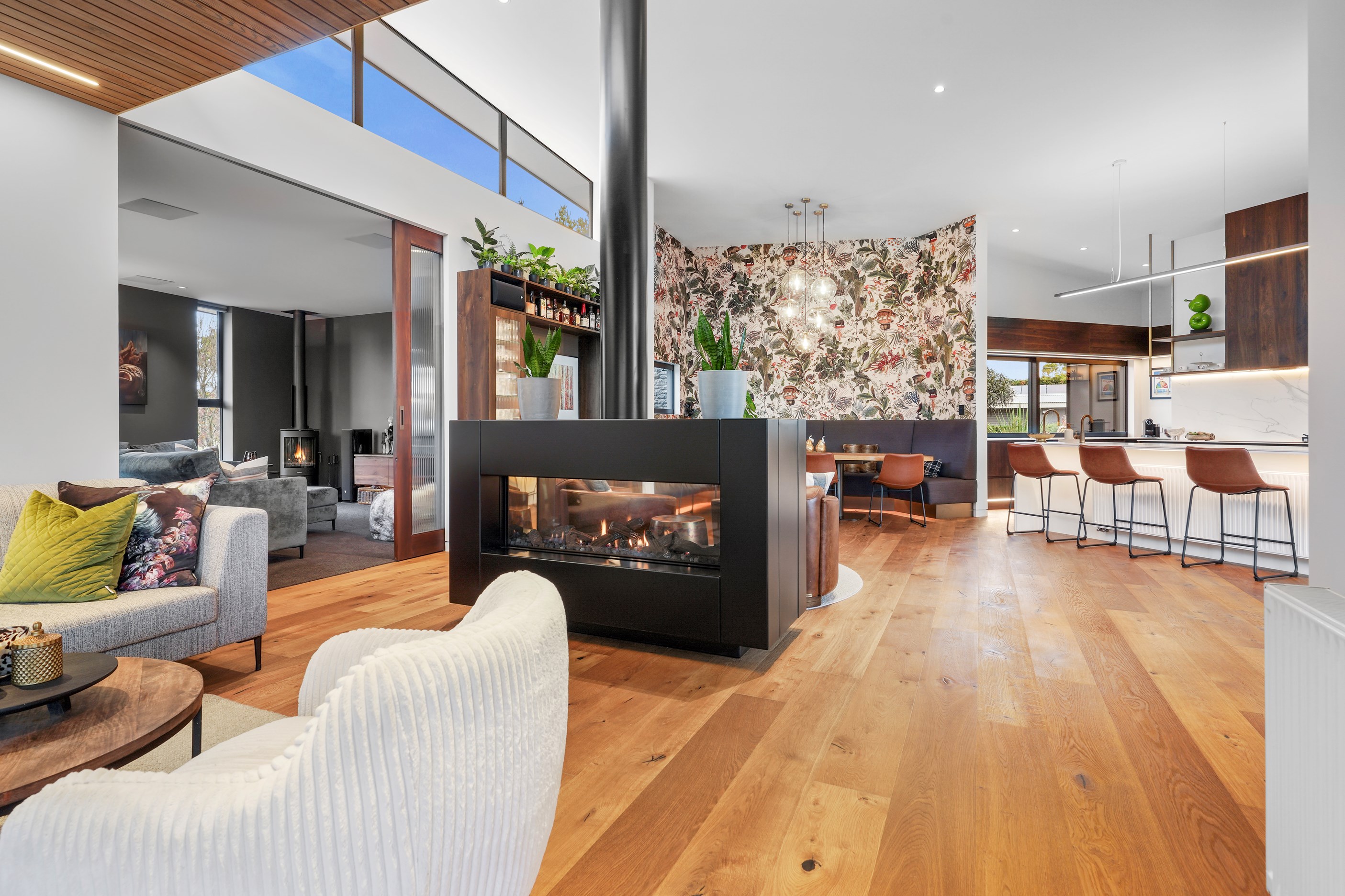 In summer, the glazing, cantilevered roof and eaves furnish shade, along with a louvred roof over an outdoor entertaining space. Solar panels provide energy and the security system can be controlled through a smartphone. Bespoke joinery, negative skirting details, high raking ceilings and timber cabinetry are show- stoppers, as are imported wallpapers. The large built-in dining booth creates a warm and relaxed café vibe. Four spacious decks flow from the pods, including a divine sheltered space accessed when living-room corner sliders are flung open.