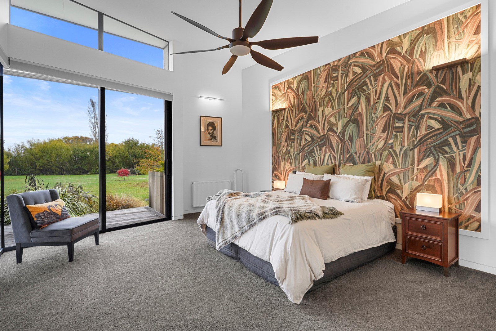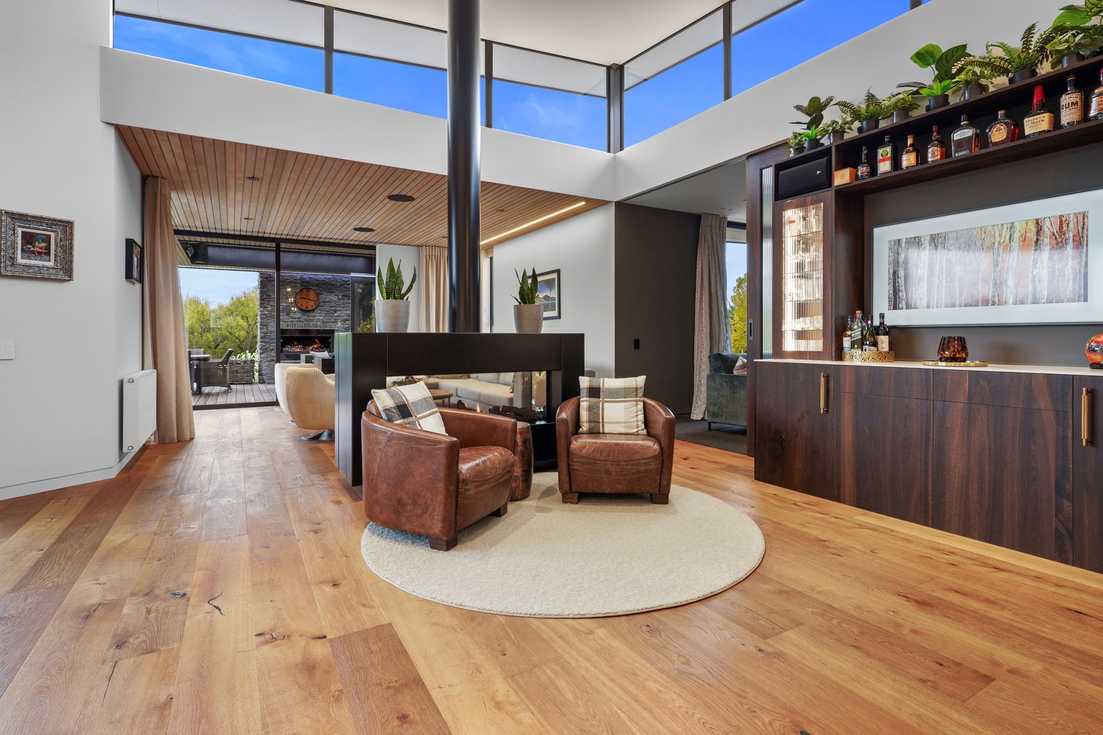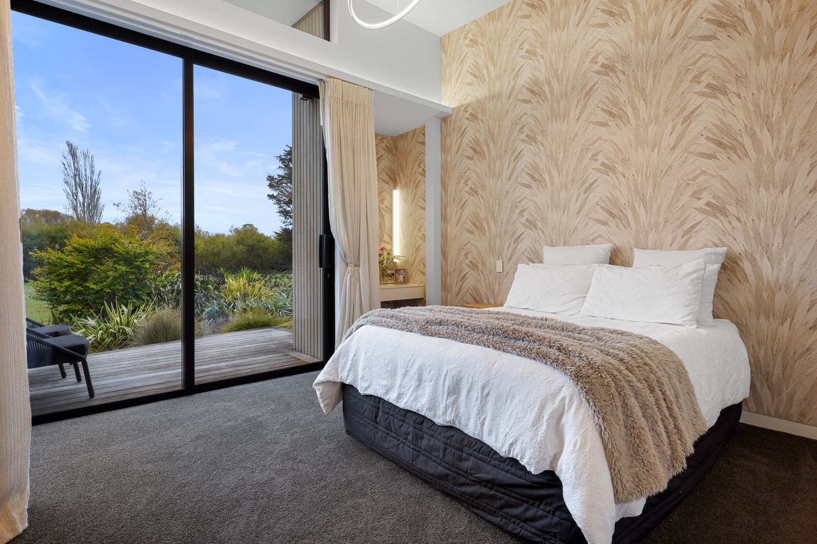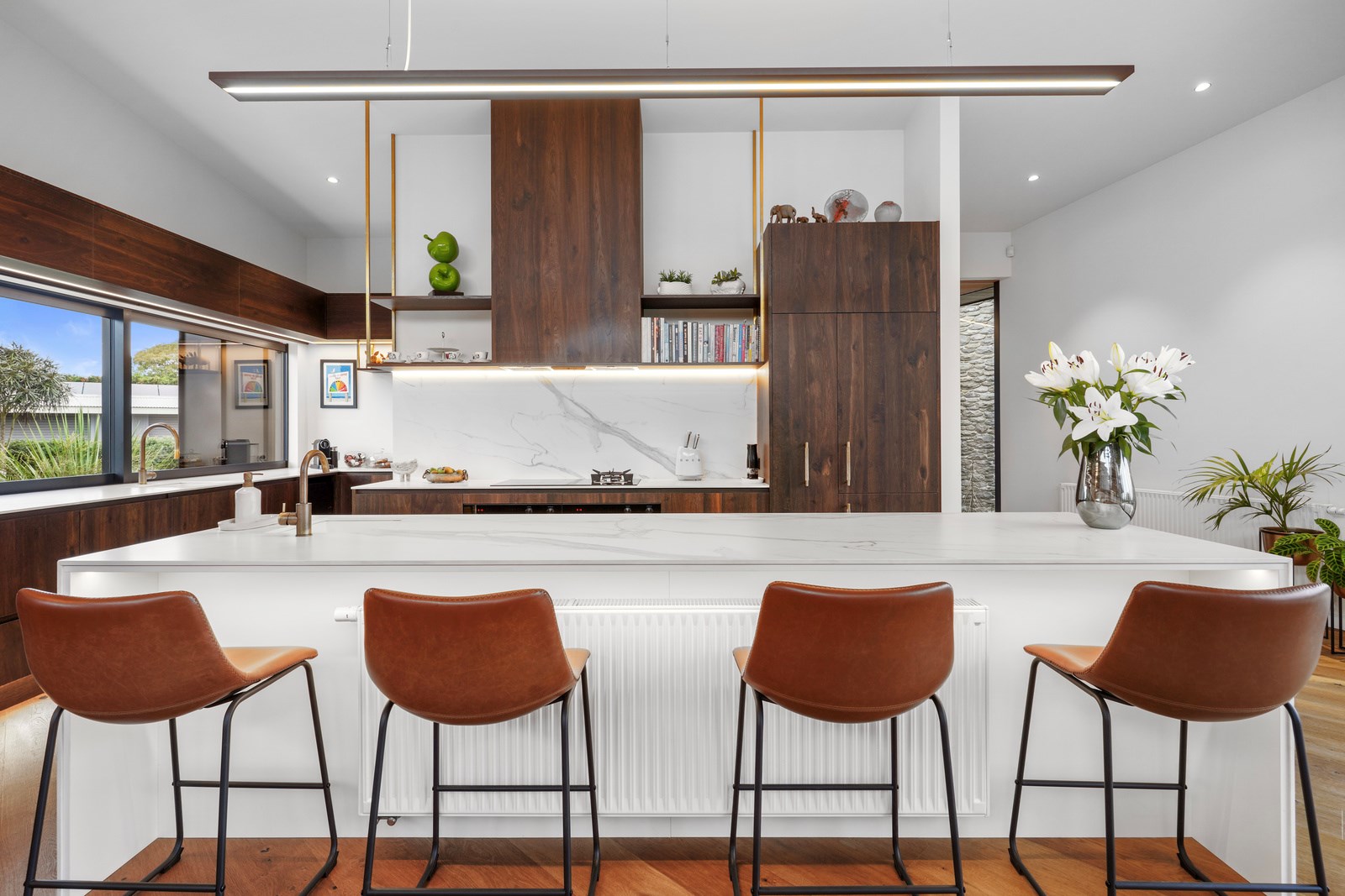 In summer, the glazing, cantilevered roof and eaves furnish shade, along with a louvred roof over an outdoor entertaining space. Solar panels provide energy and the security system can be controlled through a smartphone. Bespoke joinery, negative skirting details, high raking ceilings and timber cabinetry are show- stoppers, as are imported wallpapers. The large built-in dining booth creates a warm and relaxed café vibe. Four spacious decks flow from the pods, including a divine sheltered space accessed when living-room corner sliders are flung open.