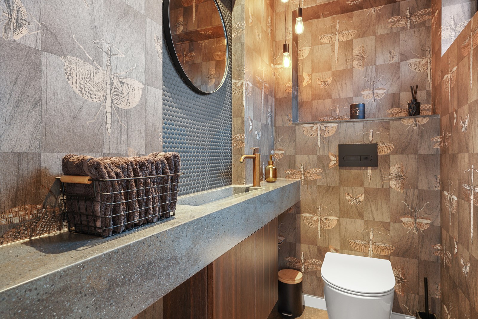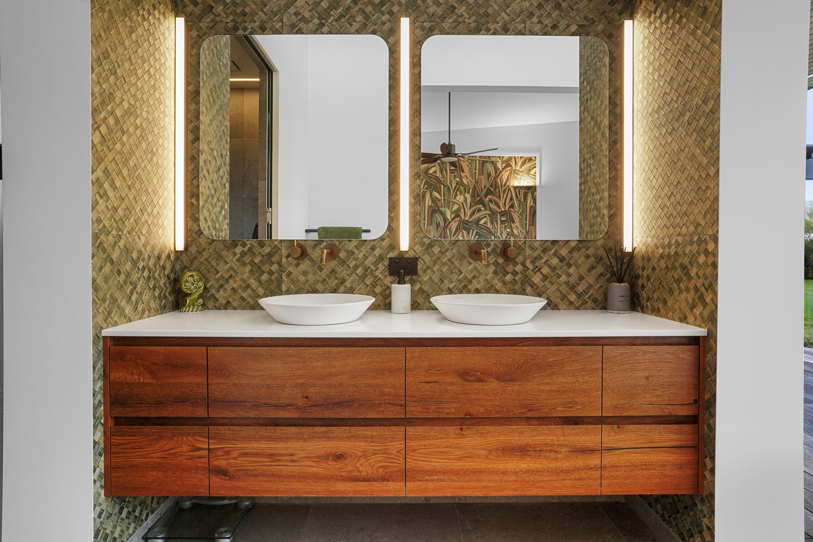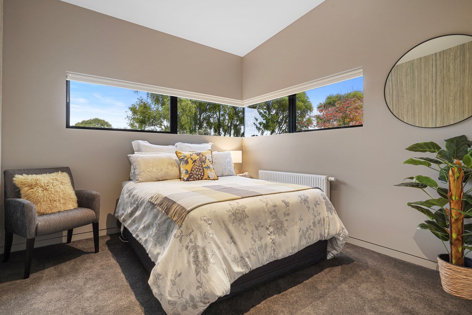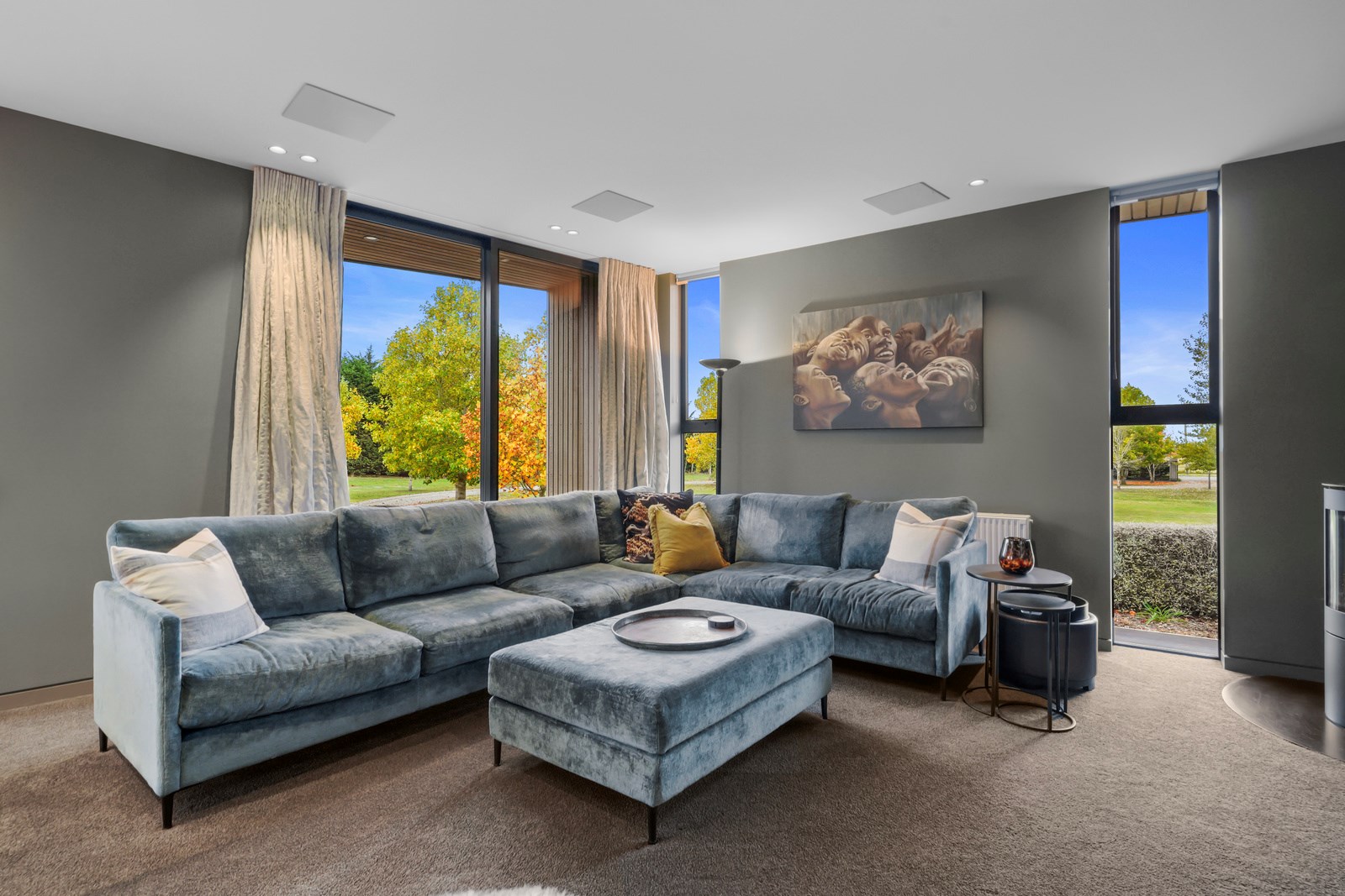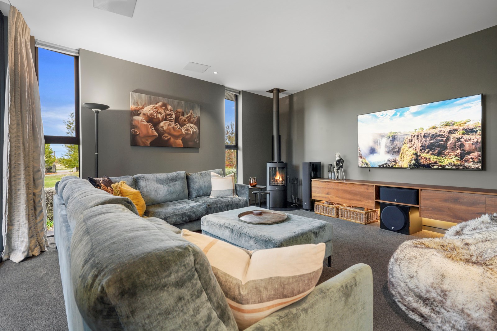 In summer, the glazing, cantilevered roof and eaves furnish shade, along with a louvred roof over an outdoor entertaining space. Solar panels provide energy and the security system can be controlled through a smartphone. Bespoke joinery, negative skirting details, high raking ceilings and timber cabinetry are show- stoppers, as are imported wallpapers. The large built-in dining booth creates a warm and relaxed café vibe. Four spacious decks flow from the pods, including a divine sheltered space accessed when living-room corner sliders are flung open.