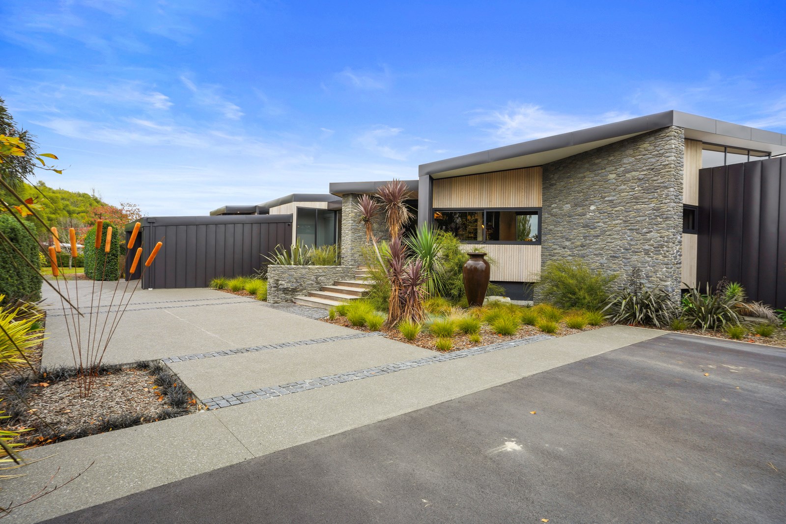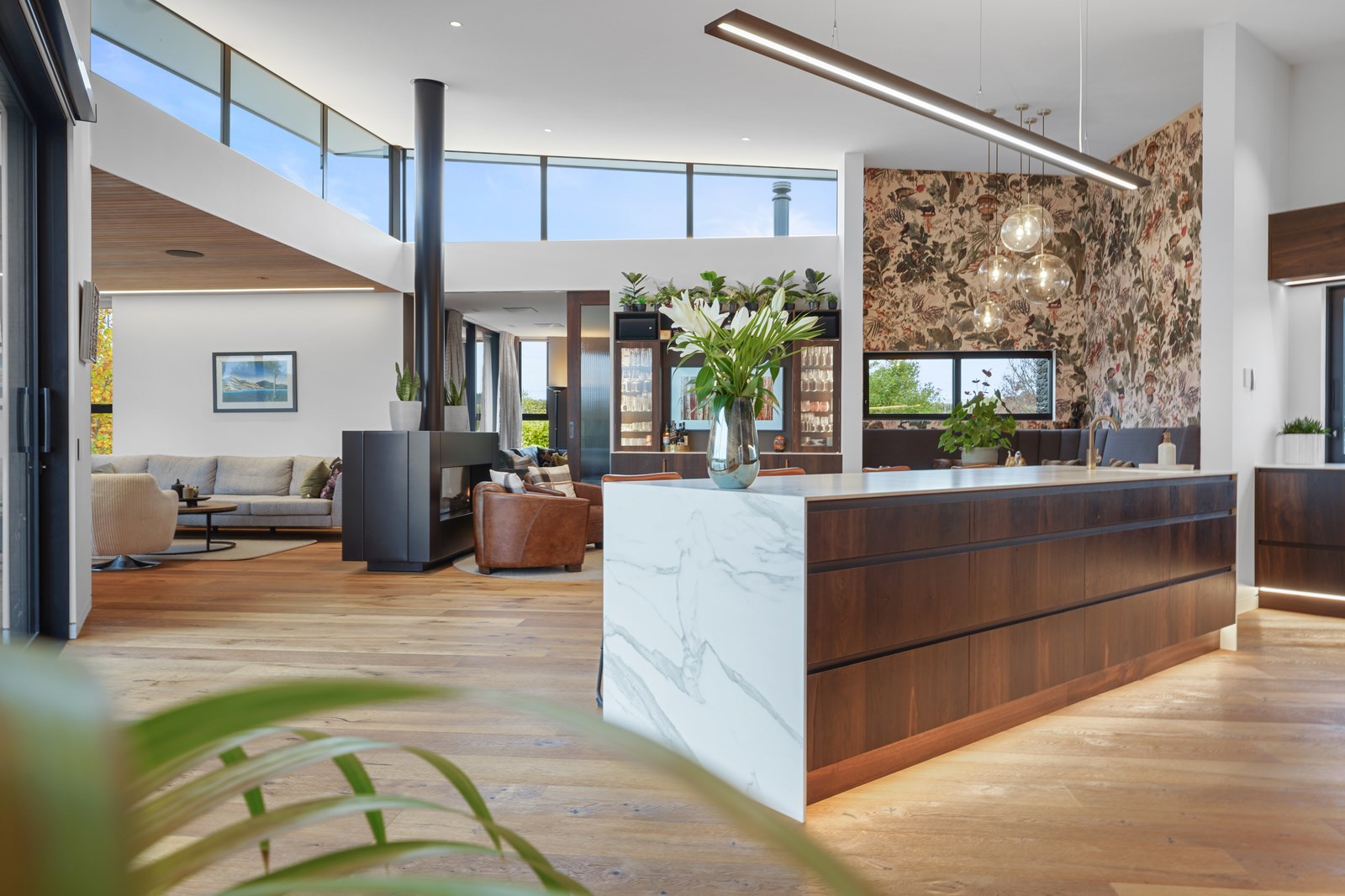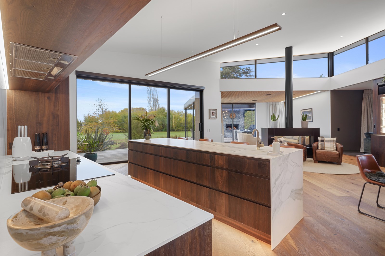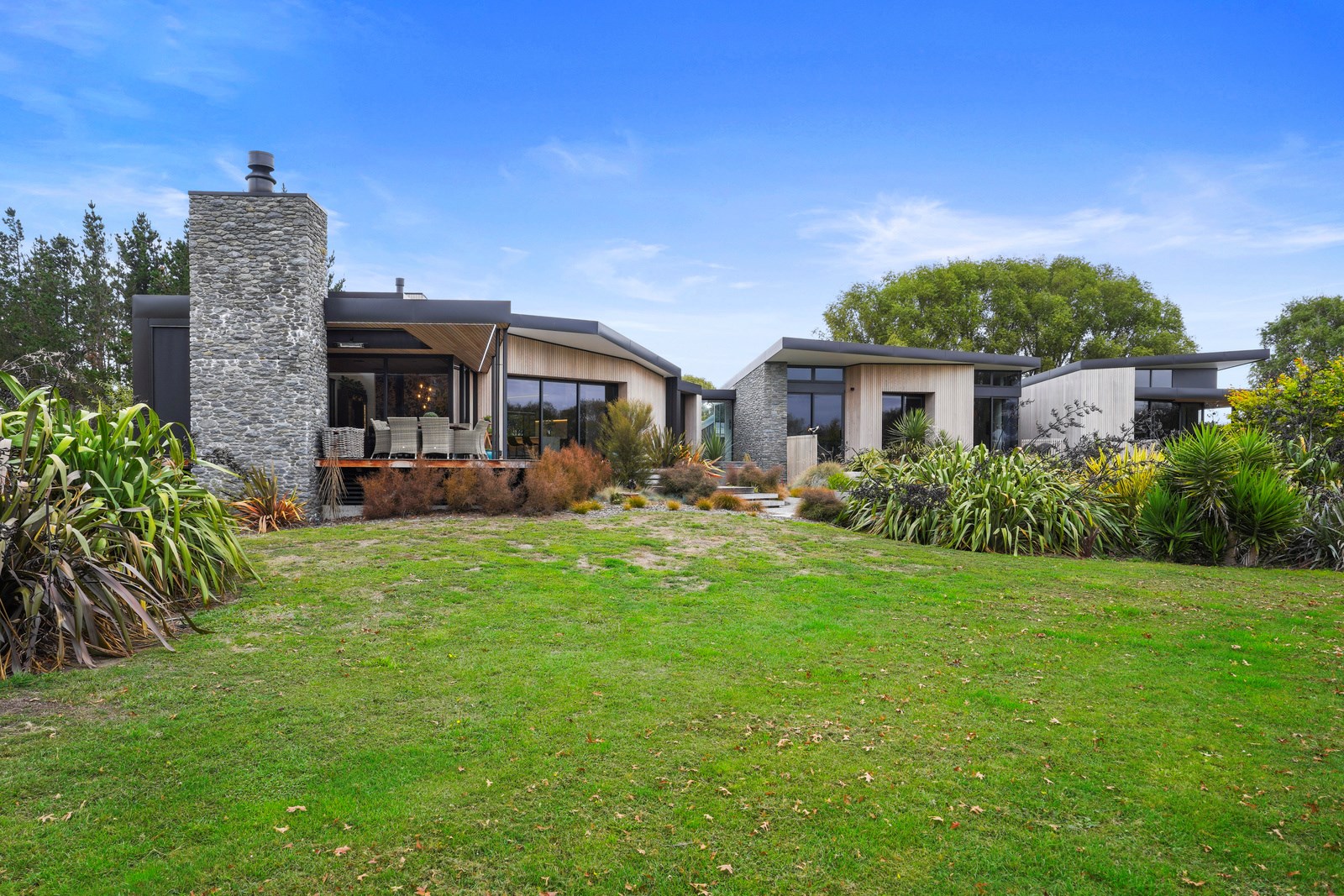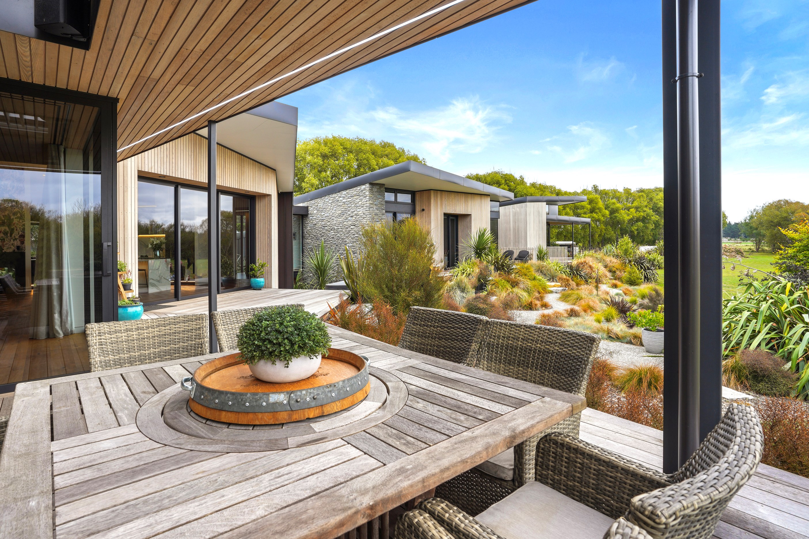 This builder’s home stretching attractively along the Canterbury landscape belies the complexity and challenges involved in constructing it. In order to craft the modern 342sqm family home, strict environmental rules governing the sensitive coast and riverside site had to be adhered to. Mission accomplished – and the impressive trio of pods connected by floating glazed bridges is the result. It’s stunning, and the local stone, coloured steel and timber cladding settle the house into the land, the site of a house lost in the 2010 earthquakes. The four-bedroom property was raised to meet a council requirement, but it also provides an elevated outlook. Additionally, it takes advantage of the northern sun. Full-height, thermally glazed joinery provides natural warmth, while central heating, a log burner and a gas fire boost the temperature in winter.