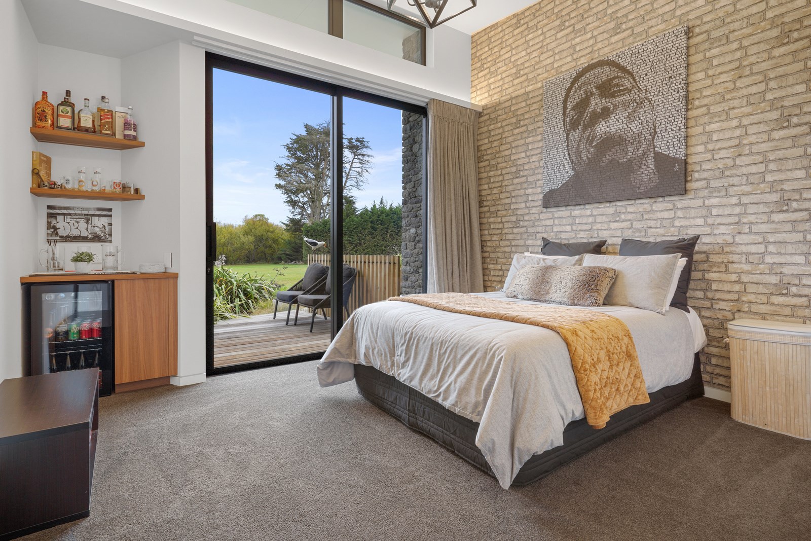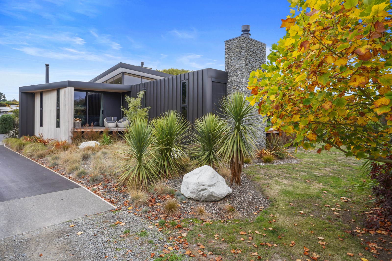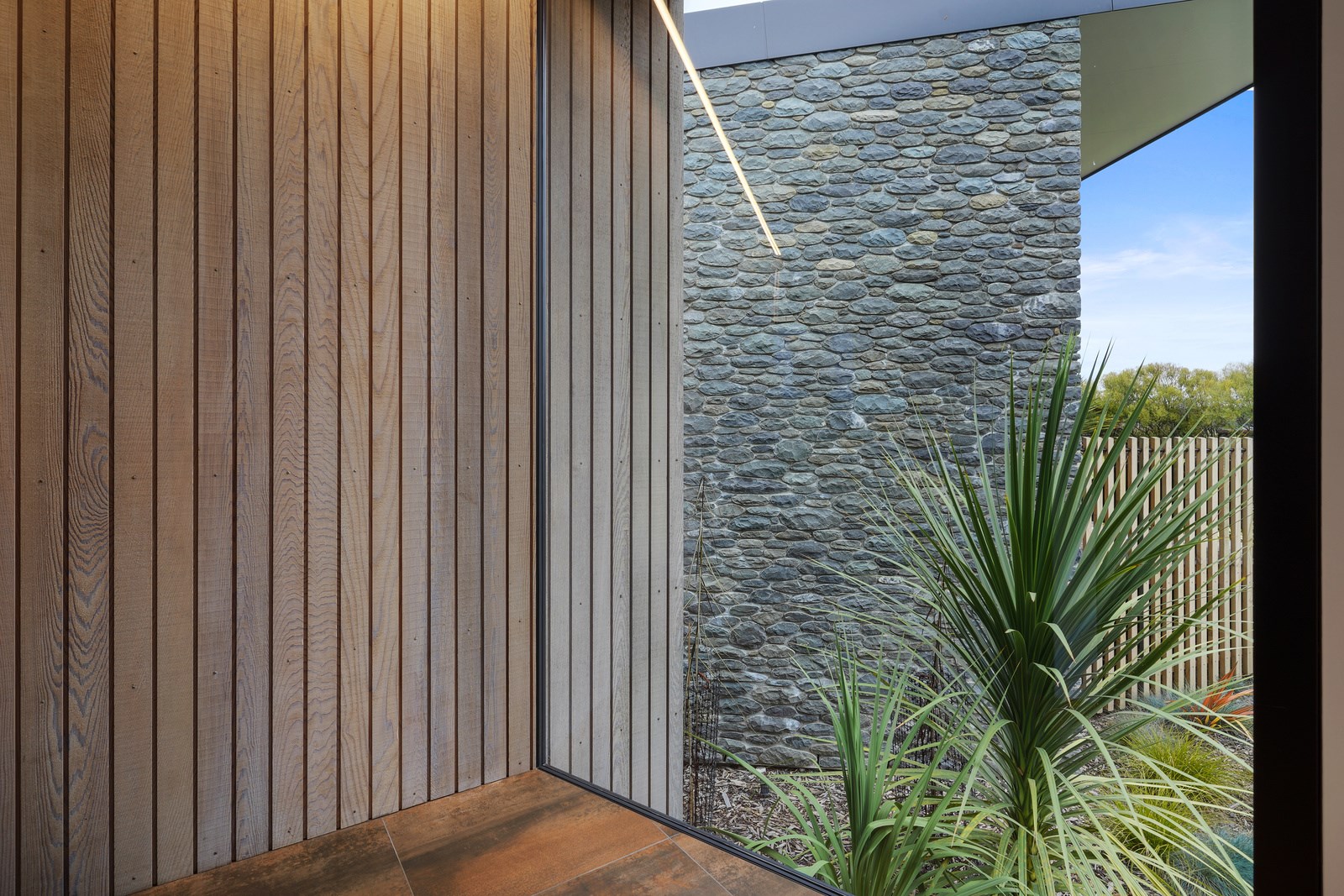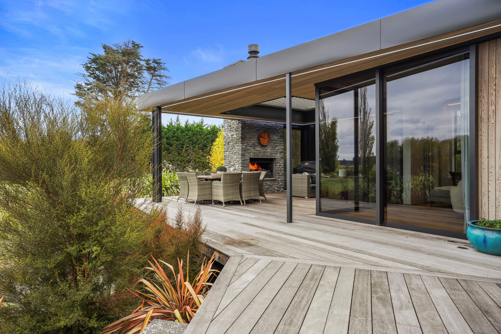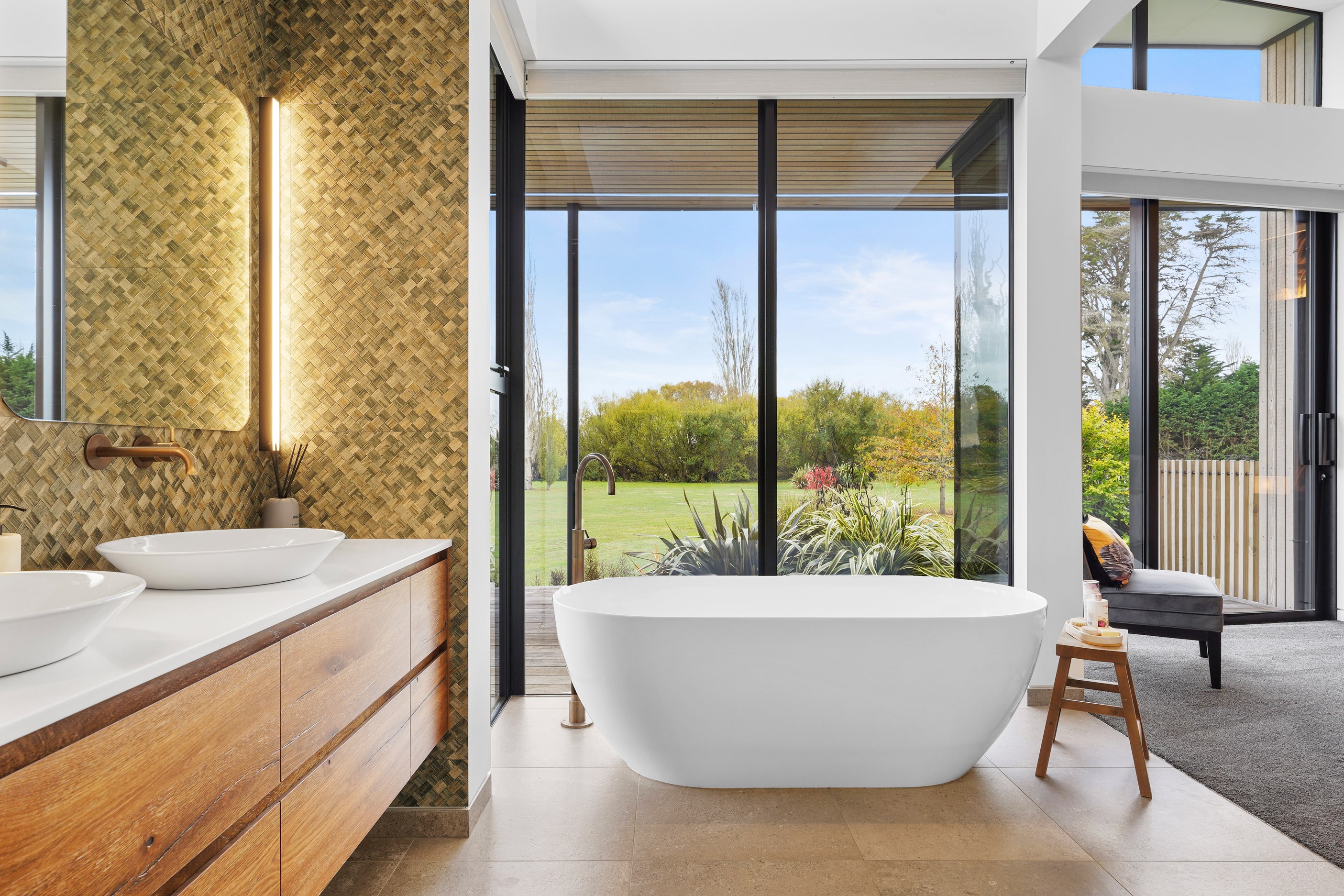 This builder’s home stretching attractively along the Canterbury landscape belies the complexity and challenges involved in constructing it. In order to craft the modern 342sqm family home, strict environmental rules governing the sensitive coast and riverside site had to be adhered to. Mission accomplished – and the impressive trio of pods connected by floating glazed bridges is the result. It’s stunning, and the local stone, coloured steel and timber cladding settle the house into the land, the site of a house lost in the 2010 earthquakes. The four-bedroom property was raised to meet a council requirement, but it also provides an elevated outlook. Additionally, it takes advantage of the northern sun. Full-height, thermally glazed joinery provides natural warmth, while central heating, a log burner and a gas fire boost the temperature in winter.