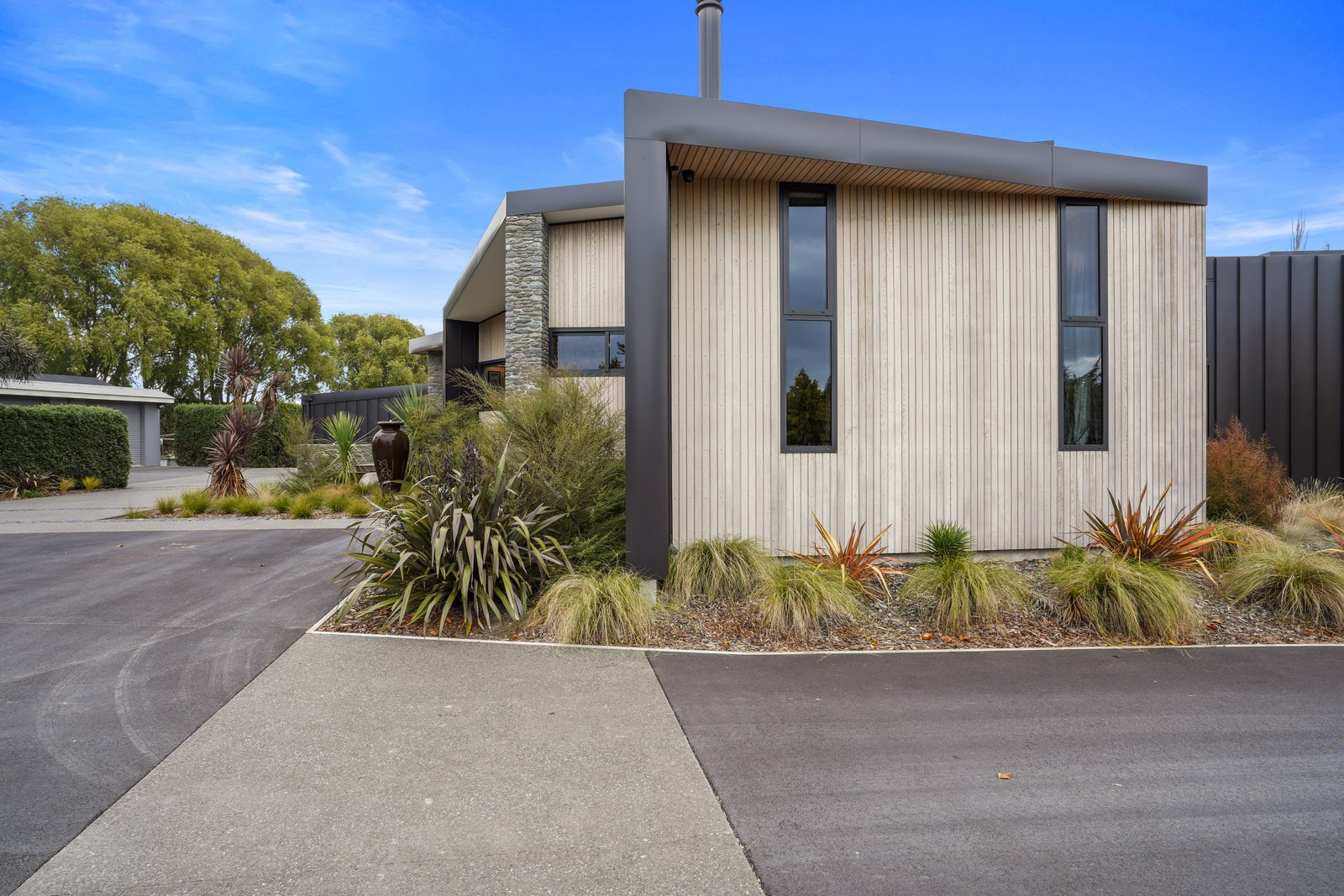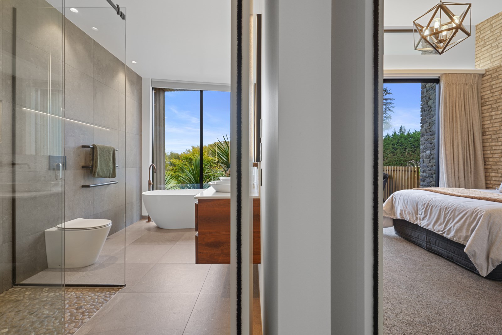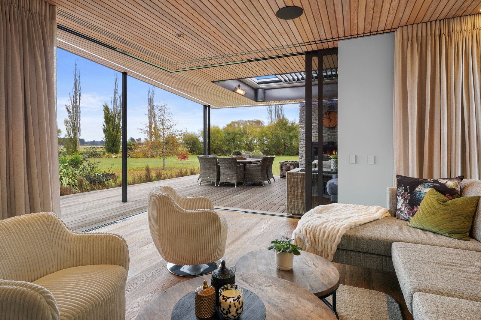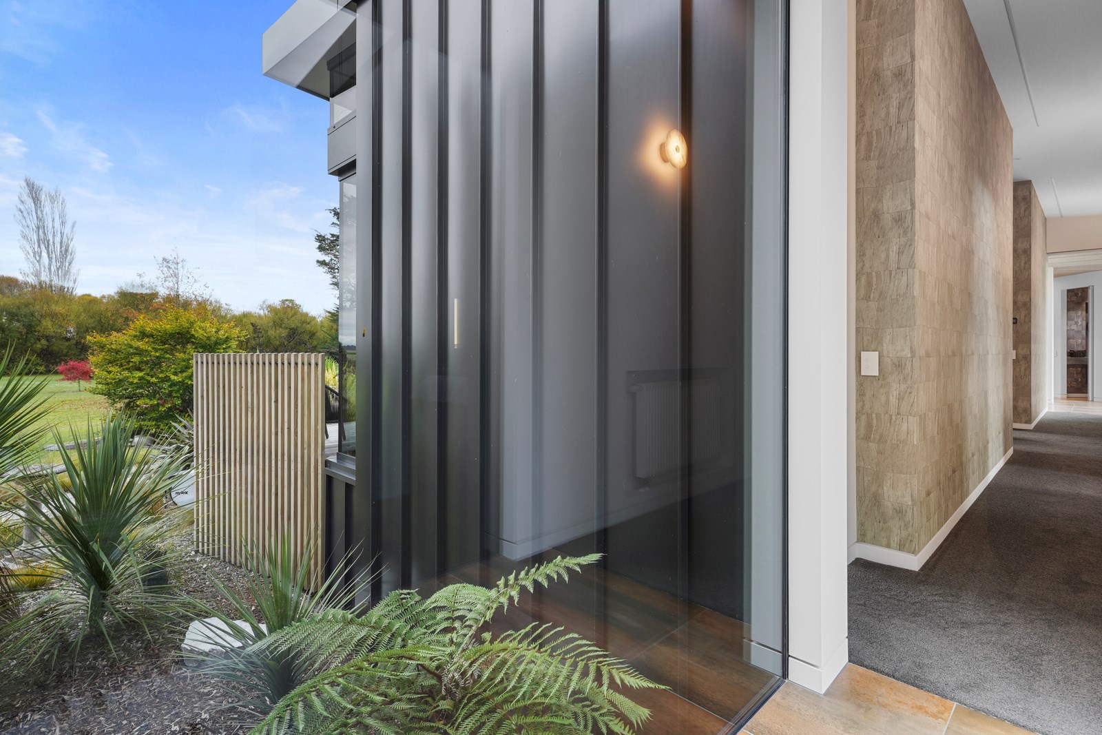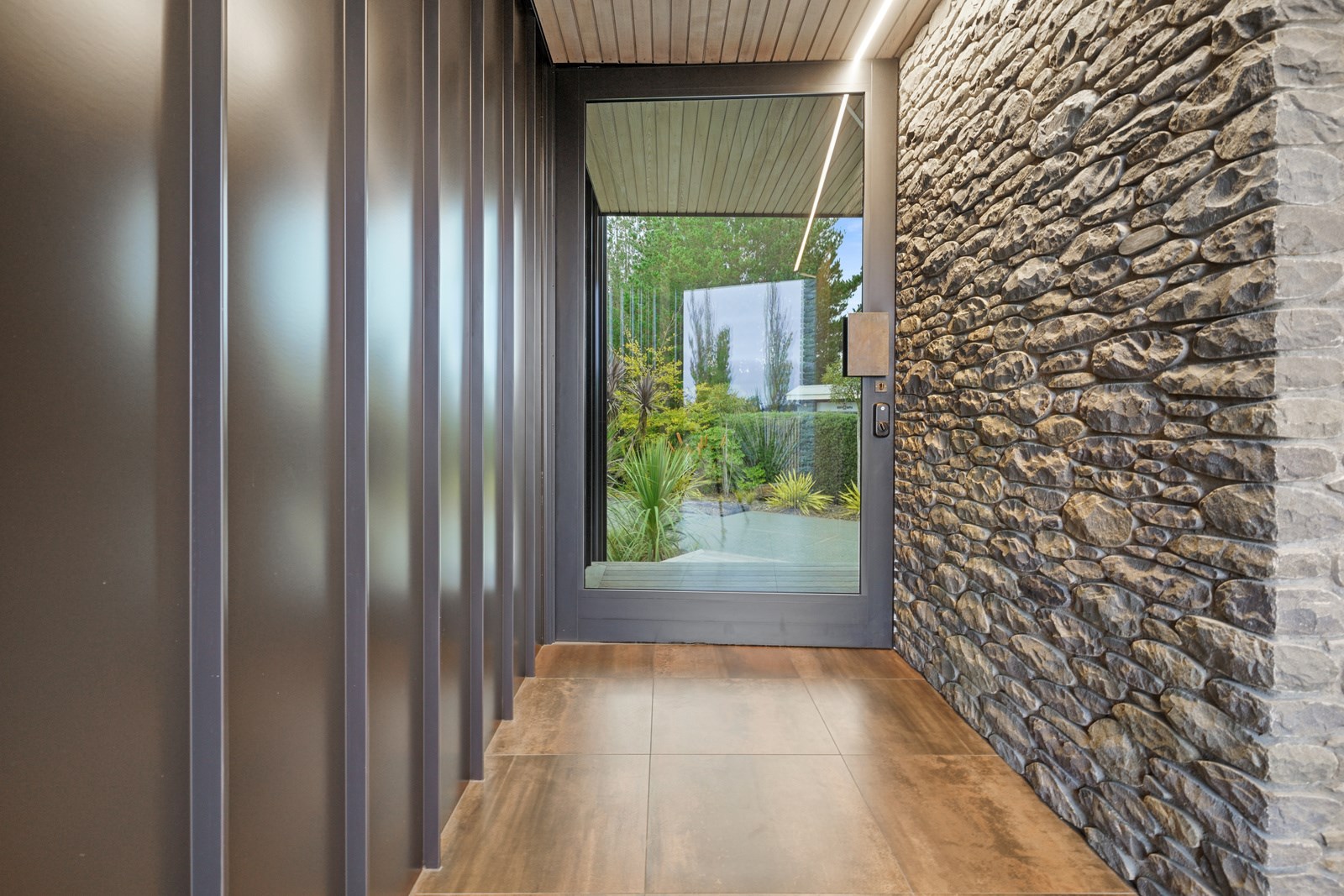 This builder’s home stretching attractively along the Canterbury landscape belies the complexity and challenges involved in constructing it. In order to craft the modern 342sqm family home, strict environmental rules governing the sensitive coast and riverside site had to be adhered to. Mission accomplished – and the impressive trio of pods connected by floating glazed bridges is the result. It’s stunning, and the local stone, coloured steel and timber cladding settle the house into the land, the site of a house lost in the 2010 earthquakes. The four-bedroom property was raised to meet a council requirement, but it also provides an elevated outlook. Additionally, it takes advantage of the northern sun. Full-height, thermally glazed joinery provides natural warmth, while central heating, a log burner and a gas fire boost the temperature in winter.