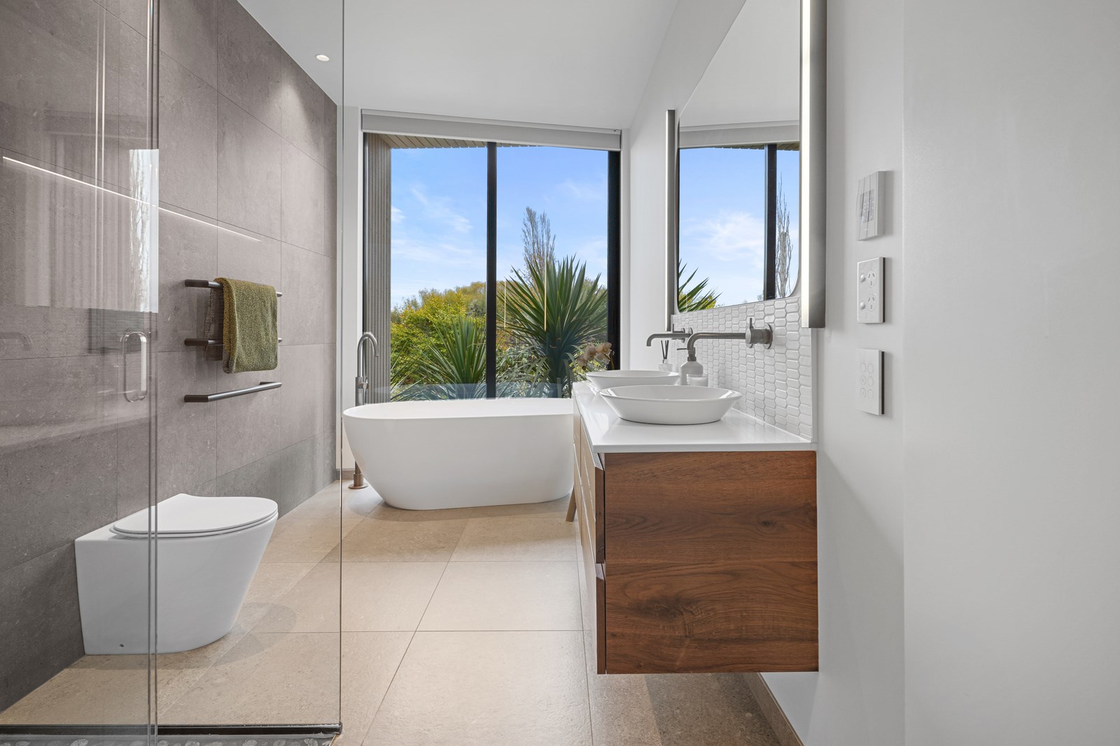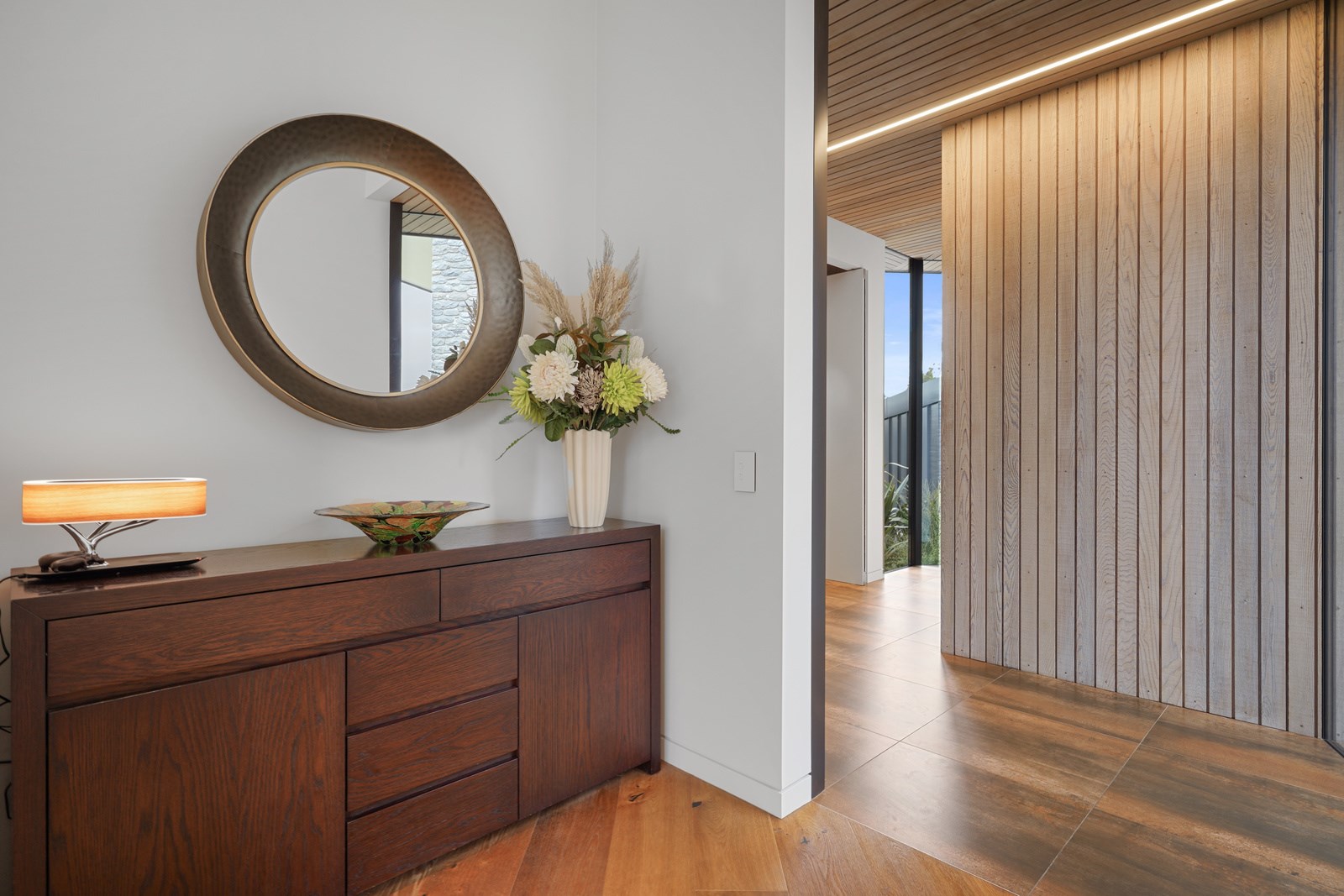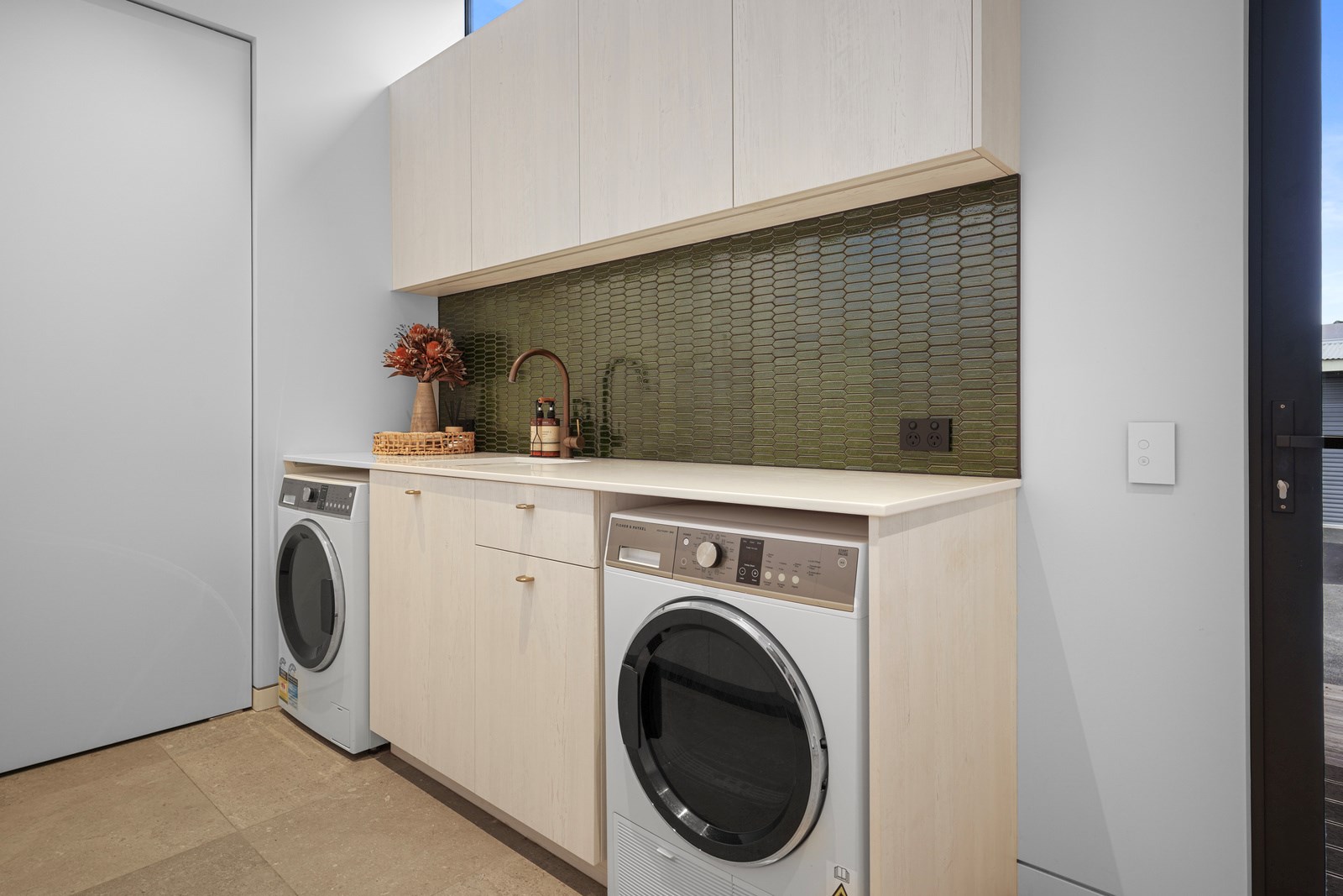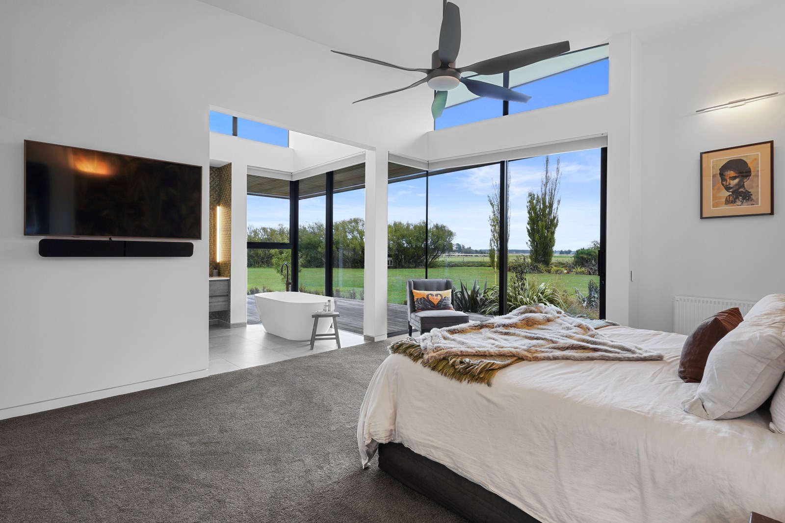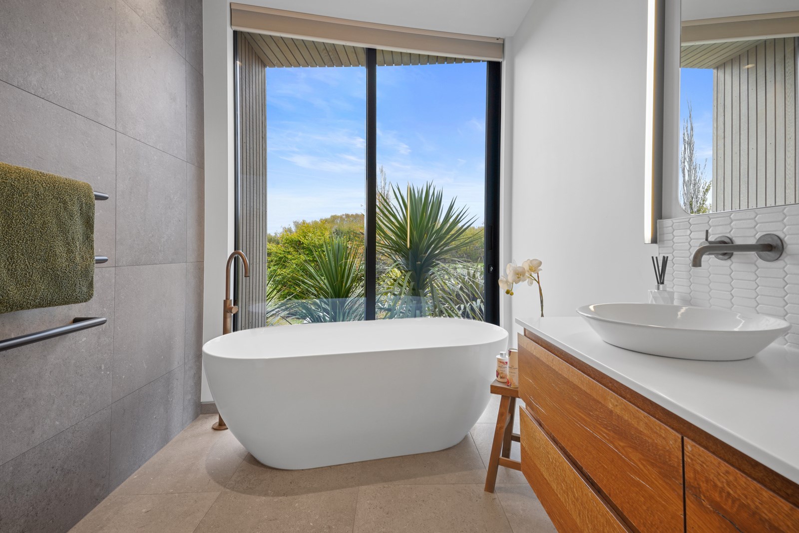 This builder’s home stretching attractively along the Canterbury landscape belies the complexity and challenges involved in constructing it. In order to craft the modern 342sqm family home, strict environmental rules governing the sensitive coast and riverside site had to be adhered to. Mission accomplished – and the impressive trio of pods connected by floating glazed bridges is the result. It’s stunning, and the local stone, coloured steel and timber cladding settle the house into the land, the site of a house lost in the 2010 earthquakes. The four-bedroom property was raised to meet a council requirement, but it also provides an elevated outlook. Additionally, it takes advantage of the northern sun. Full-height, thermally glazed joinery provides natural warmth, while central heating, a log burner and a gas fire boost the temperature in winter.