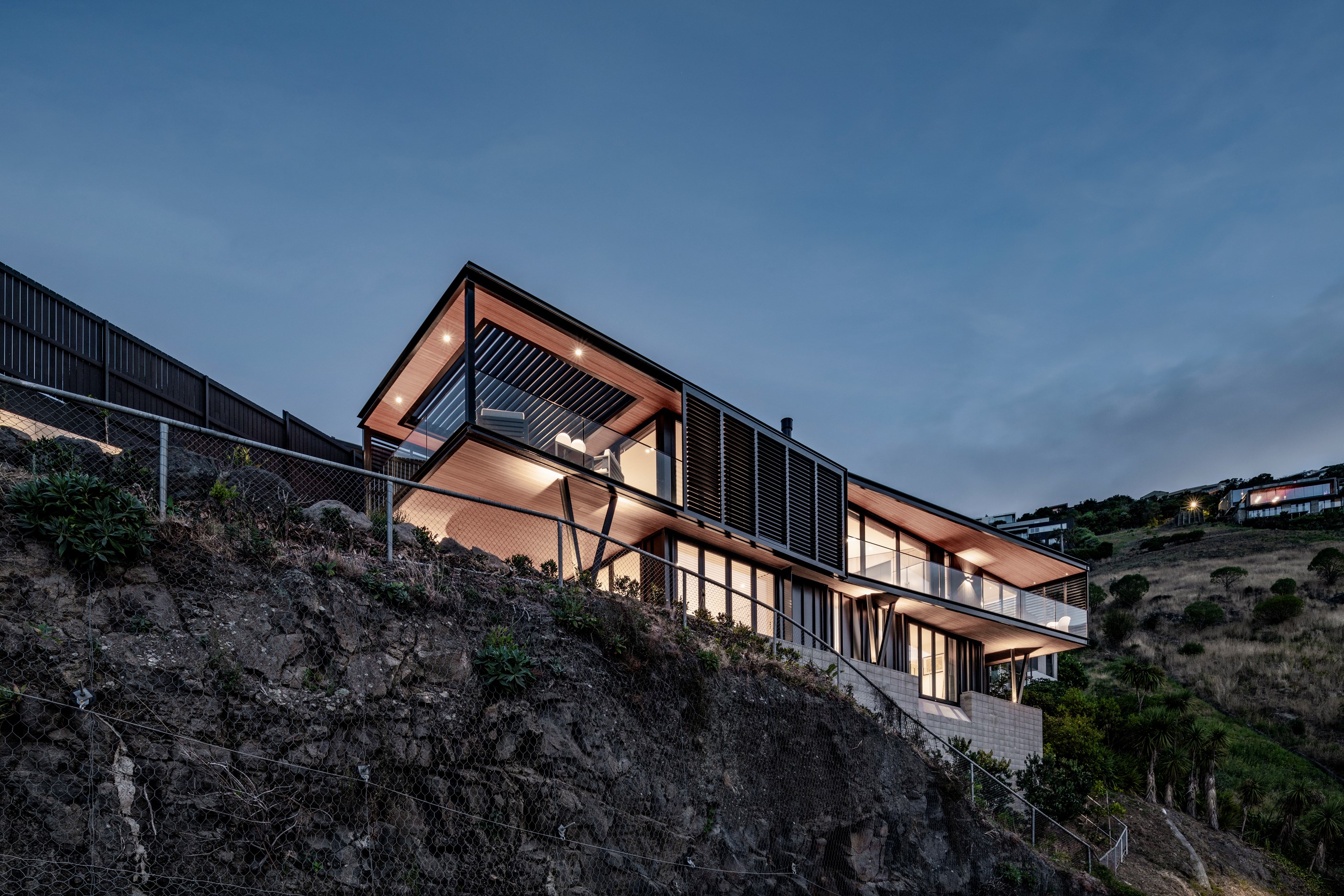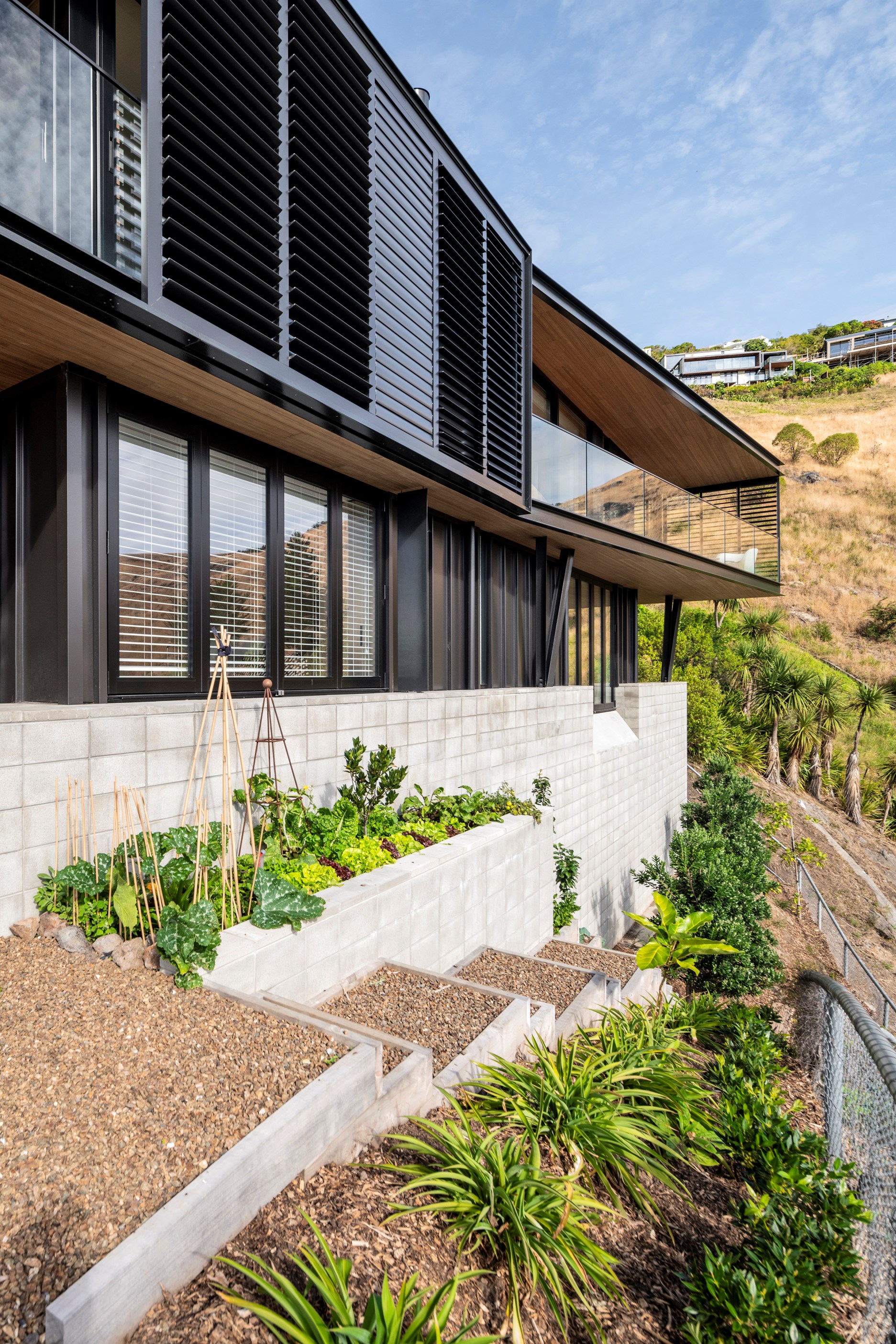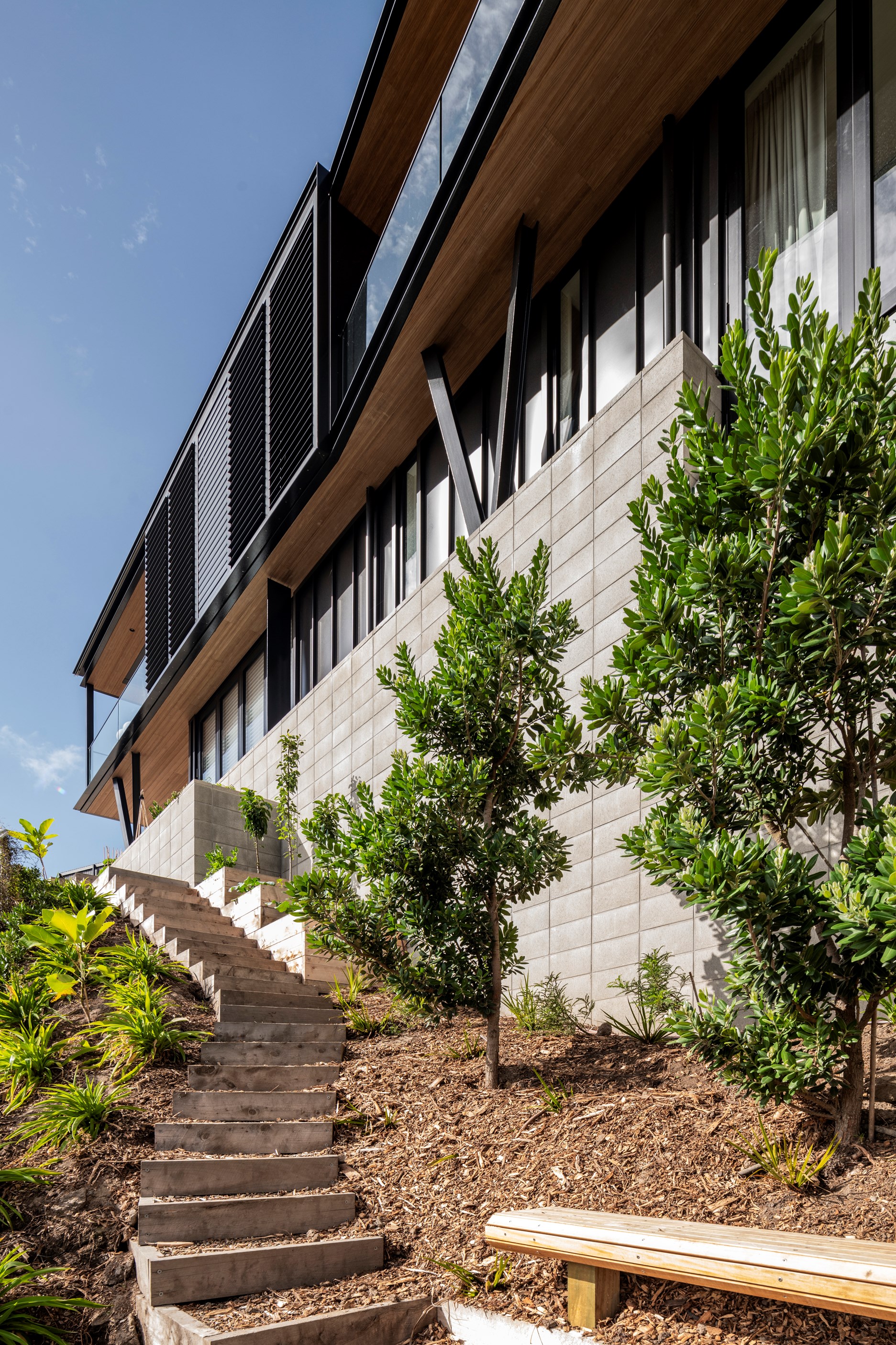 Structural-steel elements were a must for the tricky project, but these are hidden within. The cantilevered top floor with a nine-metre drop delivers vistas of hills, suburbs, beach and sea. Views of the house aren’t bad either – timber, concrete block and dark metal is a heavenly combo. A pale palette with timber features throughout the interior and is broken up with features such as designer tiles in the bathrooms and the black joinery of the double-glazed windows and doors. It’s hard to imagine all the challenges facing the building team on such a technically difficult site, yet they found ways to deliver something exquisite. The last chapter of this story may have contained a cliffhanger, but it also has a very satisfying ending.