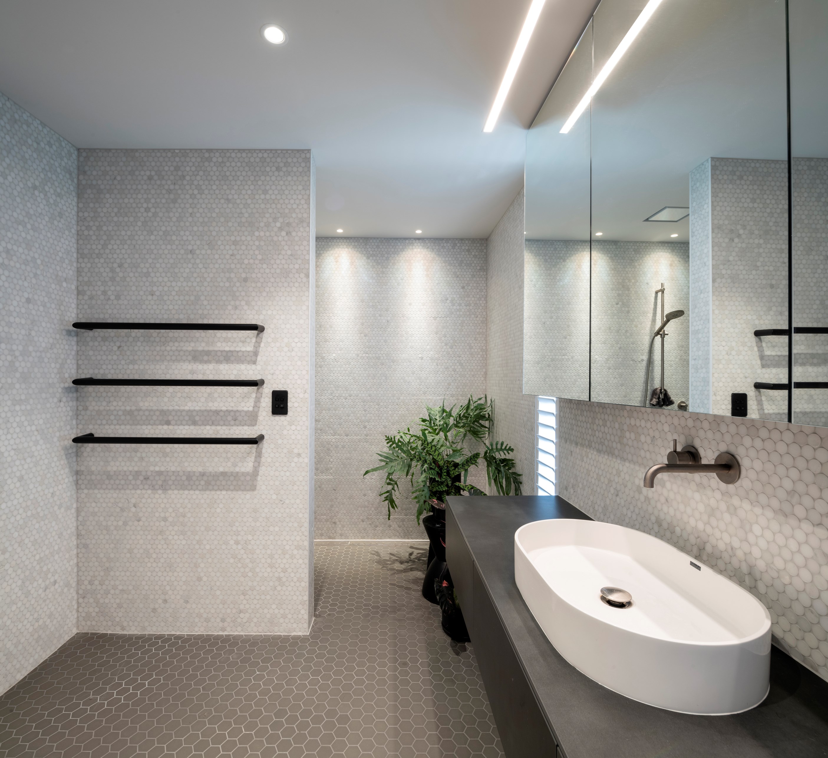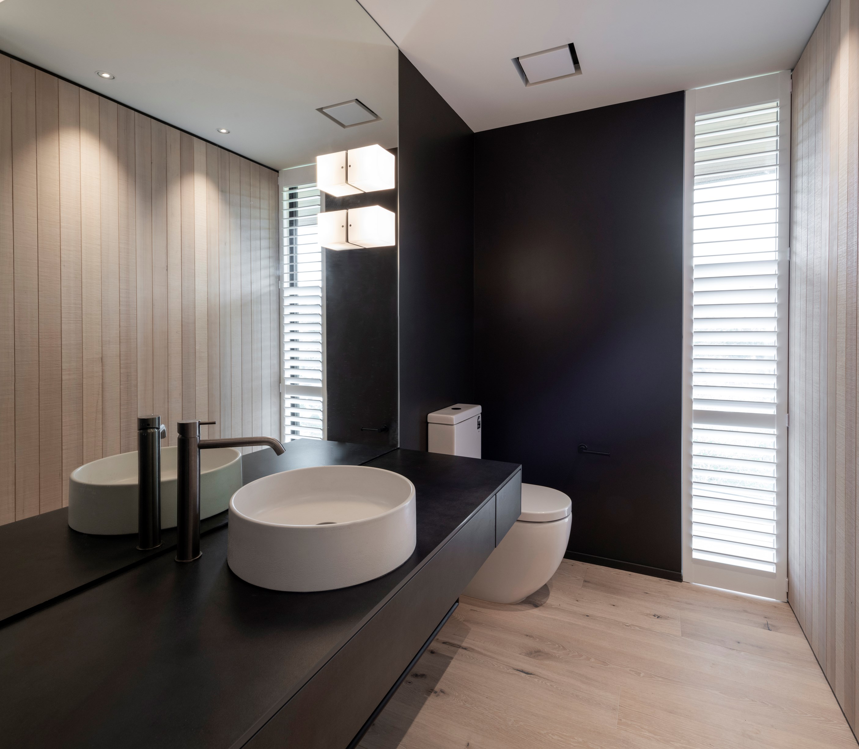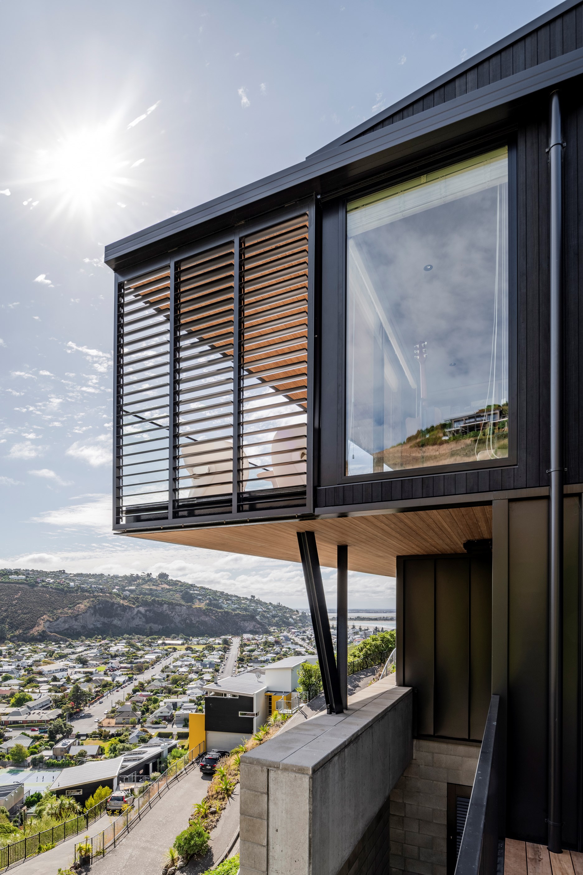 Structural-steel elements were a must for the tricky project, but these are hidden within. The cantilevered top floor with a nine-metre drop delivers vistas of hills, suburbs, beach and sea. Views of the house aren’t bad either – timber, concrete block and dark metal is a heavenly combo. A pale palette with timber features throughout the interior and is broken up with features such as designer tiles in the bathrooms and the black joinery of the double-glazed windows and doors. It’s hard to imagine all the challenges facing the building team on such a technically difficult site, yet they found ways to deliver something exquisite. The last chapter of this story may have contained a cliffhanger, but it also has a very satisfying ending.