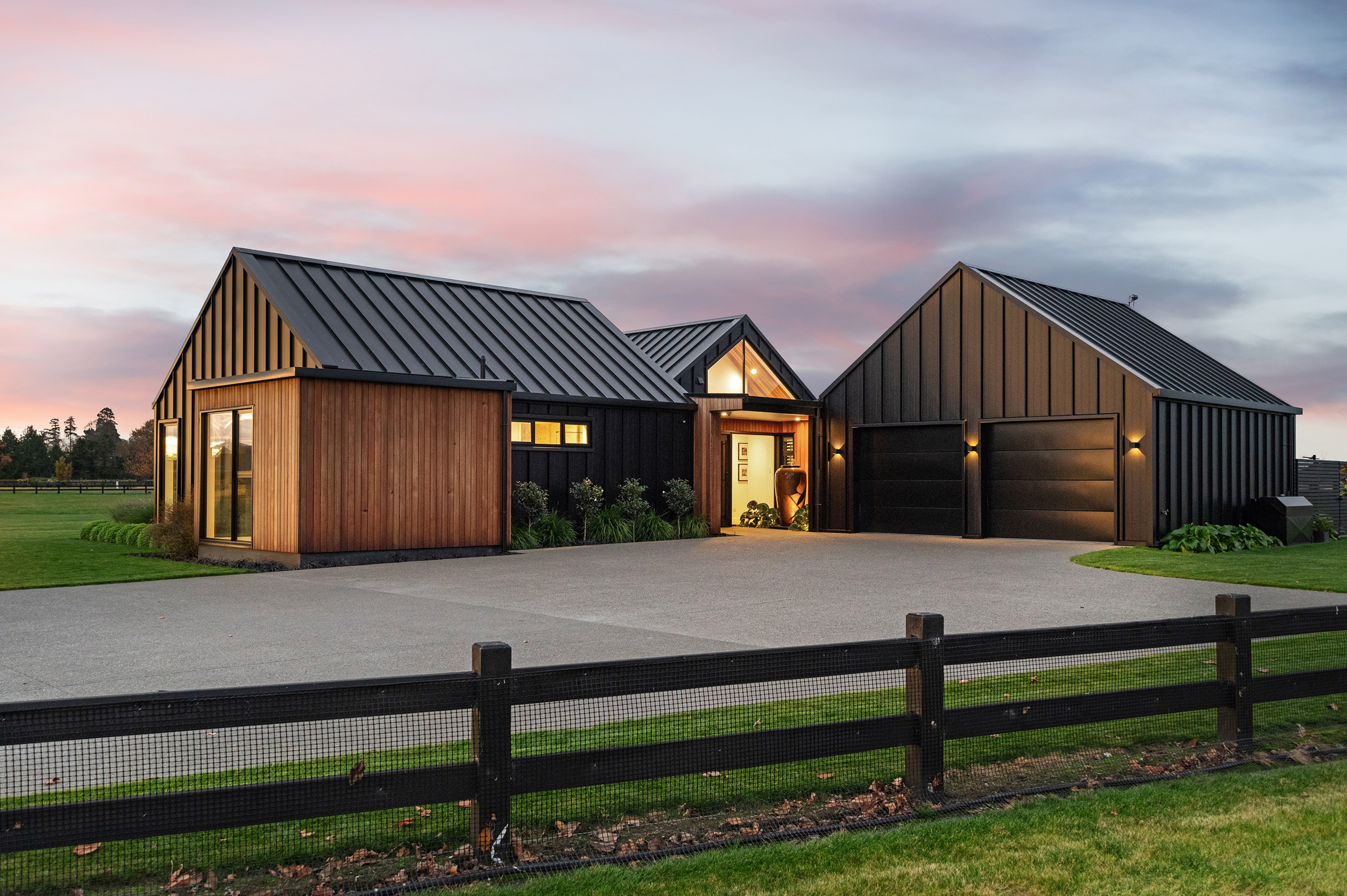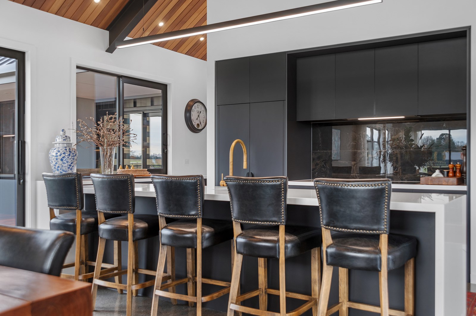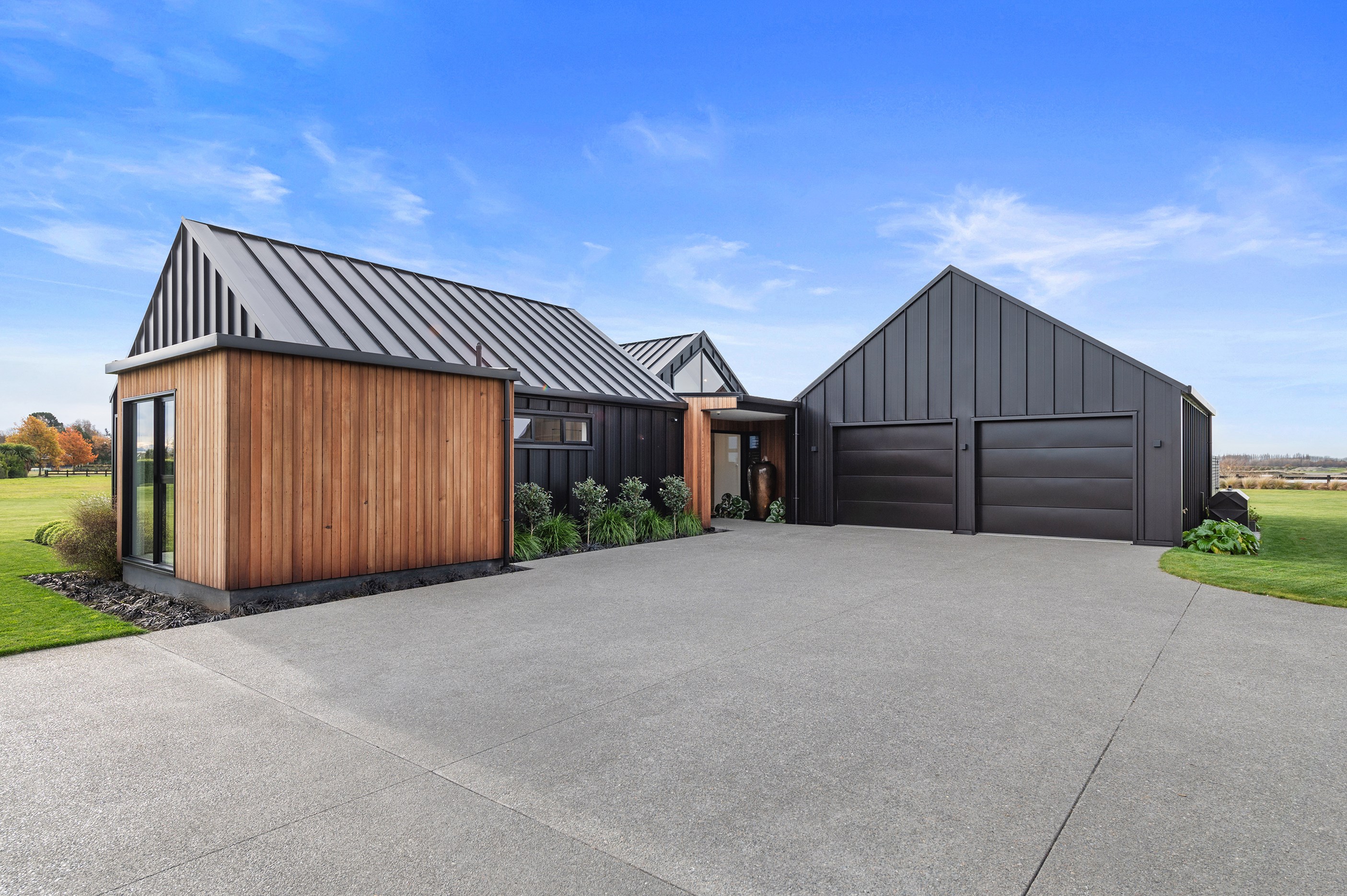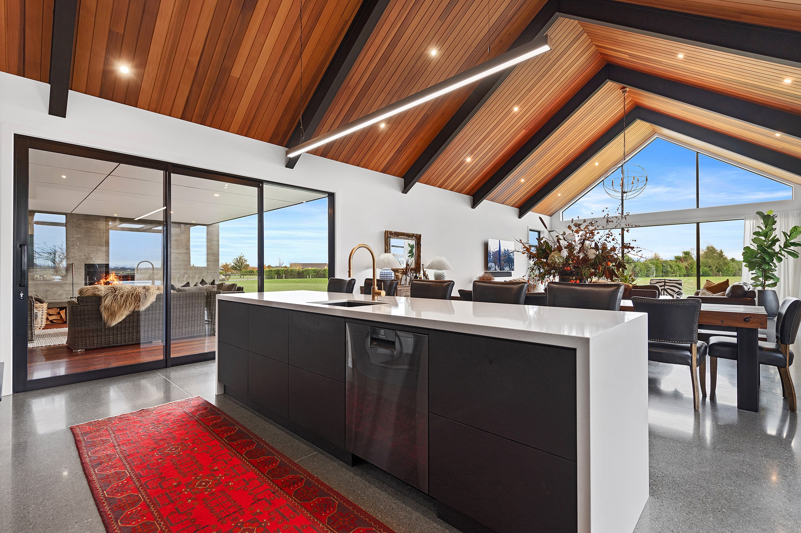 No detail has been spared in this home that epitomises easy modern living. It’s perfect for the semi-retired farming couple who lives here, but is equally well set up as a sanctuary for generations to come. Located near Lake Hood, south of Ashburton, the 285sqm, three-bedroom home is an exemplar of quality and detail. Top-grade materials, such as the ceiling lined in cedar tongue-and-groove with exposed steel beams, and walls of in-situ poured concrete, illustrate the point. With materials such as these, impeccable workmanship was called for and Stu Bell Construction delivered. In stark contrast to their farm life, the owners’ aesthetic here is minimalist and modern with clean lines. As a result, the finishes had to be pristine and again, the project team came up trumps. Just look at the polished-concrete floors and wide glazing, including clerestory windows.