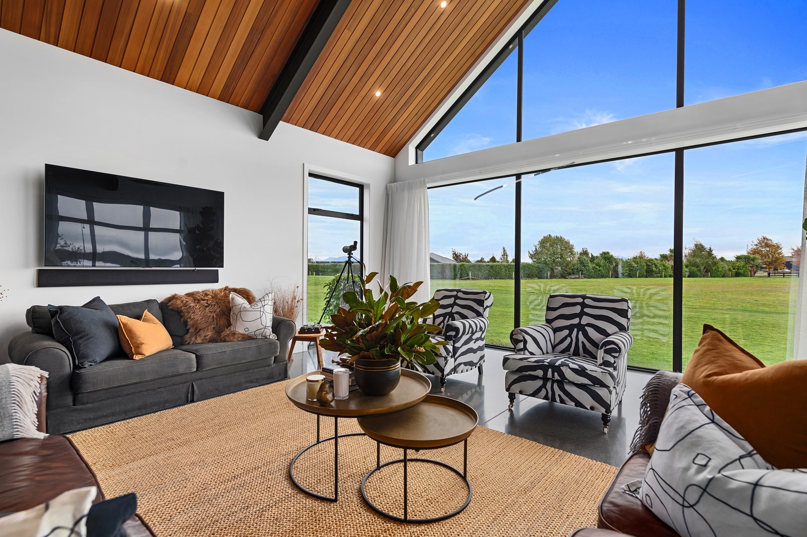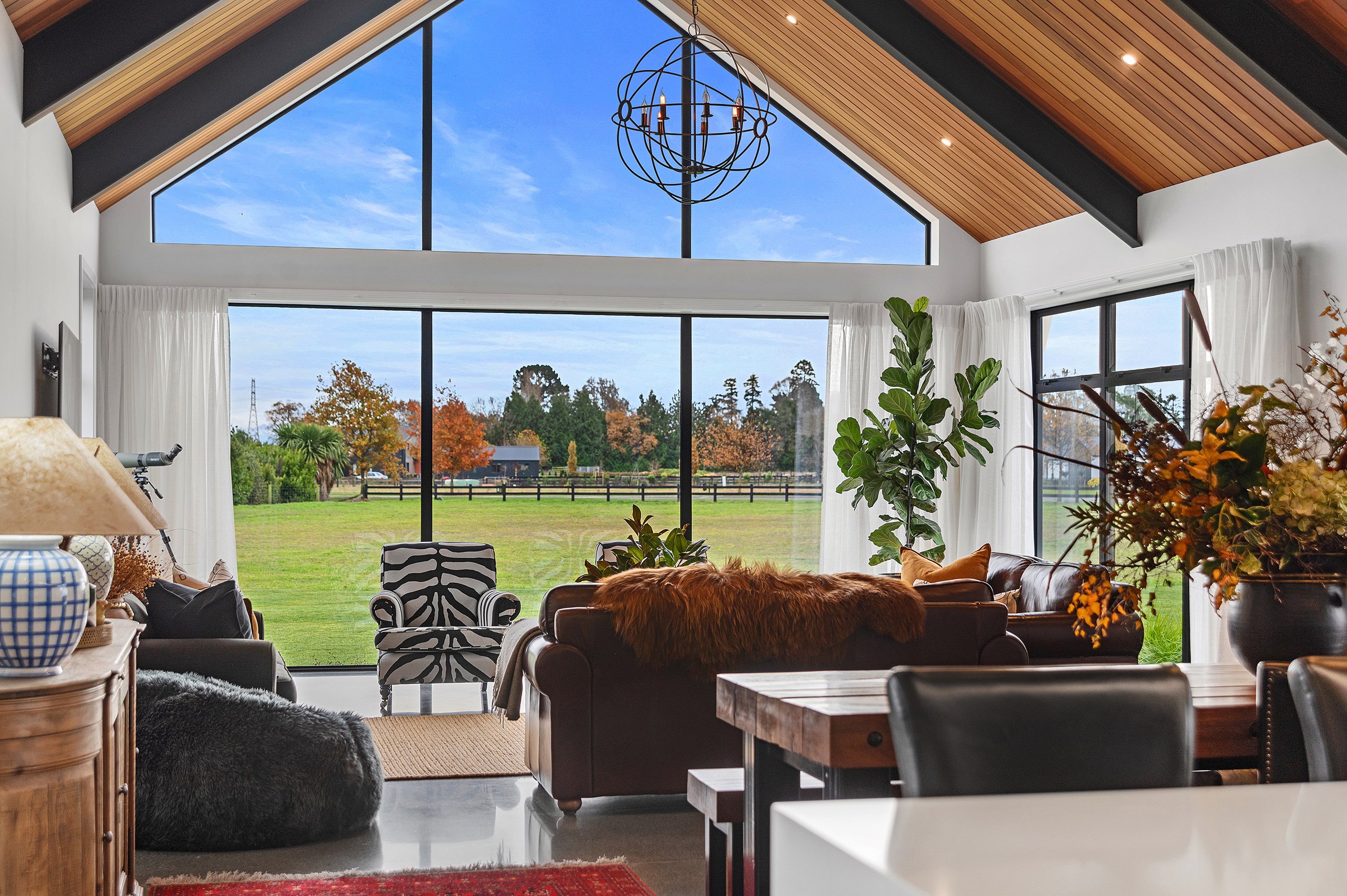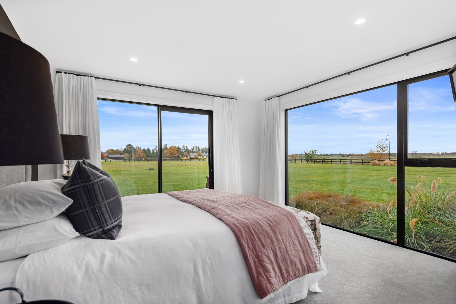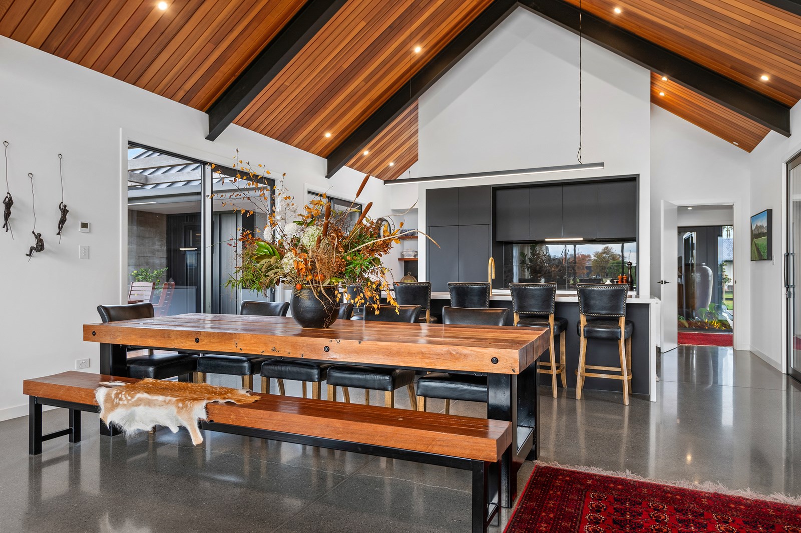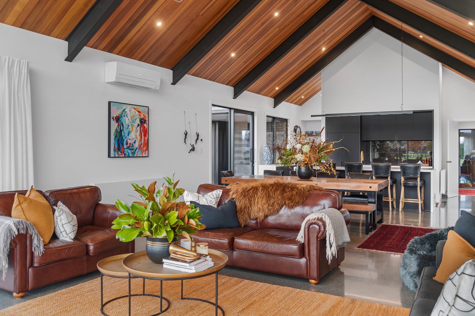 No detail has been spared in this home that epitomises easy modern living. It’s perfect for the semi-retired farming couple who lives here, but is equally well set up as a sanctuary for generations to come. Located near Lake Hood, south of Ashburton, the 285sqm, three-bedroom home is an exemplar of quality and detail. Top-grade materials, such as the ceiling lined in cedar tongue-and-groove with exposed steel beams, and walls of in-situ poured concrete, illustrate the point. With materials such as these, impeccable workmanship was called for and Stu Bell Construction delivered. In stark contrast to their farm life, the owners’ aesthetic here is minimalist and modern with clean lines. As a result, the finishes had to be pristine and again, the project team came up trumps. Just look at the polished-concrete floors and wide glazing, including clerestory windows.