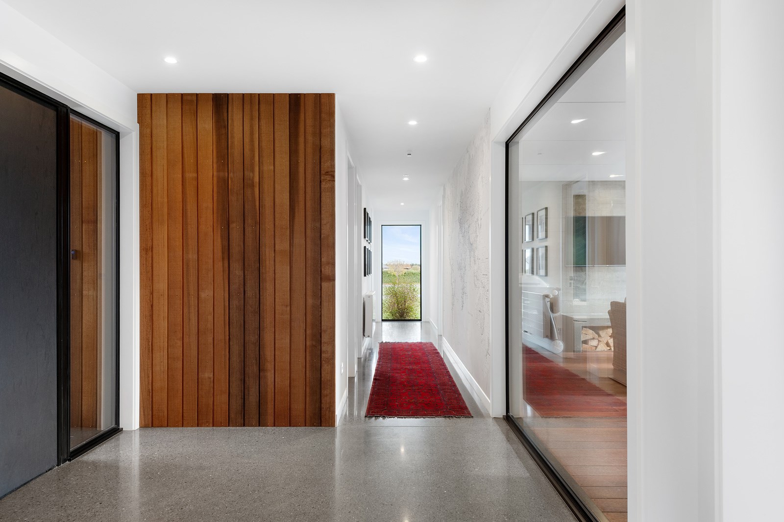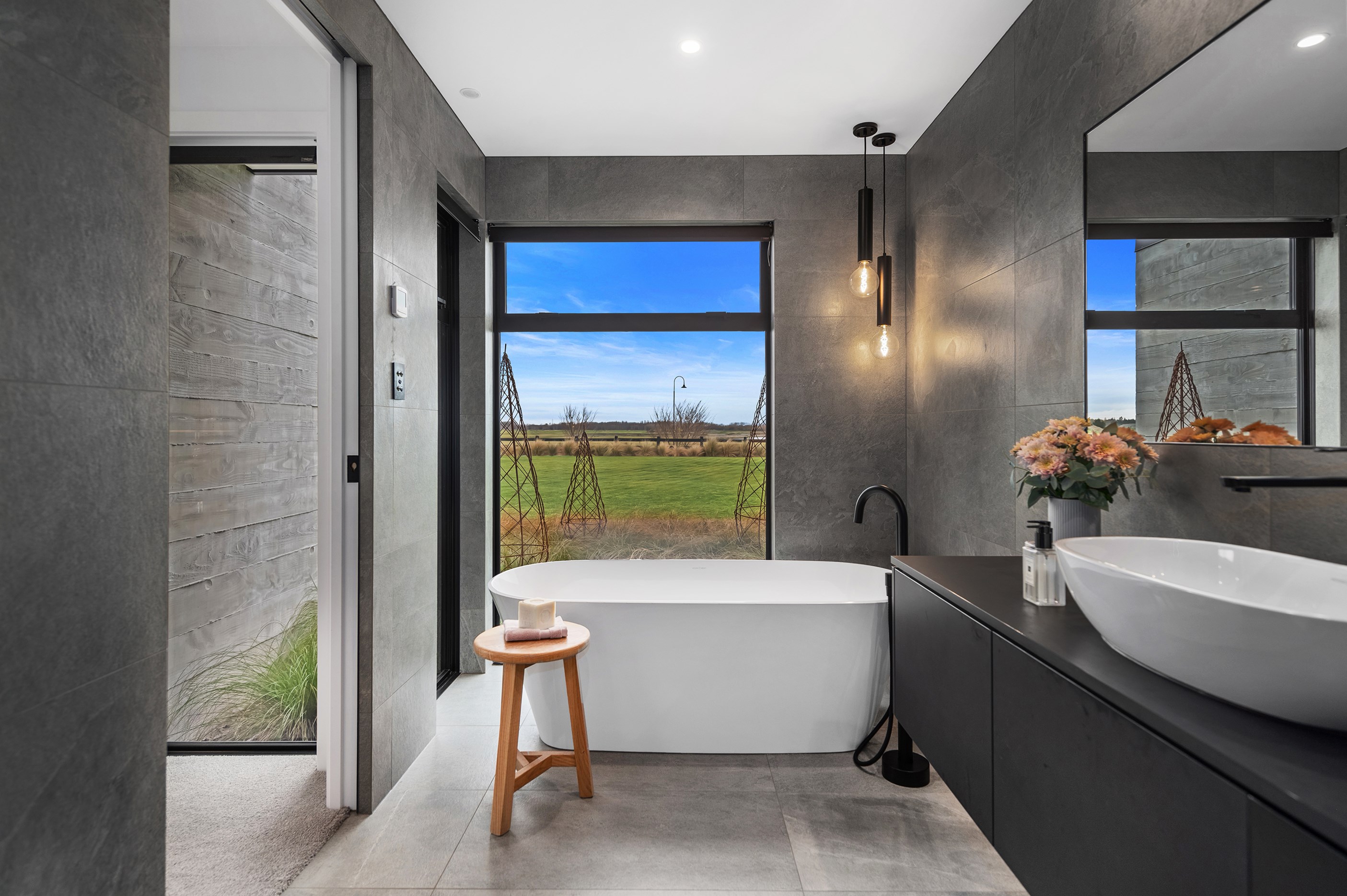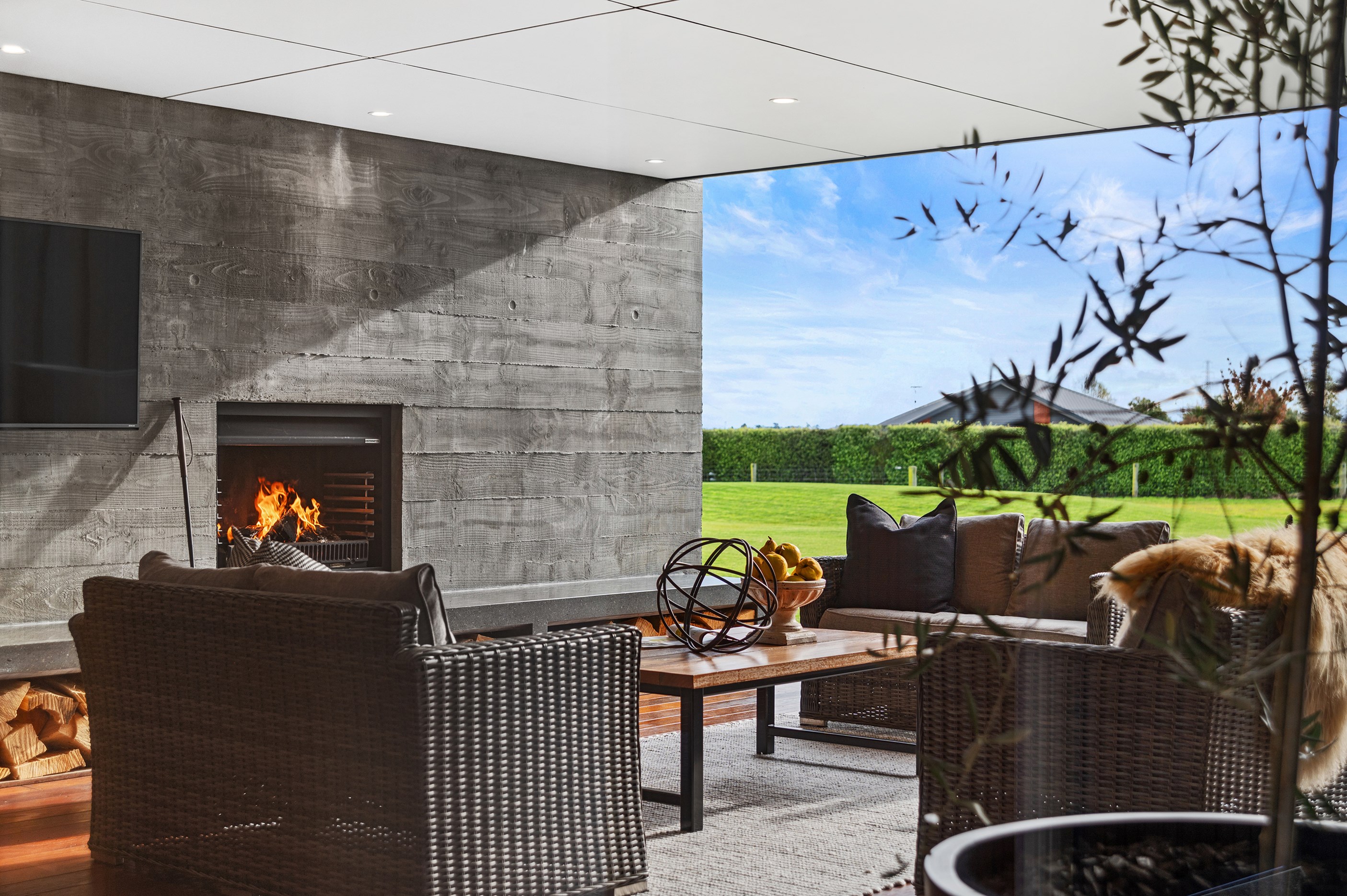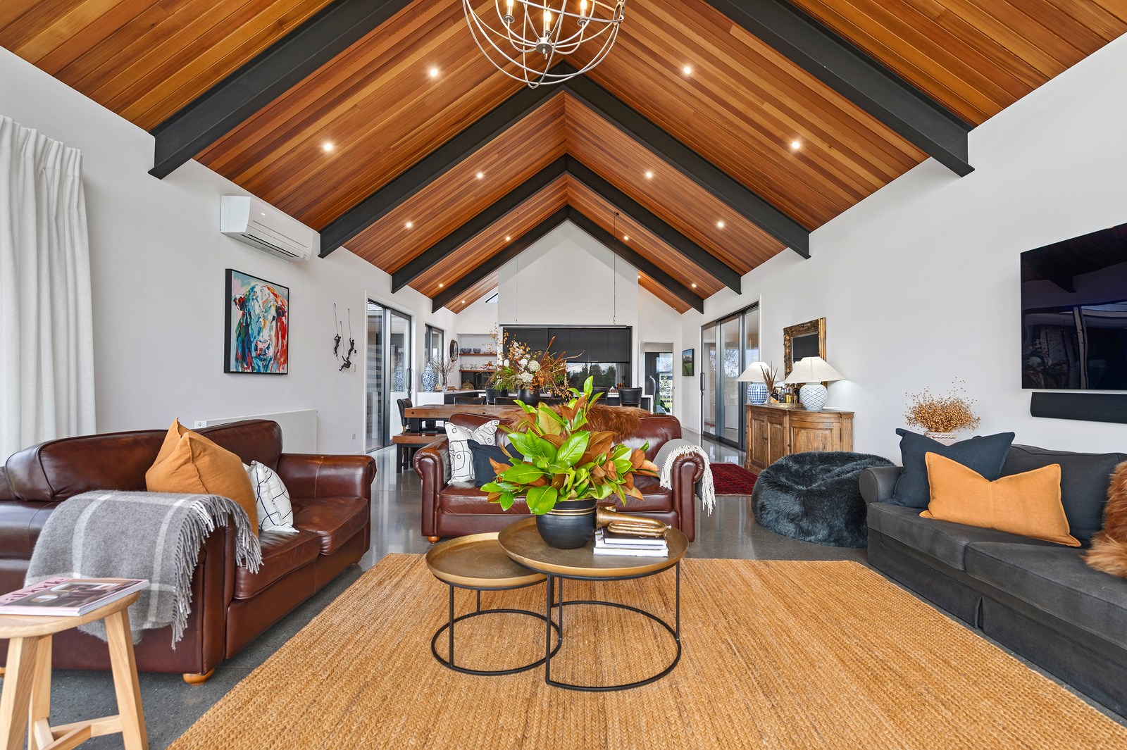 No detail has been spared in this home that epitomises easy modern living. It’s perfect for the semi-retired farming couple who lives here, but is equally well set up as a sanctuary for generations to come. Located near Lake Hood, south of Ashburton, the 285sqm, three-bedroom home is an exemplar of quality and detail. Top-grade materials, such as the ceiling lined in cedar tongue-and-groove with exposed steel beams, and walls of in-situ poured concrete, illustrate the point. With materials such as these, impeccable workmanship was called for and Stu Bell Construction delivered. In stark contrast to their farm life, the owners’ aesthetic here is minimalist and modern with clean lines. As a result, the finishes had to be pristine and again, the project team came up trumps. Just look at the polished-concrete floors and wide glazing, including clerestory windows.