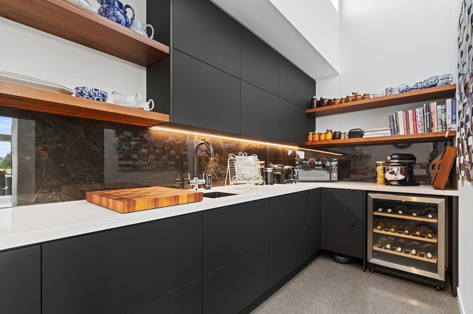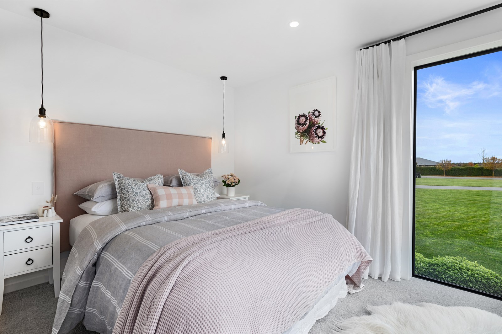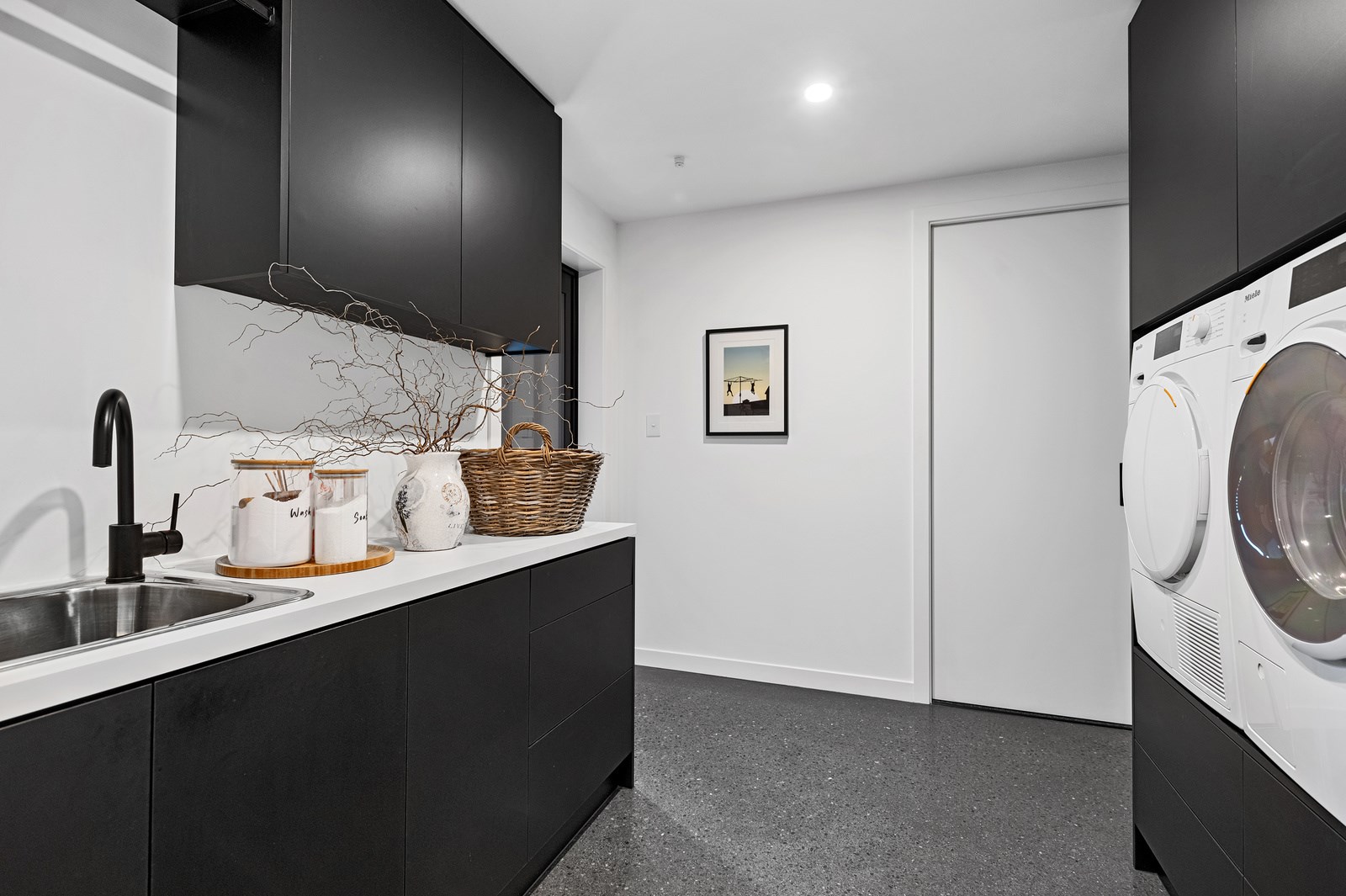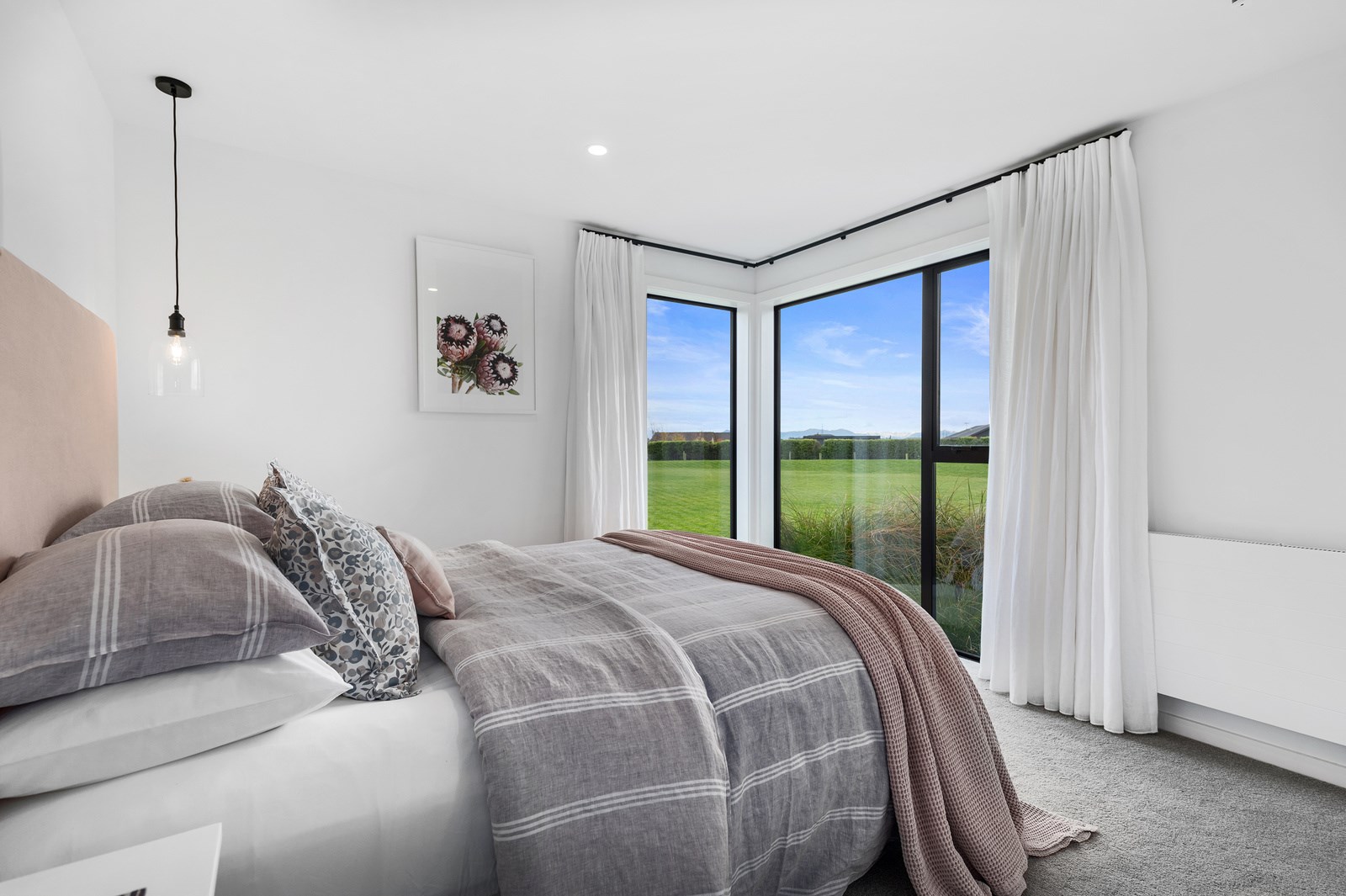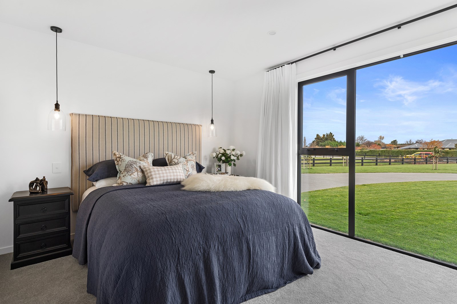 No detail has been spared in this home that epitomises easy modern living. It’s perfect for the semi-retired farming couple who lives here, but is equally well set up as a sanctuary for generations to come. Located near Lake Hood, south of Ashburton, the 285sqm, three-bedroom home is an exemplar of quality and detail. Top-grade materials, such as the ceiling lined in cedar tongue-and-groove with exposed steel beams, and walls of in-situ poured concrete, illustrate the point. With materials such as these, impeccable workmanship was called for and Stu Bell Construction delivered. In stark contrast to their farm life, the owners’ aesthetic here is minimalist and modern with clean lines. As a result, the finishes had to be pristine and again, the project team came up trumps. Just look at the polished-concrete floors and wide glazing, including clerestory windows.