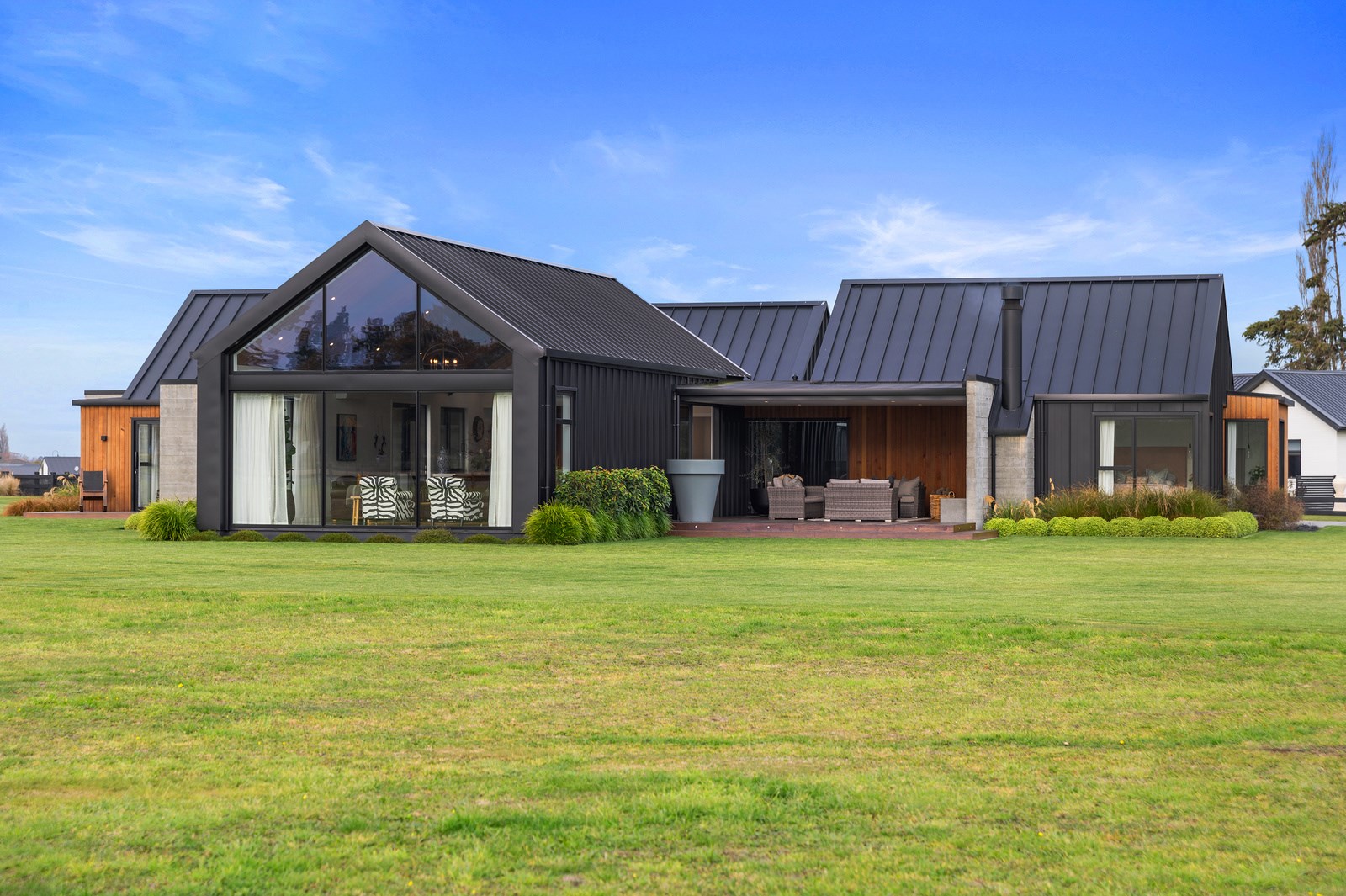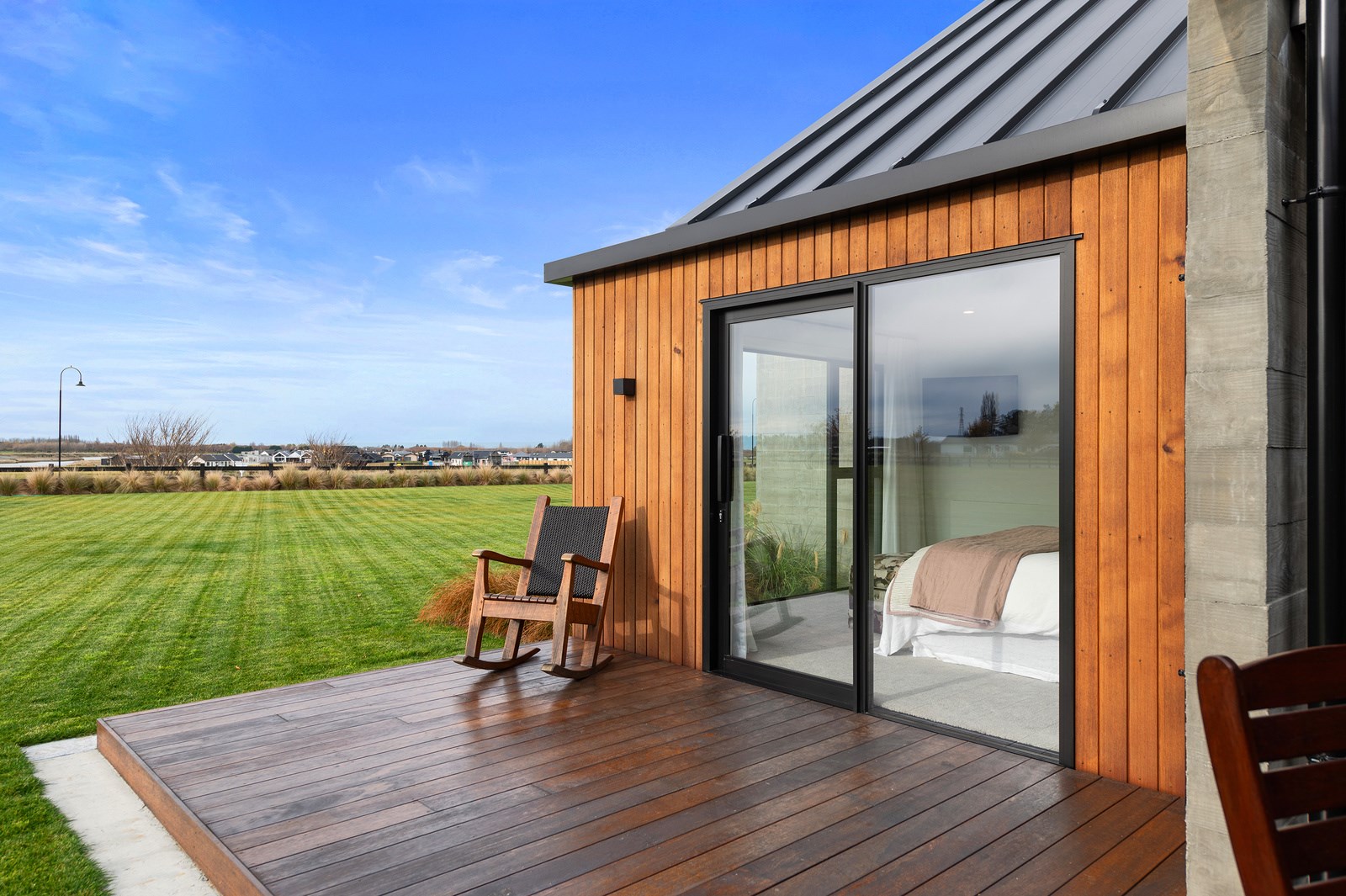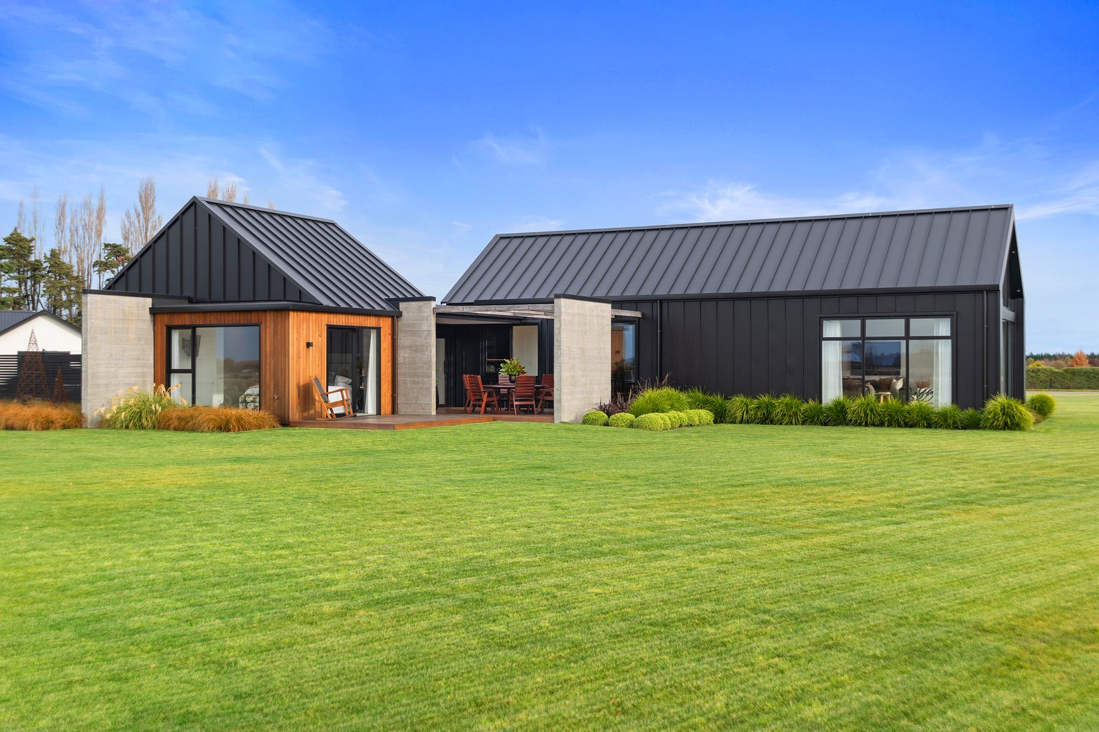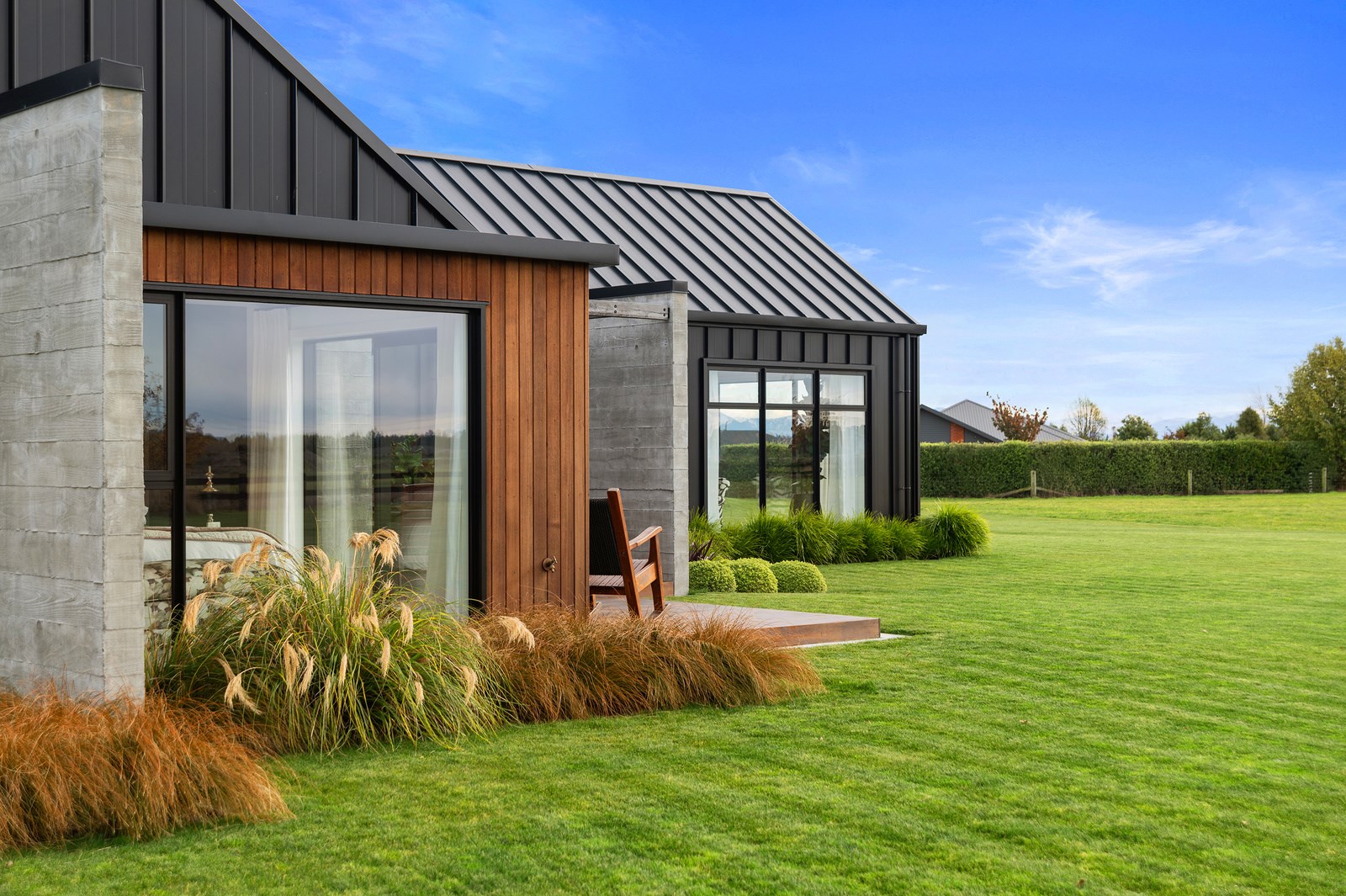 Decks on either side of the main communal space – one an outdoor room – allows the owners to enjoy the fresh Canterbury air with a glimpse of the Southern Alps. One hundred year old ironbark was sourced from the old Timaru wharf and milled, cut and used to build a pergola over the deck. In terms of durability and external good looks, nothing was overlooked, either. Vertical cedar, concrete and metal-tray cladding provide contrast, a modern vibe and robustness. The charming minimalist native garden is low care.