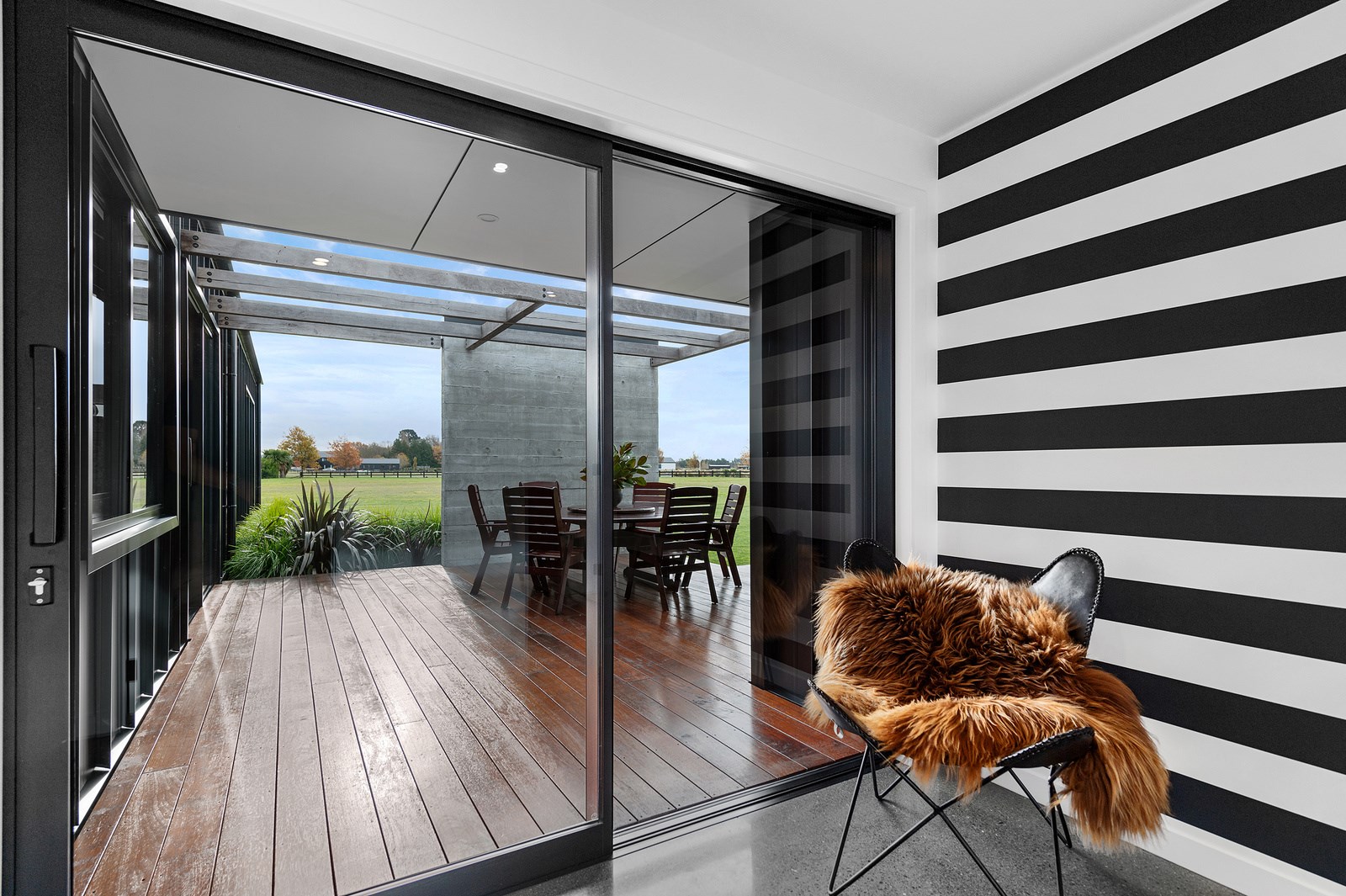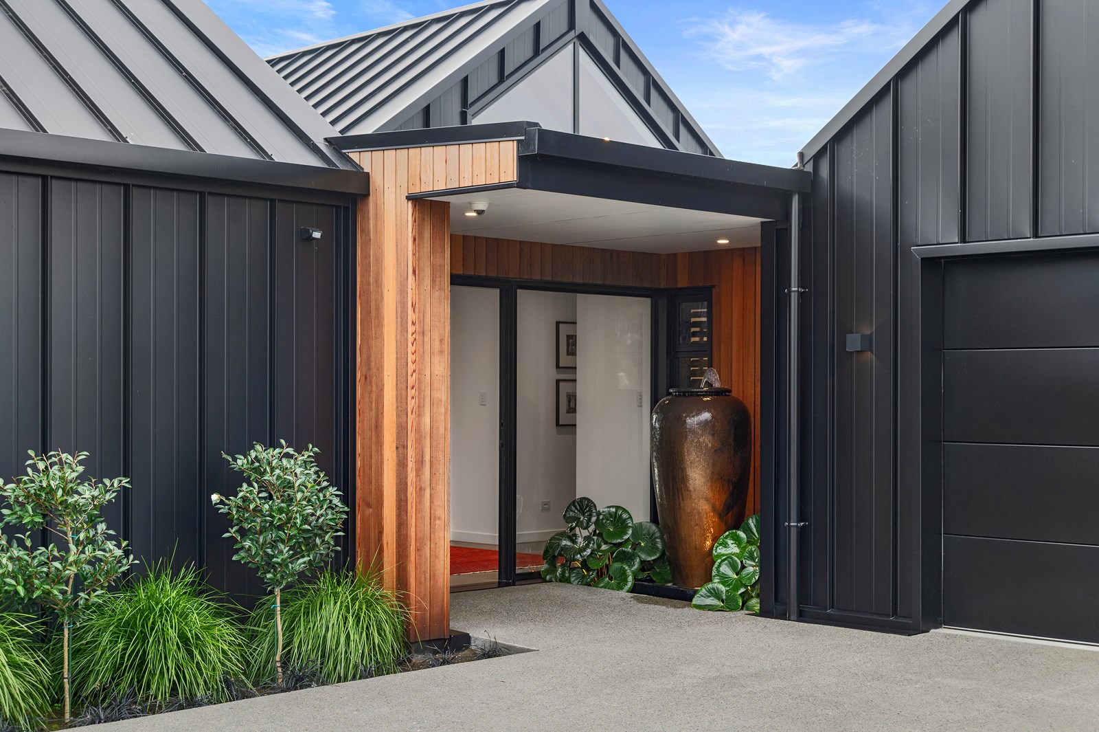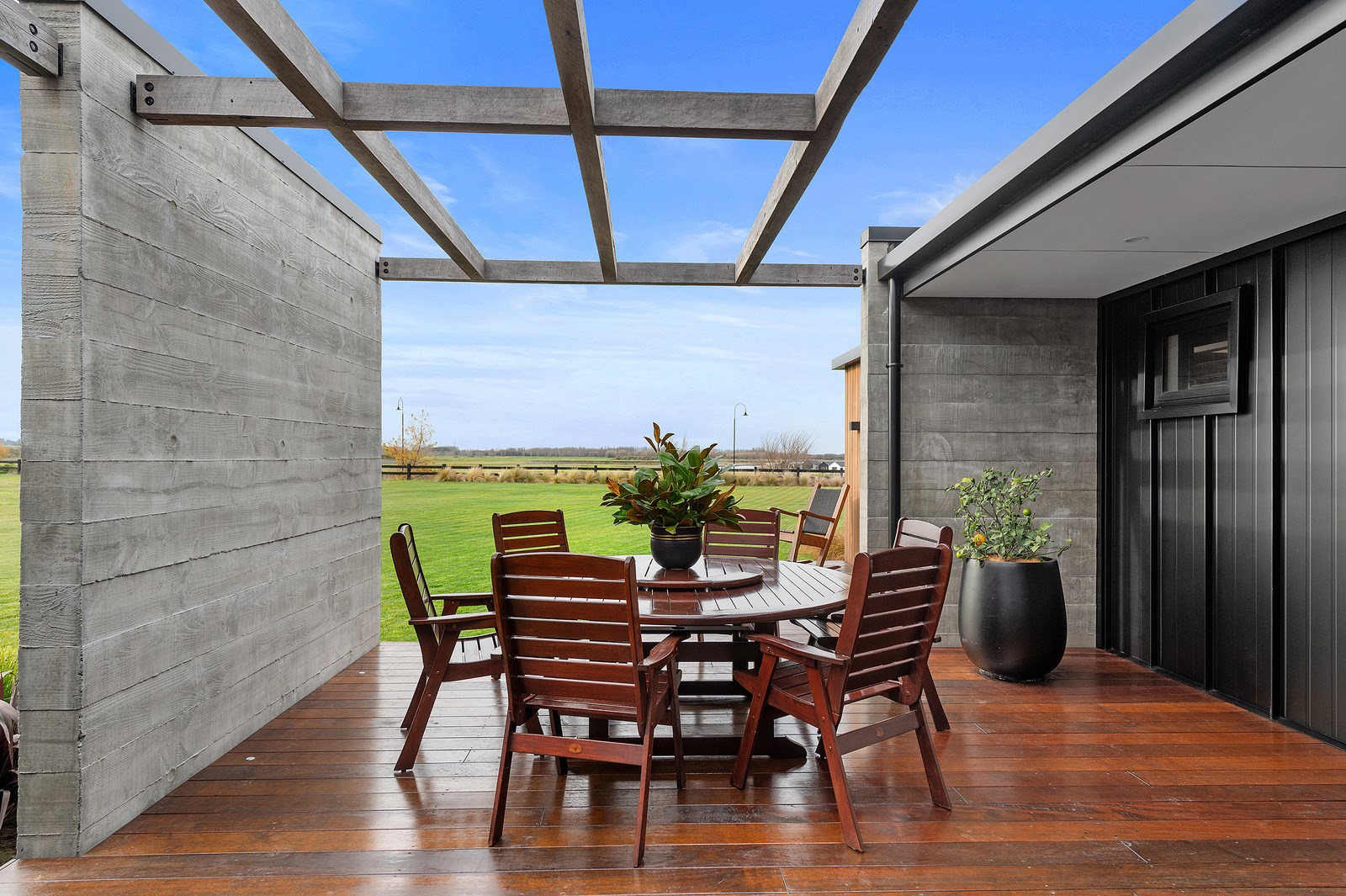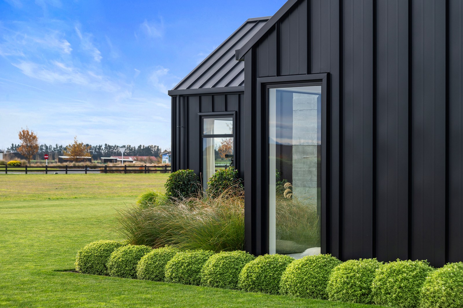 Decks on either side of the main communal space – one an outdoor room – allows the owners to enjoy the fresh Canterbury air with a glimpse of the Southern Alps. One hundred year old ironbark was sourced from the old Timaru wharf and milled, cut and used to build a pergola over the deck. In terms of durability and external good looks, nothing was overlooked, either. Vertical cedar, concrete and metal-tray cladding provide contrast, a modern vibe and robustness. The charming minimalist native garden is low care.