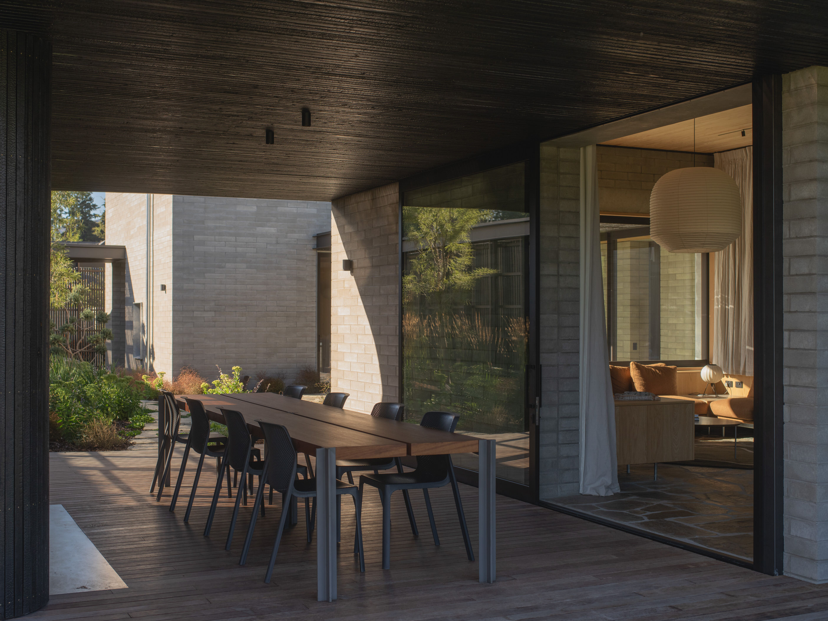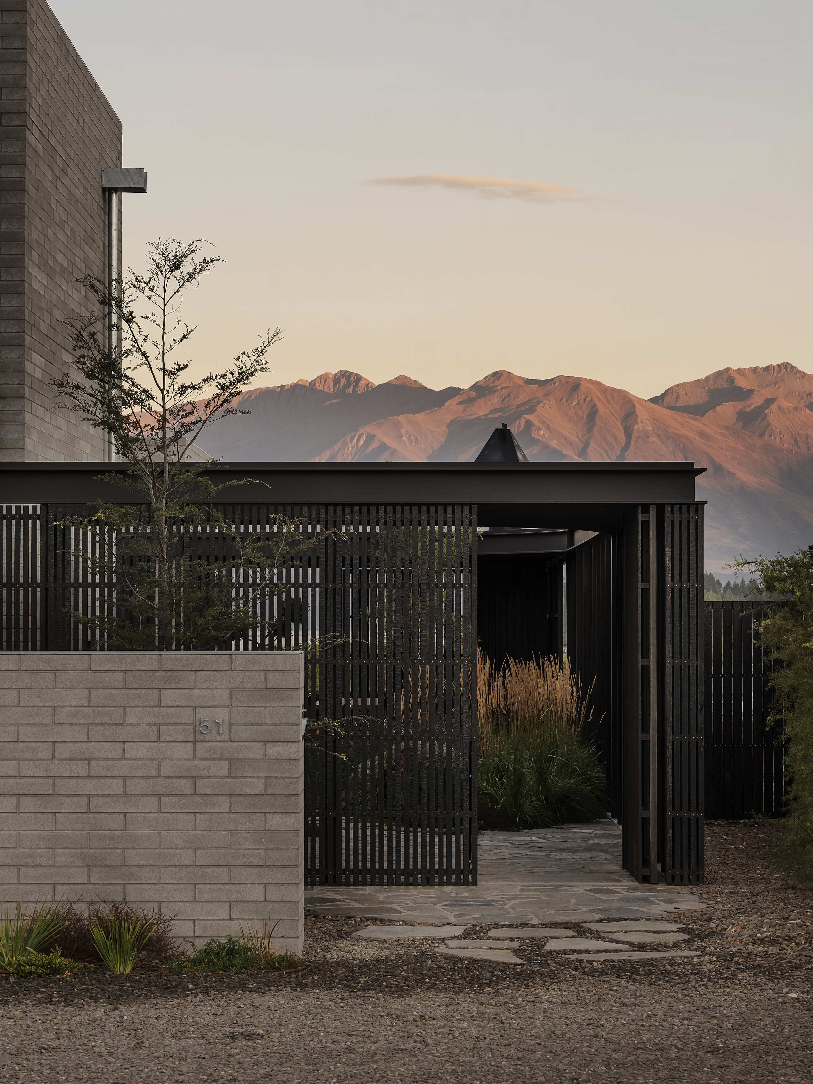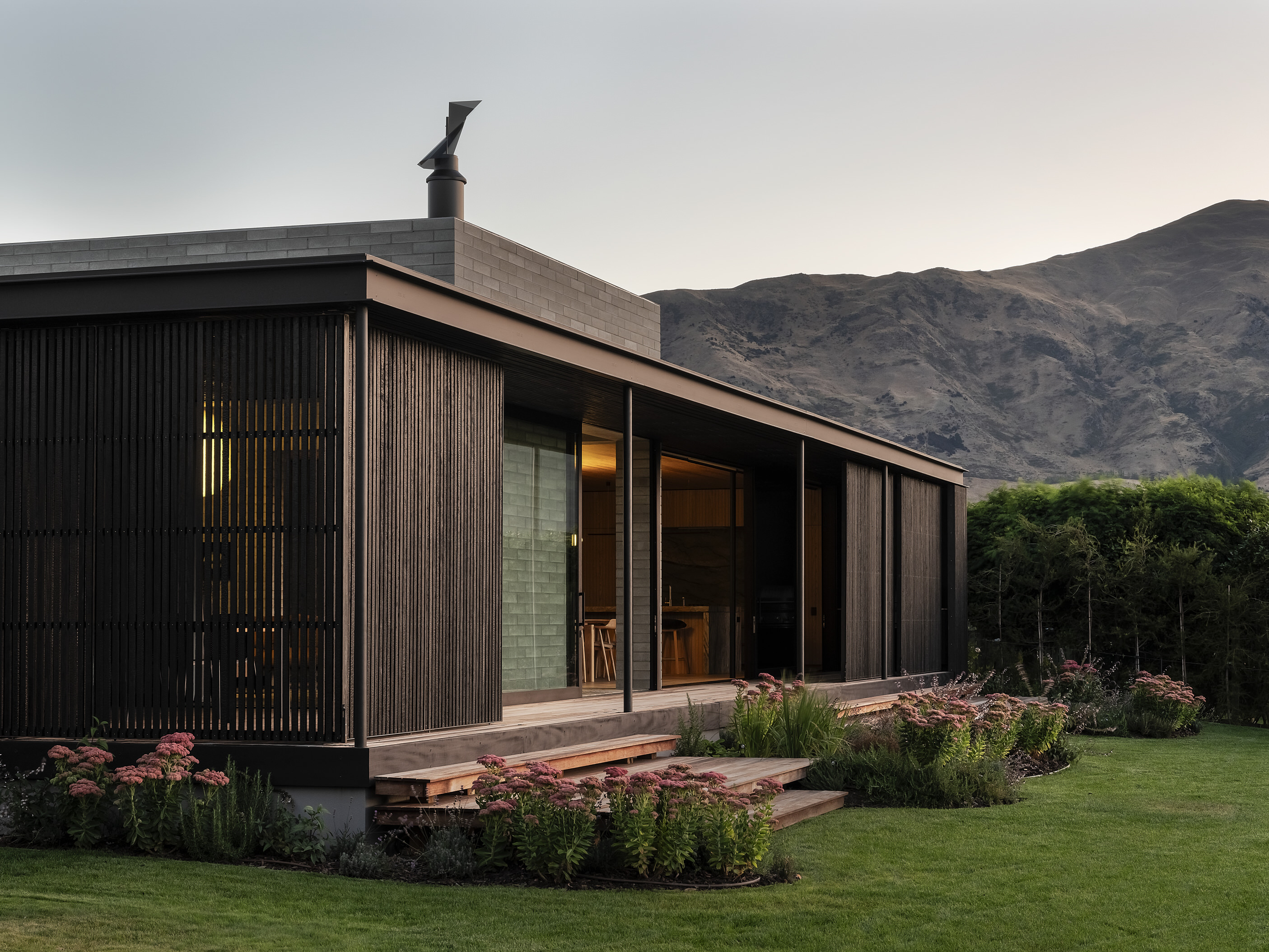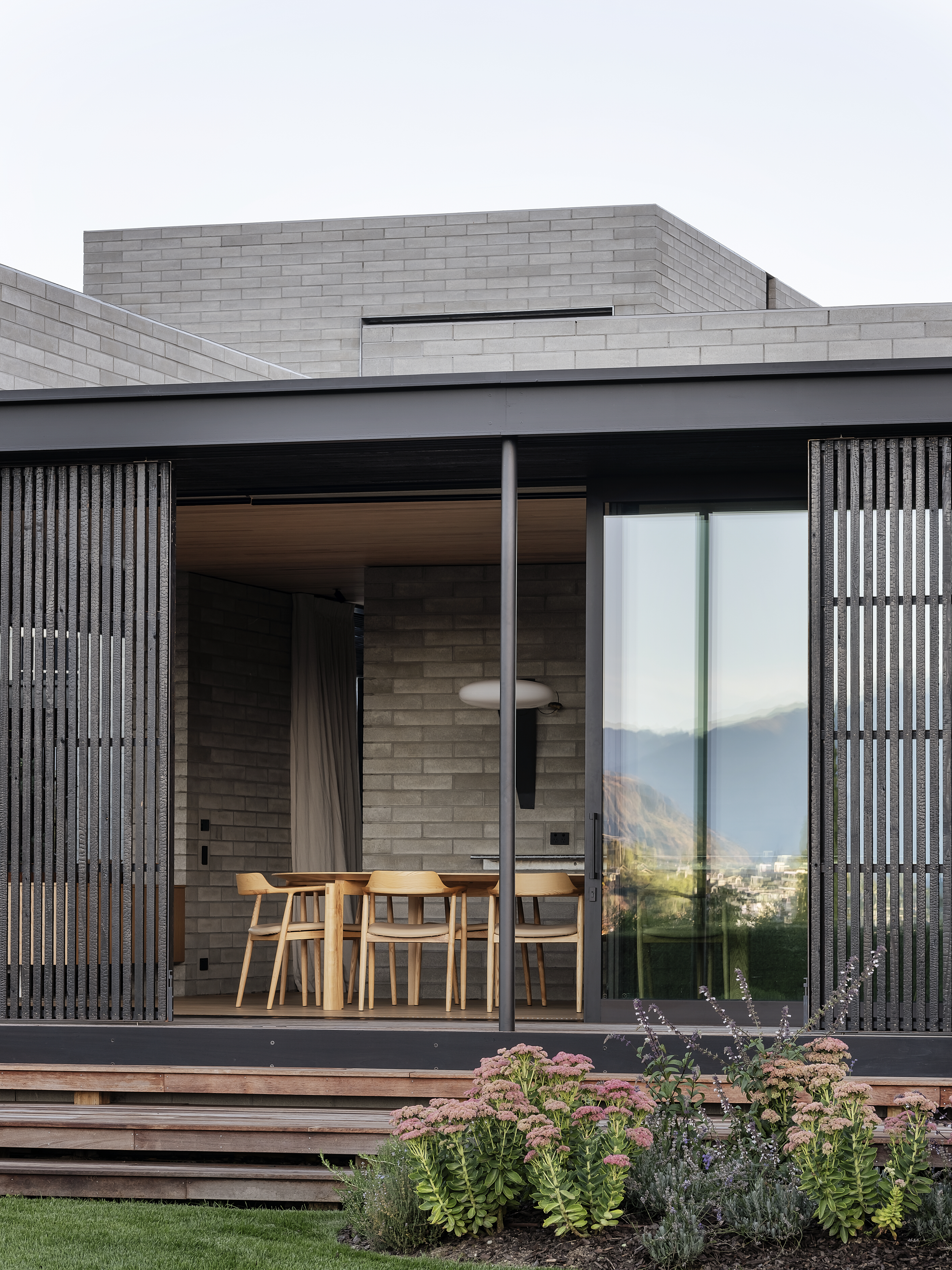 If ever a house deserves to be called a family sanctuary, this is it. Sitting just above the Central Otago town of Wānaka, the meticulously crafted and adaptable 309sqm home is an intergenerational retreat built on land lived on by the client for more than 20 years. It’s also a house that intrigues. The street-facing facade – with solid masonry forms and light-filtering timber screens – is deliberately abstract and designed to deal with a changing climate and changing urban landscape. It provides privacy and hints at what lies beyond. And what lies beyond is truly beautiful.