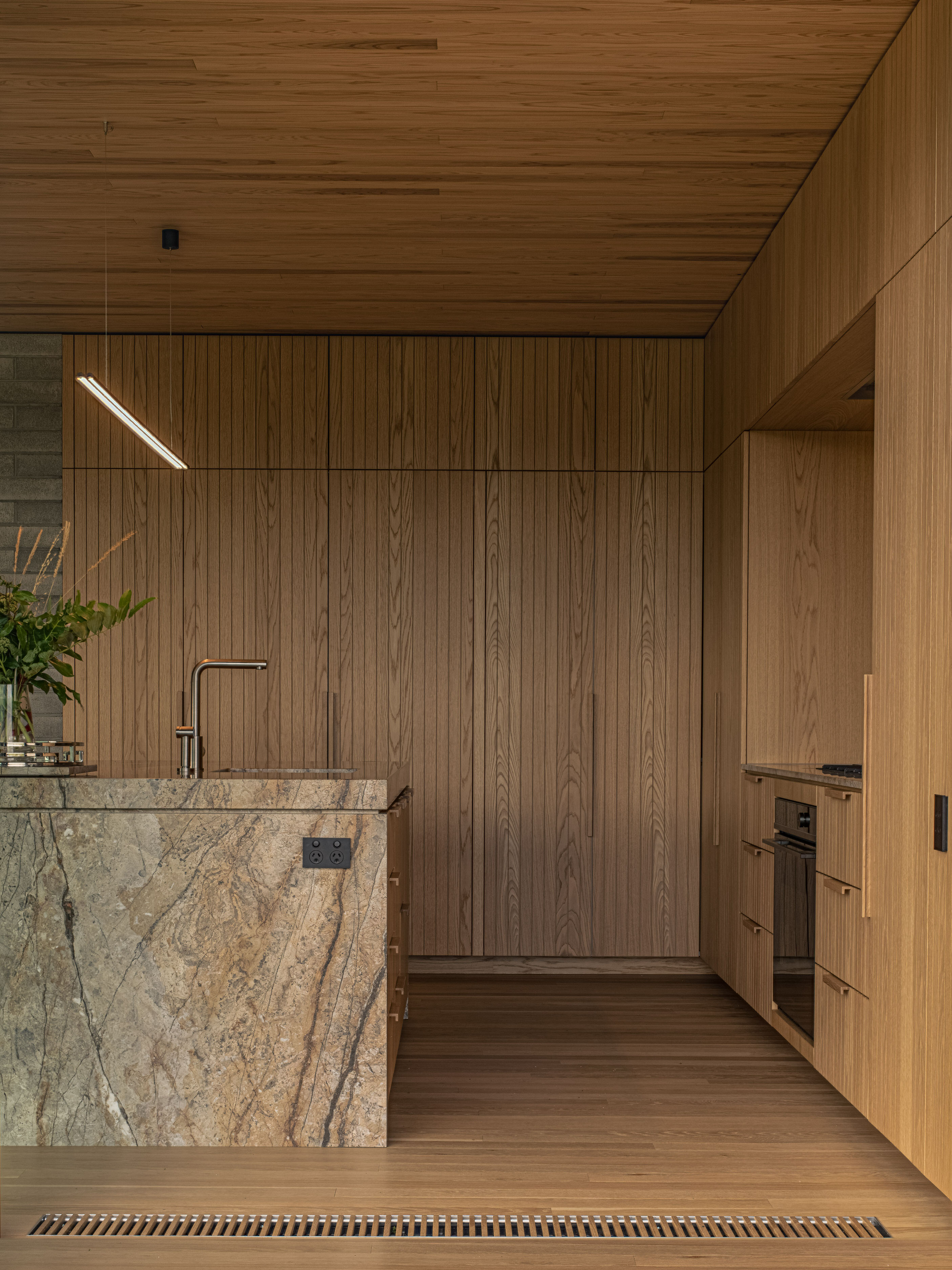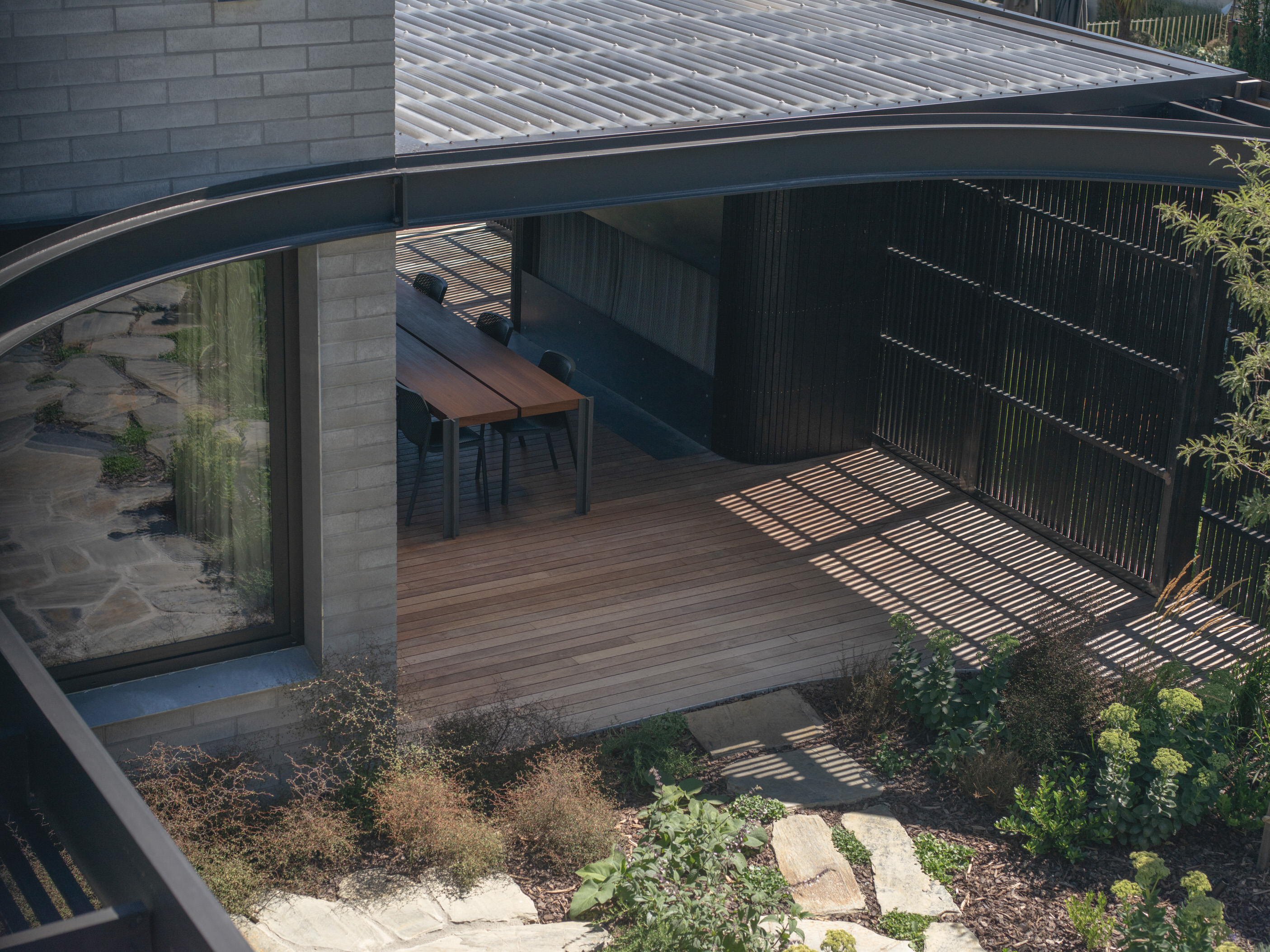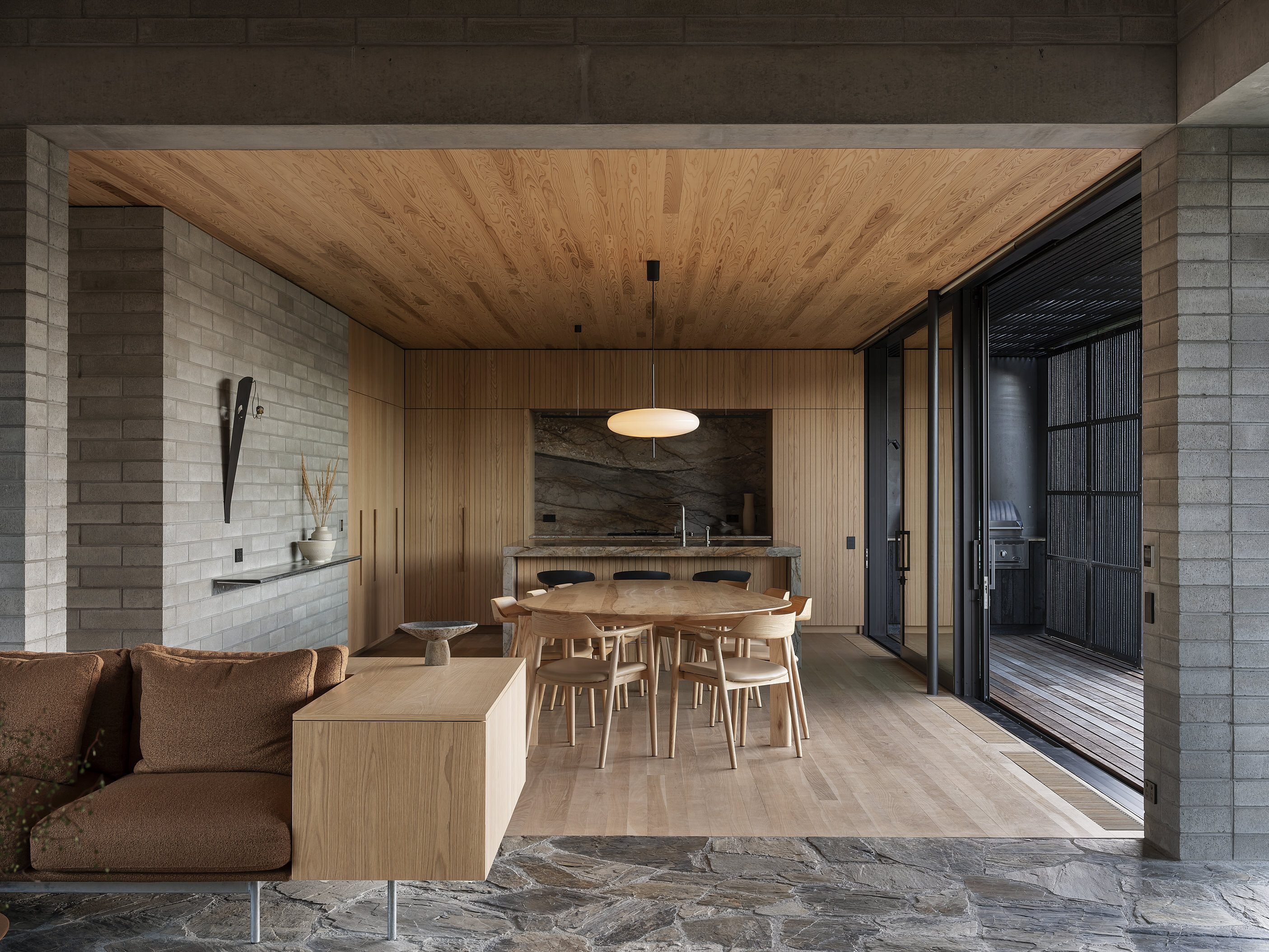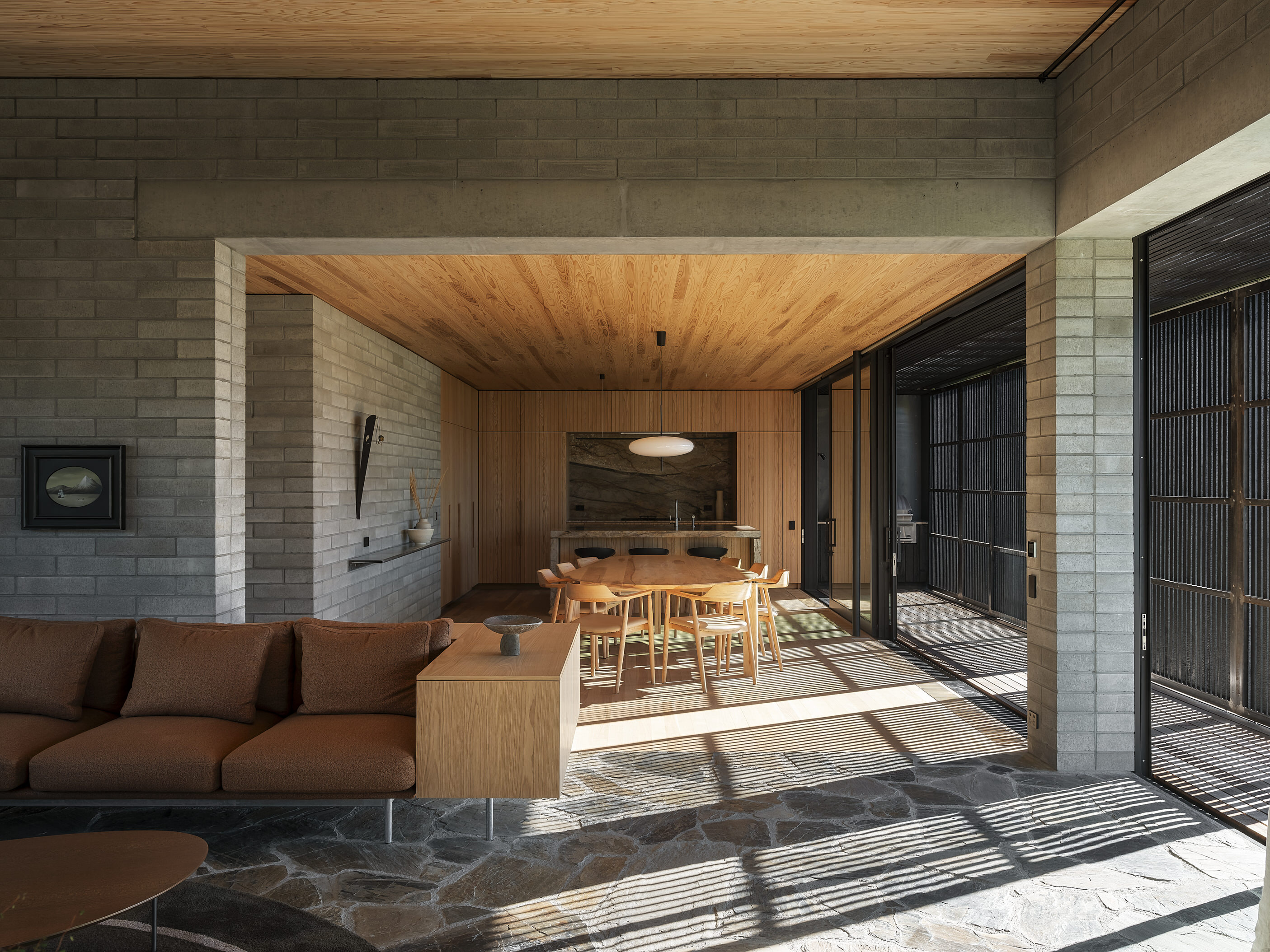 If ever a house deserves to be called a family sanctuary, this is it. Sitting just above the Central Otago town of Wānaka, the meticulously crafted and adaptable 309sqm home is an intergenerational retreat built on land lived on by the client for more than 20 years. It’s also a house that intrigues. The street-facing facade – with solid masonry forms and light-filtering timber screens – is deliberately abstract and designed to deal with a changing climate and changing urban landscape. It provides privacy and hints at what lies beyond. And what lies beyond is truly beautiful.