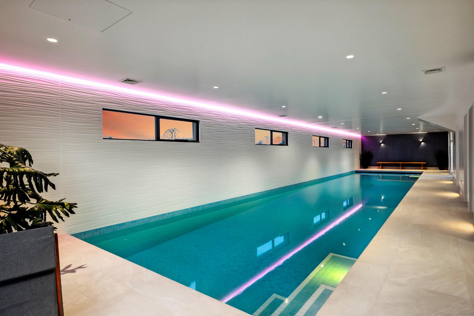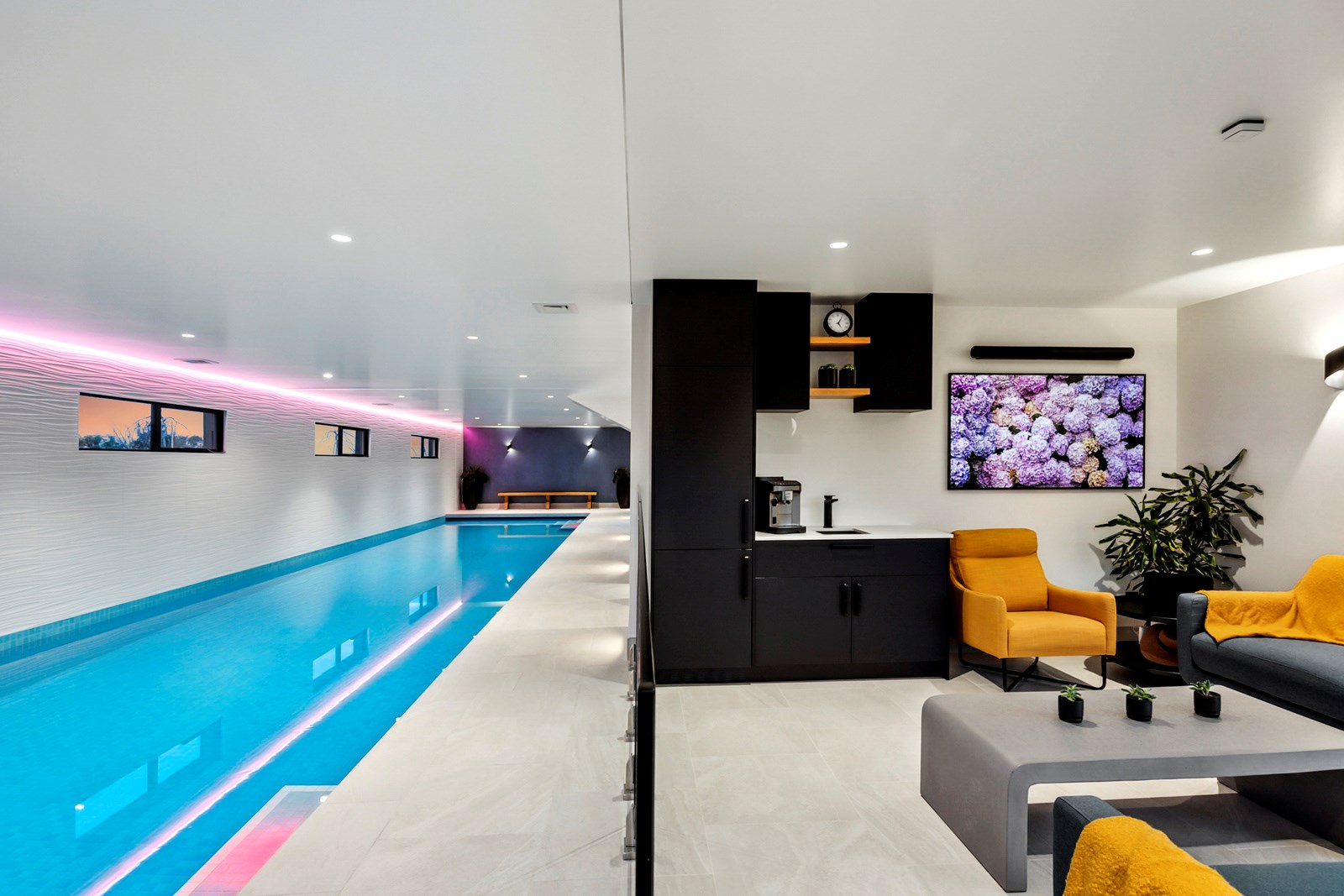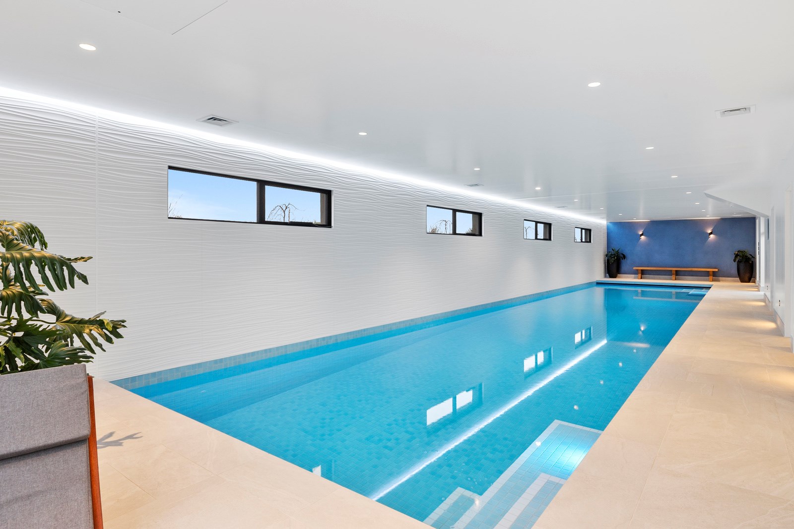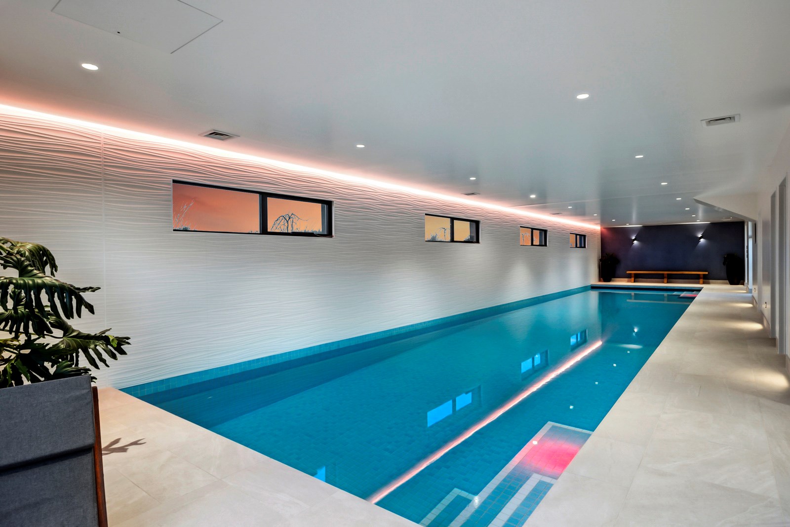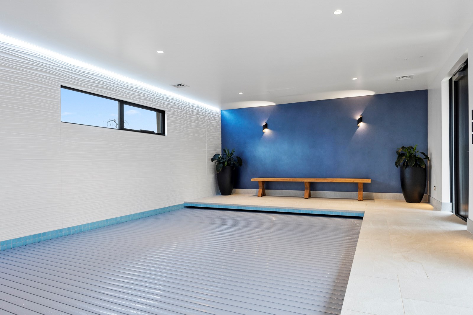 Special doesn’t come close to describing this project. Yes, it’s a pool house, but it does much more than housing the 18m-long in-ground heated swimming pool. The 163sqm building, clad in lightweight concrete panels and horizontal cedar, is like a private health club on the same property as the owners’ house. Designed to match the home’s exterior, the pool house also has a lounge that opens onto a sheltered, private, landscaped terrace. In the relaxing space next to the pool, you’ll find a TV, sound bar and speaker that can be operated by smartphone. If views of the cool blue pool are not enough, feature lighting in neon shades can change the ambience instantly. The building also has a changing room, tiled shower, toilet and plant room.